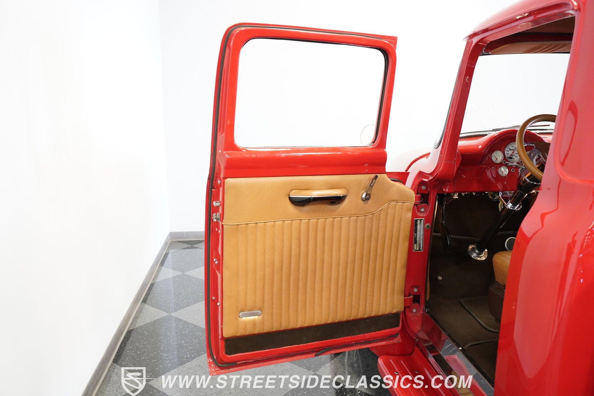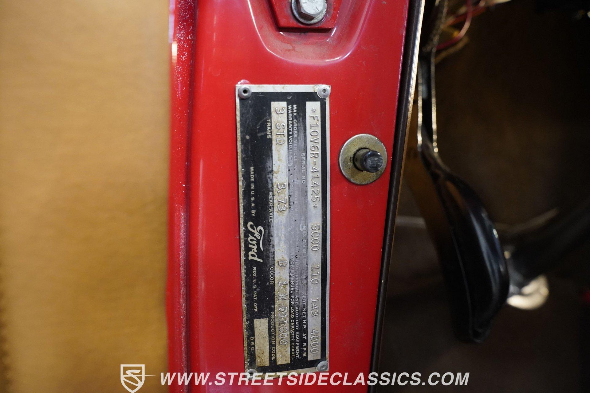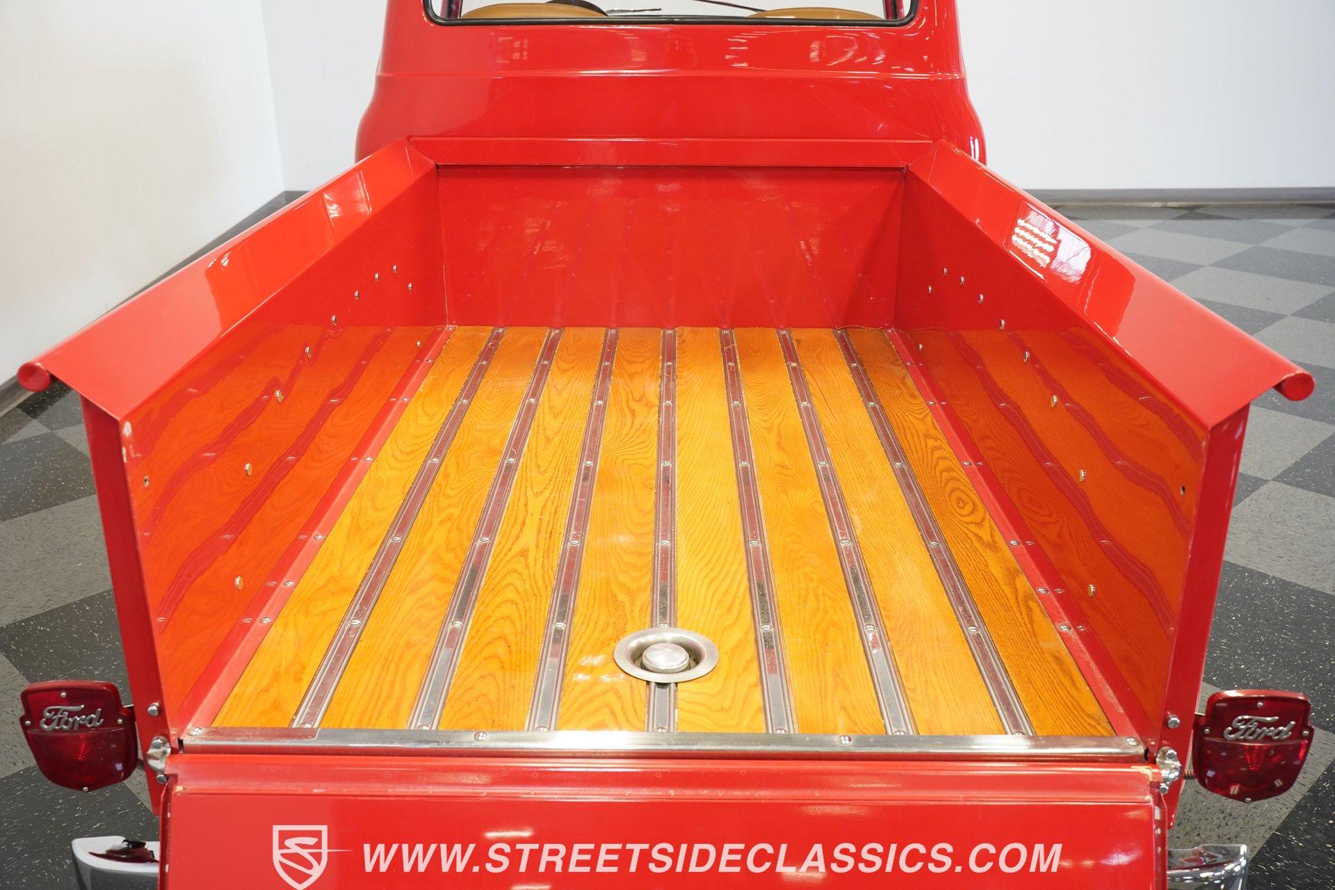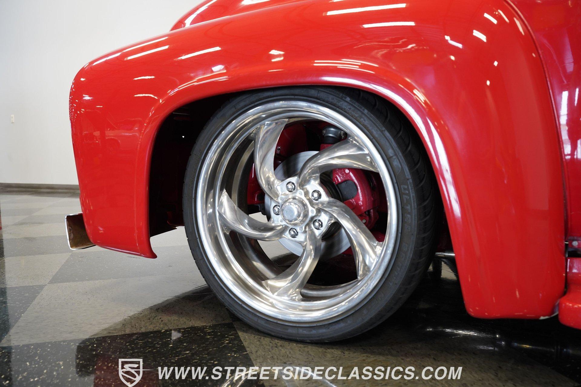 4378-PHX 1956 FORD F-100 American truck evolution took a major leap forward with this 1956 Ford F-100, sporting a fiery red finish that amplifies its classic pickup profile. Ford's iconic styling cues remain intact while the lowered stance gives this F-100 a planted, aggressive look that's distinctly modern. The front grille and bumper showcase the clean original design that made these trucks legendary, while the sleek lines of the hood flow perfectly toward the cab. Running along the sides, the trim pieces and clean body panels create a cohesive package, complemented by massive 20-inch wheels and Nexen 255/35/20 tires that fill the wheel wells perfectly. The wood-paneled bed adds a touch of craftsmanship, providing both function and style to this remarkable pickup. The camel-colored interior creates a warm, inviting cabin space that contrasts beautifully with the exterior. Vinyl bucket seats provide both comfort and support, while the matching headliner, sun visors, and door panels maintain design consistency throughout. The red-painted dashboard houses a set of aftermarket gauges delivering vital information at a glance. A chrome steering column topped with a leather-wrapped steering wheel combines modern touch with classic styling. Additional amenities include power windows, power seats, a tilt wheel, and a modern touchscreen radio system with Bluetooth and satellite capabilities, bringing contemporary convenience to this vintage truck's cabin. Powering this classic is a Chevrolet 350 cubic inch V8 engine with an Edelbrock four-barrel carburetor mounted on a polished intake manifold. The powerplant pairs with a TH350 three-speed automatic transmission for effortless cruising. Long tube headers and dual exhaust provide improved breathing and a muscular exhaust note. The chassis has been upgraded with an independent front suspension featuring control arms, coil springs, shocks, and a sway bar, while the rear retains a solid 10-bolt axle with leaf springs. Stopping power comes from power-assisted front disc brakes, and the power steering system makes maneuvering this pickup a breeze. HIGHLIGHTS: 350 Cubic Inch V8 Engine TH350 3-Speed Automatic Transmission Single Edelbrock 4-Barrel Carburetor Polished Intake Manifold Long Tube Headers Dual Exhaust Power Disc Brakes Independent Front Suspension with Control Arms, Coil Springs, Shocks, and Sway Bar Solid Axle Rear Suspension with Leaf Springs 10-Bolt Rear Axle Red Paint 20" Front and Rear Wheels 255/35/20 Front and Rear Nexen Tires Lowered Stance Wood-Paneled Short Bed Camel Interior with Power Bucket Seats Custom Center Console Matching Headliner and Door Panels Red-Painted Dashboard Aftermarket Gauges Chrome Steering Column Leather-Wrapped Steering Wheel Power Windows Power Steering Tilt Wheel Touchscreen Nav, AM/FM, Bluetooth, Satellite Radio Ford's legendary F-100 receives a masterful transformation in this 1956 model, blending vintage truck styling with modern performance upgrades. From the rumbling 350 V8 to the comfortable custom interior and aggressive stance on 20-inch wheels, this pickup delivers the perfect balance of classic looks and modern drivability. Call today!