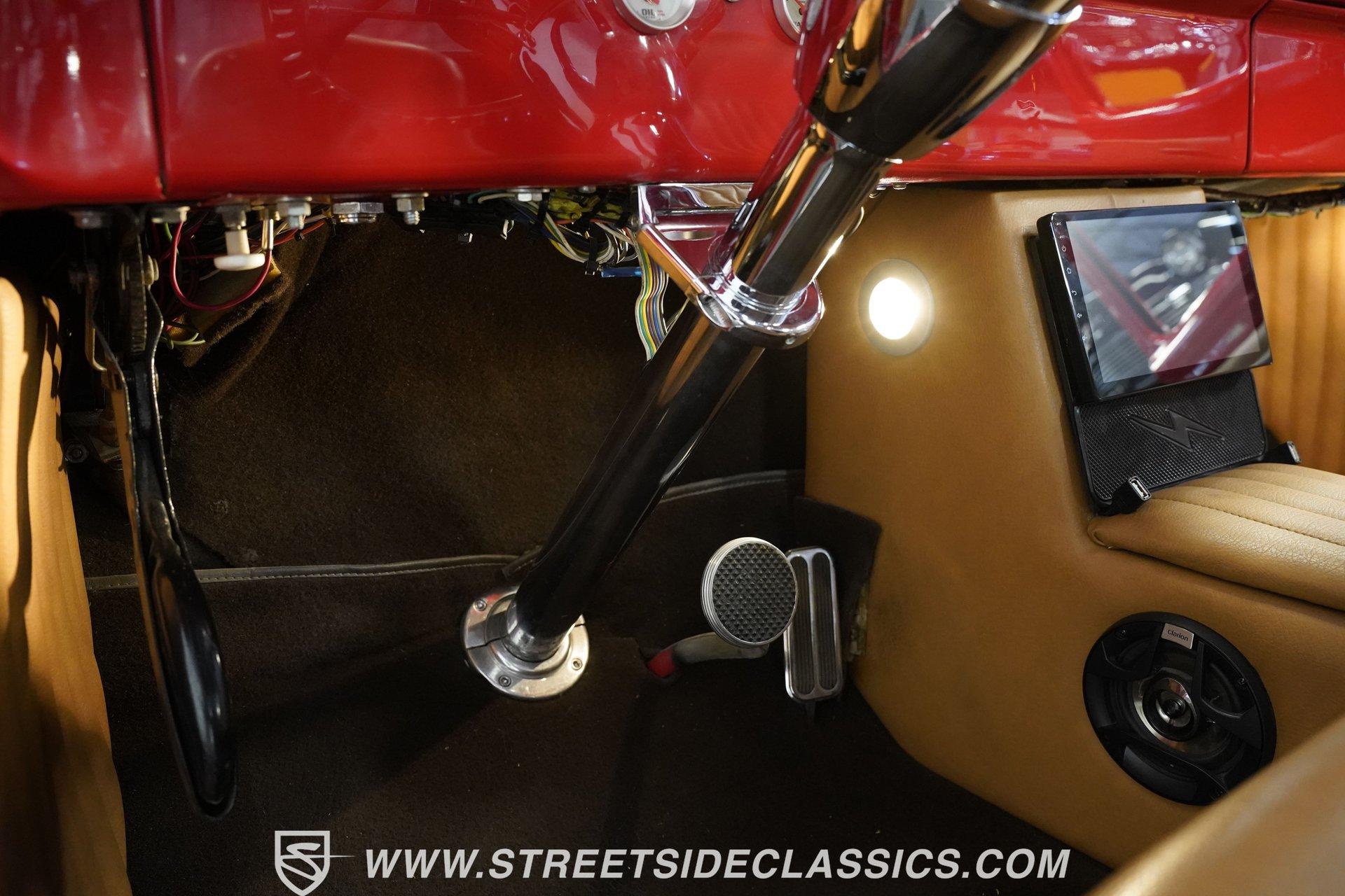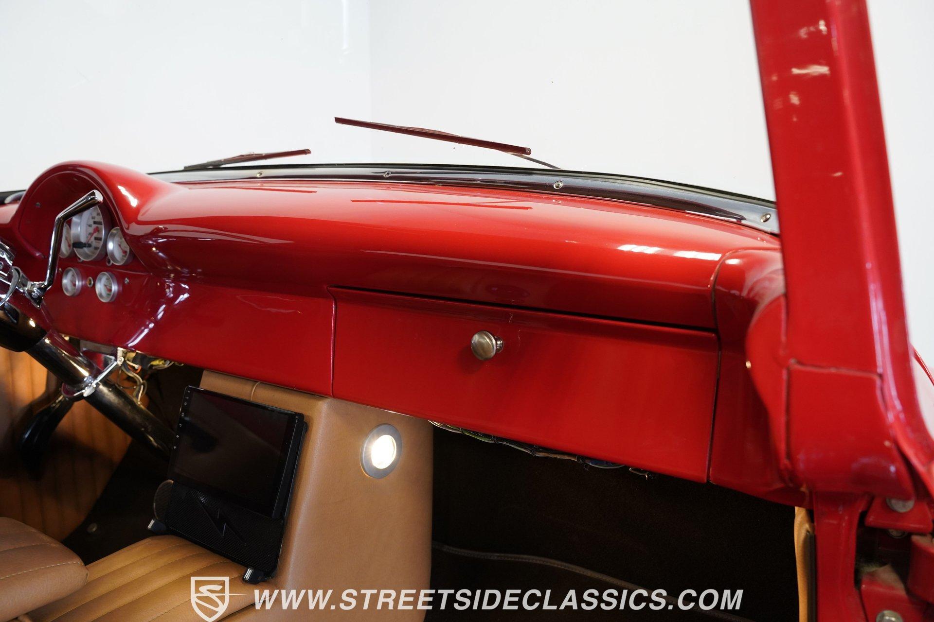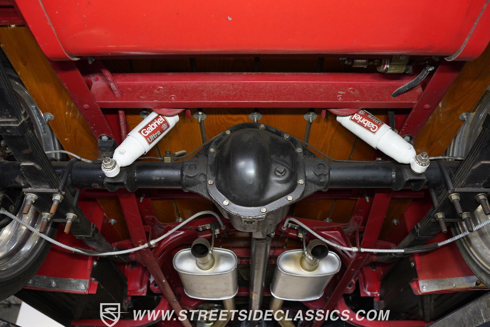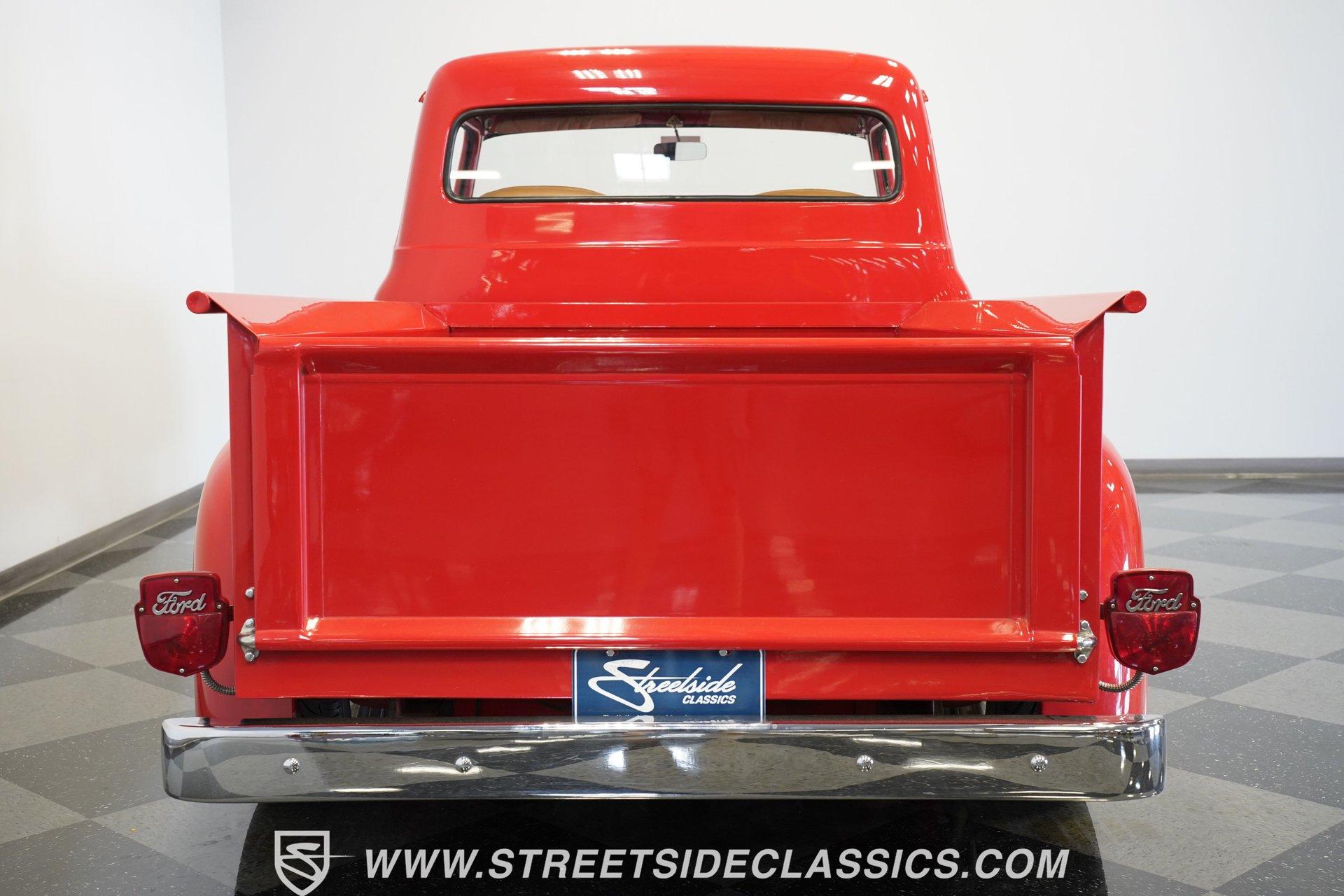 4378-PHX 1956 FORD F-100 American truck evolution took a major leap forward with this 1956 Ford F-100, sporting a fiery red finish that amplifies its classic pickup profile. Ford's iconic styling cues remain intact while the lowered stance gives this F-100 a planted, aggressive look that's distinctly modern. The front grille and bumper showcase the clean original design that made these trucks legendary, while the sleek lines of the hood flow perfectly toward the cab. Running along the sides, the trim pieces and clean body panels create a cohesive package, complemented by massive 20-inch wheels and Nexen 255/35/20 tires that fill the wheel wells perfectly. The wood-paneled bed adds a touch of craftsmanship, providing both function and style to this remarkable pickup. The camel-colored interior creates a warm, inviting cabin space that contrasts beautifully with the exterior. Vinyl bucket seats provide both comfort and support, while the matching headliner, sun visors, and door panels maintain design consistency throughout. The red-painted dashboard houses a set of aftermarket gauges delivering vital information at a glance. A chrome steering column topped with a leather-wrapped steering wheel combines modern touch with classic styling. Additional amenities include power windows, power seats, a tilt wheel, and a modern touchscreen radio system with Bluetooth and satellite capabilities, bringing contemporary convenience to this vintage truck's cabin. Powering this classic is a Chevrolet 350 cubic inch V8 engine with an Edelbrock four-barrel carburetor mounted on a polished intake manifold. The powerplant pairs with a TH350 three-speed automatic transmission for effortless cruising. Long tube headers and dual exhaust provide improved breathing and a muscular exhaust note. The chassis has been upgraded with an independent front suspension featuring control arms, coil springs, shocks, and a sway bar, while the rear retains a solid 10-bolt axle with leaf springs. Stopping power comes from power-assisted front disc brakes, and the power steering system makes maneuvering this pickup a breeze. HIGHLIGHTS: 350 Cubic Inch V8 Engine TH350 3-Speed Automatic Transmission Single Edelbrock 4-Barrel Carburetor Polished Intake Manifold Long Tube Headers Dual Exhaust Power Disc Brakes Independent Front Suspension with Control Arms, Coil Springs, Shocks, and Sway Bar Solid Axle Rear Suspension with Leaf Springs 10-Bolt Rear Axle Red Paint 20" Front and Rear Wheels 255/35/20 Front and Rear Nexen Tires Lowered Stance Wood-Paneled Short Bed Camel Interior with Power Bucket Seats Custom Center Console Matching Headliner and Door Panels Red-Painted Dashboard Aftermarket Gauges Chrome Steering Column Leather-Wrapped Steering Wheel Power Windows Power Steering Tilt Wheel Touchscreen Nav, AM/FM, Bluetooth, Satellite Radio Ford's legendary F-100 receives a masterful transformation in this 1956 model, blending vintage truck styling with modern performance upgrades. From the rumbling 350 V8 to the comfortable custom interior and aggressive stance on 20-inch wheels, this pickup delivers the perfect balance of classic looks and modern drivability. Call today!