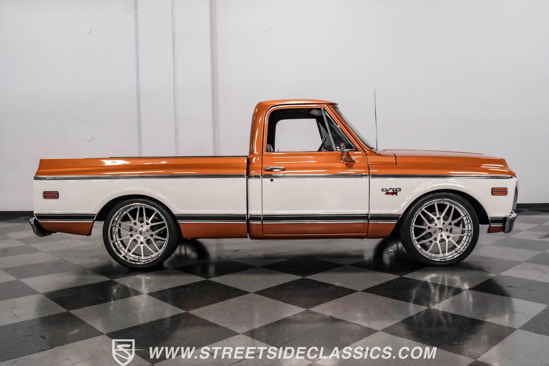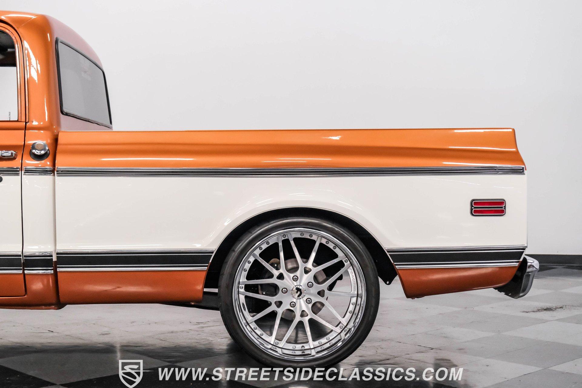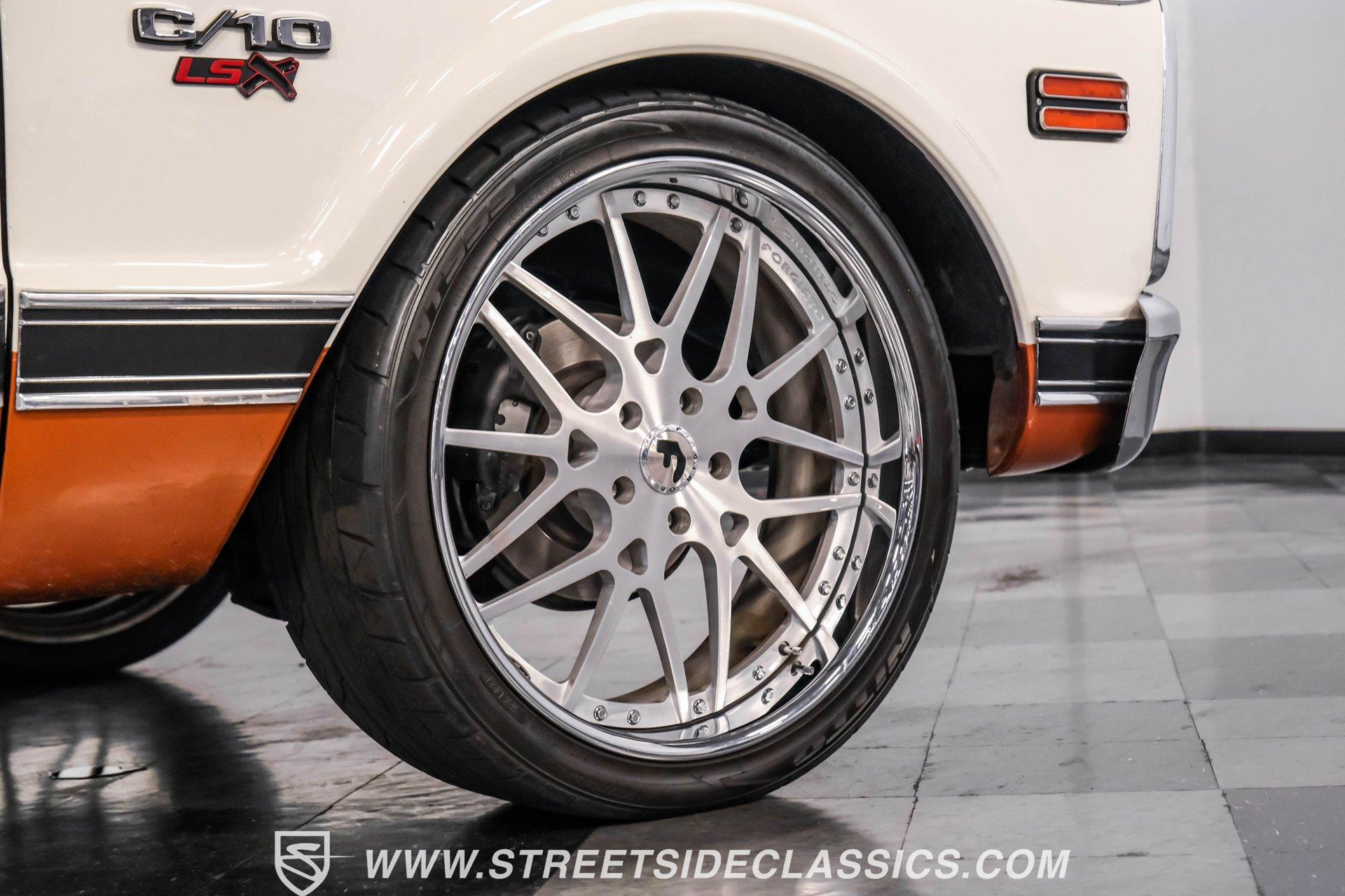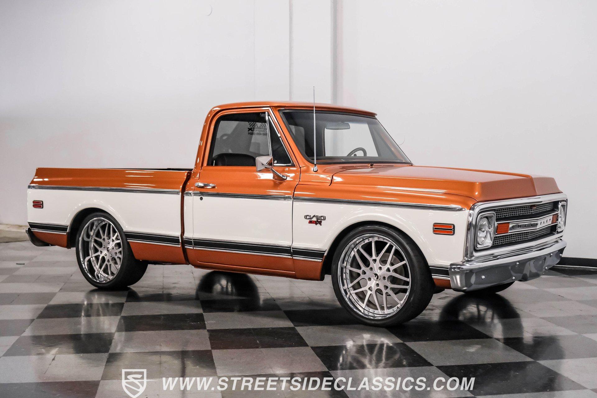 Forged from automotive passion and extreme attention to detail, this 1969 Chevrolet C10 Supercharged LS Restomod displays a carefully crafted two-tone Bronze Metallic and White exterior finish that radiates custom quality. The subtle metallic flake in the bronze paint adds visual depth while the clean white accents create perfect contrast across the body lines. Lowered to an aggressive stance, this C10's profile is amplified by massive 22" Forgiato wheels wrapped in 265/35ZR22 Nitto tires that fill the wheel wells with precision. LSX emblems on the sides give subtle clues to the extraordinary power underneath, while the tinted windows add a touch of modern style to this classic truck's silhouette. The brown leather interior rivals luxury vehicles with its complete custom treatment by local specialist PG. Custom-built door panels and headliner demonstrate exceptional craftsmanship, complemented by the billet window cranks and door handles that blend vintage styling with modern execution. Dakota Digital VHX gauges provide crucial information in a clean, classic presentation while the tilt column and wood-grip billet steering wheel offer precise control. The custom center console houses convenient cup holders and a wireless phone charger, while the Kenwood touchscreen head unit delivers modern audio technology alongside the Old Air AC system for ultimate comfort. Beneath the smooth custom hood lies a 6.0 Liter Gen 4 LS engine crowned with an LSA supercharger setup generating an estimated 600 horsepower. This powerhouse connects to a 6L80E six-speed automatic transmission with Circle D billet 3,400 stall converter for outstanding acceleration and highway cruising capability. Long-tube headers flow into an X-pipe dual exhaust system with FlowFX mufflers for an aggressive exhaust note. The fully upgraded suspension features coil springs with shocks and a sway bar up front, while truck arms with a panhard bar control the rear. Power four-wheel disc brakes provide ample stopping power for this high-performance truck. HIGHLIGHTS: 6.0 Liter Gen 4 LS Engine with LSA Supercharger (600 est HP) Fuel Injection 6L80E Six-Speed Automatic Transmission Circle D Billet 3,400 Stall Converter X-Pipe Dual Exhaust System FlowFX Mufflers 12 Bolt Rear with Posi-Traction Four-Wheel Power Disc Brakes BeСool Radiator with Dual Electric Fans Lowered Suspension Front Coil Springs with Shocks and Sway Bar Rear Truck Arms with Panhard Bar Bronze Metallic and White Two-Tone Paint 22" Forgiato Wheels with 265/35ZR22 Nitto Tires Tinted Windows Brown Custom Leather Interior with Bucket Seats and Custom Console Dakota Digital VHX Gauges Custom-Built Headliner and Door Panels Billet Window Cranks and Door Handles Tilt Column with Custom Billet and Wood-Grip Steering Wheel Air Conditioning Power Steering Kenwood Touchscreen Head Unit 329 Miles Since Built Masterfully built with supercharged LS power and attention to detail, this 1969 Chevrolet C10 combines classic pickup styling with modern performance and comfort. From its high-quality two-tone exterior to its custom leather interior and performance-built drivetrain, this truck delivers on every level. Call today!