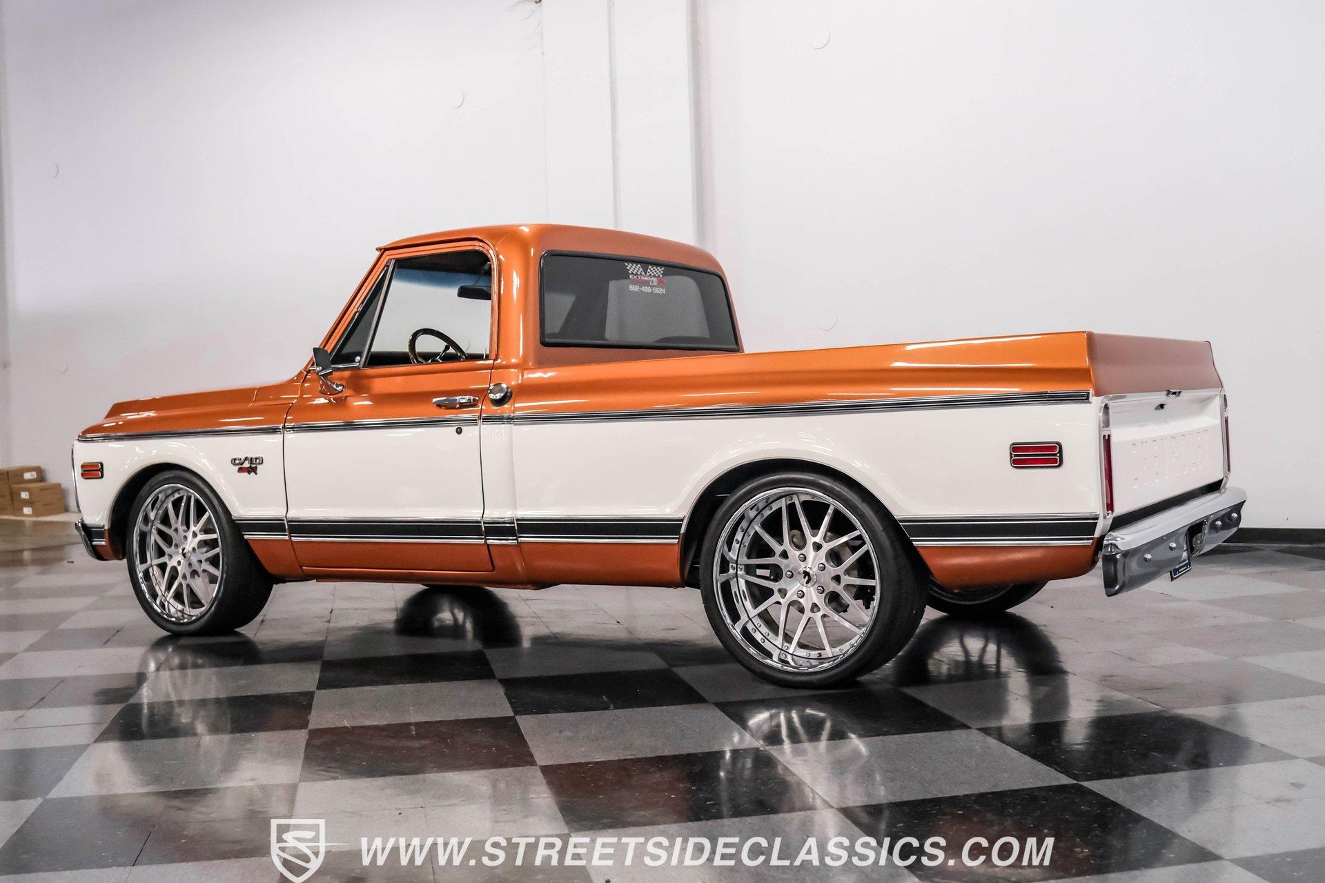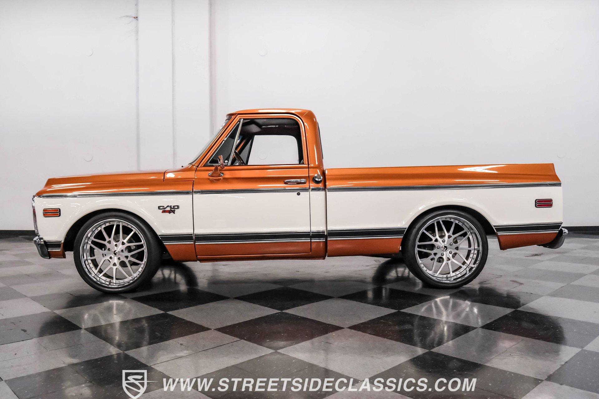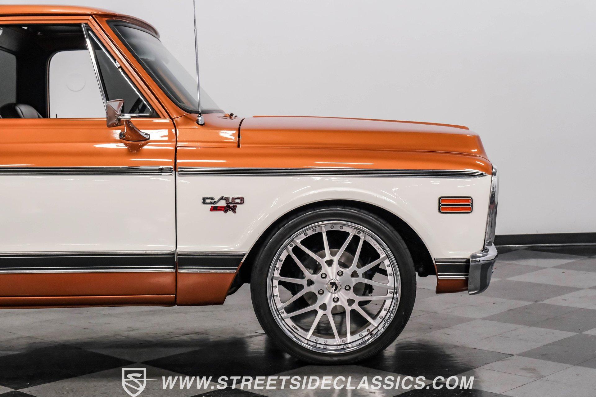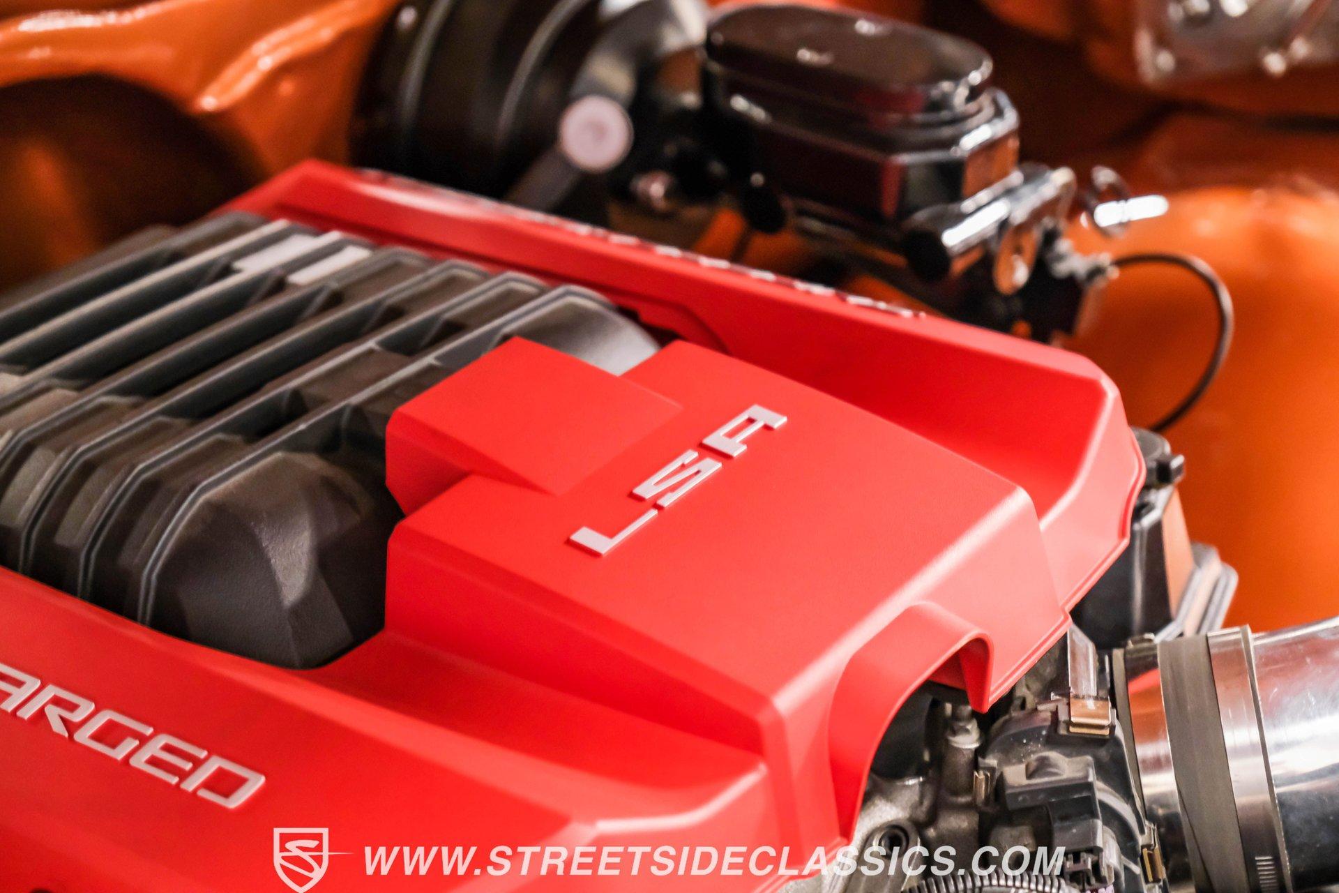 Forged from automotive passion and extreme attention to detail, this 1969 Chevrolet C10 Supercharged LS Restomod displays a carefully crafted two-tone Bronze Metallic and White exterior finish that radiates custom quality. The subtle metallic flake in the bronze paint adds visual depth while the clean white accents create perfect contrast across the body lines. Lowered to an aggressive stance, this C10's profile is amplified by massive 22" Forgiato wheels wrapped in 265/35ZR22 Nitto tires that fill the wheel wells with precision. LSX emblems on the sides give subtle clues to the extraordinary power underneath, while the tinted windows add a touch of modern style to this classic truck's silhouette. The brown leather interior rivals luxury vehicles with its complete custom treatment by local specialist PG. Custom-built door panels and headliner demonstrate exceptional craftsmanship, complemented by the billet window cranks and door handles that blend vintage styling with modern execution. Dakota Digital VHX gauges provide crucial information in a clean, classic presentation while the tilt column and wood-grip billet steering wheel offer precise control. The custom center console houses convenient cup holders and a wireless phone charger, while the Kenwood touchscreen head unit delivers modern audio technology alongside the Old Air AC system for ultimate comfort. Beneath the smooth custom hood lies a 6.0 Liter Gen 4 LS engine crowned with an LSA supercharger setup generating an estimated 600 horsepower. This powerhouse connects to a 6L80E six-speed automatic transmission with Circle D billet 3,400 stall converter for outstanding acceleration and highway cruising capability. Long-tube headers flow into an X-pipe dual exhaust system with FlowFX mufflers for an aggressive exhaust note. The fully upgraded suspension features coil springs with shocks and a sway bar up front, while truck arms with a panhard bar control the rear. Power four-wheel disc brakes provide ample stopping power for this high-performance truck. HIGHLIGHTS: 6.0 Liter Gen 4 LS Engine with LSA Supercharger (600 est HP) Fuel Injection 6L80E Six-Speed Automatic Transmission Circle D Billet 3,400 Stall Converter X-Pipe Dual Exhaust System FlowFX Mufflers 12 Bolt Rear with Posi-Traction Four-Wheel Power Disc Brakes BeСool Radiator with Dual Electric Fans Lowered Suspension Front Coil Springs with Shocks and Sway Bar Rear Truck Arms with Panhard Bar Bronze Metallic and White Two-Tone Paint 22" Forgiato Wheels with 265/35ZR22 Nitto Tires Tinted Windows Brown Custom Leather Interior with Bucket Seats and Custom Console Dakota Digital VHX Gauges Custom-Built Headliner and Door Panels Billet Window Cranks and Door Handles Tilt Column with Custom Billet and Wood-Grip Steering Wheel Air Conditioning Power Steering Kenwood Touchscreen Head Unit 329 Miles Since Built Masterfully built with supercharged LS power and attention to detail, this 1969 Chevrolet C10 combines classic pickup styling with modern performance and comfort. From its high-quality two-tone exterior to its custom leather interior and performance-built drivetrain, this truck delivers on every level. Call today!