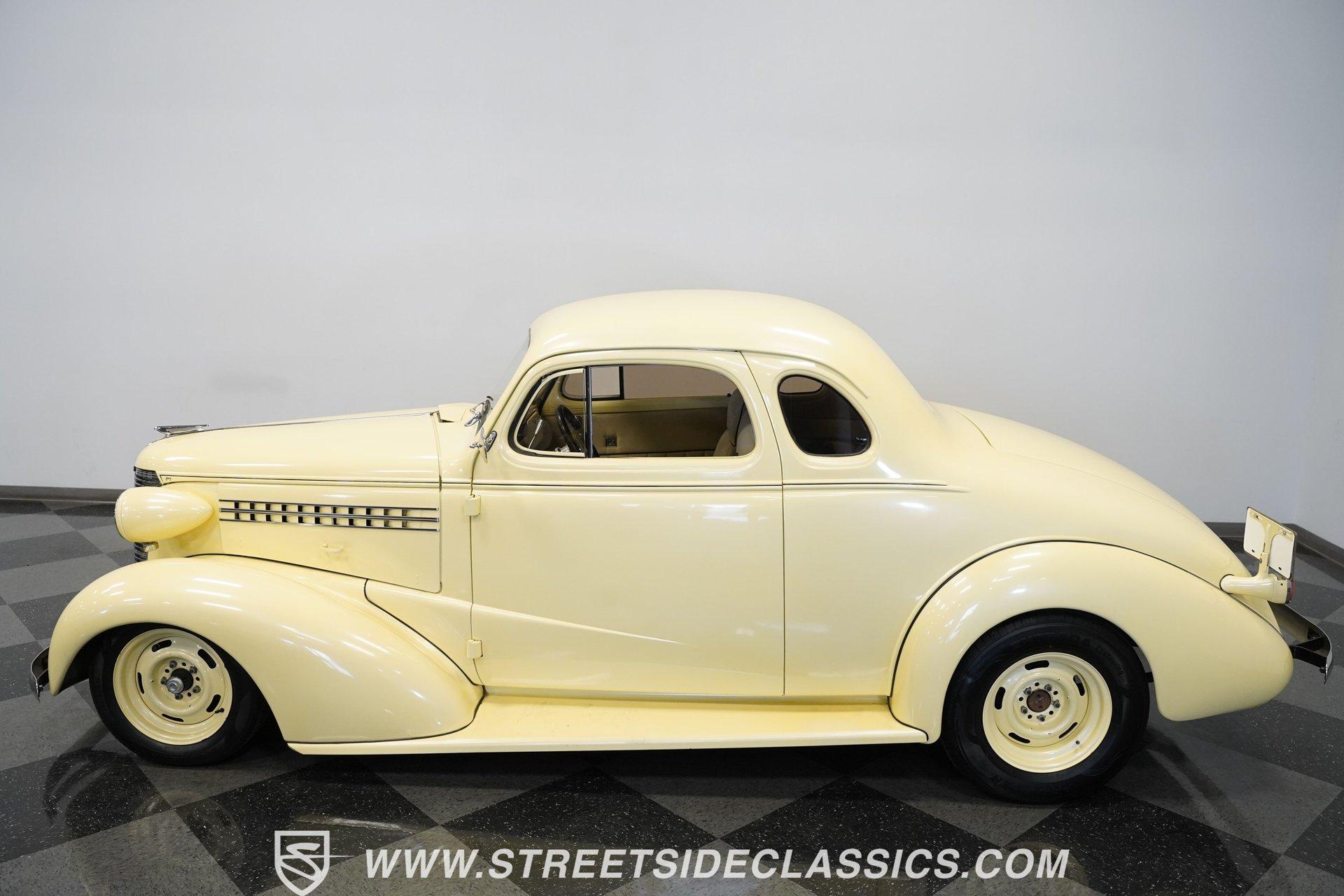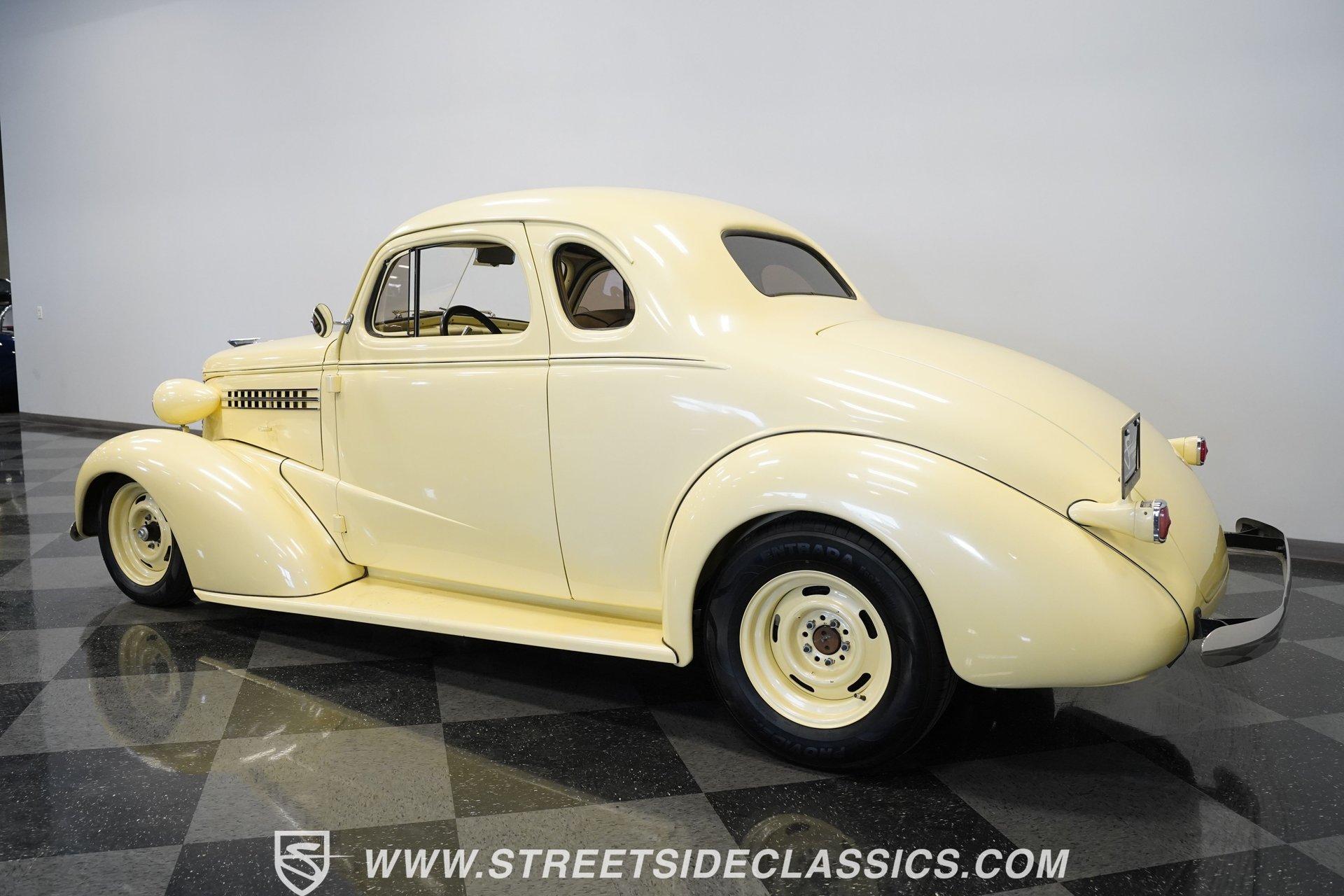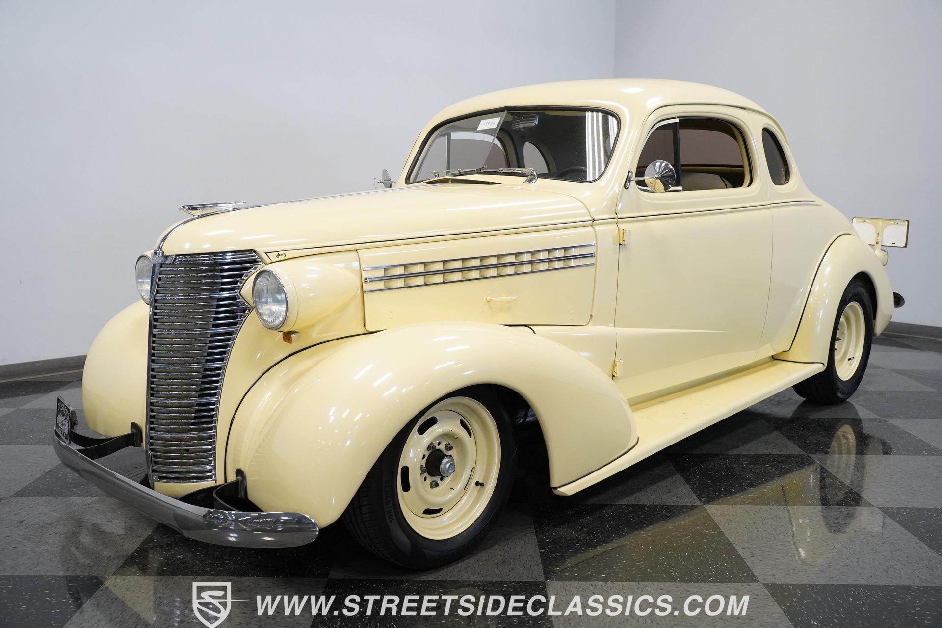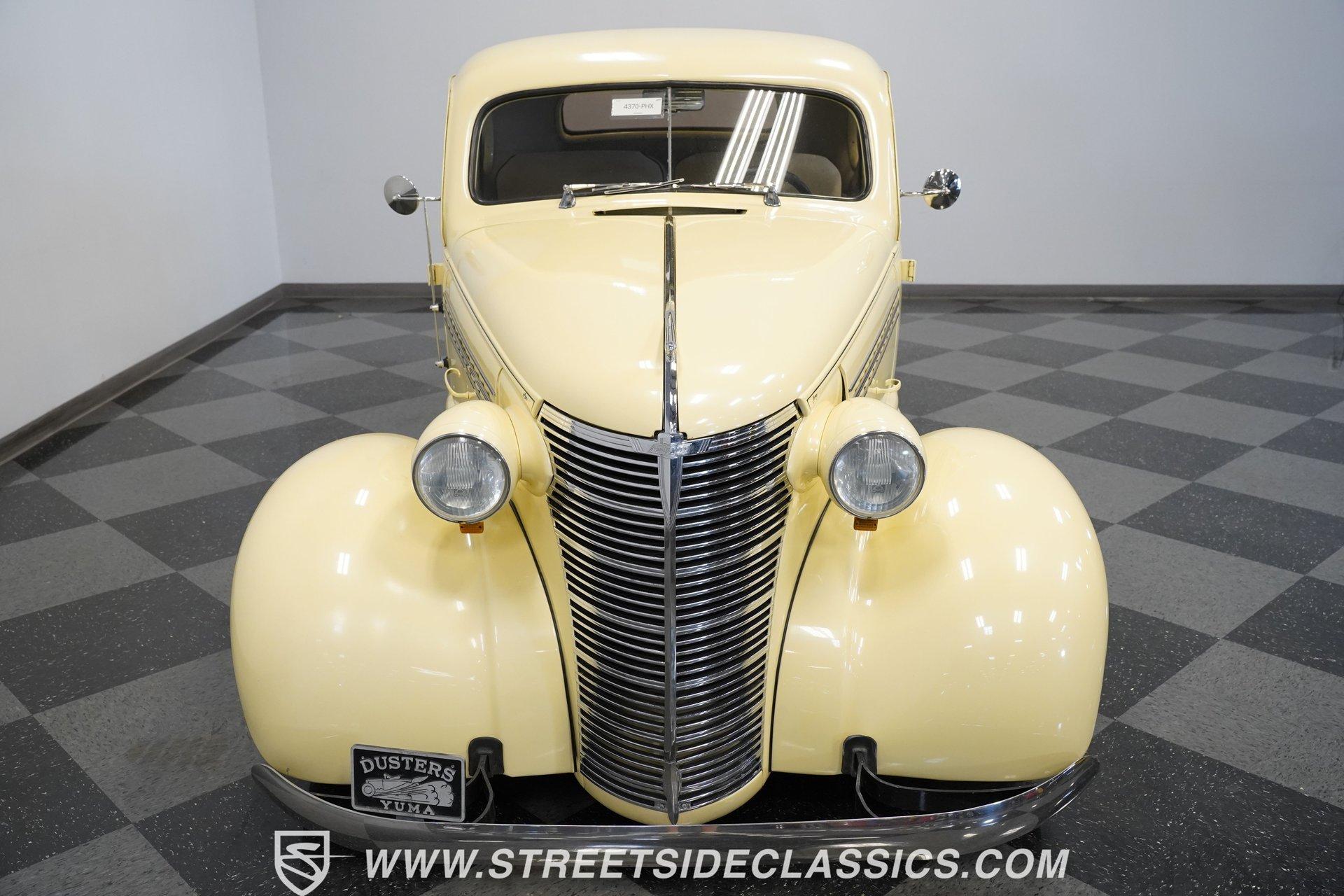 Built with shaved door handles and an integrated fuel filler, this 1938 Chevrolet Master arrives in Butternut Yellow paint that transforms the Depression-era coupe into something genuinely distinctive. Color-matched 15" steel wheels anchor each corner, wrapped in 195/60R15 front and 225/70R15 rear tires. The V-butt windshield and relocated turn signals beneath the headlights give this two-door coupe a cleaner profile, while the dual exhaust system with FlowMaster mufflers adds a throaty soundtrack to match its modified appearance. Tan cloth covers the bench seat and extends throughout the cabin, creating a cohesive interior that includes matching door panels and headliner. The column-mounted shifter operates the transmission, while the tilt steering wheel provides adjustable comfort. AM/FM radio keeps you connected, though the CD changer remains non-functional. Power steering provides modern convenience to the vintage cabin, with factory-style gauges maintaining the period-correct dashboard aesthetic. A 350 cubic inch small block V8 with 5.7L GM casting numbers drives this Chevrolet through a TH350 3-speed automatic transmission. The Holley 4-barrel carburetor sits atop an Edelbrock intake manifold, feeding the 8-cylinder engine that recent work has brought back to reliable operation. Up front, independent control arms and coil springs replace the original setup with a Mustang II-style configuration featuring rack and pinion steering, while the rear maintains the solid axle with leaf springs. Power brakes and dual exhaust complete the mechanical package. HIGHLIGHTS: 350 CI V8 Engine TH350 3-Speed Automatic Transmission Holley 4-Barrel Carburetor Edelbrock Intake Manifold Independent Front Suspension (Mustang II-style) Solid Rear Axle with Leaf Springs Rack and Pinion Steering Power Brakes Dual Exhaust with FlowMaster Mufflers 8" Rear Axle Butternut Yellow Paint 15" Color-Matched Steel Wheels 195/60R15 Front, 225/70R15 Rear Tires Shaved Door Handles Integrated Fuel Filler V-Butt Windshield Relocated Turn Signals Tan Cloth Bench Seat Column Shifter Tilt Steering Wheel Power Steering AM/FM Radio Factory-Style Gauges Service Records/Receipts Modified with performance upgrades and finished in striking Butternut Yellow, this 1938 Chevrolet Master combines Depression-era styling with modern drivability. The 350 V8 and updated suspension make it road-ready, while the shaved handles and integrated details show thoughtful customization. Call today!