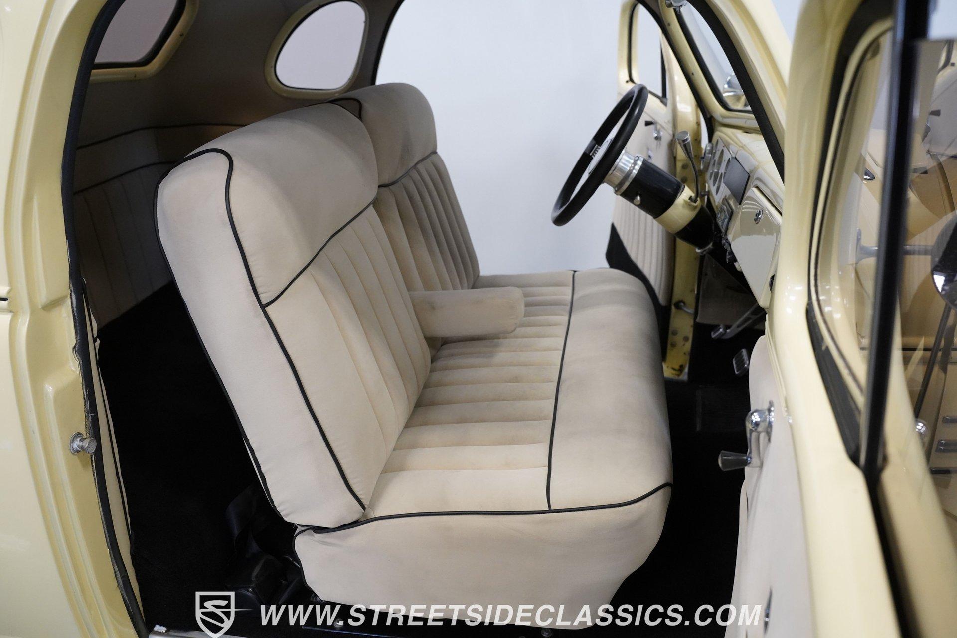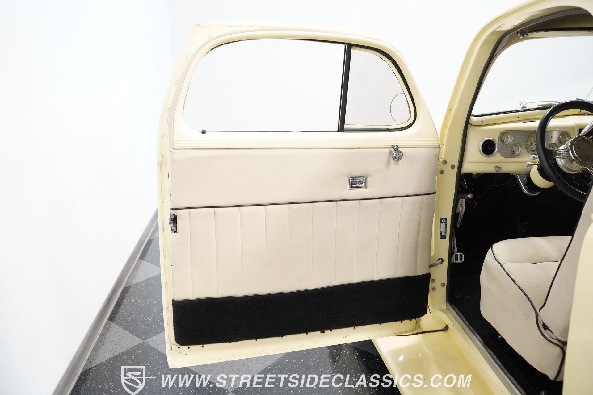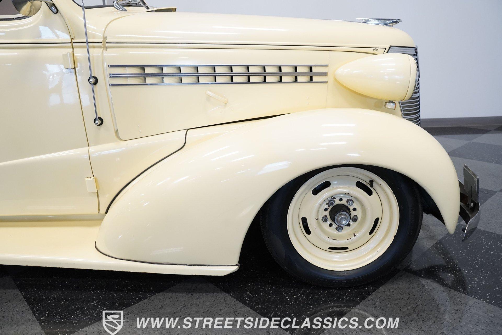 Built with shaved door handles and an integrated fuel filler, this 1938 Chevrolet Master arrives in Butternut Yellow paint that transforms the Depression-era coupe into something genuinely distinctive. Color-matched 15" steel wheels anchor each corner, wrapped in 195/60R15 front and 225/70R15 rear tires. The V-butt windshield and relocated turn signals beneath the headlights give this two-door coupe a cleaner profile, while the dual exhaust system with FlowMaster mufflers adds a throaty soundtrack to match its modified appearance. Tan cloth covers the bench seat and extends throughout the cabin, creating a cohesive interior that includes matching door panels and headliner. The column-mounted shifter operates the transmission, while the tilt steering wheel provides adjustable comfort. AM/FM radio keeps you connected, though the CD changer remains non-functional. Power steering provides modern convenience to the vintage cabin, with factory-style gauges maintaining the period-correct dashboard aesthetic. A 350 cubic inch small block V8 with 5.7L GM casting numbers drives this Chevrolet through a TH350 3-speed automatic transmission. The Holley 4-barrel carburetor sits atop an Edelbrock intake manifold, feeding the 8-cylinder engine that recent work has brought back to reliable operation. Up front, independent control arms and coil springs replace the original setup with a Mustang II-style configuration featuring rack and pinion steering, while the rear maintains the solid axle with leaf springs. Power brakes and dual exhaust complete the mechanical package. HIGHLIGHTS: 350 CI V8 Engine TH350 3-Speed Automatic Transmission Holley 4-Barrel Carburetor Edelbrock Intake Manifold Independent Front Suspension (Mustang II-style) Solid Rear Axle with Leaf Springs Rack and Pinion Steering Power Brakes Dual Exhaust with FlowMaster Mufflers 8" Rear Axle Butternut Yellow Paint 15" Color-Matched Steel Wheels 195/60R15 Front, 225/70R15 Rear Tires Shaved Door Handles Integrated Fuel Filler V-Butt Windshield Relocated Turn Signals Tan Cloth Bench Seat Column Shifter Tilt Steering Wheel Power Steering AM/FM Radio Factory-Style Gauges Service Records/Receipts Modified with performance upgrades and finished in striking Butternut Yellow, this 1938 Chevrolet Master combines Depression-era styling with modern drivability. The 350 V8 and updated suspension make it road-ready, while the shaved handles and integrated details show thoughtful customization. Call today!