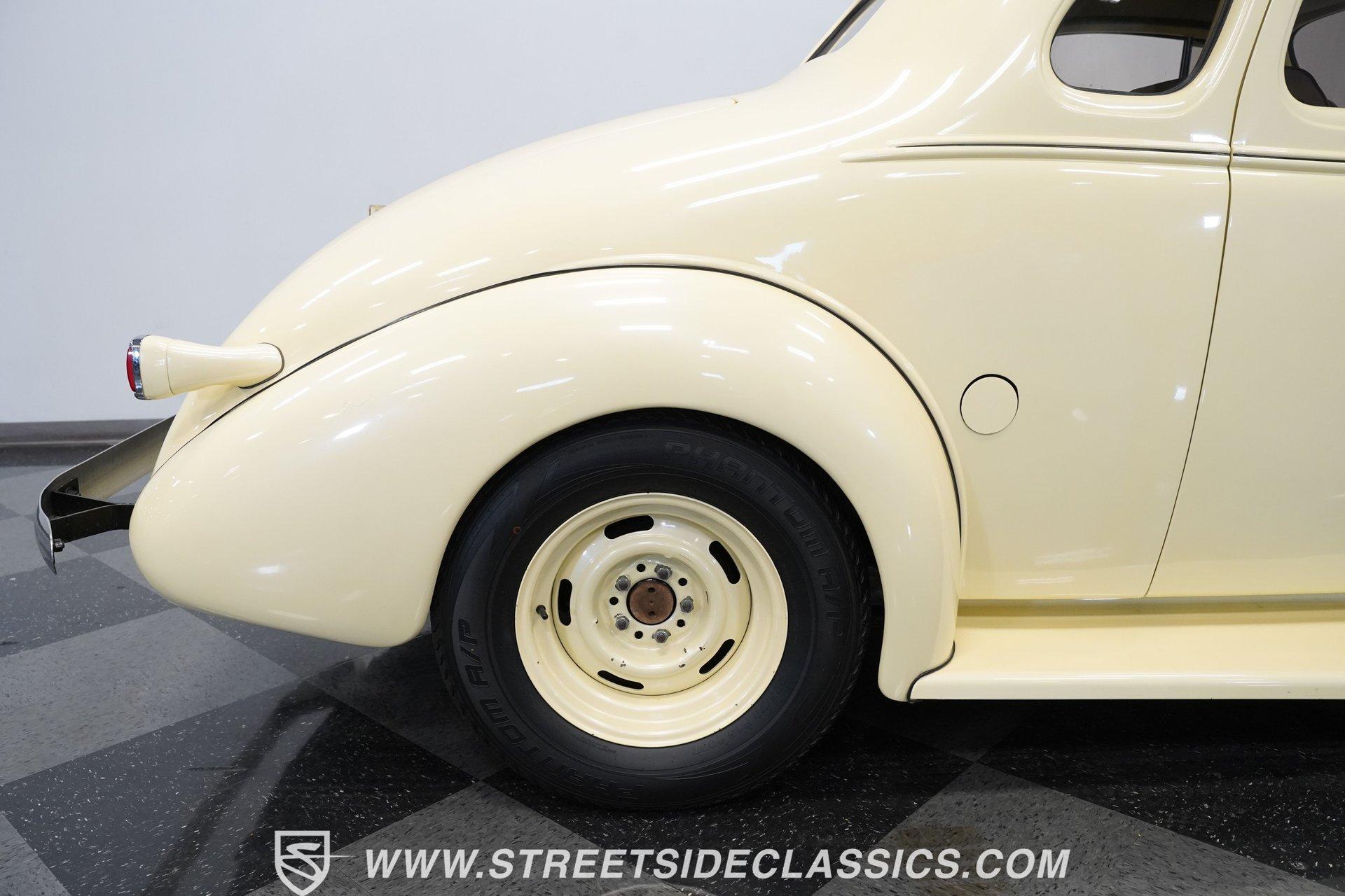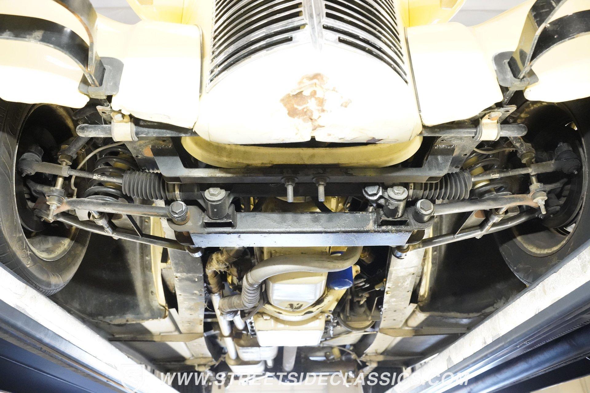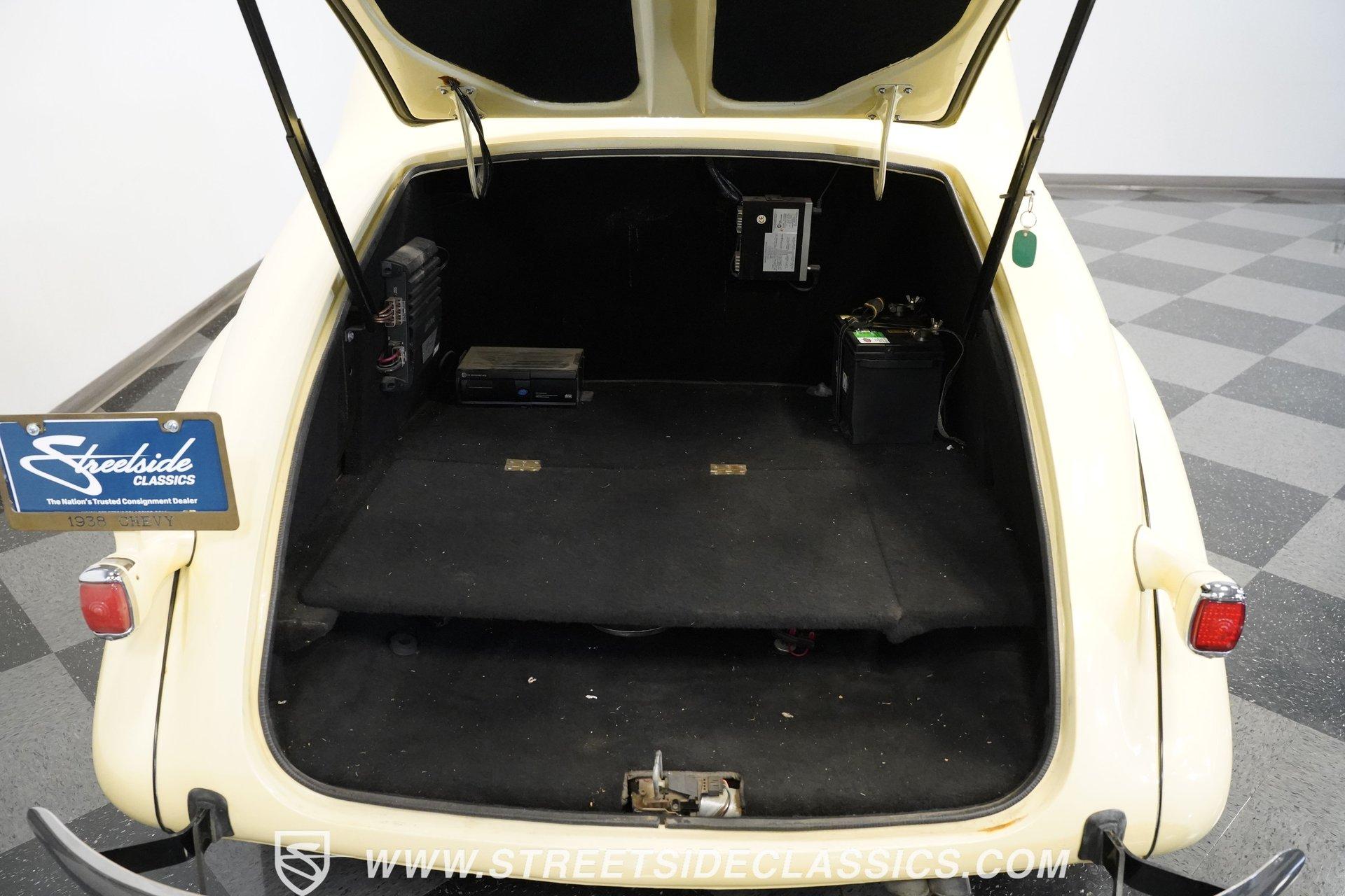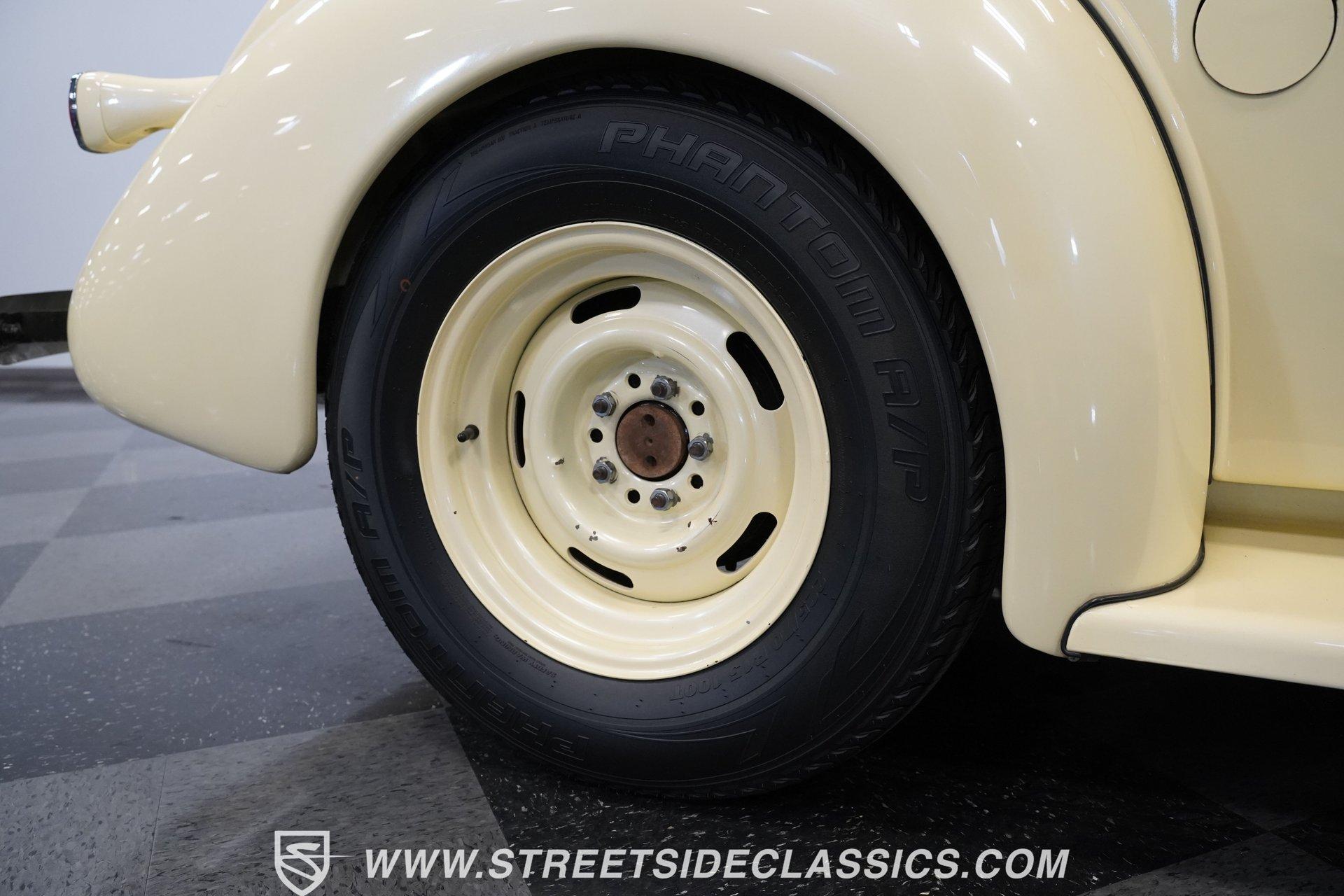 Built with shaved door handles and an integrated fuel filler, this 1938 Chevrolet Master arrives in Butternut Yellow paint that transforms the Depression-era coupe into something genuinely distinctive. Color-matched 15" steel wheels anchor each corner, wrapped in 195/60R15 front and 225/70R15 rear tires. The V-butt windshield and relocated turn signals beneath the headlights give this two-door coupe a cleaner profile, while the dual exhaust system with FlowMaster mufflers adds a throaty soundtrack to match its modified appearance. Tan cloth covers the bench seat and extends throughout the cabin, creating a cohesive interior that includes matching door panels and headliner. The column-mounted shifter operates the transmission, while the tilt steering wheel provides adjustable comfort. AM/FM radio keeps you connected, though the CD changer remains non-functional. Power steering provides modern convenience to the vintage cabin, with factory-style gauges maintaining the period-correct dashboard aesthetic. A 350 cubic inch small block V8 with 5.7L GM casting numbers drives this Chevrolet through a TH350 3-speed automatic transmission. The Holley 4-barrel carburetor sits atop an Edelbrock intake manifold, feeding the 8-cylinder engine that recent work has brought back to reliable operation. Up front, independent control arms and coil springs replace the original setup with a Mustang II-style configuration featuring rack and pinion steering, while the rear maintains the solid axle with leaf springs. Power brakes and dual exhaust complete the mechanical package. HIGHLIGHTS: 350 CI V8 Engine TH350 3-Speed Automatic Transmission Holley 4-Barrel Carburetor Edelbrock Intake Manifold Independent Front Suspension (Mustang II-style) Solid Rear Axle with Leaf Springs Rack and Pinion Steering Power Brakes Dual Exhaust with FlowMaster Mufflers 8" Rear Axle Butternut Yellow Paint 15" Color-Matched Steel Wheels 195/60R15 Front, 225/70R15 Rear Tires Shaved Door Handles Integrated Fuel Filler V-Butt Windshield Relocated Turn Signals Tan Cloth Bench Seat Column Shifter Tilt Steering Wheel Power Steering AM/FM Radio Factory-Style Gauges Service Records/Receipts Modified with performance upgrades and finished in striking Butternut Yellow, this 1938 Chevrolet Master combines Depression-era styling with modern drivability. The 350 V8 and updated suspension make it road-ready, while the shaved handles and integrated details show thoughtful customization. Call today!