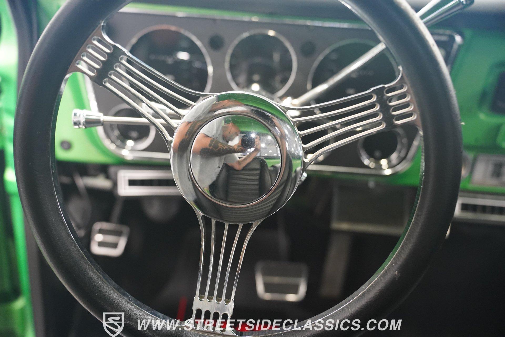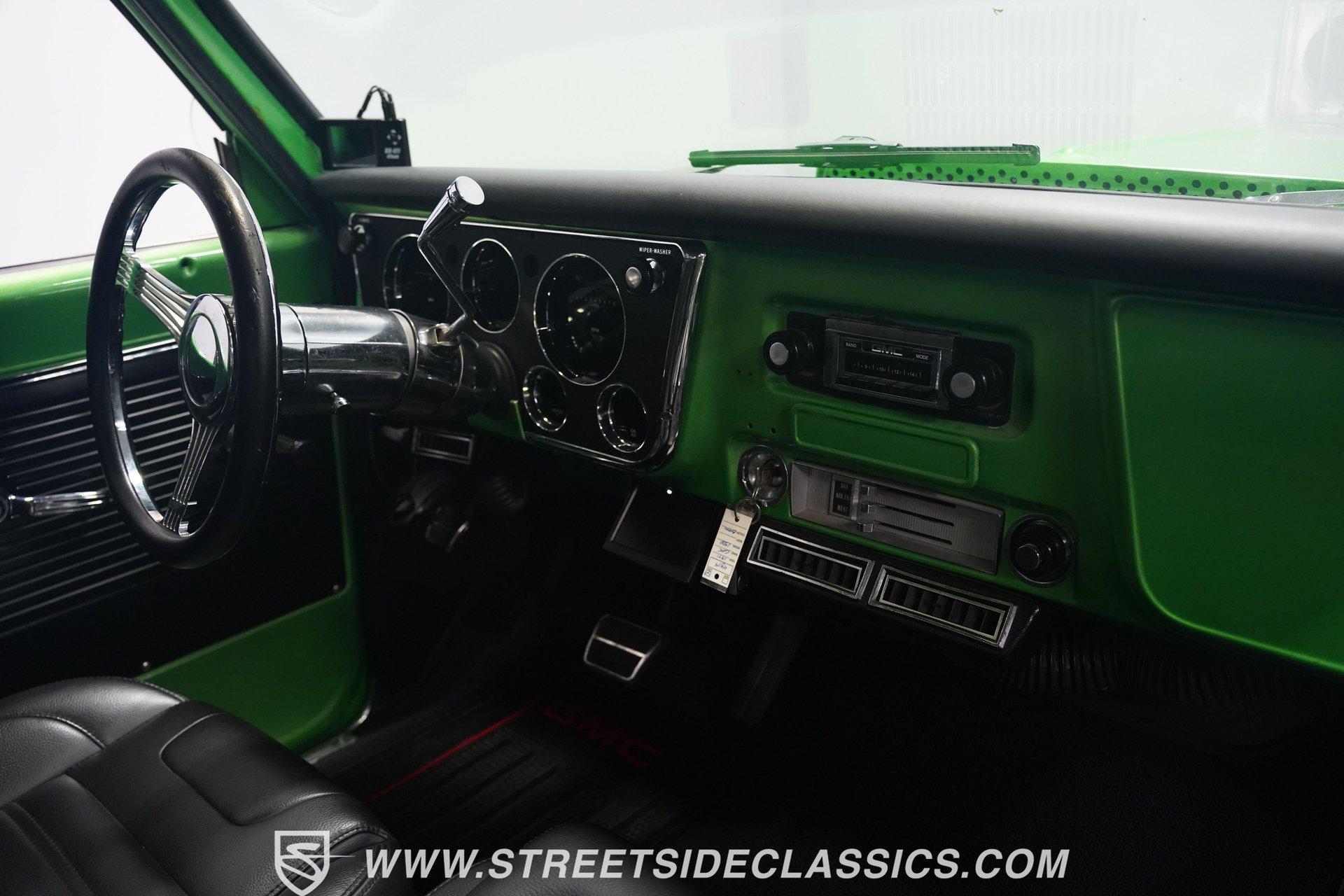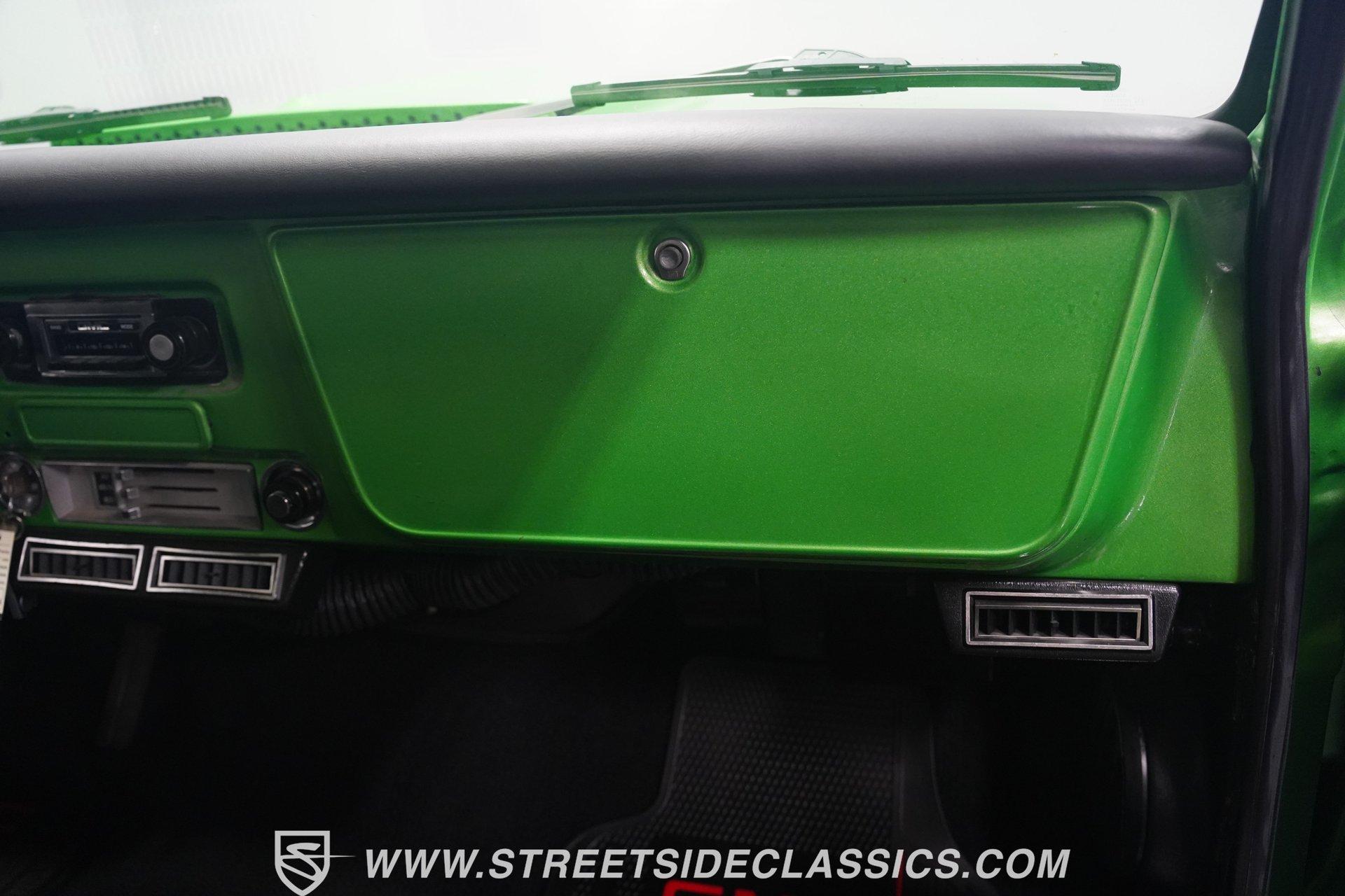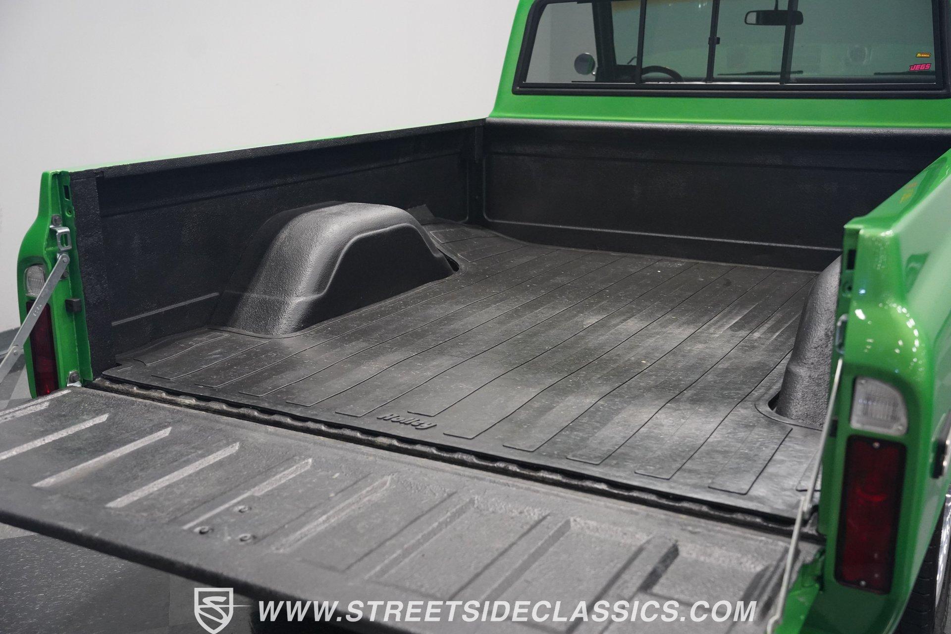 Fully restored and upgraded for modern performance, this 1971 GMC C1500 brings together old-school truck character and contemporary enhancements. Finished in a rich green color, the exterior features a custom cowl hood for a more aggressive look. The elimination of vent windows and addition of a roll pan create cleaner lines throughout. Chrome accents contrast nicely against the green paint, while the aftermarket lighting package adds a current touch. The bed comes equipped with a spray-in liner and rubber mat for durability. Those massive 20" U.S. Mags wheels with 255/40R20 front and 295/45R20 rear tires give the truck a substantial road presence. The black vinyl interior has received a full overhaul with custom bucket seats that provide excellent support. A specially designed center console adds both convenience and style to the cabin. The upgraded dash features modern digital instrumentation that clearly displays all essential information. Driving comfort is enhanced by the billet tilt steering column topped with a matching wheel for precise control. The climate is regulated by an effective under-dash air conditioning system, while entertainment comes via an advanced audio unit with Bluetooth capability. Every element inside works together for a cohesive, updated feel. Power comes from a Target Master/Goodwrench 350 V8 crate motor that looks as good as it runs. For improved drivability, a FiTech electronic fuel injection system replaces the original carburetor. A 700R4 four-speed automatic transmission handles gear changes efficiently. The upgraded suspension system uses front coil springs with shocks and rear coilovers with trailing arms and sway bar for superior handling characteristics. Four-wheel power disc brakes provide strong stopping performance. The truck steers with minimal effort thanks to its power steering system. Hedman headers contribute to better exhaust flow and engine output. HIGHLIGHTS: 350 V8 Crate Engine 4 Speed Automatic Transmission FiTech Electronic Fuel Injection Four-Wheel Power Disc Brakes Hedman Headers 12 Bolt Rear Axle Front Coil Spring with Shocks Rear Coilovers with Trailing Arm and Sway Bar Green Paint Cowl Hood Roll Pan Chrome Brightwork Spray-in Bed Liner with Rubber Mat 20" U.S. Mags Wheels 255/40R20 Front, 295/45R20 Rear Tires Aftermarket Headlights and Taillights Chrome Mirrors Black Interior with Custom Bucket Seats Center Console Billet Tilt Steering Column Billet Steering Wheel Power Steering Digital Dash Air Conditioning AM/FM Radio Bluetooth Radio Updated mechanics and thoughtful exterior and interior modifications, this 1971 GMC C1500 combines the best of vintage truck appeal with modern drivability. The custom touches, quality components, and attention to detail make this pickup stand out among its peers. Call today!