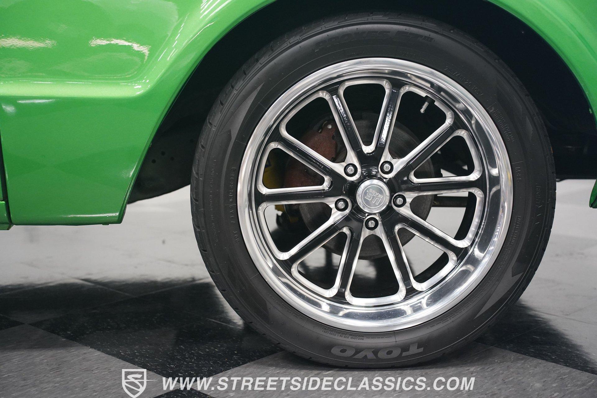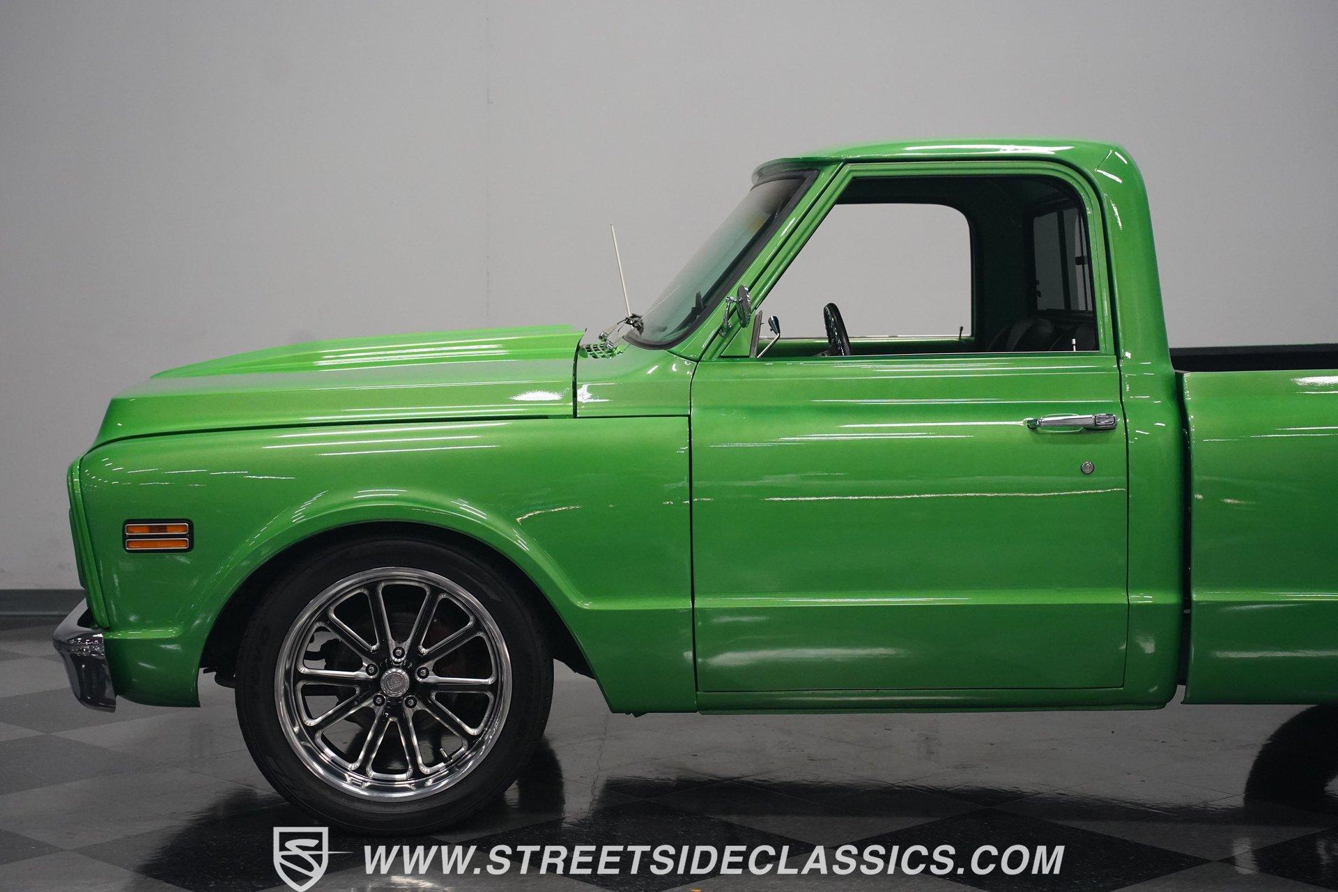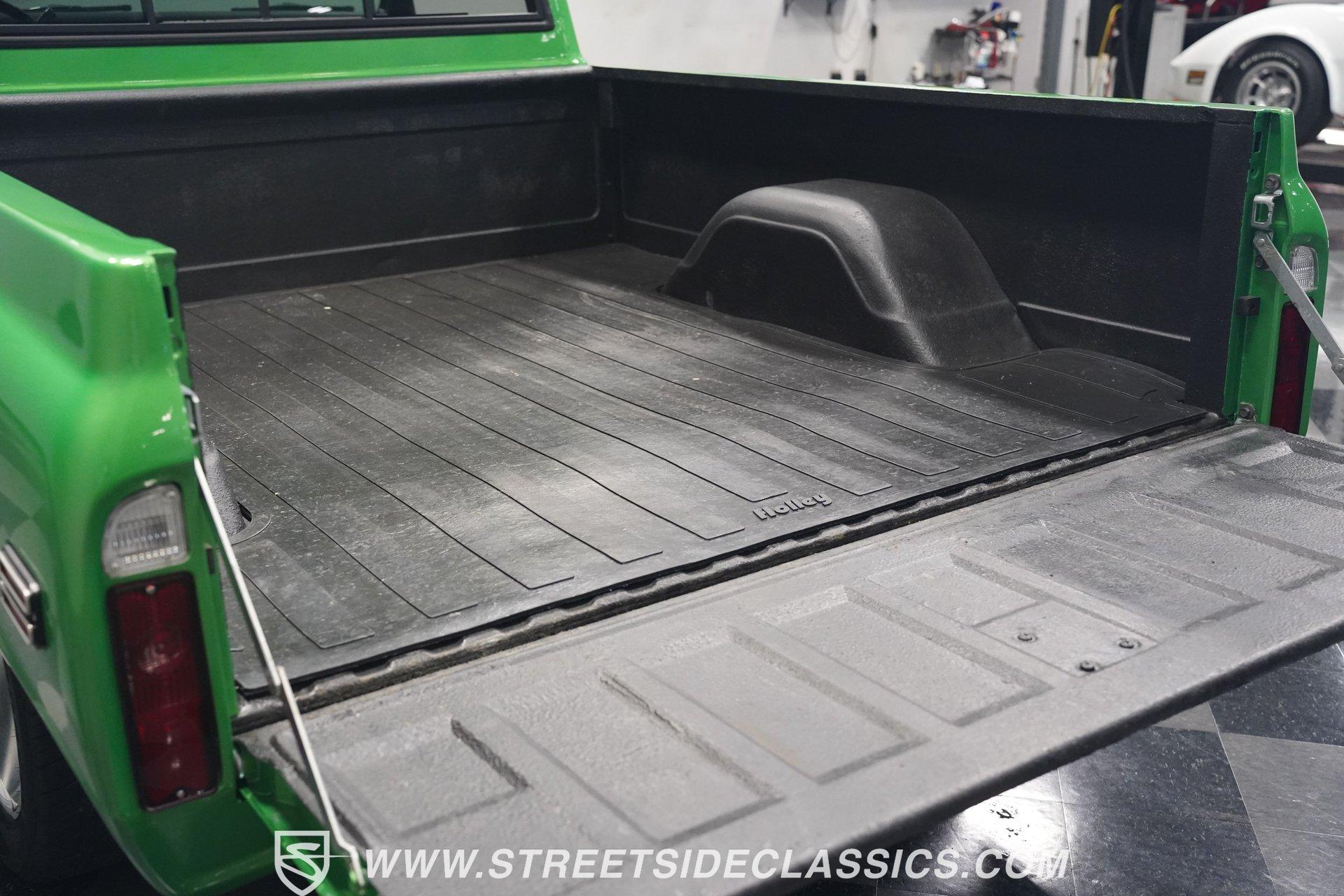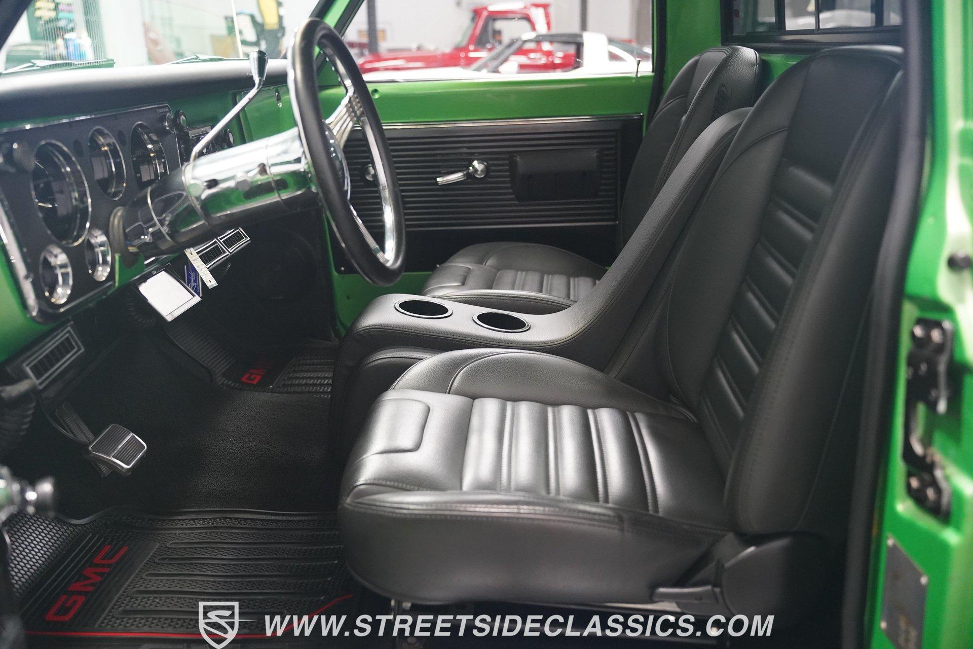 Fully restored and upgraded for modern performance, this 1971 GMC C1500 brings together old-school truck character and contemporary enhancements. Finished in a rich green color, the exterior features a custom cowl hood for a more aggressive look. The elimination of vent windows and addition of a roll pan create cleaner lines throughout. Chrome accents contrast nicely against the green paint, while the aftermarket lighting package adds a current touch. The bed comes equipped with a spray-in liner and rubber mat for durability. Those massive 20" U.S. Mags wheels with 255/40R20 front and 295/45R20 rear tires give the truck a substantial road presence. The black vinyl interior has received a full overhaul with custom bucket seats that provide excellent support. A specially designed center console adds both convenience and style to the cabin. The upgraded dash features modern digital instrumentation that clearly displays all essential information. Driving comfort is enhanced by the billet tilt steering column topped with a matching wheel for precise control. The climate is regulated by an effective under-dash air conditioning system, while entertainment comes via an advanced audio unit with Bluetooth capability. Every element inside works together for a cohesive, updated feel. Power comes from a Target Master/Goodwrench 350 V8 crate motor that looks as good as it runs. For improved drivability, a FiTech electronic fuel injection system replaces the original carburetor. A 700R4 four-speed automatic transmission handles gear changes efficiently. The upgraded suspension system uses front coil springs with shocks and rear coilovers with trailing arms and sway bar for superior handling characteristics. Four-wheel power disc brakes provide strong stopping performance. The truck steers with minimal effort thanks to its power steering system. Hedman headers contribute to better exhaust flow and engine output. HIGHLIGHTS: 350 V8 Crate Engine 4 Speed Automatic Transmission FiTech Electronic Fuel Injection Four-Wheel Power Disc Brakes Hedman Headers 12 Bolt Rear Axle Front Coil Spring with Shocks Rear Coilovers with Trailing Arm and Sway Bar Green Paint Cowl Hood Roll Pan Chrome Brightwork Spray-in Bed Liner with Rubber Mat 20" U.S. Mags Wheels 255/40R20 Front, 295/45R20 Rear Tires Aftermarket Headlights and Taillights Chrome Mirrors Black Interior with Custom Bucket Seats Center Console Billet Tilt Steering Column Billet Steering Wheel Power Steering Digital Dash Air Conditioning AM/FM Radio Bluetooth Radio Updated mechanics and thoughtful exterior and interior modifications, this 1971 GMC C1500 combines the best of vintage truck appeal with modern drivability. The custom touches, quality components, and attention to detail make this pickup stand out among its peers. Call today!