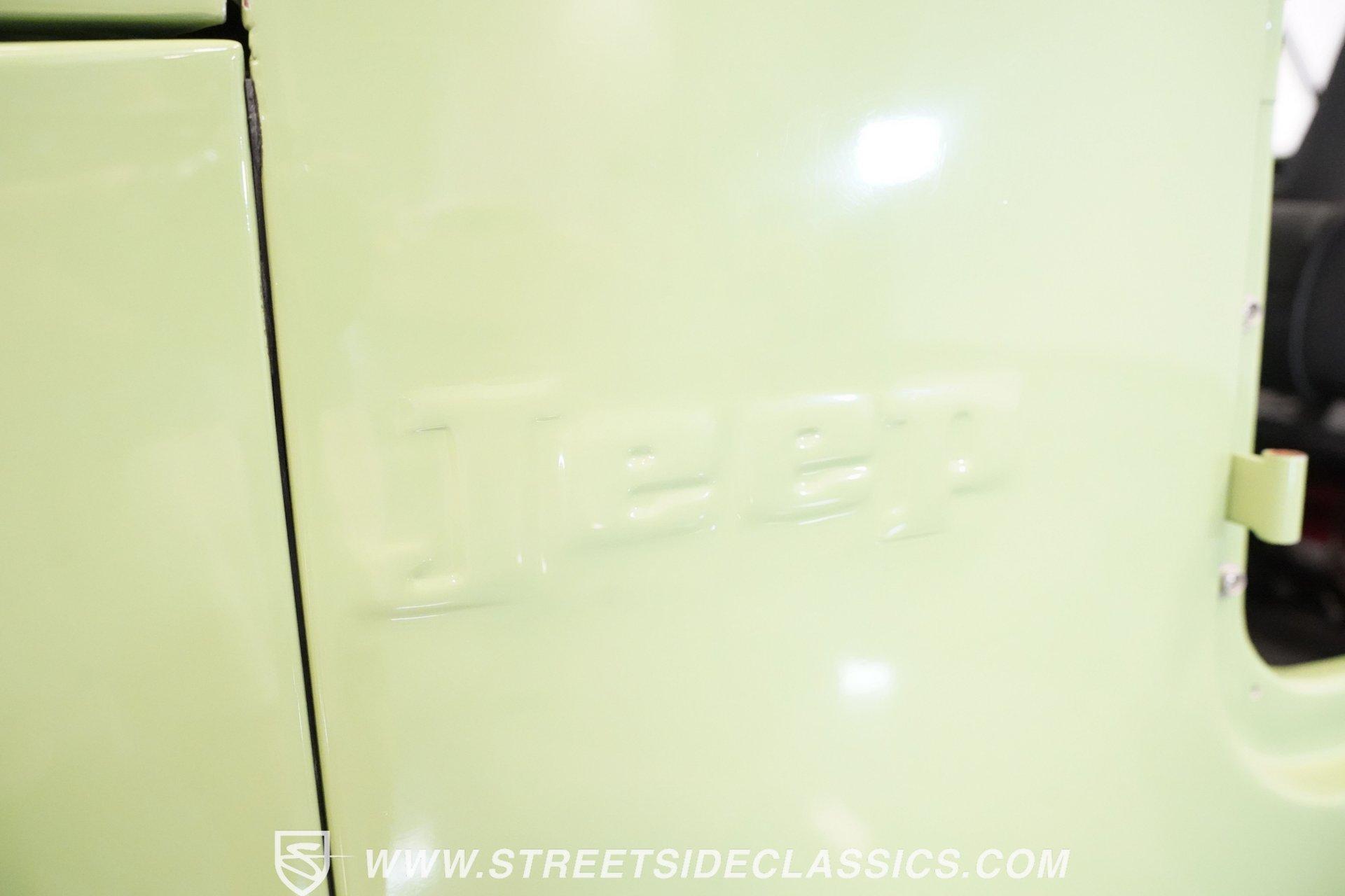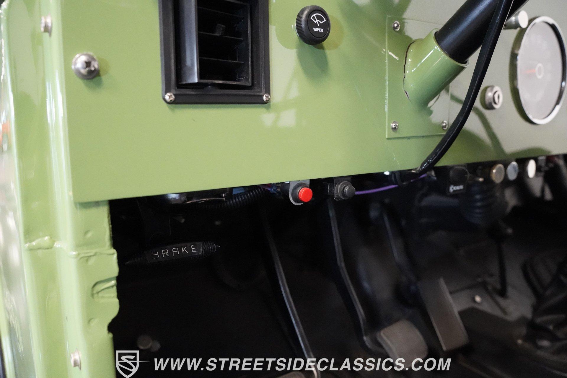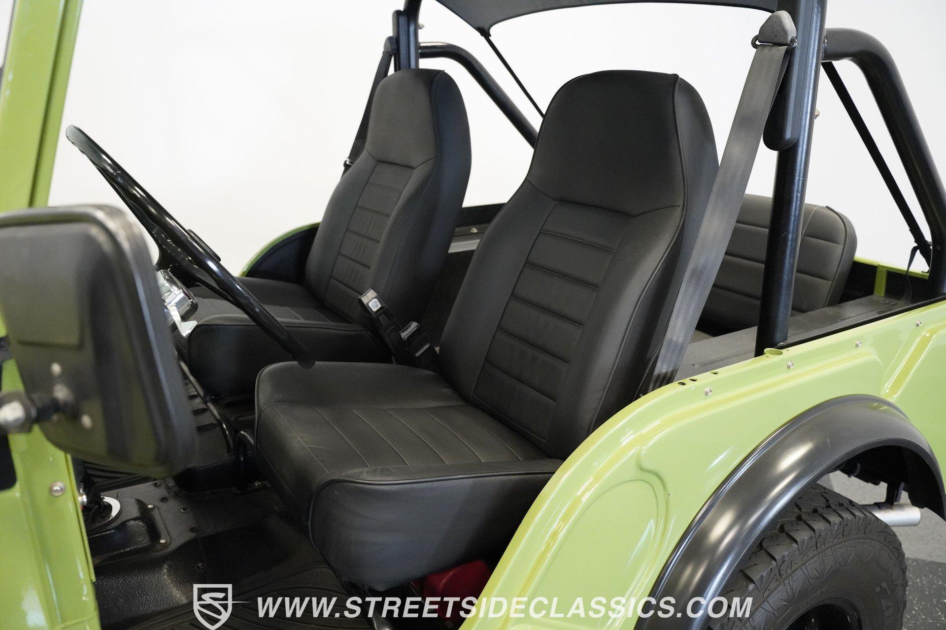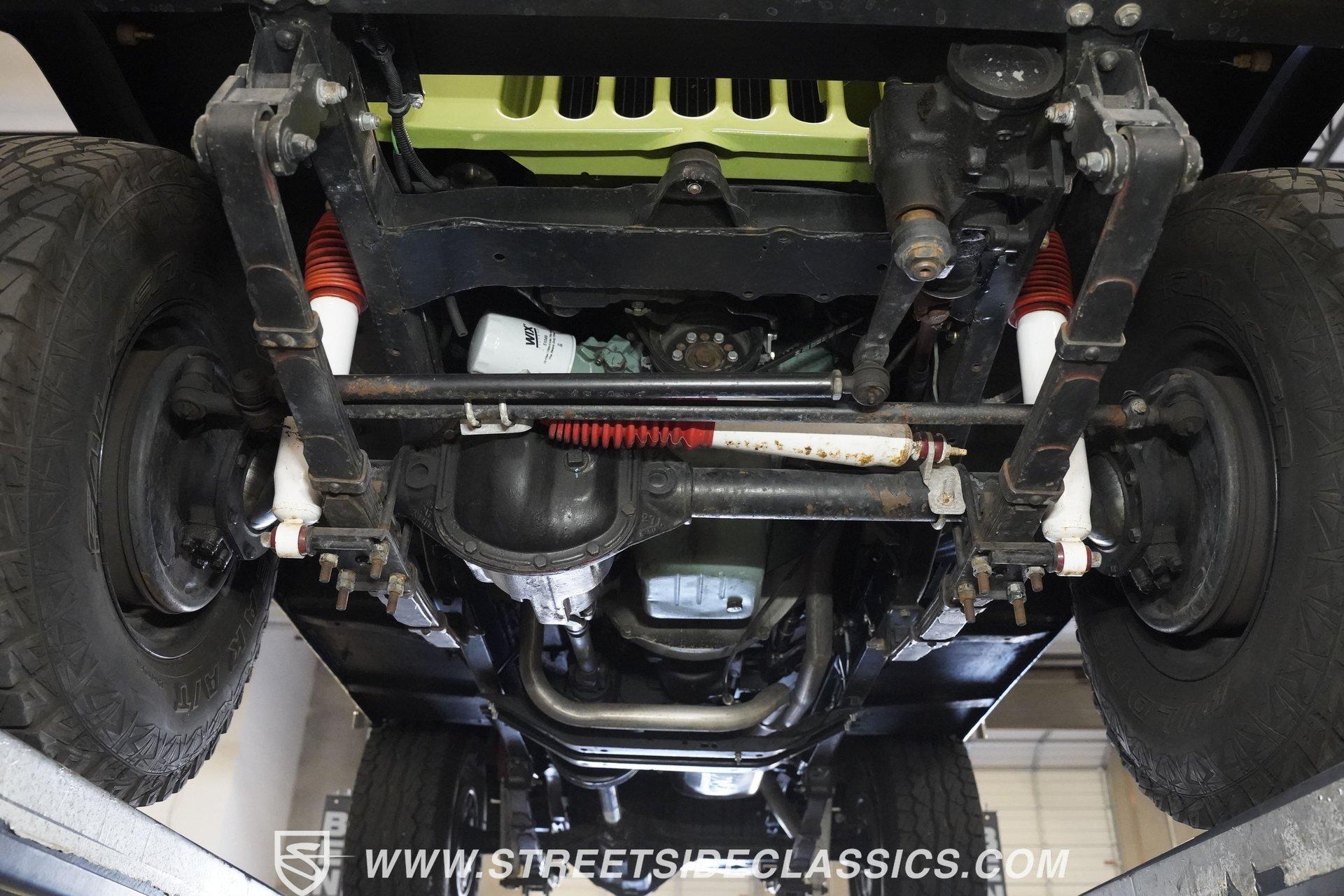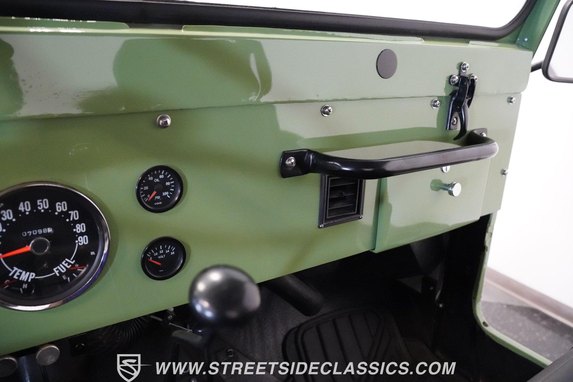 Adventure calls, and this 1966 Jeep CJ5 answers with lime green paint that cuts through any landscape. Ghost flames flow across the hood in subtle artistry, while black plastic fender flares protect against trail debris. KC light pods mounted on the front bumper illuminate night runs and dawn expeditions. Riding on 15" black steel wheels with 31x10.50R15LT Falken Wild Peak AT tires, this machine grips everything from rocky ledges to muddy creek beds. The black soft vinyl bikini top and roll bar complete the open-air freedom that defines true off-road capability. Inside the cabin, black vinyl bucket seats hold you steady through rough terrain, with a matching rear bench for extra passengers on backcountry trips. The floor shifter puts complete control of the 3-speed manual transmission at your fingertips. KC-branded switch for the front light pods sits within easy reach under the dash. Rhinoliner-type material covers the floorboards, handling mud, dirt, and water without complaint. Power steering makes tight trail navigation manageable, while heat keeps occupants warm during high-altitude adventures. Front seatbelts add safety for challenging terrain. The Dauntless 225 CI V6 engine with GM TBI-style fuel injection provides steady power for climbing steep grades and powering through obstacles. Connected to a 3-speed manual transmission with Dana transfer case, this drivetrain sends power to both Dana 27 front and Dana 45 rear axles. Four-wheel drive tackles everything from loose sand to slick rock. Solid axles with leaf springs front and rear handle punishment from boulder fields and washouts. Rancho shocks at all four corners absorb impacts while the Rancho steering stabilizer maintains control. Warn locking hubs in front engage when traction gets serious. Davis unified ignition distributor, Moroso valve covers, and Moroso air cleaner keep the engine bay organized. Single exhaust runs through a MagnaFlow muffler, while drum brakes handle stopping duties on descents. HIGHLIGHTS: Dauntless 225 CI V6 Engine GM TBI Style Fuel Injection 3 Speed Manual Transmission Dana Transfer Case Four Wheel Drive Dana 27 Front Axle Dana 45 Rear Axle Solid Axles with Leaf Springs Rancho Shocks All Four Corners Rancho Steering Stabilizer Billet Radiator Overflow MagnaFlow Muffler Drum Brakes Lime Green Paint Ghost Flames Sanded into Hood Black Plastic Fender Flares KC Light Pods on Front Bumper 15" Black Steel Wheels 31x10.50R15LT Falken Wild Peak AT Tires Black Soft Vinyl Bikini Top Black Roll Bar Black Interior with Bucket Seats Rear Bench Seat Floor Shifter Rhinoliner Type Floor Material KC Branded Switch for Light Pods Power Steering 7,098 Miles Since Built Trail-tested capability meets Dauntless V6 reliability in this 1966 Jeep CJ5 that's equipped for serious outdoor adventures. From desert runs to mountain passes, this classic off-roader handles backcountry challenges with authentic CJ durability. Call today!