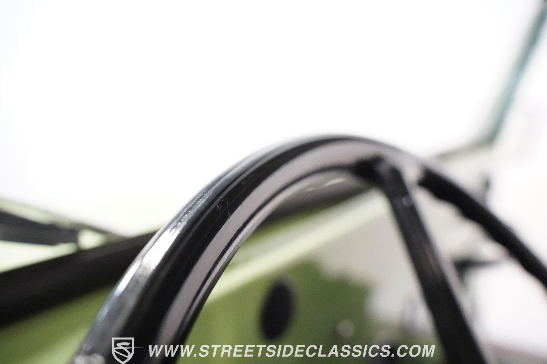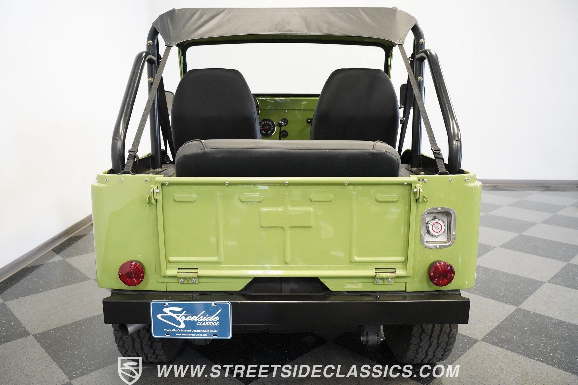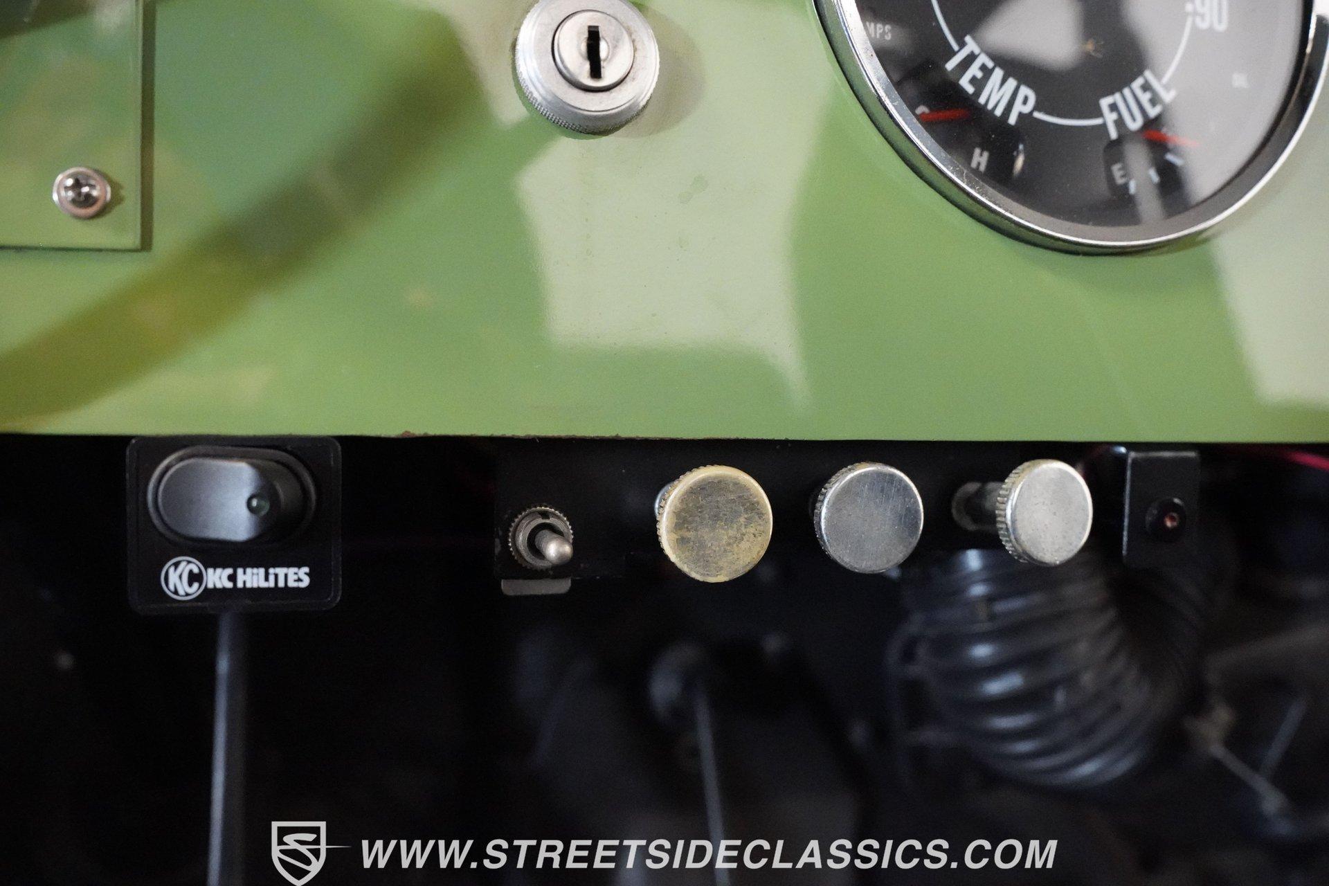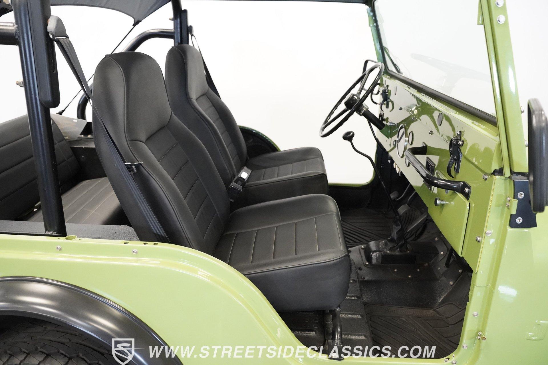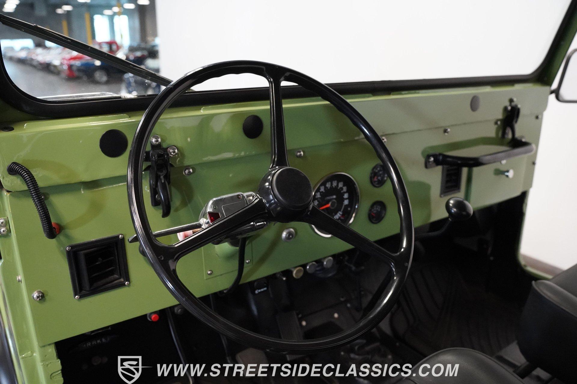 Adventure calls, and this 1966 Jeep CJ5 answers with lime green paint that cuts through any landscape. Ghost flames flow across the hood in subtle artistry, while black plastic fender flares protect against trail debris. KC light pods mounted on the front bumper illuminate night runs and dawn expeditions. Riding on 15" black steel wheels with 31x10.50R15LT Falken Wild Peak AT tires, this machine grips everything from rocky ledges to muddy creek beds. The black soft vinyl bikini top and roll bar complete the open-air freedom that defines true off-road capability. Inside the cabin, black vinyl bucket seats hold you steady through rough terrain, with a matching rear bench for extra passengers on backcountry trips. The floor shifter puts complete control of the 3-speed manual transmission at your fingertips. KC-branded switch for the front light pods sits within easy reach under the dash. Rhinoliner-type material covers the floorboards, handling mud, dirt, and water without complaint. Power steering makes tight trail navigation manageable, while heat keeps occupants warm during high-altitude adventures. Front seatbelts add safety for challenging terrain. The Dauntless 225 CI V6 engine with GM TBI-style fuel injection provides steady power for climbing steep grades and powering through obstacles. Connected to a 3-speed manual transmission with Dana transfer case, this drivetrain sends power to both Dana 27 front and Dana 45 rear axles. Four-wheel drive tackles everything from loose sand to slick rock. Solid axles with leaf springs front and rear handle punishment from boulder fields and washouts. Rancho shocks at all four corners absorb impacts while the Rancho steering stabilizer maintains control. Warn locking hubs in front engage when traction gets serious. Davis unified ignition distributor, Moroso valve covers, and Moroso air cleaner keep the engine bay organized. Single exhaust runs through a MagnaFlow muffler, while drum brakes handle stopping duties on descents. HIGHLIGHTS: Dauntless 225 CI V6 Engine GM TBI Style Fuel Injection 3 Speed Manual Transmission Dana Transfer Case Four Wheel Drive Dana 27 Front Axle Dana 45 Rear Axle Solid Axles with Leaf Springs Rancho Shocks All Four Corners Rancho Steering Stabilizer Billet Radiator Overflow MagnaFlow Muffler Drum Brakes Lime Green Paint Ghost Flames Sanded into Hood Black Plastic Fender Flares KC Light Pods on Front Bumper 15" Black Steel Wheels 31x10.50R15LT Falken Wild Peak AT Tires Black Soft Vinyl Bikini Top Black Roll Bar Black Interior with Bucket Seats Rear Bench Seat Floor Shifter Rhinoliner Type Floor Material KC Branded Switch for Light Pods Power Steering 7,098 Miles Since Built Trail-tested capability meets Dauntless V6 reliability in this 1966 Jeep CJ5 that's equipped for serious outdoor adventures. From desert runs to mountain passes, this classic off-roader handles backcountry challenges with authentic CJ durability. Call today!