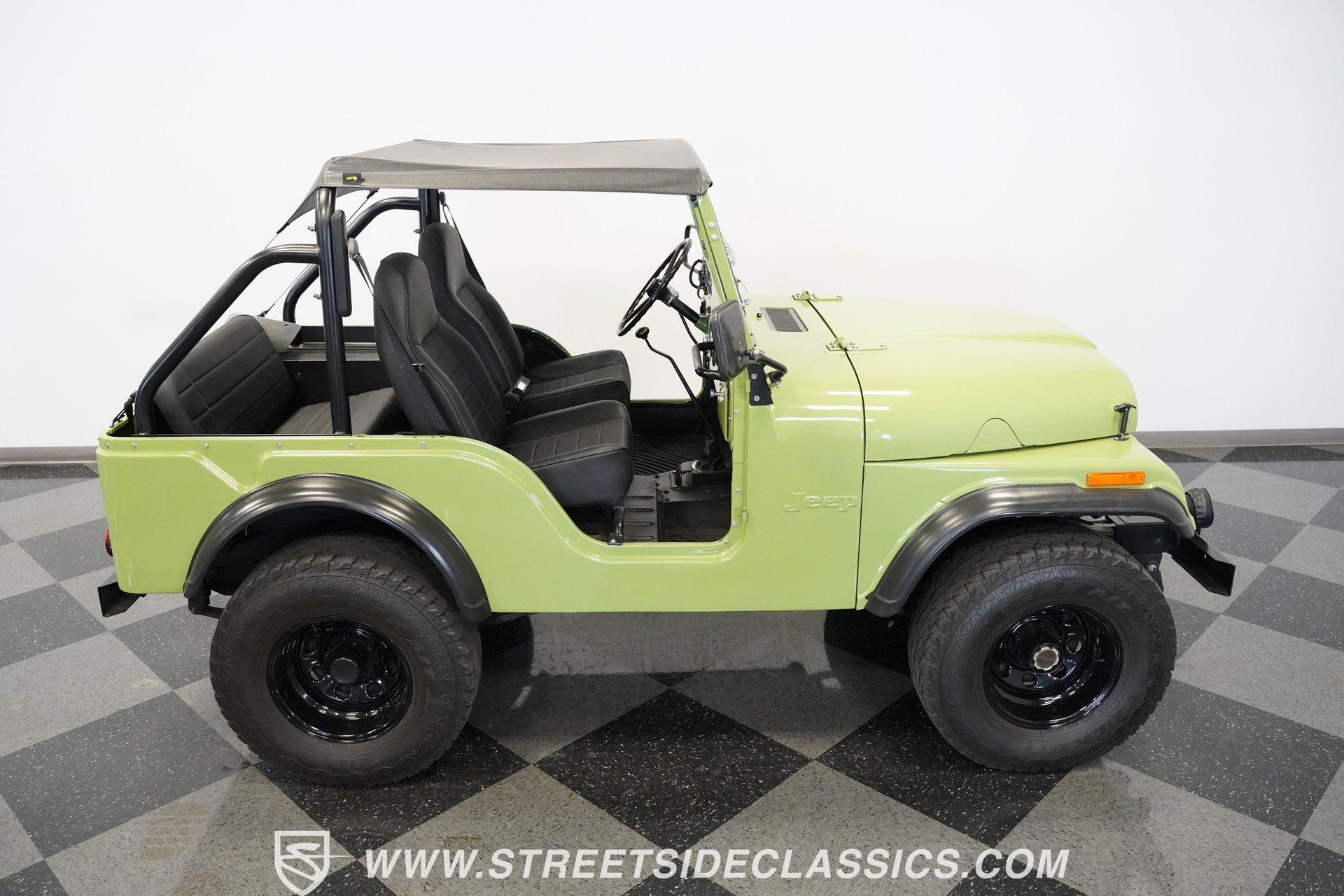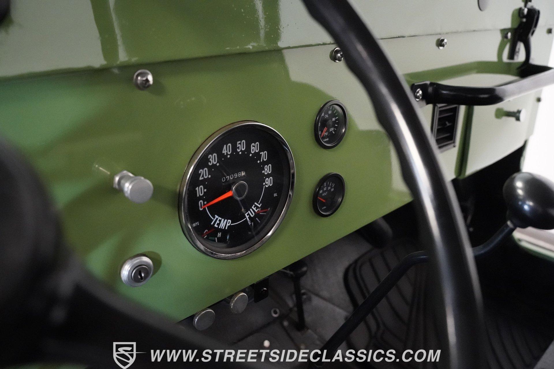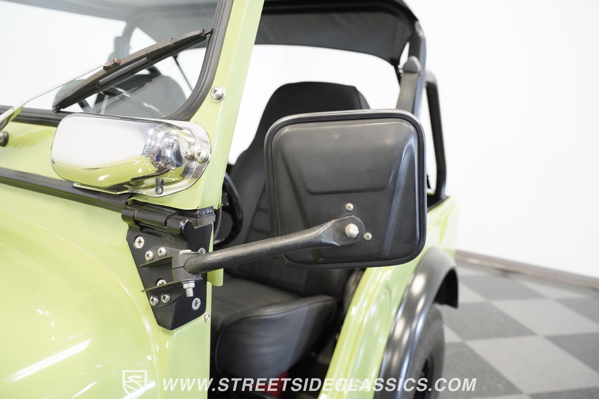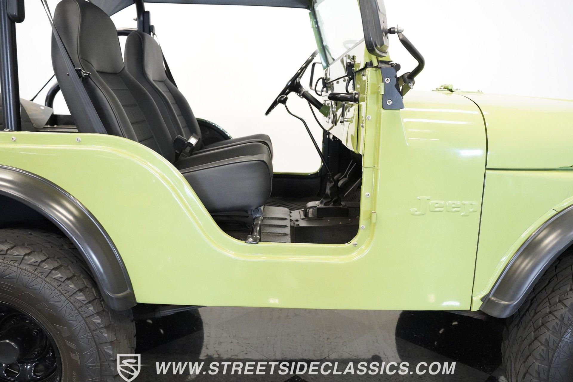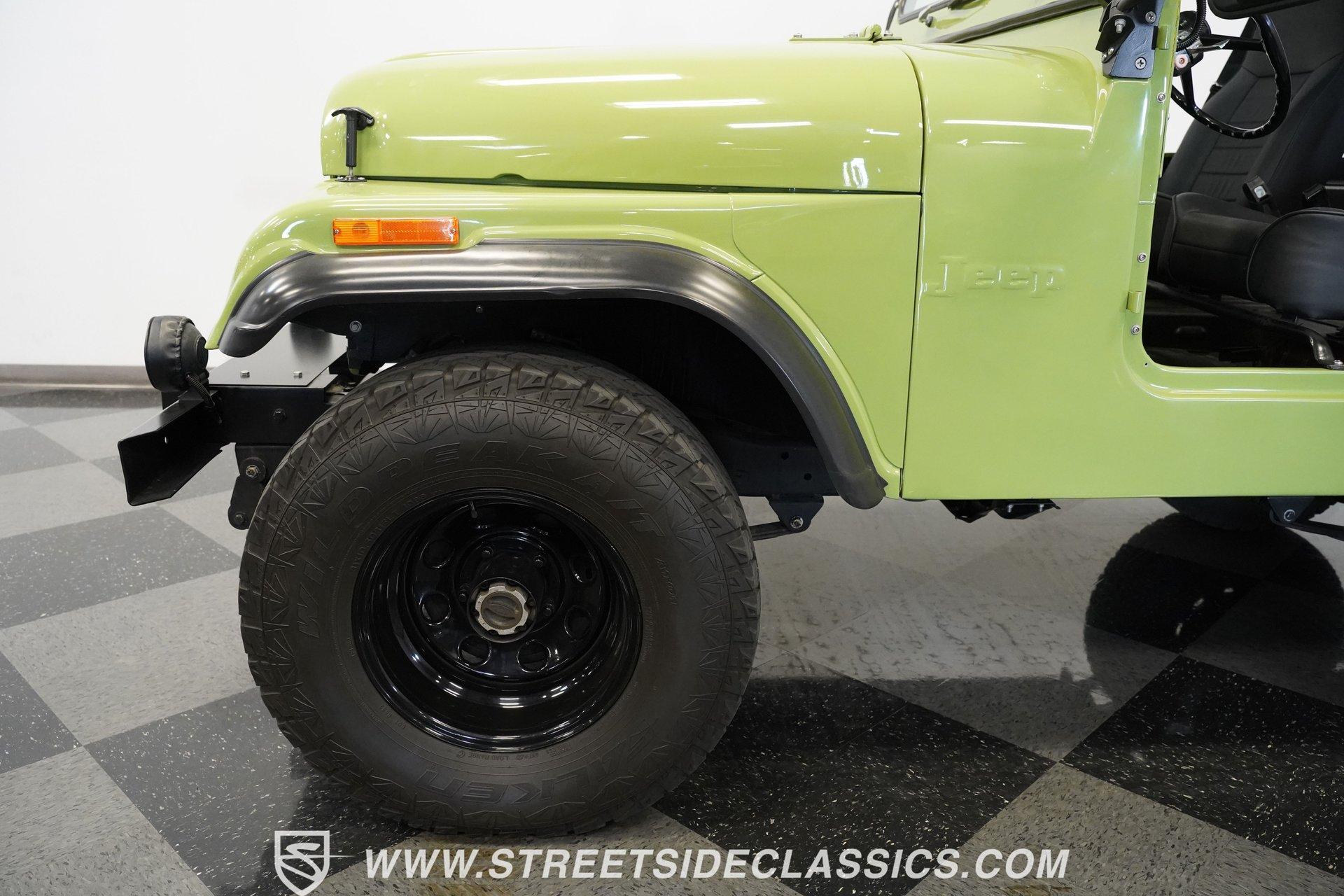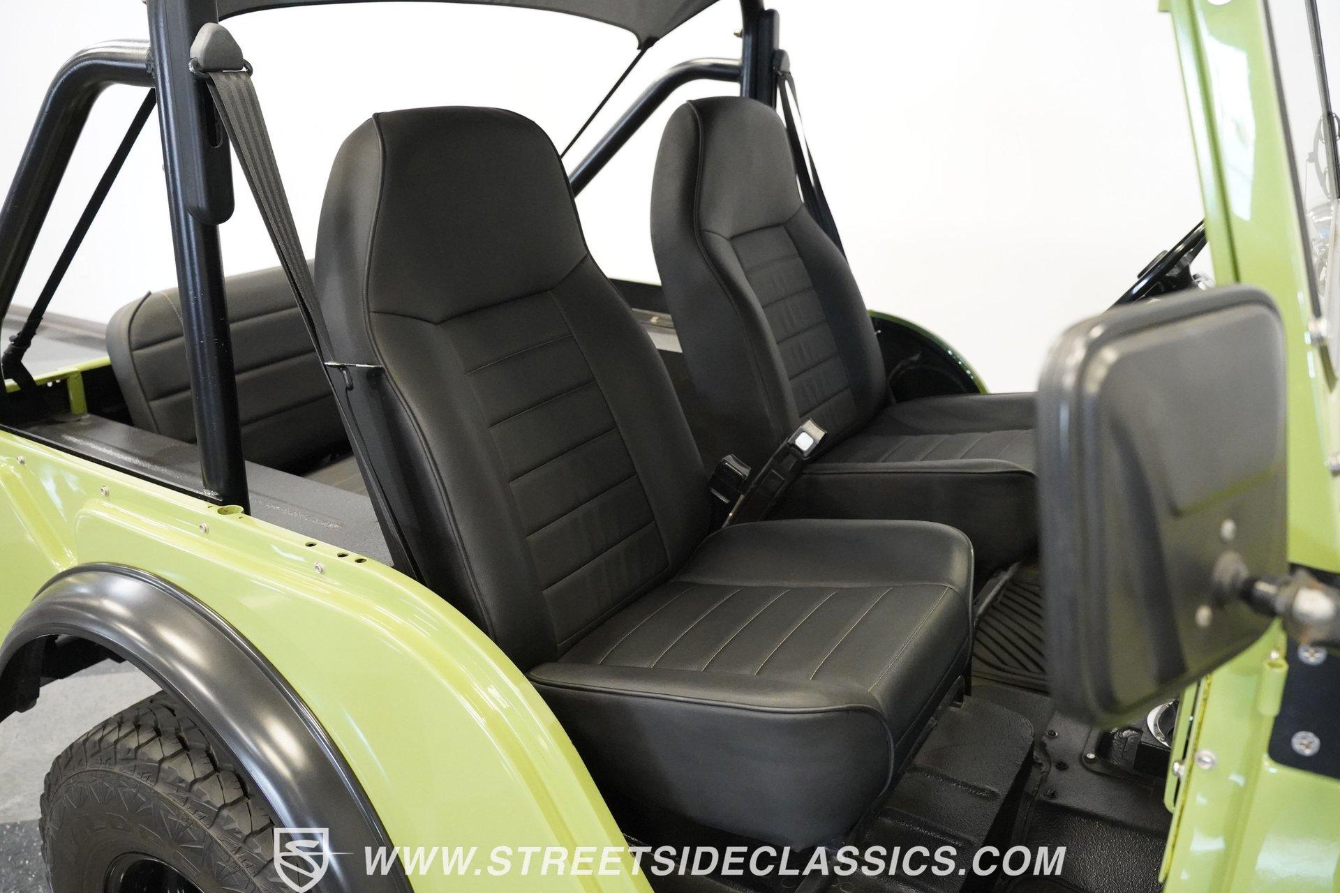 Adventure calls, and this 1966 Jeep CJ5 answers with lime green paint that cuts through any landscape. Ghost flames flow across the hood in subtle artistry, while black plastic fender flares protect against trail debris. KC light pods mounted on the front bumper illuminate night runs and dawn expeditions. Riding on 15" black steel wheels with 31x10.50R15LT Falken Wild Peak AT tires, this machine grips everything from rocky ledges to muddy creek beds. The black soft vinyl bikini top and roll bar complete the open-air freedom that defines true off-road capability. Inside the cabin, black vinyl bucket seats hold you steady through rough terrain, with a matching rear bench for extra passengers on backcountry trips. The floor shifter puts complete control of the 3-speed manual transmission at your fingertips. KC-branded switch for the front light pods sits within easy reach under the dash. Rhinoliner-type material covers the floorboards, handling mud, dirt, and water without complaint. Power steering makes tight trail navigation manageable, while heat keeps occupants warm during high-altitude adventures. Front seatbelts add safety for challenging terrain. The Dauntless 225 CI V6 engine with GM TBI-style fuel injection provides steady power for climbing steep grades and powering through obstacles. Connected to a 3-speed manual transmission with Dana transfer case, this drivetrain sends power to both Dana 27 front and Dana 45 rear axles. Four-wheel drive tackles everything from loose sand to slick rock. Solid axles with leaf springs front and rear handle punishment from boulder fields and washouts. Rancho shocks at all four corners absorb impacts while the Rancho steering stabilizer maintains control. Warn locking hubs in front engage when traction gets serious. Davis unified ignition distributor, Moroso valve covers, and Moroso air cleaner keep the engine bay organized. Single exhaust runs through a MagnaFlow muffler, while drum brakes handle stopping duties on descents. HIGHLIGHTS: Dauntless 225 CI V6 Engine GM TBI Style Fuel Injection 3 Speed Manual Transmission Dana Transfer Case Four Wheel Drive Dana 27 Front Axle Dana 45 Rear Axle Solid Axles with Leaf Springs Rancho Shocks All Four Corners Rancho Steering Stabilizer Billet Radiator Overflow MagnaFlow Muffler Drum Brakes Lime Green Paint Ghost Flames Sanded into Hood Black Plastic Fender Flares KC Light Pods on Front Bumper 15" Black Steel Wheels 31x10.50R15LT Falken Wild Peak AT Tires Black Soft Vinyl Bikini Top Black Roll Bar Black Interior with Bucket Seats Rear Bench Seat Floor Shifter Rhinoliner Type Floor Material KC Branded Switch for Light Pods Power Steering 7,098 Miles Since Built Trail-tested capability meets Dauntless V6 reliability in this 1966 Jeep CJ5 that's equipped for serious outdoor adventures. From desert runs to mountain passes, this classic off-roader handles backcountry challenges with authentic CJ durability. Call today!