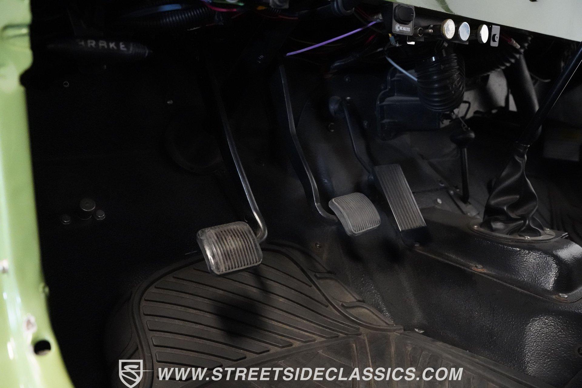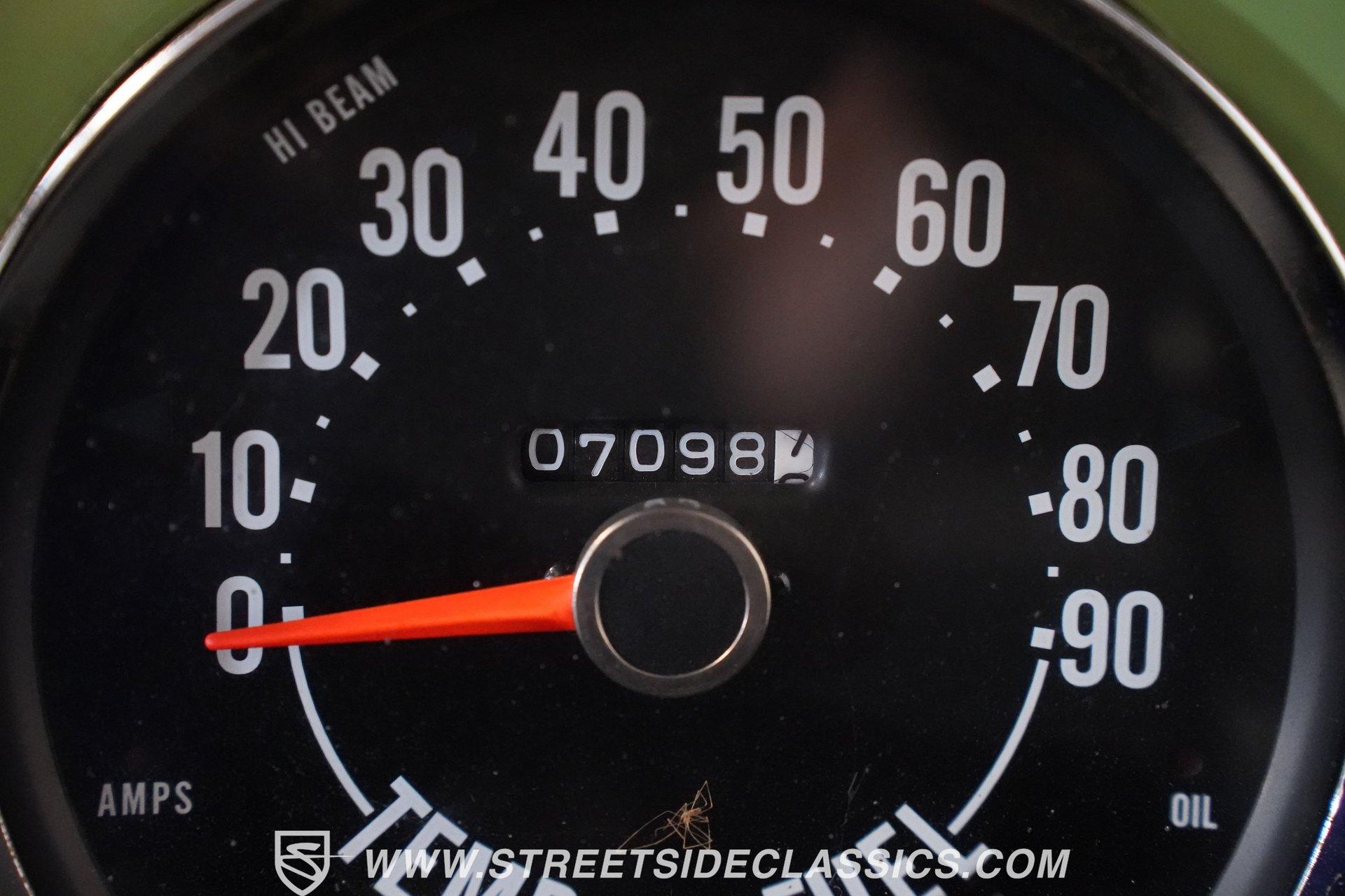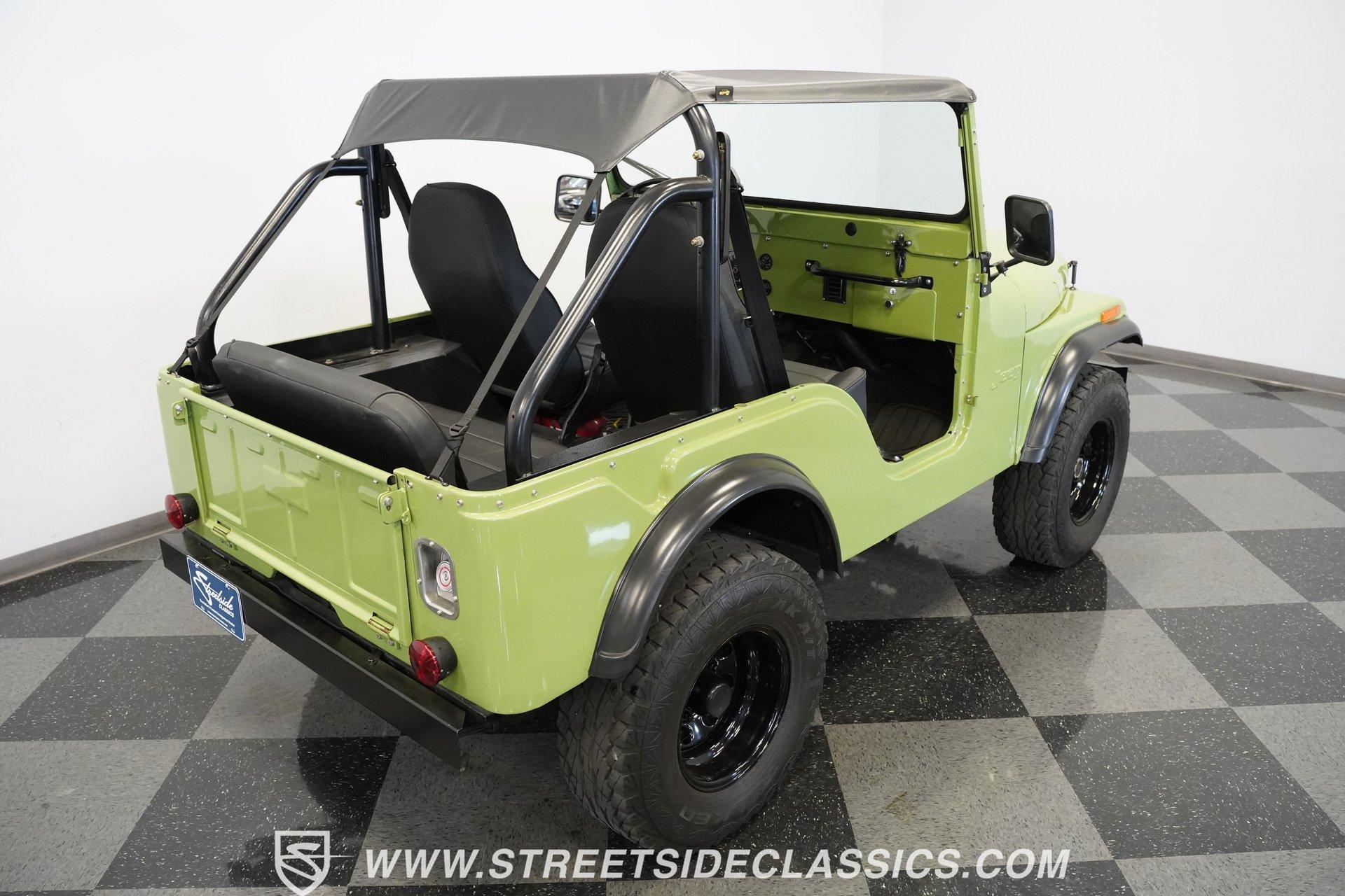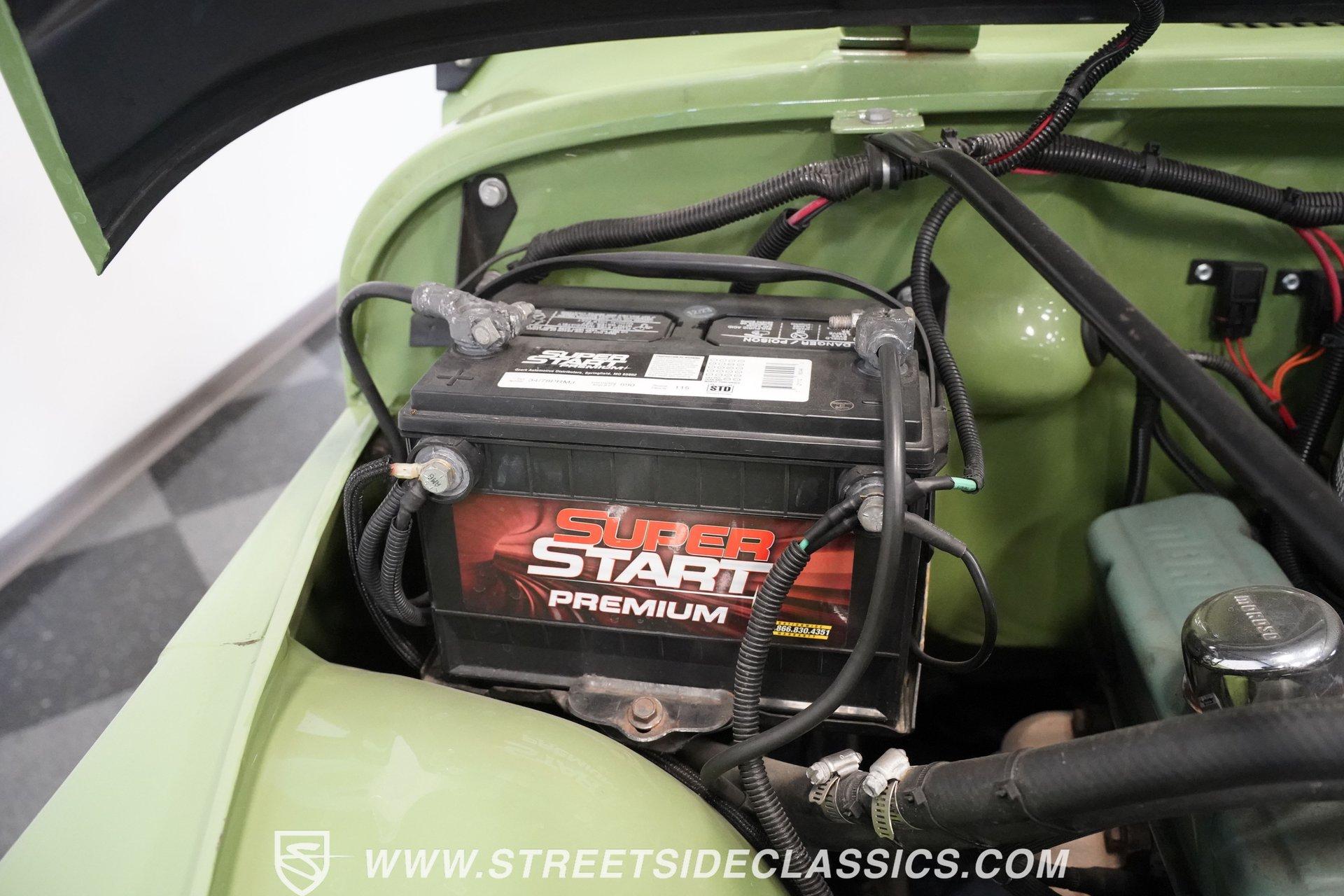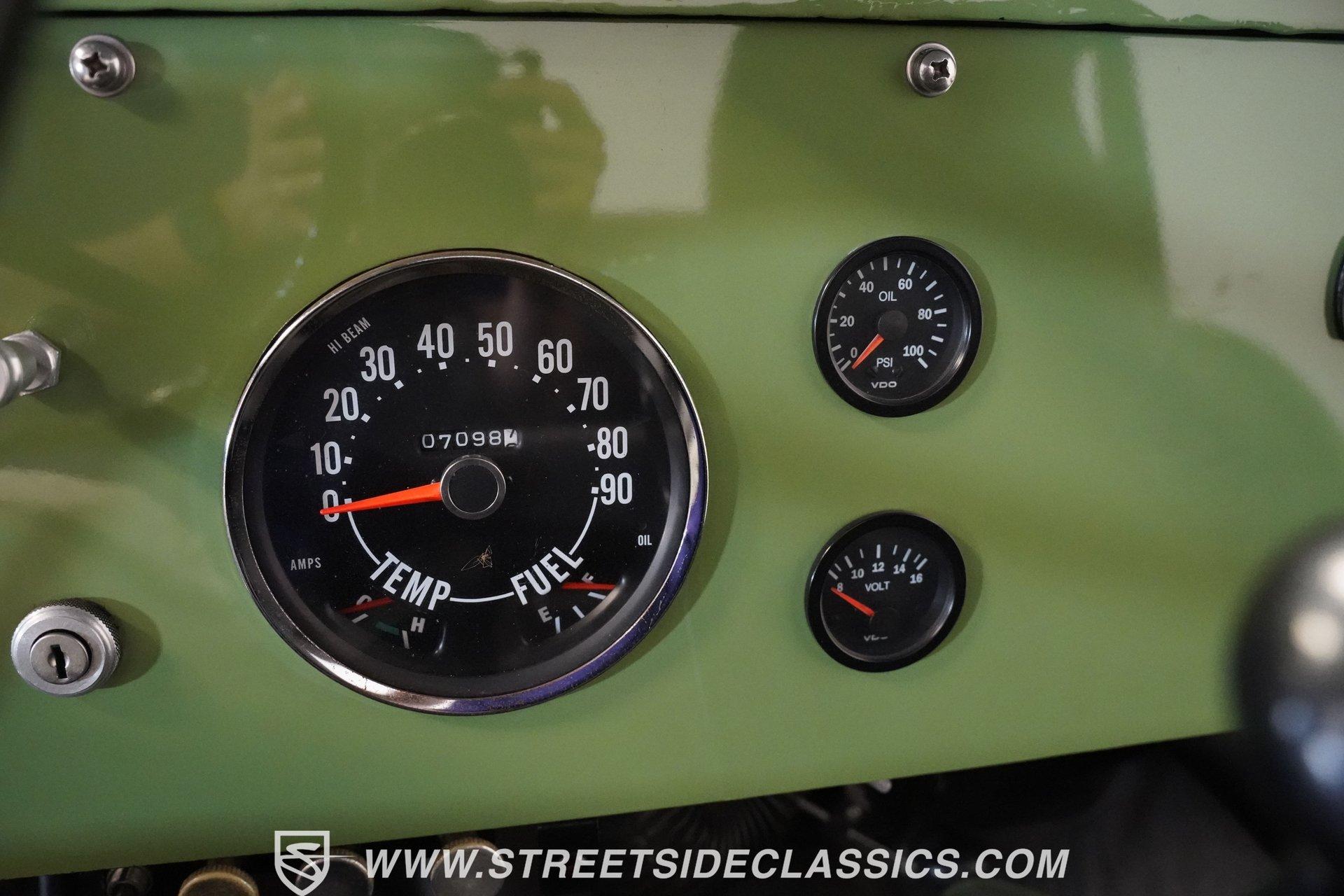 Adventure calls, and this 1966 Jeep CJ5 answers with lime green paint that cuts through any landscape. Ghost flames flow across the hood in subtle artistry, while black plastic fender flares protect against trail debris. KC light pods mounted on the front bumper illuminate night runs and dawn expeditions. Riding on 15" black steel wheels with 31x10.50R15LT Falken Wild Peak AT tires, this machine grips everything from rocky ledges to muddy creek beds. The black soft vinyl bikini top and roll bar complete the open-air freedom that defines true off-road capability. Inside the cabin, black vinyl bucket seats hold you steady through rough terrain, with a matching rear bench for extra passengers on backcountry trips. The floor shifter puts complete control of the 3-speed manual transmission at your fingertips. KC-branded switch for the front light pods sits within easy reach under the dash. Rhinoliner-type material covers the floorboards, handling mud, dirt, and water without complaint. Power steering makes tight trail navigation manageable, while heat keeps occupants warm during high-altitude adventures. Front seatbelts add safety for challenging terrain. The Dauntless 225 CI V6 engine with GM TBI-style fuel injection provides steady power for climbing steep grades and powering through obstacles. Connected to a 3-speed manual transmission with Dana transfer case, this drivetrain sends power to both Dana 27 front and Dana 45 rear axles. Four-wheel drive tackles everything from loose sand to slick rock. Solid axles with leaf springs front and rear handle punishment from boulder fields and washouts. Rancho shocks at all four corners absorb impacts while the Rancho steering stabilizer maintains control. Warn locking hubs in front engage when traction gets serious. Davis unified ignition distributor, Moroso valve covers, and Moroso air cleaner keep the engine bay organized. Single exhaust runs through a MagnaFlow muffler, while drum brakes handle stopping duties on descents. HIGHLIGHTS: Dauntless 225 CI V6 Engine GM TBI Style Fuel Injection 3 Speed Manual Transmission Dana Transfer Case Four Wheel Drive Dana 27 Front Axle Dana 45 Rear Axle Solid Axles with Leaf Springs Rancho Shocks All Four Corners Rancho Steering Stabilizer Billet Radiator Overflow MagnaFlow Muffler Drum Brakes Lime Green Paint Ghost Flames Sanded into Hood Black Plastic Fender Flares KC Light Pods on Front Bumper 15" Black Steel Wheels 31x10.50R15LT Falken Wild Peak AT Tires Black Soft Vinyl Bikini Top Black Roll Bar Black Interior with Bucket Seats Rear Bench Seat Floor Shifter Rhinoliner Type Floor Material KC Branded Switch for Light Pods Power Steering 7,098 Miles Since Built Trail-tested capability meets Dauntless V6 reliability in this 1966 Jeep CJ5 that's equipped for serious outdoor adventures. From desert runs to mountain passes, this classic off-roader handles backcountry challenges with authentic CJ durability. Call today!