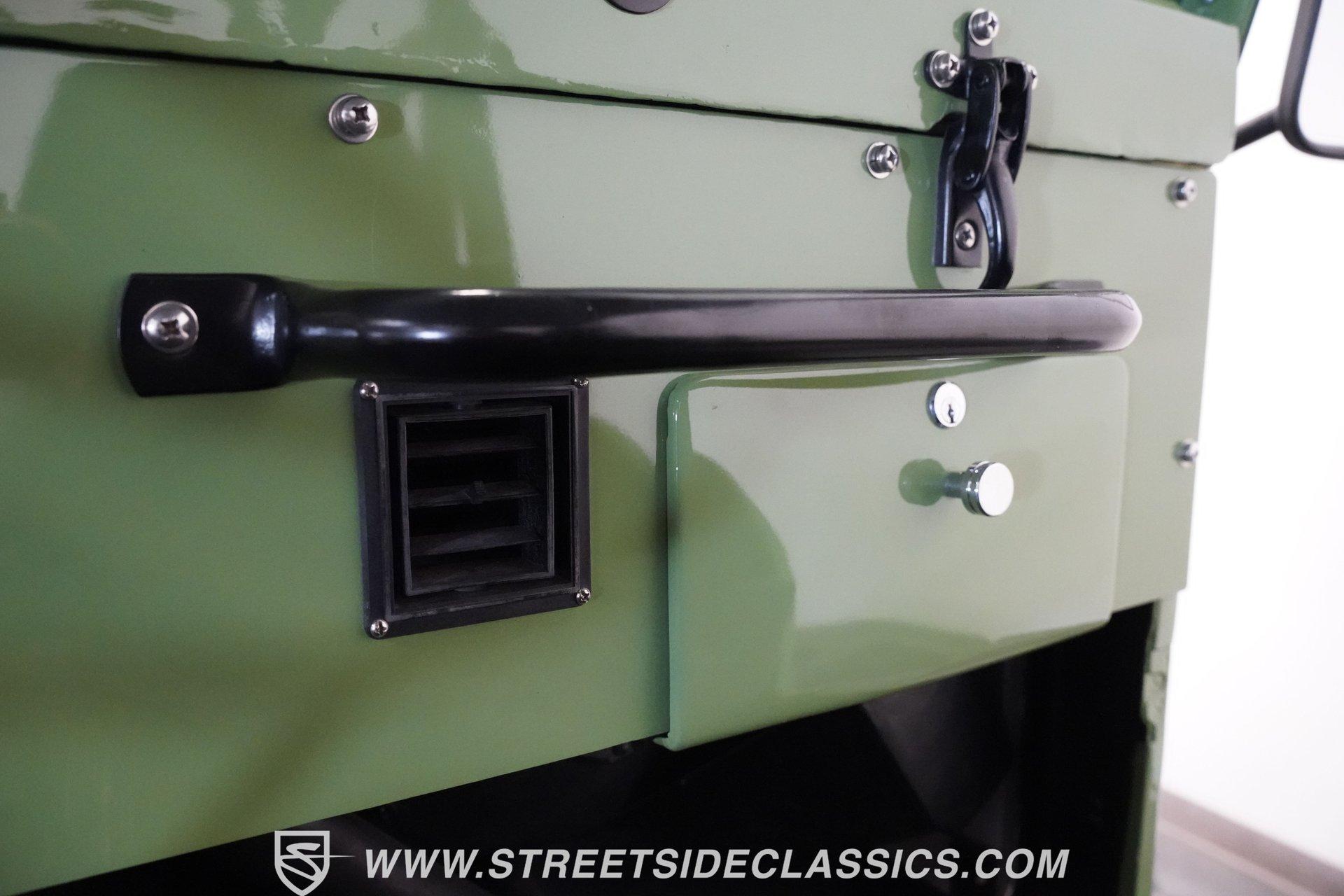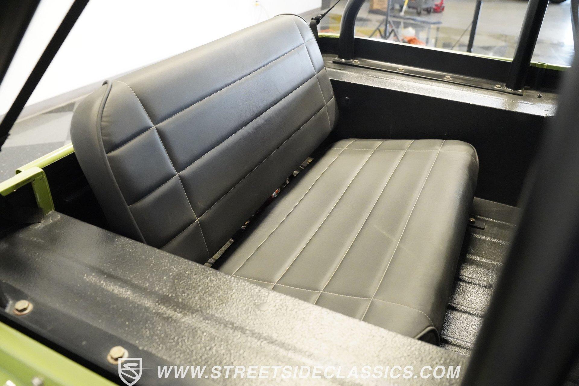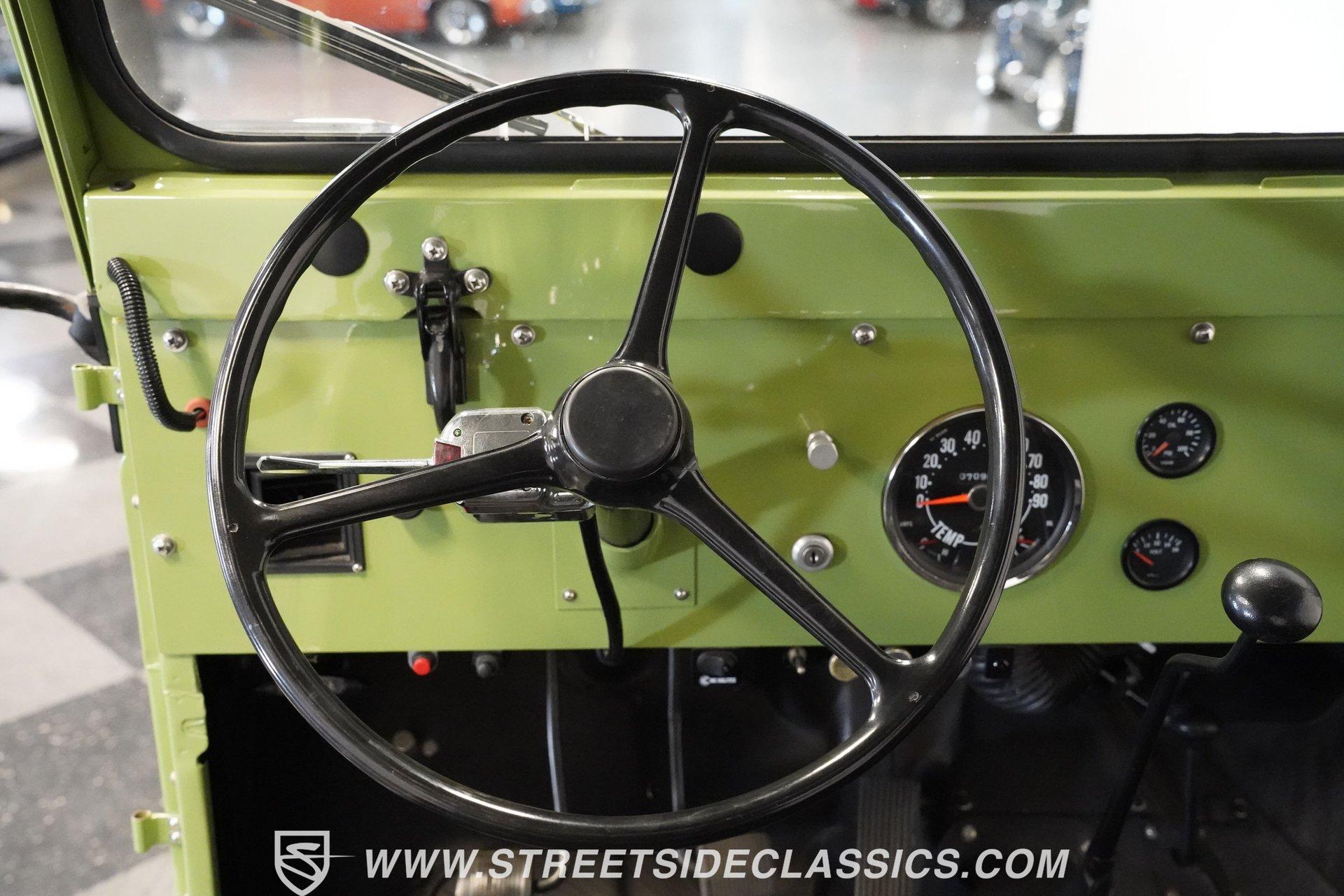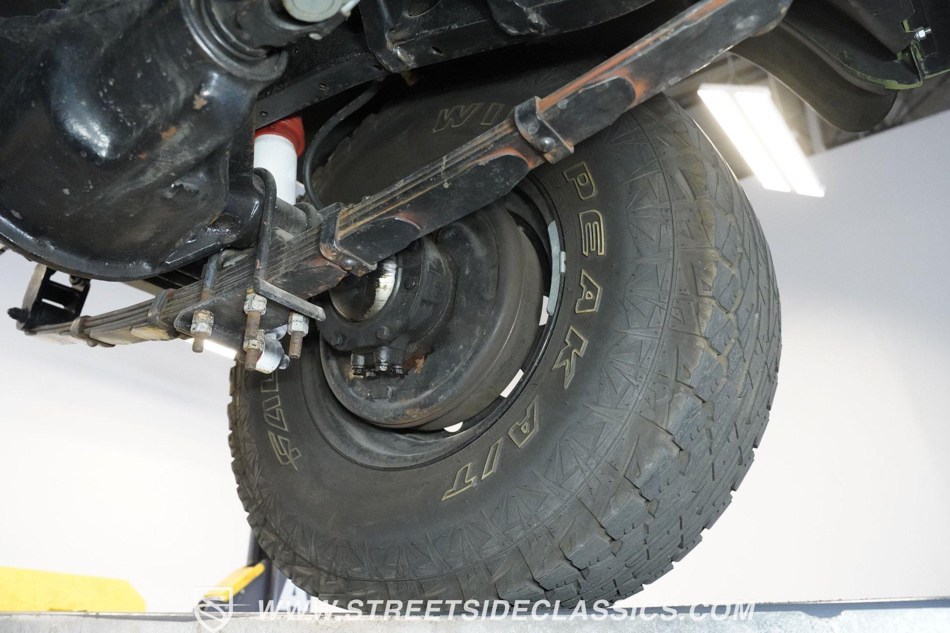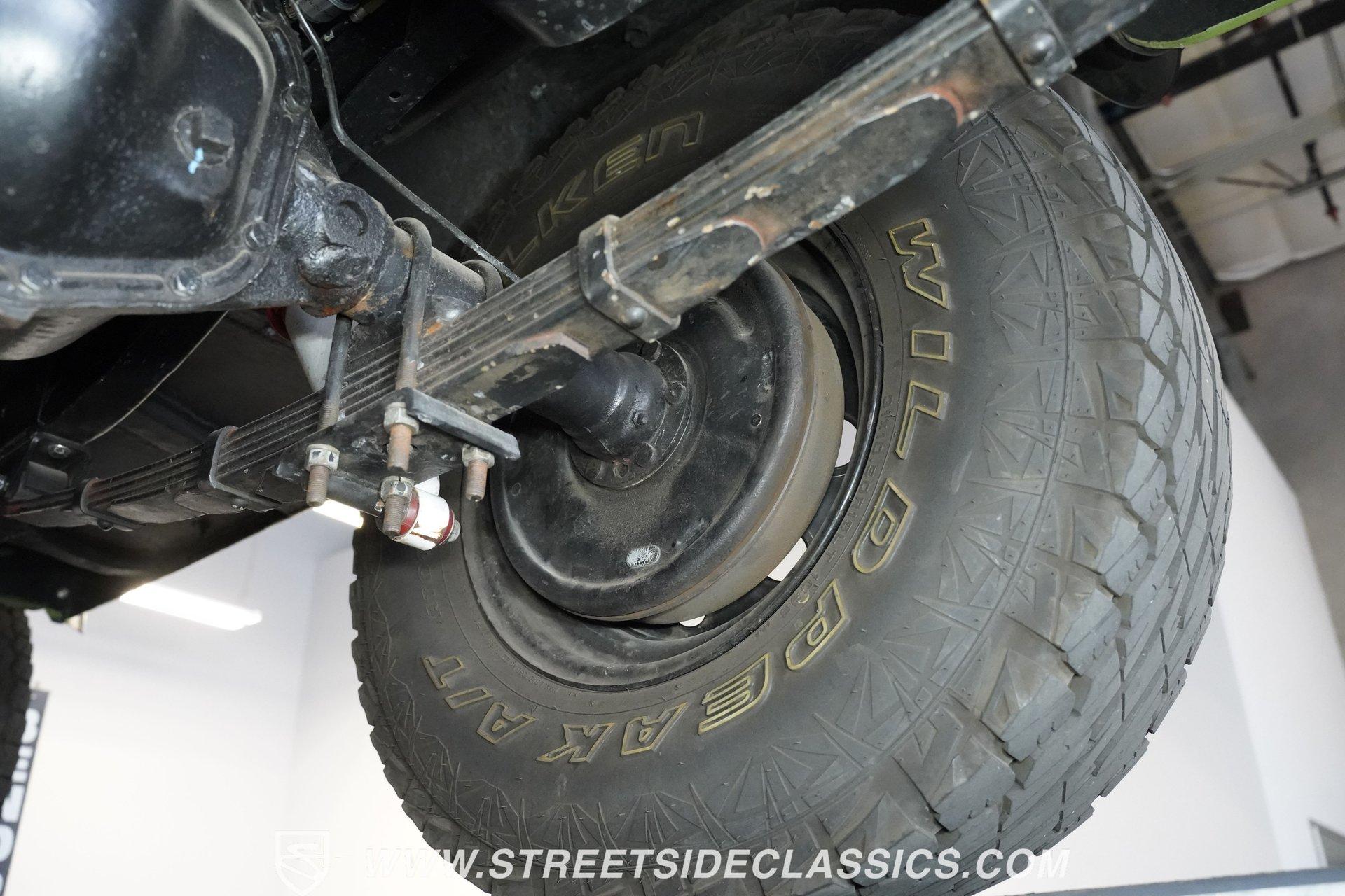 Adventure calls, and this 1966 Jeep CJ5 answers with lime green paint that cuts through any landscape. Ghost flames flow across the hood in subtle artistry, while black plastic fender flares protect against trail debris. KC light pods mounted on the front bumper illuminate night runs and dawn expeditions. Riding on 15" black steel wheels with 31x10.50R15LT Falken Wild Peak AT tires, this machine grips everything from rocky ledges to muddy creek beds. The black soft vinyl bikini top and roll bar complete the open-air freedom that defines true off-road capability. Inside the cabin, black vinyl bucket seats hold you steady through rough terrain, with a matching rear bench for extra passengers on backcountry trips. The floor shifter puts complete control of the 3-speed manual transmission at your fingertips. KC-branded switch for the front light pods sits within easy reach under the dash. Rhinoliner-type material covers the floorboards, handling mud, dirt, and water without complaint. Power steering makes tight trail navigation manageable, while heat keeps occupants warm during high-altitude adventures. Front seatbelts add safety for challenging terrain. The Dauntless 225 CI V6 engine with GM TBI-style fuel injection provides steady power for climbing steep grades and powering through obstacles. Connected to a 3-speed manual transmission with Dana transfer case, this drivetrain sends power to both Dana 27 front and Dana 45 rear axles. Four-wheel drive tackles everything from loose sand to slick rock. Solid axles with leaf springs front and rear handle punishment from boulder fields and washouts. Rancho shocks at all four corners absorb impacts while the Rancho steering stabilizer maintains control. Warn locking hubs in front engage when traction gets serious. Davis unified ignition distributor, Moroso valve covers, and Moroso air cleaner keep the engine bay organized. Single exhaust runs through a MagnaFlow muffler, while drum brakes handle stopping duties on descents. HIGHLIGHTS: Dauntless 225 CI V6 Engine GM TBI Style Fuel Injection 3 Speed Manual Transmission Dana Transfer Case Four Wheel Drive Dana 27 Front Axle Dana 45 Rear Axle Solid Axles with Leaf Springs Rancho Shocks All Four Corners Rancho Steering Stabilizer Billet Radiator Overflow MagnaFlow Muffler Drum Brakes Lime Green Paint Ghost Flames Sanded into Hood Black Plastic Fender Flares KC Light Pods on Front Bumper 15" Black Steel Wheels 31x10.50R15LT Falken Wild Peak AT Tires Black Soft Vinyl Bikini Top Black Roll Bar Black Interior with Bucket Seats Rear Bench Seat Floor Shifter Rhinoliner Type Floor Material KC Branded Switch for Light Pods Power Steering 7,098 Miles Since Built Trail-tested capability meets Dauntless V6 reliability in this 1966 Jeep CJ5 that's equipped for serious outdoor adventures. From desert runs to mountain passes, this classic off-roader handles backcountry challenges with authentic CJ durability. Call today!