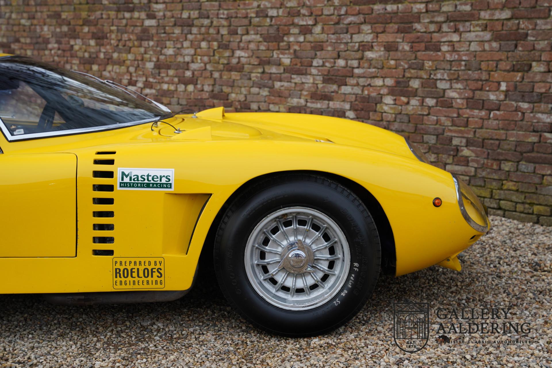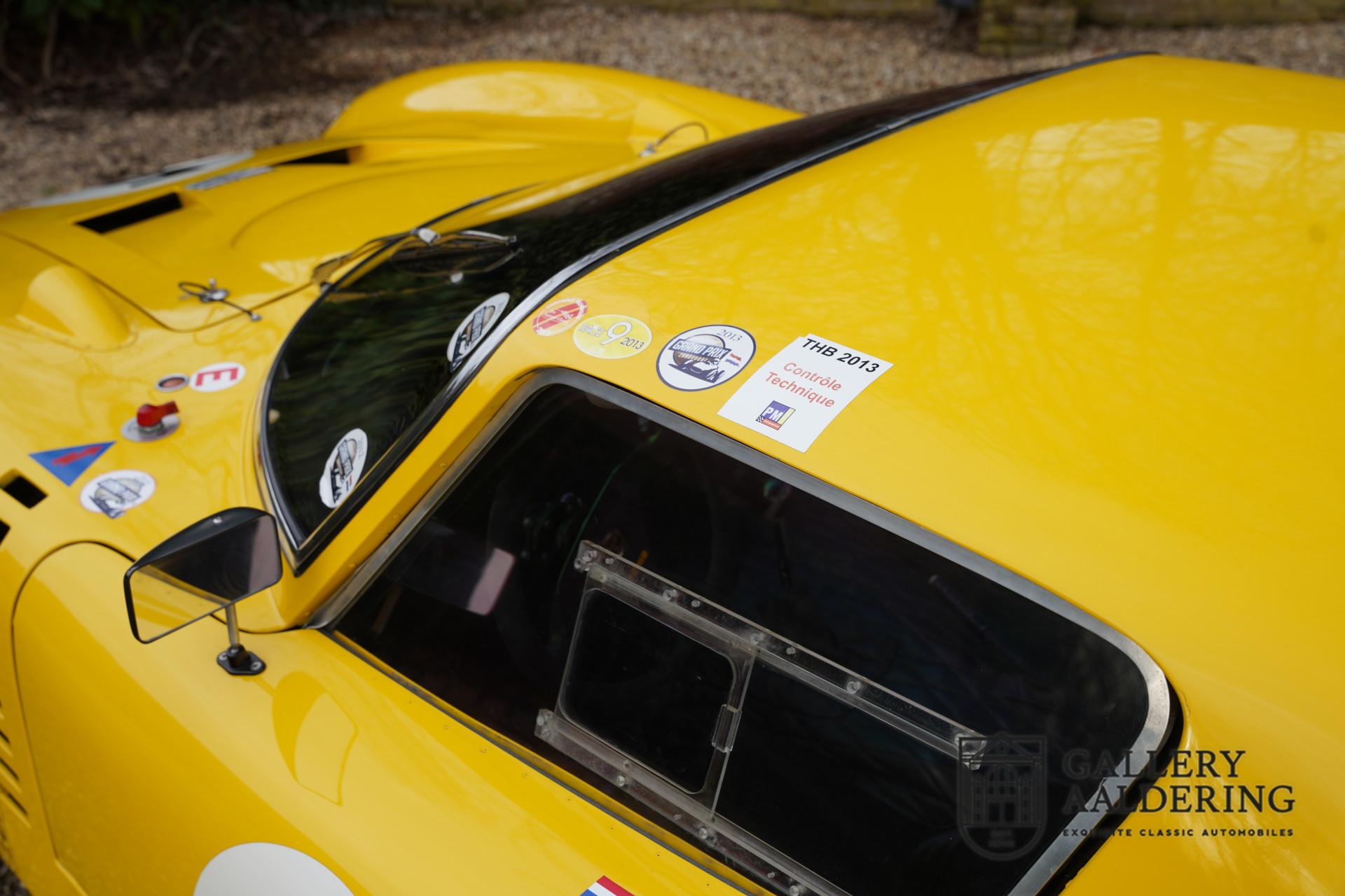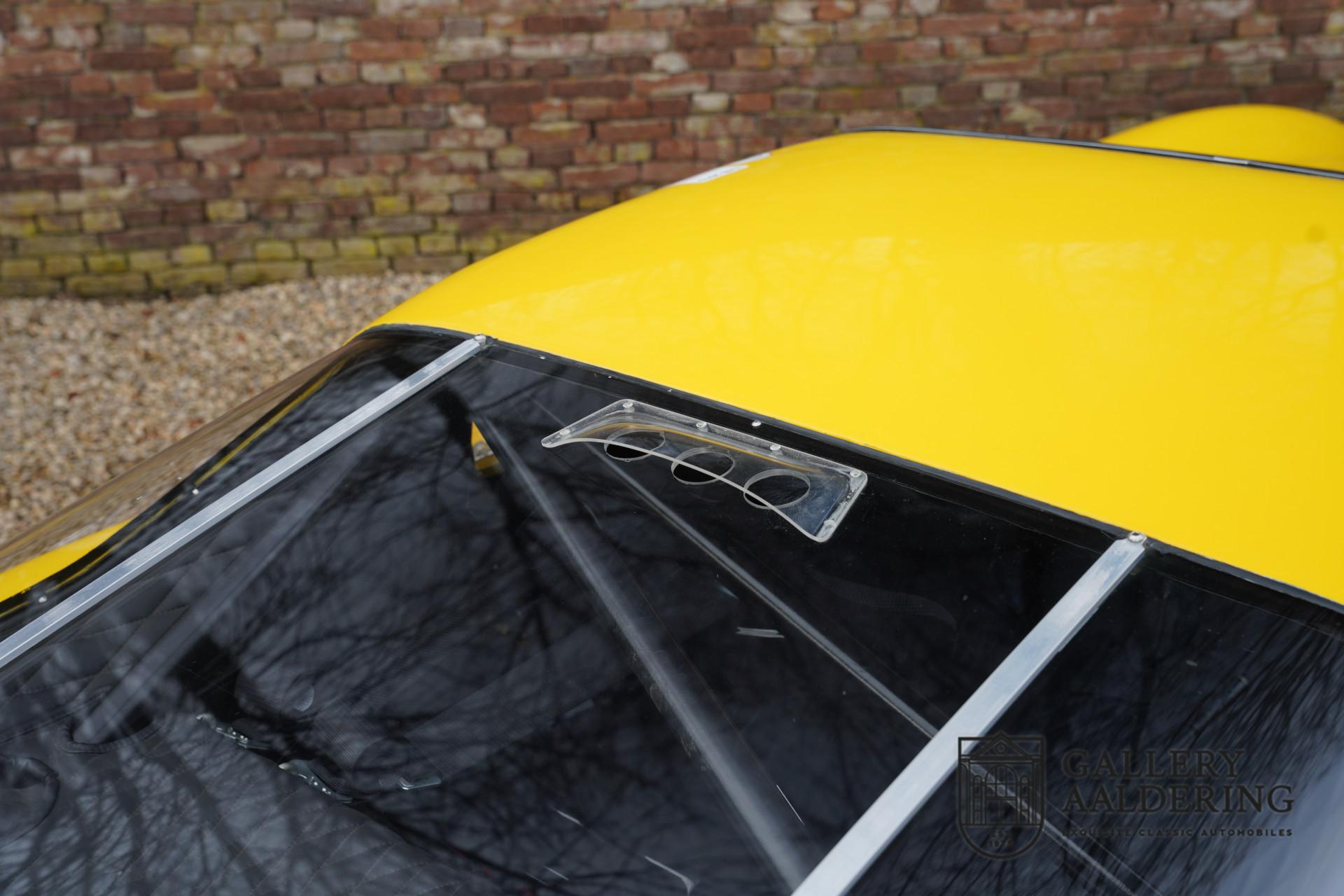 The exquisite yellow Bizzarrini offered here, was constructed in 1965 as a Strada version. After passing through several owners in Italy, in 1997, the car was acquired by a well-known gentleman racer in the Netherlands. He promptly initiated a comprehensive restoration and race preparation project, entrusting the work to a distinguished UK company specializing in racing car restoration and race preparation. This extensive undertaking spanned nearly two years, and detailed invoices for the work can be found in the extensive history file that accompanies the car.