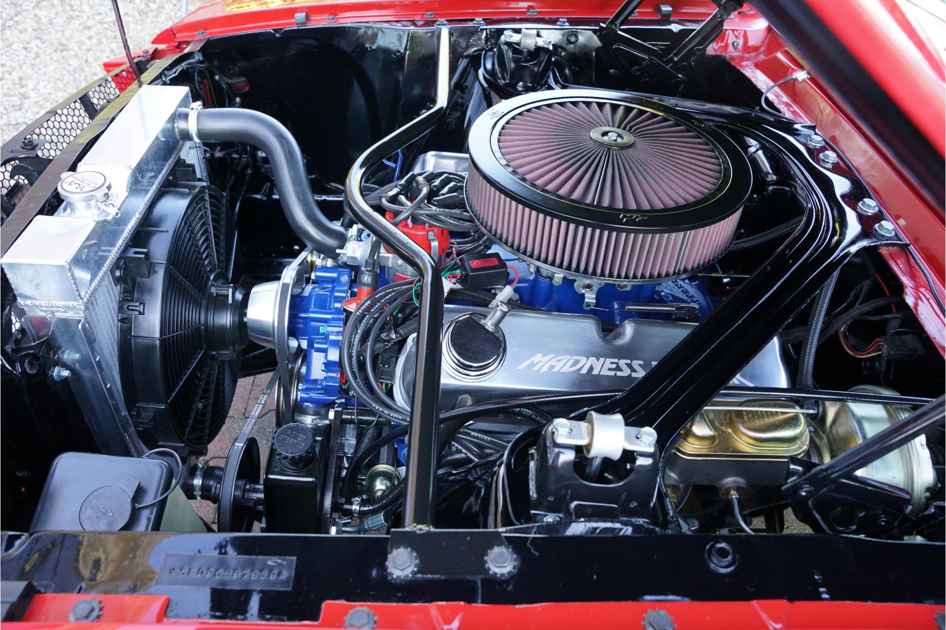 Under the hood sits more than just your average V8. This one's a custom-built 302 V8 by Madness Power by Karl Ness, delivering 249 horsepower. So this isn't just American style, it's got serious substance too. Paired with a manual transmission, power steering, and power brakes, it has everything you want for that classic muscle car experience, but without feeling clumsy or overdone.