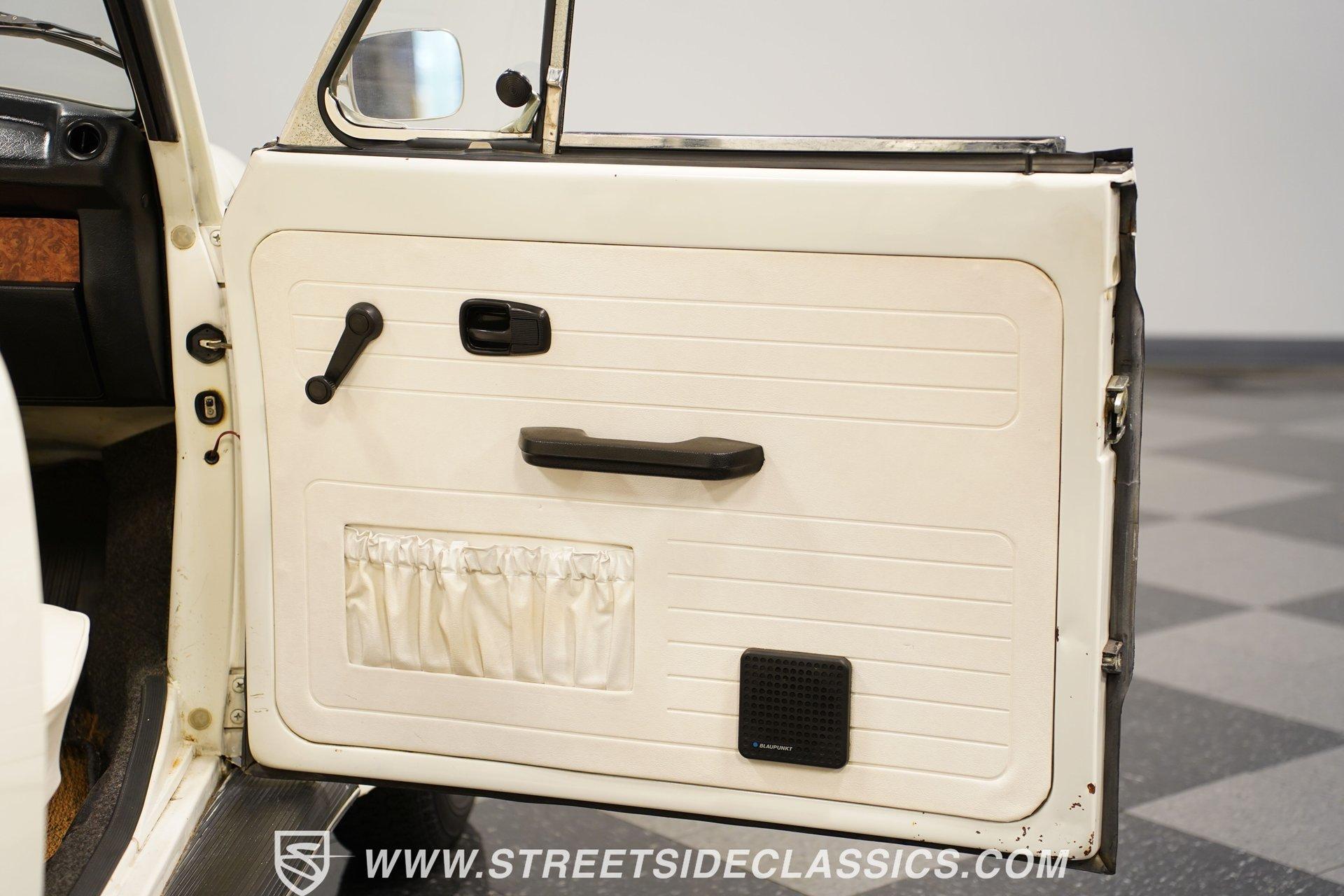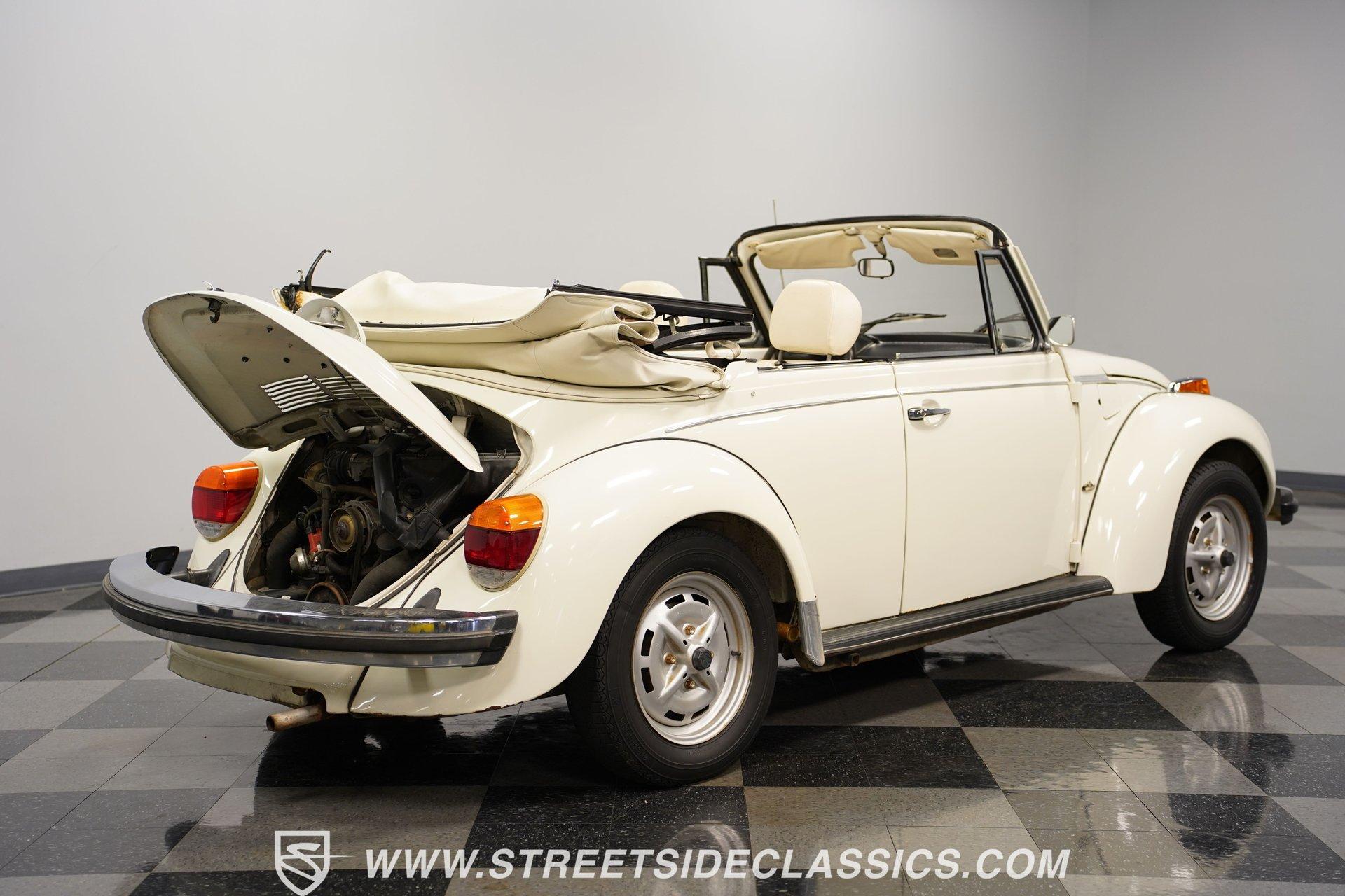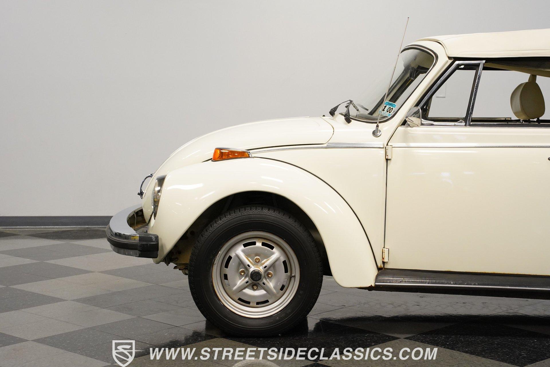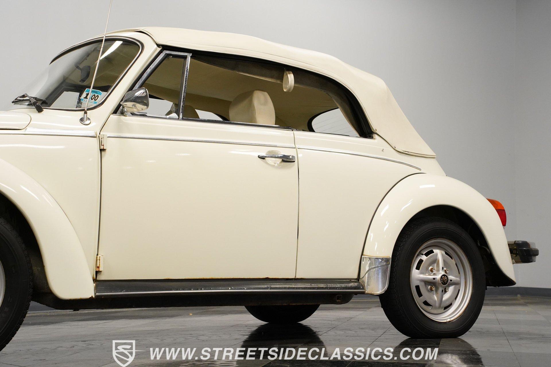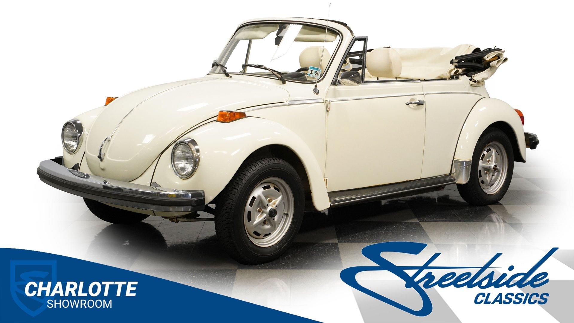Final year of German production marks this 1979 Volkswagen Beetle Convertible as part of the exclusive "Triple White" special edition. Alpine White paint covers the iconic curves and rounded fenders of this enduring classic, complemented by a crisp white canvas convertible top with glass rear window. The distinctive profile sits atop 15" wheels wrapped in 165SR15 tires, creating the unmistakable stance that defined a generation. Chrome bumpers and trim pieces add just the right amount of flash against the clean white backdrop, completing the timeless exterior appearance of this air-cooled legend. White vinyl bucket seats define the clean, straightforward interior aesthetic. The minimalist dashboard houses simple instrumentation that gives all necessary information without excess complication. An AM/FM cassette player provides soundtrack options while cruising with the top down. Floor-mounted shifter puts all four gears within easy reach. The door panels feature convenient pockets, and the front seatbelts add a measure of safety to this vintage machine. Every aspect of the cabin maintains the unfussy, functional design philosophy that made these cars global icons. The 1600 CC flat-four engine mounted in the rear employs electronic fuel injection for improved reliability and performance over earlier carbureted models. A 4-speed manual transmission delivers power to the VW transaxle that drives the rear wheels. The MacPherson strut front suspension works with the independent rear suspension to provide controlled handling characteristics. Drum brakes handle stopping duties, while manual steering delivers direct road feedback. The rear-engine layout provides excellent traction and the unique mechanical symphony that only an air-cooled Volkswagen can produce. HIGHLIGHTS: 1600 CC 4-Cylinder Engine Electronic Fuel Injection 4-Speed Manual Transmission VW Transaxle MacPherson Strut Front Suspension Independent Rear Suspension Drum Brakes Manual Steering Alpine White Paint White Canvas Convertible Top Glass Rear Window Chrome Bumpers 15" Wheels 165SR15 Tires White Interior with Bucket Seats Floor Shift AM/FM Cassette Player Front Seatbelts Door Panel Pockets 5-Digit Odometer Triple White Special Edition Final Year German Beetle Convertible Production Open-air freedom in this 1979 Volkswagen Beetle Convertible. The triple white color scheme, air-cooled flat-four engine, and iconic styling make this final-year German Beetle convertible a true collector's opportunity. Call today!