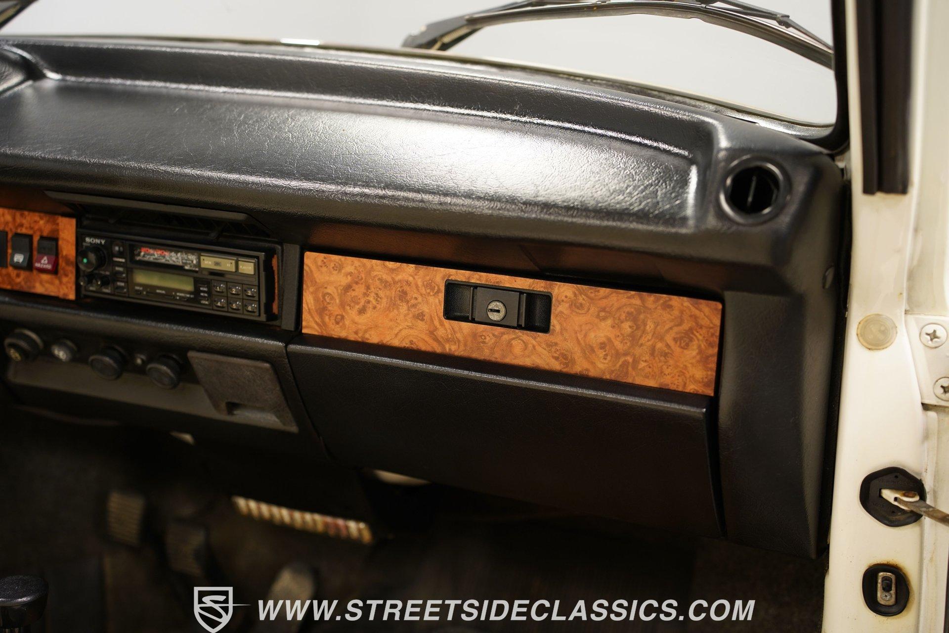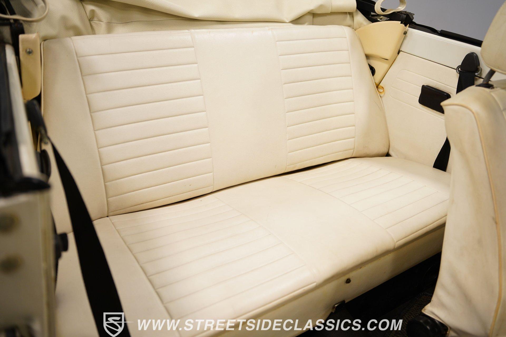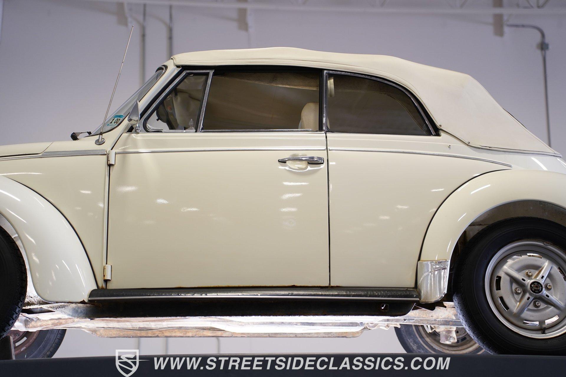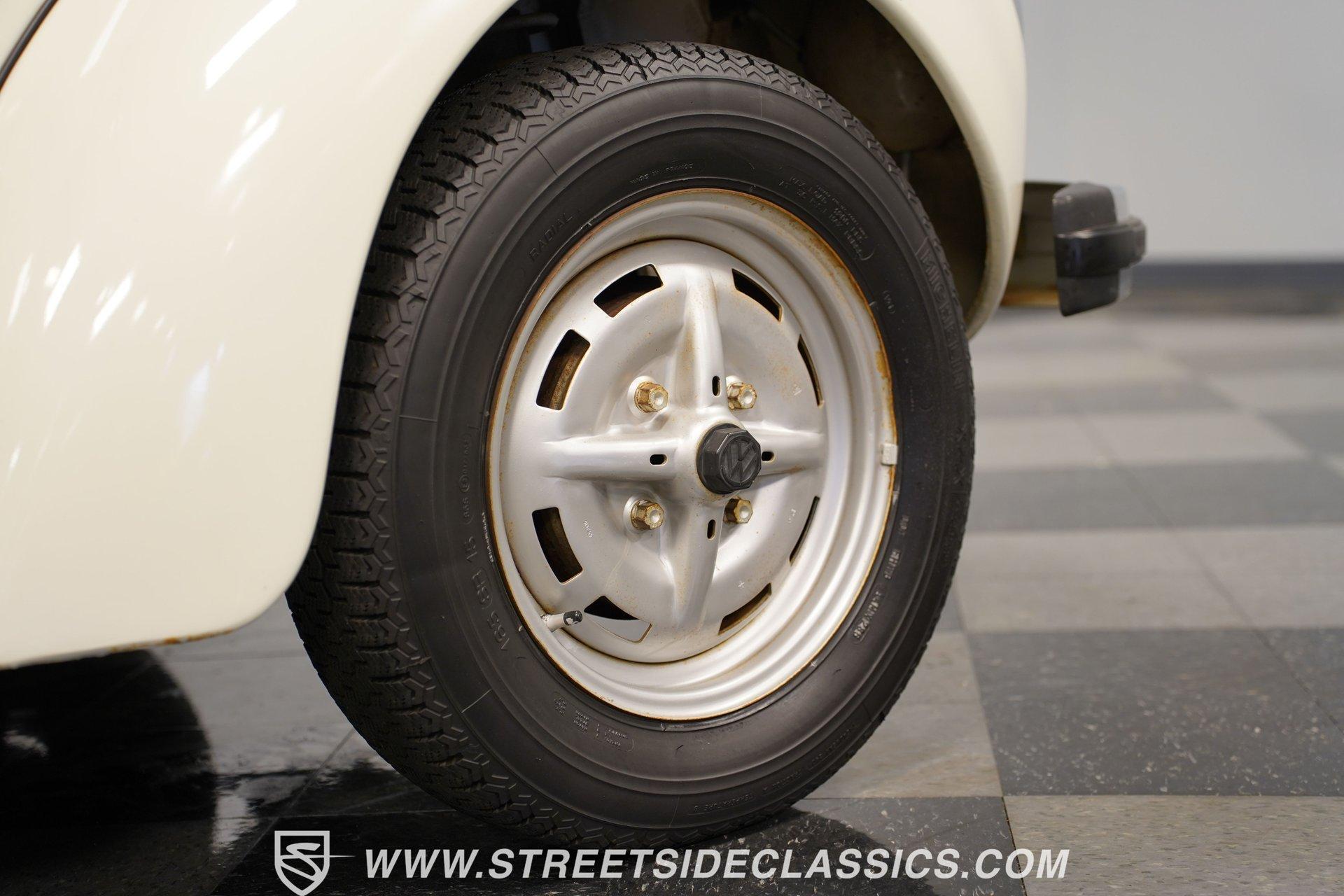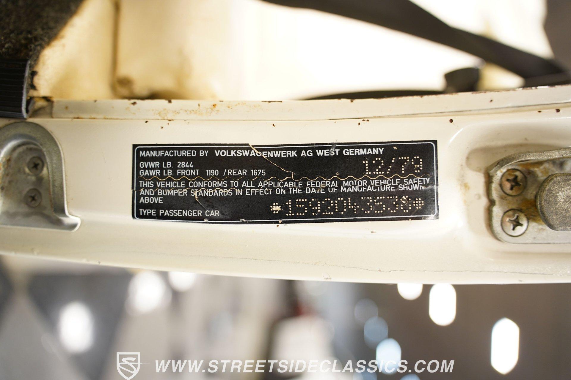 Final year of German production marks this 1979 Volkswagen Beetle Convertible as part of the exclusive "Triple White" special edition. Alpine White paint covers the iconic curves and rounded fenders of this enduring classic, complemented by a crisp white canvas convertible top with glass rear window. The distinctive profile sits atop 15" wheels wrapped in 165SR15 tires, creating the unmistakable stance that defined a generation. Chrome bumpers and trim pieces add just the right amount of flash against the clean white backdrop, completing the timeless exterior appearance of this air-cooled legend. White vinyl bucket seats define the clean, straightforward interior aesthetic. The minimalist dashboard houses simple instrumentation that gives all necessary information without excess complication. An AM/FM cassette player provides soundtrack options while cruising with the top down. Floor-mounted shifter puts all four gears within easy reach. The door panels feature convenient pockets, and the front seatbelts add a measure of safety to this vintage machine. Every aspect of the cabin maintains the unfussy, functional design philosophy that made these cars global icons. The 1600 CC flat-four engine mounted in the rear employs electronic fuel injection for improved reliability and performance over earlier carbureted models. A 4-speed manual transmission delivers power to the VW transaxle that drives the rear wheels. The MacPherson strut front suspension works with the independent rear suspension to provide controlled handling characteristics. Drum brakes handle stopping duties, while manual steering delivers direct road feedback. The rear-engine layout provides excellent traction and the unique mechanical symphony that only an air-cooled Volkswagen can produce. HIGHLIGHTS: 1600 CC 4-Cylinder Engine Electronic Fuel Injection 4-Speed Manual Transmission VW Transaxle MacPherson Strut Front Suspension Independent Rear Suspension Drum Brakes Manual Steering Alpine White Paint White Canvas Convertible Top Glass Rear Window Chrome Bumpers 15" Wheels 165SR15 Tires White Interior with Bucket Seats Floor Shift AM/FM Cassette Player Front Seatbelts Door Panel Pockets 5-Digit Odometer Triple White Special Edition Final Year German Beetle Convertible Production Open-air freedom in this 1979 Volkswagen Beetle Convertible. The triple white color scheme, air-cooled flat-four engine, and iconic styling make this final-year German Beetle convertible a true collector's opportunity. Call today!