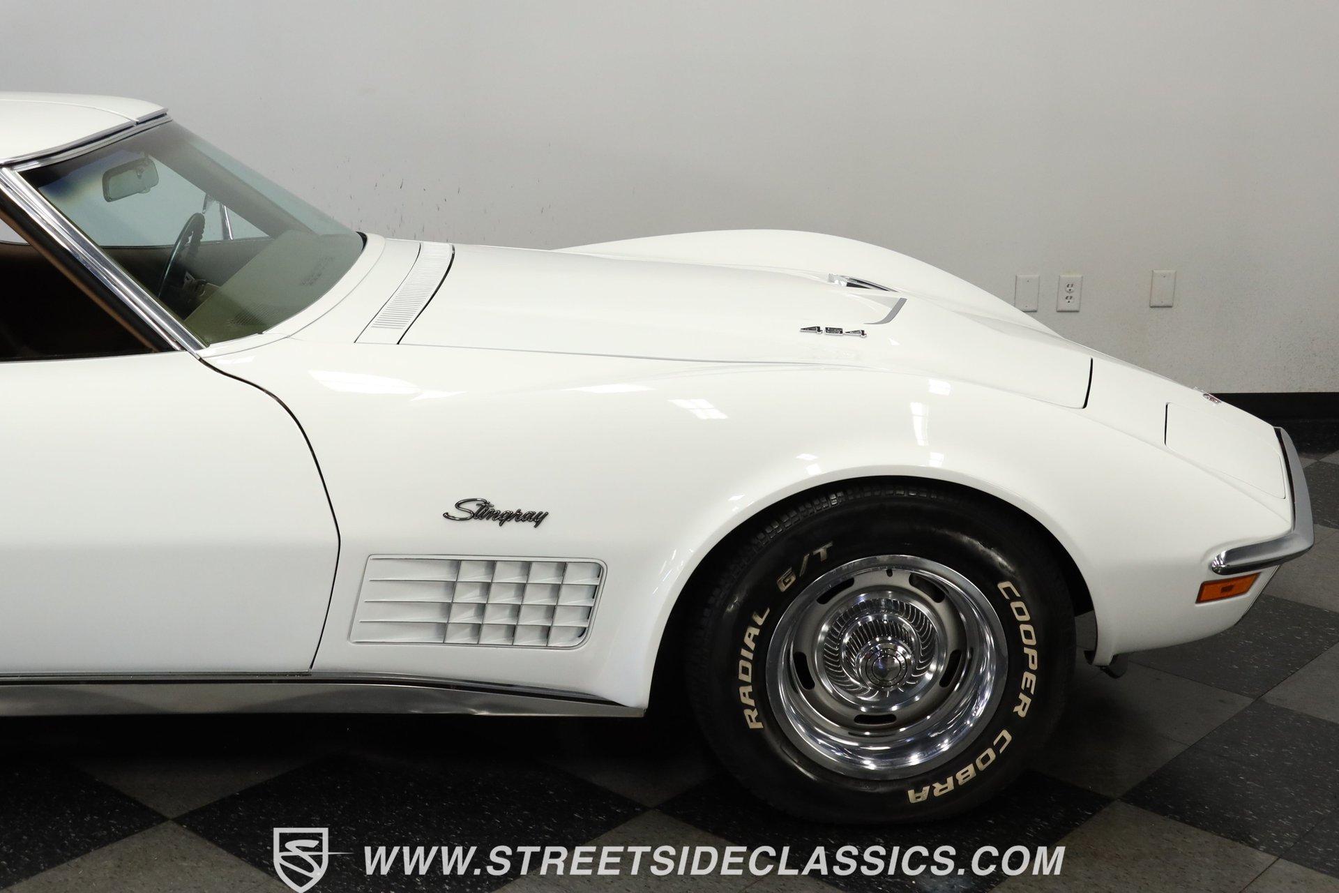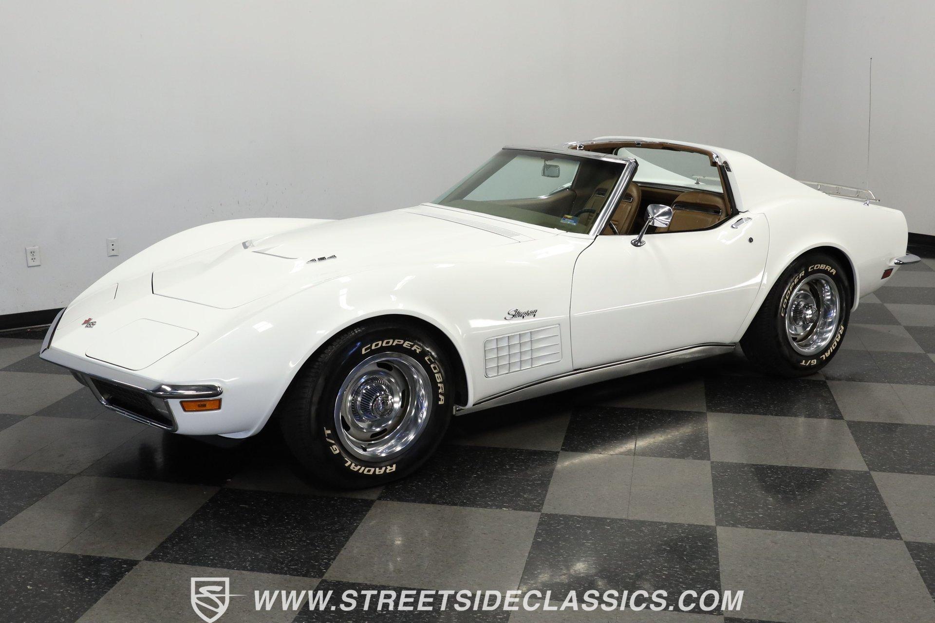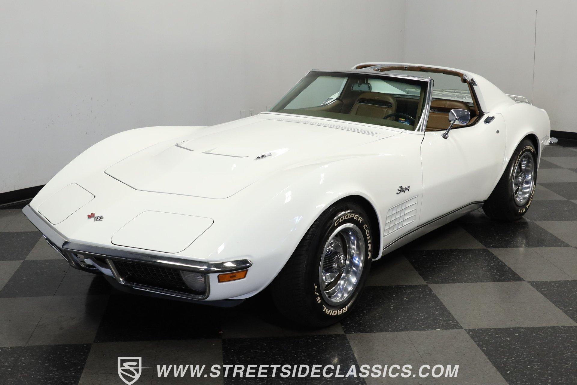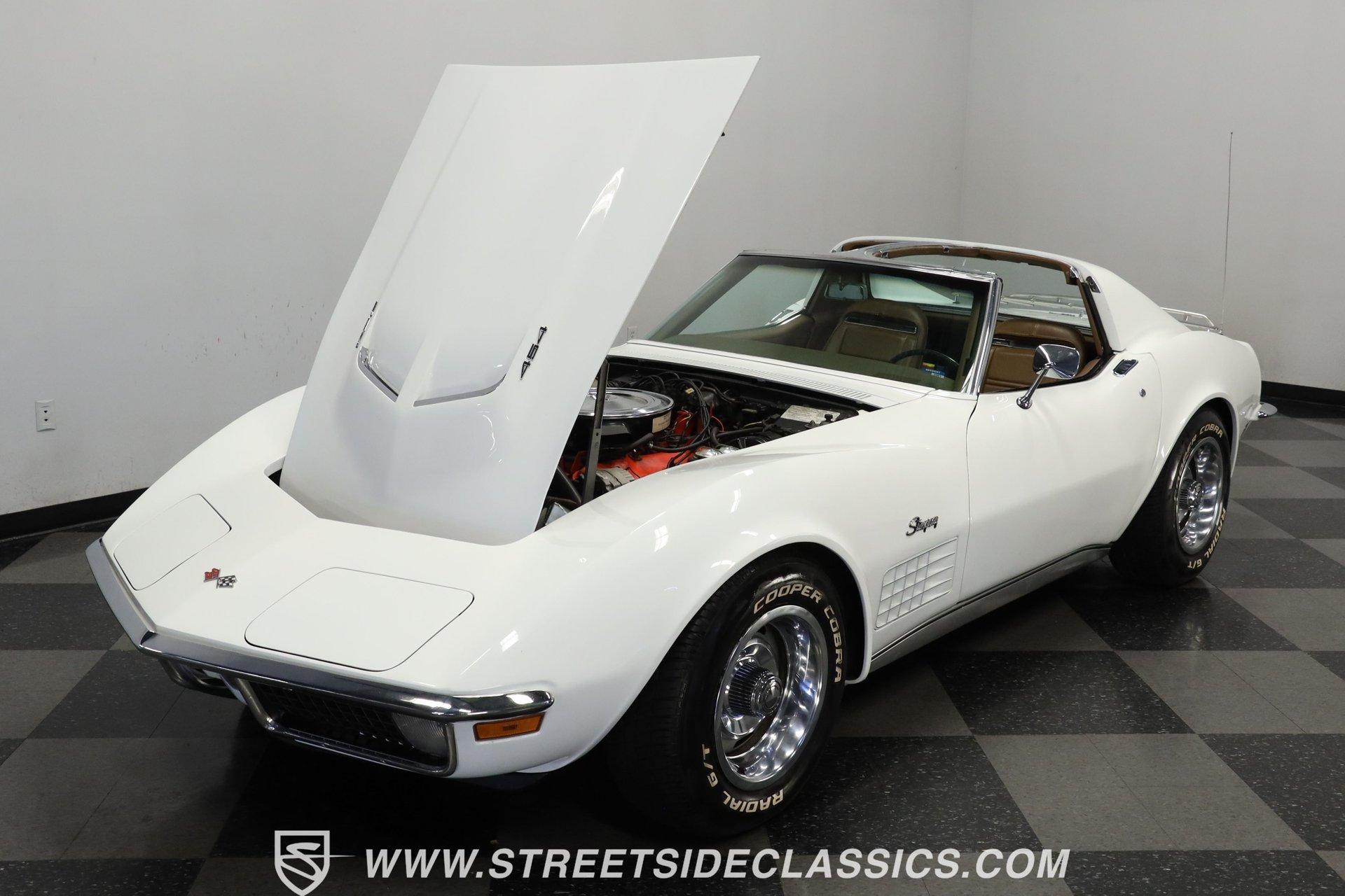 Numbers-matching components verify authenticity on this 1971 Chevrolet Corvette LS5 454 finished in Classic White paint across its fiberglass body. Chrome bumpers front and rear maintain their original luster while the removable T-tops add versatility to the coupe configuration. Rolling on 15-inch chrome wheels wrapped in 225/70R15 tires, the stance remains true to its factory specifications. All exterior trim and badging present well, with glass and lighting elements remaining clear and functional throughout. Saddle vinyl bucket seats create a warm contrast against the white exterior, with the interior maintaining its original color scheme. The center console houses the shifter while the dashboard remains crack-free and properly aligned. Door panels and other interior surfaces show well, complemented by brown carpeting that covers the floor areas. Power windows operate smoothly, and the tilt steering wheel adjusts to driver preference. An AM/FM radio handles entertainment duties while maintaining the period-correct appearance. Numbers-matching 454 LS5 V8 engine connects to the original 3-speed TH400 automatic transmission, both verified by matching VIN stamps. The Quadrajet 4-barrel carburetor feeds the big block through factory-style intake manifolds, while dual exhaust exits through aftermarket mufflers. Four-wheel power disc brakes handle stopping duties with power steering reducing effort at the wheel. An upgraded aluminum radiator helps manage engine temperatures, and all belts, hoses, and soft components appear in good condition. HIGHLIGHTS: Numbers-matching 454 LS5 V8 engine Numbers-matching 3-speed TH400 automatic transmission Quadrajet 4-barrel carburetor Factory-style intake manifolds Dual exhaust with aftermarket mufflers 4-wheel power disc brakes Upgraded aluminum radiator Factory Correct Classic White paint Chrome front and rear bumpers 15-inch chrome wheels with 225/70R15 tires Removable T-tops Original exterior trim and badging Factory correct Saddle Interior with Bucket Seats Center console with shifter Power windows Tilt steering wheel AM/FM radio Power steering Owner's manual Protect-o-plate Maintenance records and receipts Numbers-matching 454 LS5 big block power, original 3-speed automatic, and classic white-over-saddle color combination make this 1971 Chevrolet Corvette LS5 454 a solid example of early C3 performance. Ready for your garage with proper documentation and mechanical integrity intact. Call today! We can assist you with getting an Extended Vehicle Service Plan from Freedom Warranty, which provides comprehensive coverage that can save thousands of dollars on unexpected repairs. Inquire for more details and pricing!