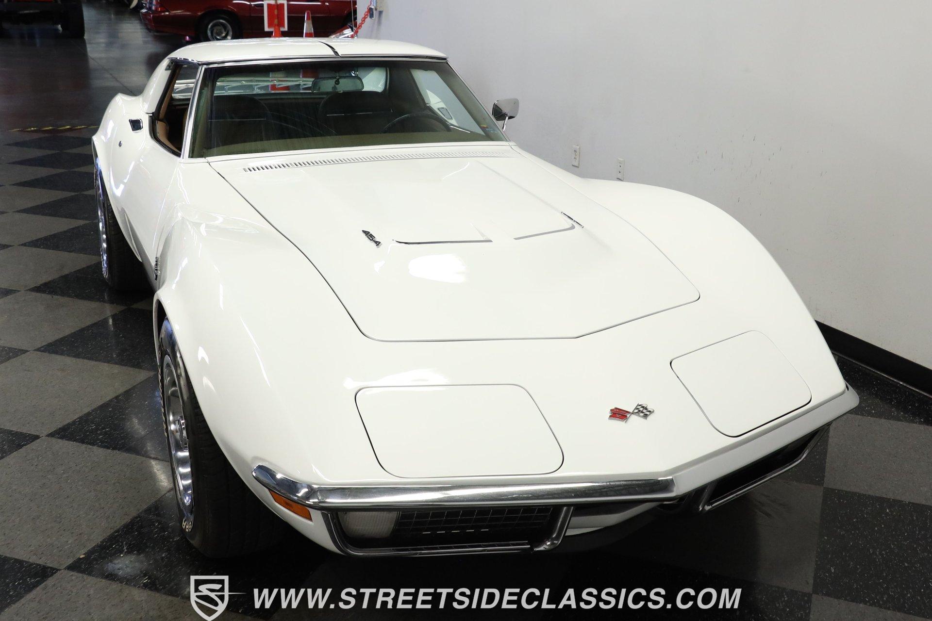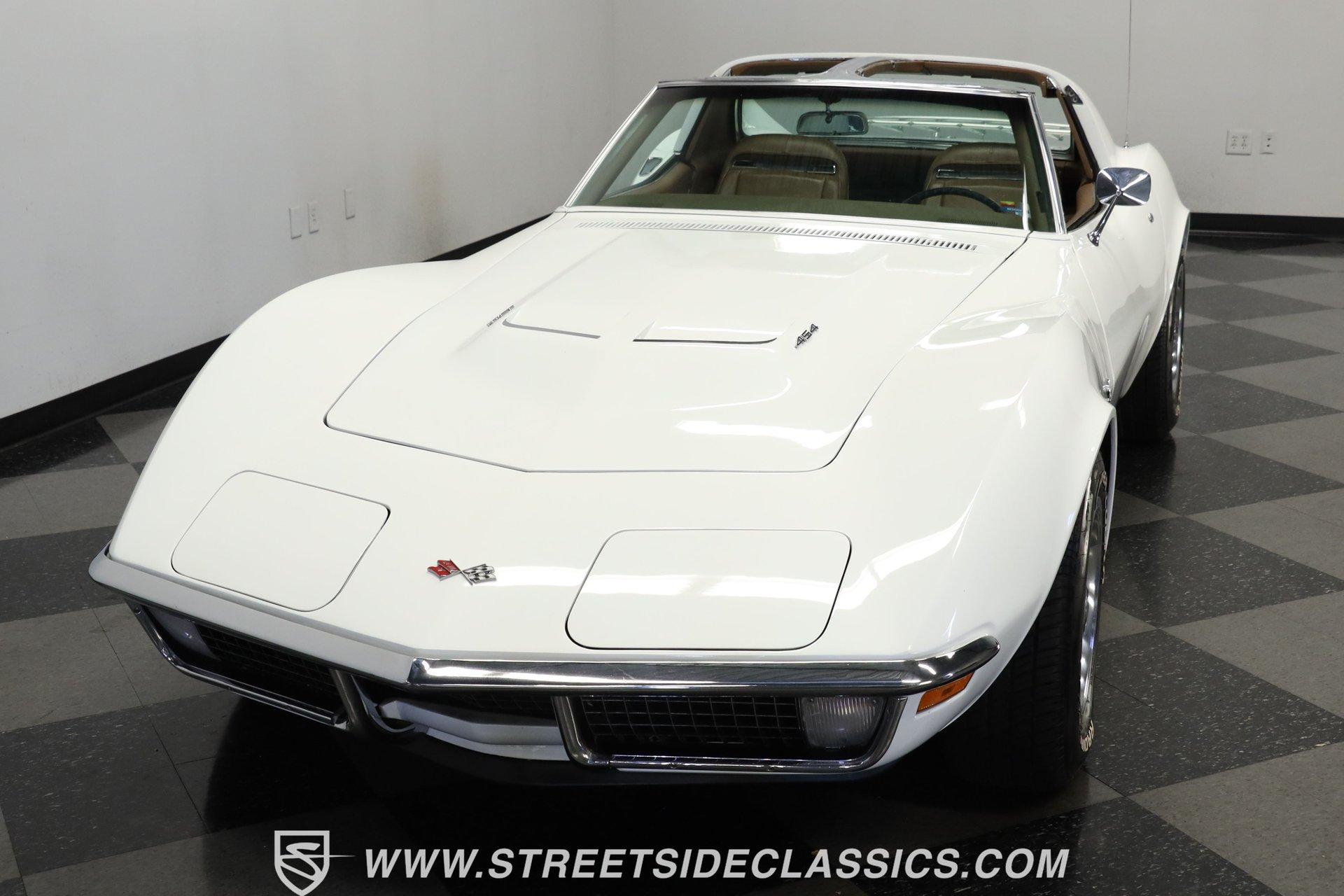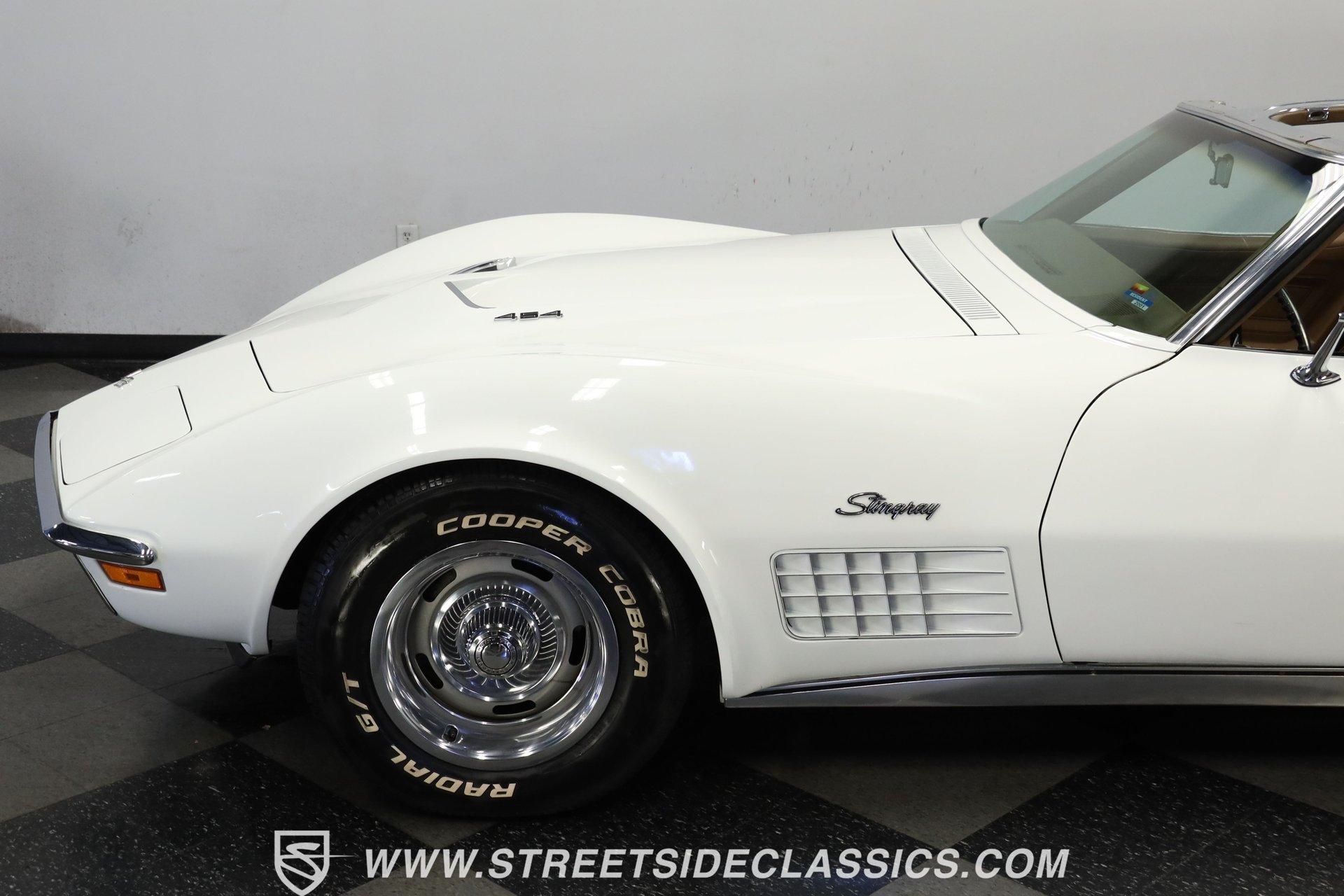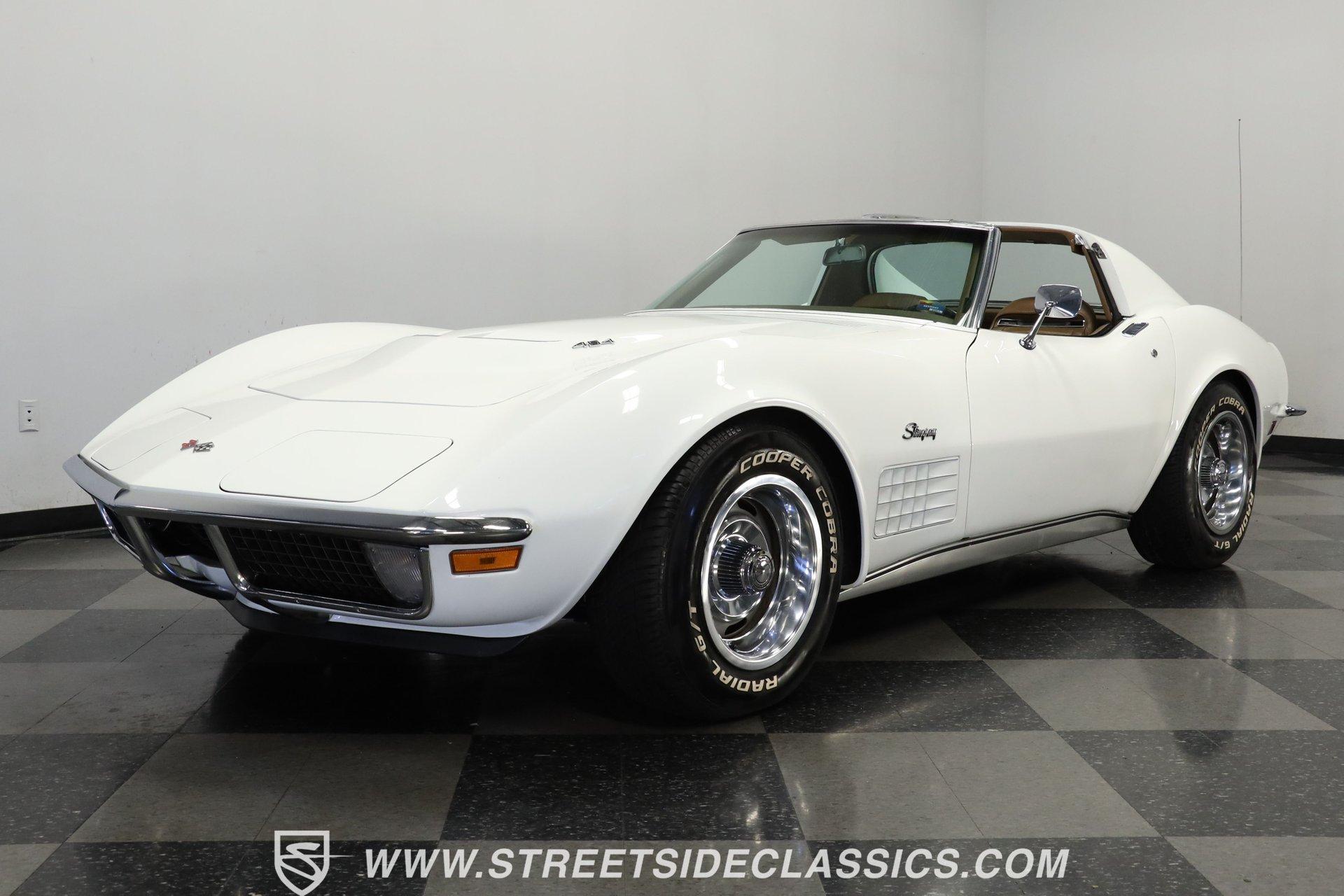 Numbers-matching components verify authenticity on this 1971 Chevrolet Corvette LS5 454 finished in Classic White paint across its fiberglass body. Chrome bumpers front and rear maintain their original luster while the removable T-tops add versatility to the coupe configuration. Rolling on 15-inch chrome wheels wrapped in 225/70R15 tires, the stance remains true to its factory specifications. All exterior trim and badging present well, with glass and lighting elements remaining clear and functional throughout. Saddle vinyl bucket seats create a warm contrast against the white exterior, with the interior maintaining its original color scheme. The center console houses the shifter while the dashboard remains crack-free and properly aligned. Door panels and other interior surfaces show well, complemented by brown carpeting that covers the floor areas. Power windows operate smoothly, and the tilt steering wheel adjusts to driver preference. An AM/FM radio handles entertainment duties while maintaining the period-correct appearance. Numbers-matching 454 LS5 V8 engine connects to the original 3-speed TH400 automatic transmission, both verified by matching VIN stamps. The Quadrajet 4-barrel carburetor feeds the big block through factory-style intake manifolds, while dual exhaust exits through aftermarket mufflers. Four-wheel power disc brakes handle stopping duties with power steering reducing effort at the wheel. An upgraded aluminum radiator helps manage engine temperatures, and all belts, hoses, and soft components appear in good condition. HIGHLIGHTS: Numbers-matching 454 LS5 V8 engine Numbers-matching 3-speed TH400 automatic transmission Quadrajet 4-barrel carburetor Factory-style intake manifolds Dual exhaust with aftermarket mufflers 4-wheel power disc brakes Upgraded aluminum radiator Factory Correct Classic White paint Chrome front and rear bumpers 15-inch chrome wheels with 225/70R15 tires Removable T-tops Original exterior trim and badging Factory correct Saddle Interior with Bucket Seats Center console with shifter Power windows Tilt steering wheel AM/FM radio Power steering Owner's manual Protect-o-plate Maintenance records and receipts Numbers-matching 454 LS5 big block power, original 3-speed automatic, and classic white-over-saddle color combination make this 1971 Chevrolet Corvette LS5 454 a solid example of early C3 performance. Ready for your garage with proper documentation and mechanical integrity intact. Call today! We can assist you with getting an Extended Vehicle Service Plan from Freedom Warranty, which provides comprehensive coverage that can save thousands of dollars on unexpected repairs. Inquire for more details and pricing!