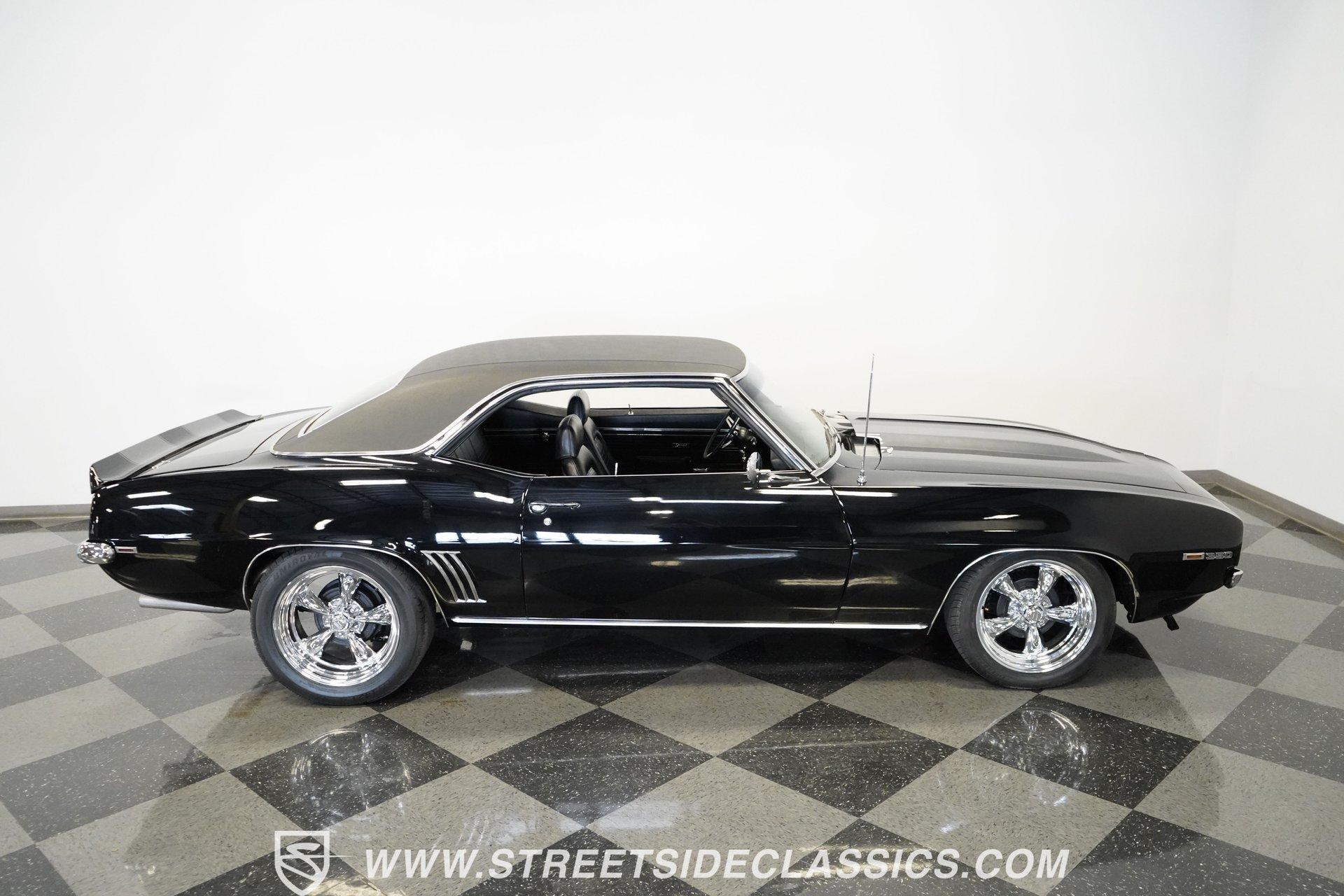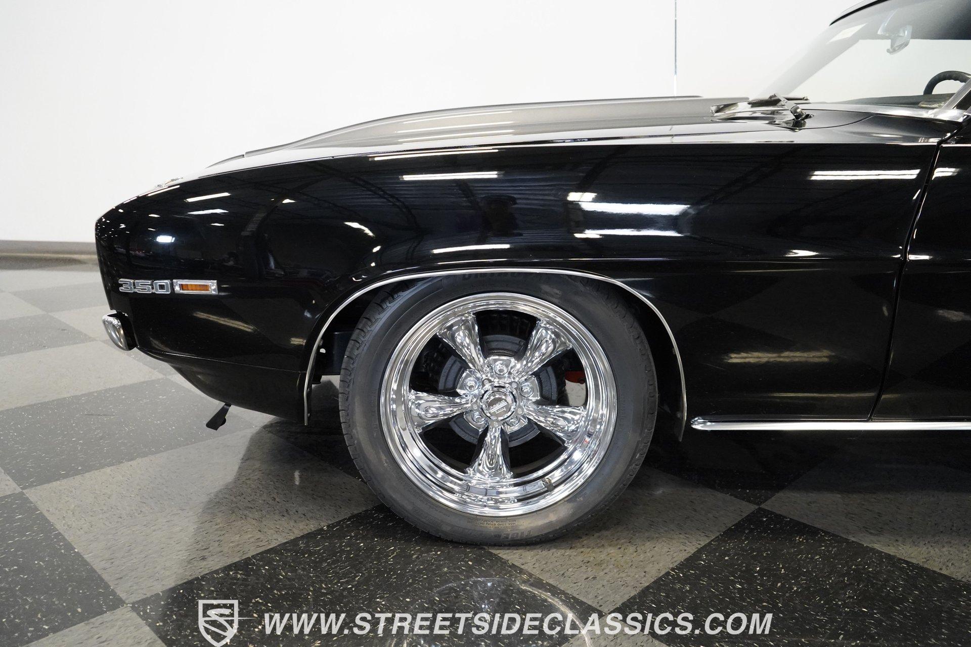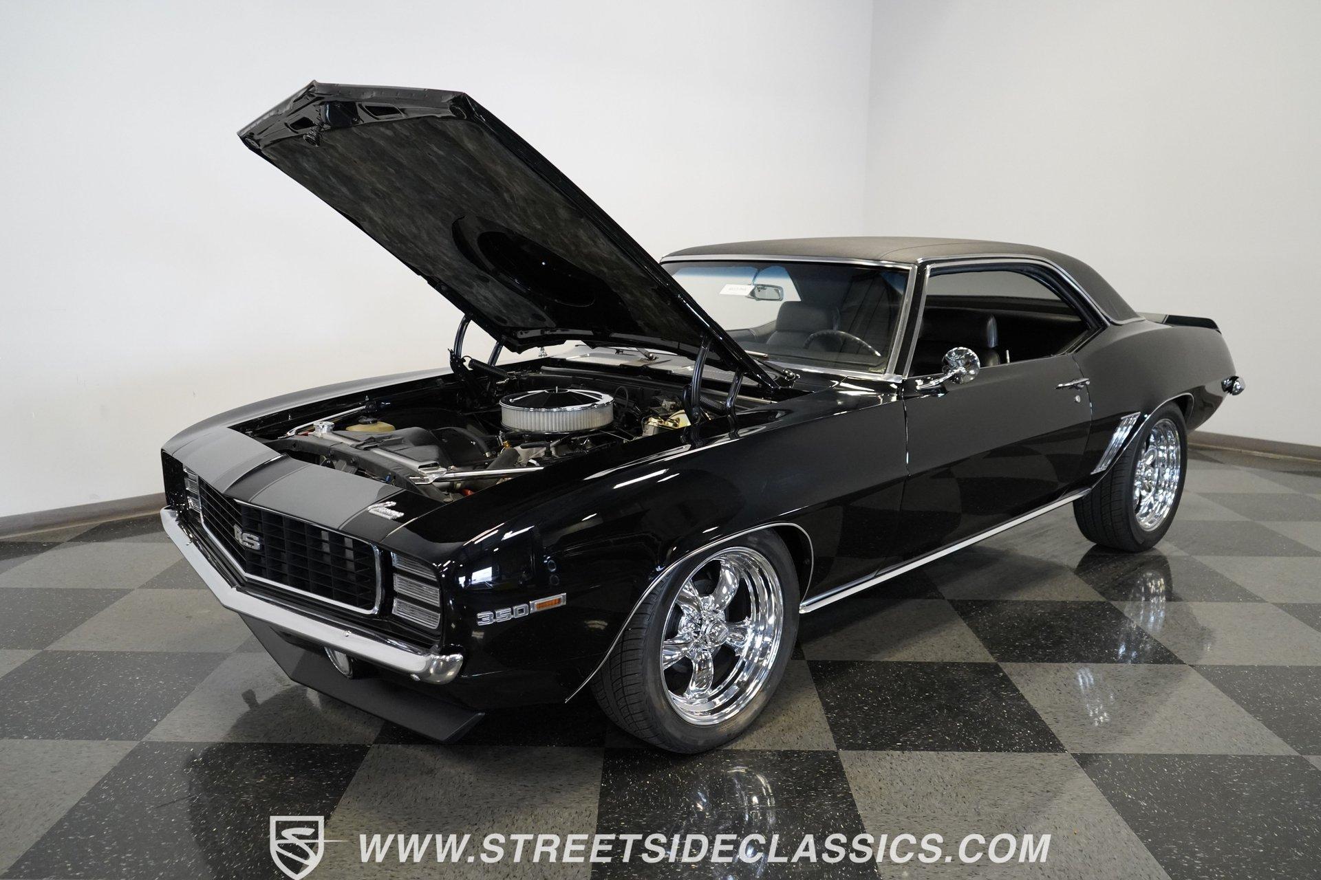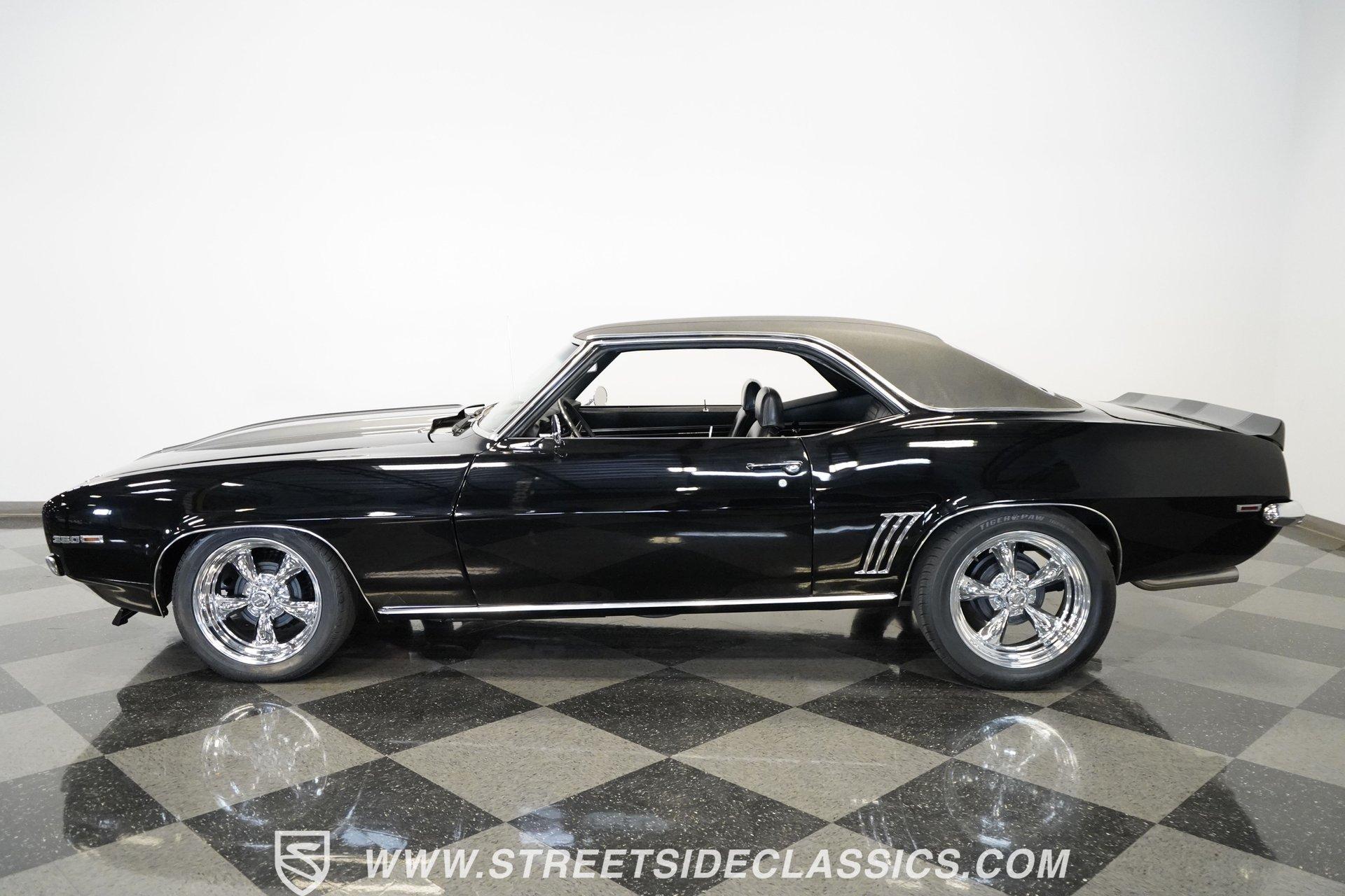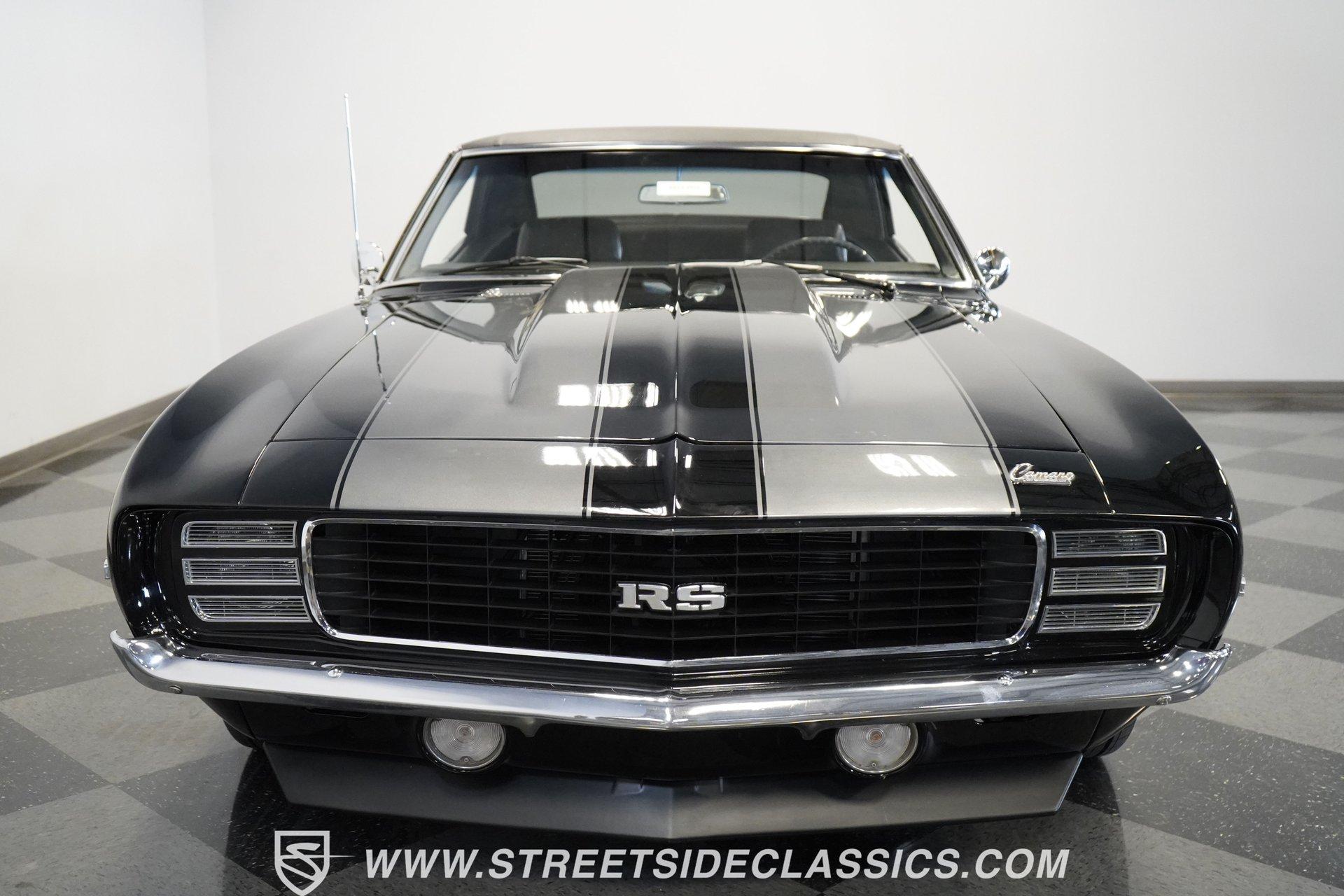 Powerful and menacing, the 1969 Chevrolet Camaro RS wears a sleek black exterior accented by dual gray stripes that run from front to back. Showing an incredibly low 71,392 actual miles, this triple-black machine features unique RS styling with distinctive headlight louvers in the grille, an RS decklid badge, strategically placed fog lights, and an athletic chin spoiler. A mild cowl hood adds visual punch while the small rear spoiler completes the look. Chrome American Racing wheels in staggered 17/18-inch sizes fill the wheel wells perfectly against the black paint. Opening the door reveals an exceptionally preserved black interior with high-back vinyl bucket seats that display classic ladder stitching, complemented by matching black door panels throughout the cabin. Additional instrumentation includes strategically mounted oil pressure and water temperature gauges positioned below the radio for quick viewing. The original floor shifter rises from the center console, while the modern Holley Sniper EFI control unit integrates cleanly into the ashtray location for easy adjustments without disrupting the factory appearance. When fired up, the 350 cubic inch V8 shows why these low-mileage classics remain so desirable. The orange-painted small block has been enhanced with an Edelbrock performer intake manifold and Holley Sniper electronic fuel injection for excellent drivability. Cooling comes via an aluminum radiator equipped with both mechanical and electric fans for reliability in all conditions. The exhaust flows through shorty headers into a dual MagnaFlow system, while the TH350 three-speed automatic transmission, power steering, and power brakes create an effortless driving experience. HIGHLIGHTS: 350 V8 engine TH350 3-speed automatic transmission Holley Sniper electronic fuel injection Edelbrock performer intake manifold Shorty headers Dual MagnaFlow exhaust Aluminum radiator with mechanical and electric fans Power brakes Black exterior with gray dual stripes RS grille with headlight louvers RS decklid badge Fog lights Chin spoiler Mild cowl hood Small rear spoiler 17" Front/18" Rear Chrome American Racing wheels 235/45R17 Front, 245/50R18 Rear Uniroyal Tigerpaw Touring A/S tires Black vinyl roof Black interior with High-back bucket seats Center console Floor shifter Power steering Oil pressure/water temperature gauges 71,392 ACTUAL MILES Low-mileage muscle cars with documented actual miles are increasingly rare today. With only 71,392 original miles, this 1969 Chevrolet Camaro RS combines classic good looks, excellent drivability from upgraded fuel injection, and an unmistakable presence on the road. The black-on-black-on-black color scheme will never go out of style. Call today!