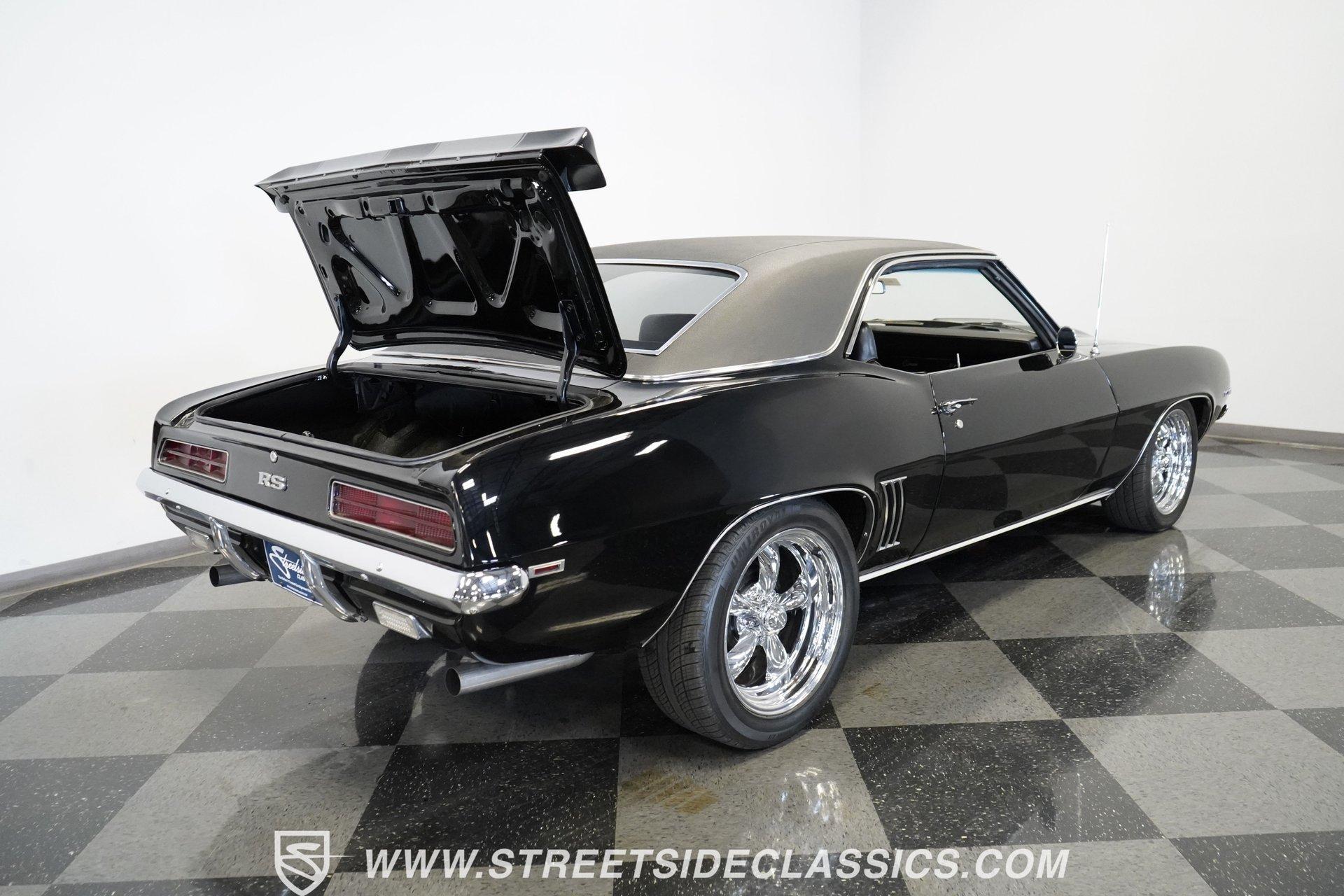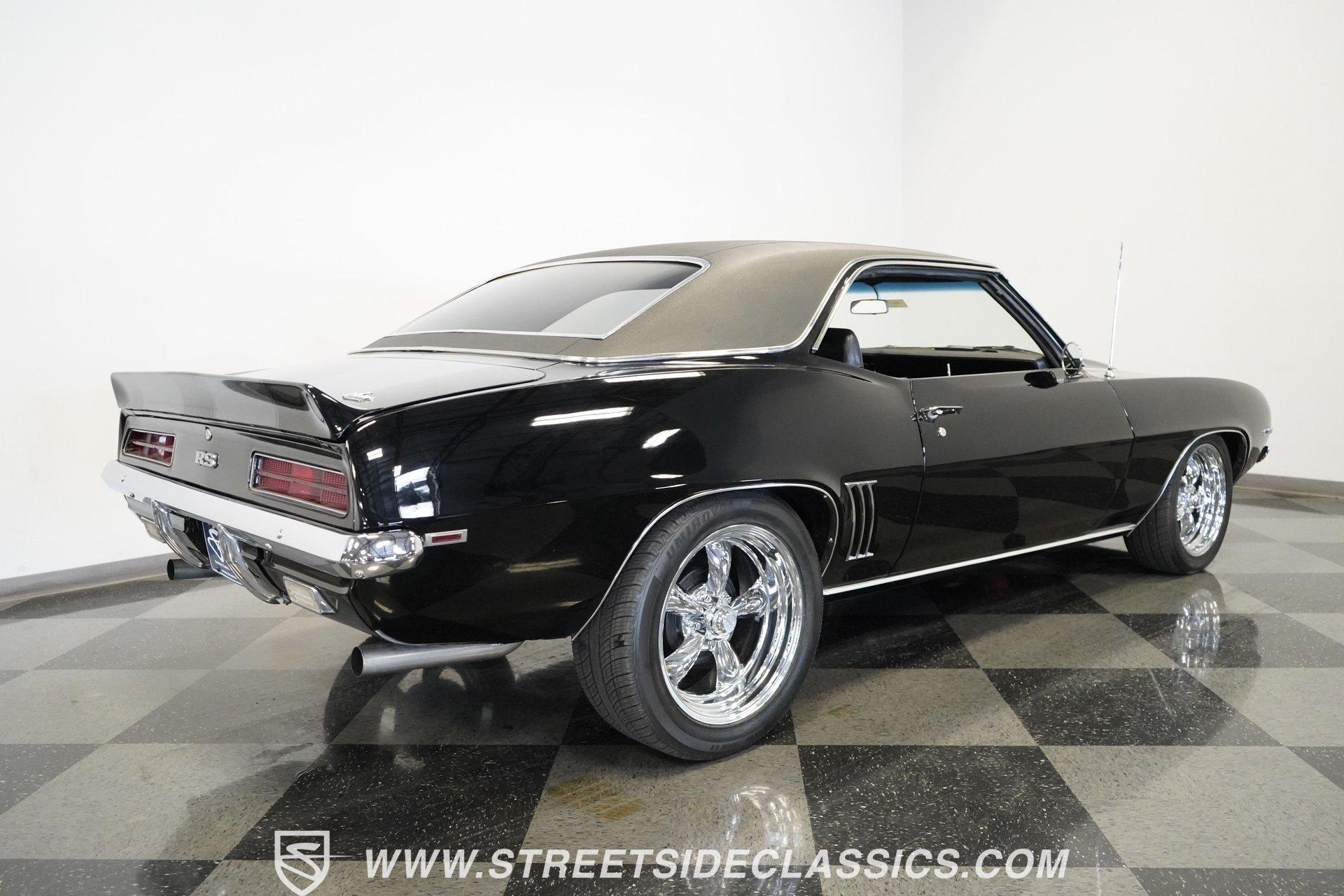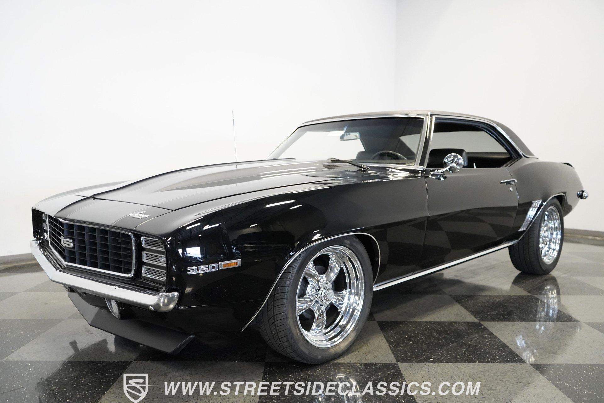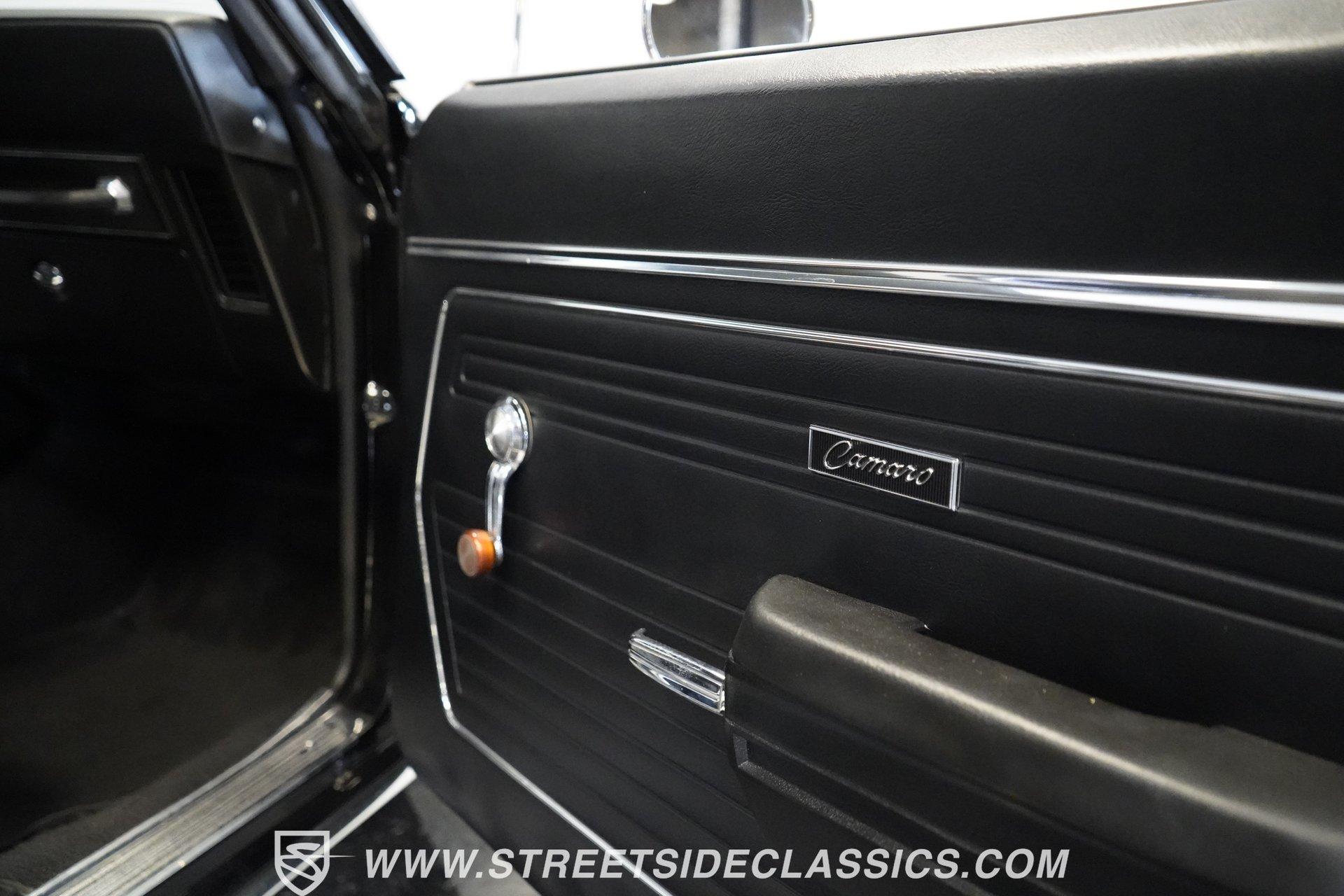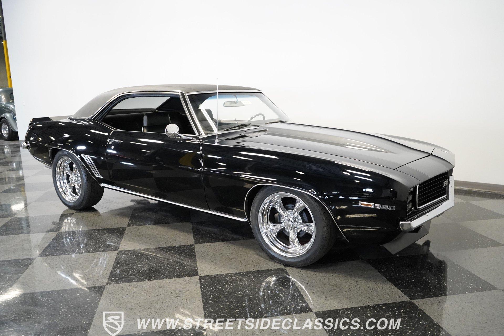 Powerful and menacing, the 1969 Chevrolet Camaro RS wears a sleek black exterior accented by dual gray stripes that run from front to back. Showing an incredibly low 71,392 actual miles, this triple-black machine features unique RS styling with distinctive headlight louvers in the grille, an RS decklid badge, strategically placed fog lights, and an athletic chin spoiler. A mild cowl hood adds visual punch while the small rear spoiler completes the look. Chrome American Racing wheels in staggered 17/18-inch sizes fill the wheel wells perfectly against the black paint. Opening the door reveals an exceptionally preserved black interior with high-back vinyl bucket seats that display classic ladder stitching, complemented by matching black door panels throughout the cabin. Additional instrumentation includes strategically mounted oil pressure and water temperature gauges positioned below the radio for quick viewing. The original floor shifter rises from the center console, while the modern Holley Sniper EFI control unit integrates cleanly into the ashtray location for easy adjustments without disrupting the factory appearance. When fired up, the 350 cubic inch V8 shows why these low-mileage classics remain so desirable. The orange-painted small block has been enhanced with an Edelbrock performer intake manifold and Holley Sniper electronic fuel injection for excellent drivability. Cooling comes via an aluminum radiator equipped with both mechanical and electric fans for reliability in all conditions. The exhaust flows through shorty headers into a dual MagnaFlow system, while the TH350 three-speed automatic transmission, power steering, and power brakes create an effortless driving experience. HIGHLIGHTS: 350 V8 engine TH350 3-speed automatic transmission Holley Sniper electronic fuel injection Edelbrock performer intake manifold Shorty headers Dual MagnaFlow exhaust Aluminum radiator with mechanical and electric fans Power brakes Black exterior with gray dual stripes RS grille with headlight louvers RS decklid badge Fog lights Chin spoiler Mild cowl hood Small rear spoiler 17" Front/18" Rear Chrome American Racing wheels 235/45R17 Front, 245/50R18 Rear Uniroyal Tigerpaw Touring A/S tires Black vinyl roof Black interior with High-back bucket seats Center console Floor shifter Power steering Oil pressure/water temperature gauges 71,392 ACTUAL MILES Low-mileage muscle cars with documented actual miles are increasingly rare today. With only 71,392 original miles, this 1969 Chevrolet Camaro RS combines classic good looks, excellent drivability from upgraded fuel injection, and an unmistakable presence on the road. The black-on-black-on-black color scheme will never go out of style. Call today!