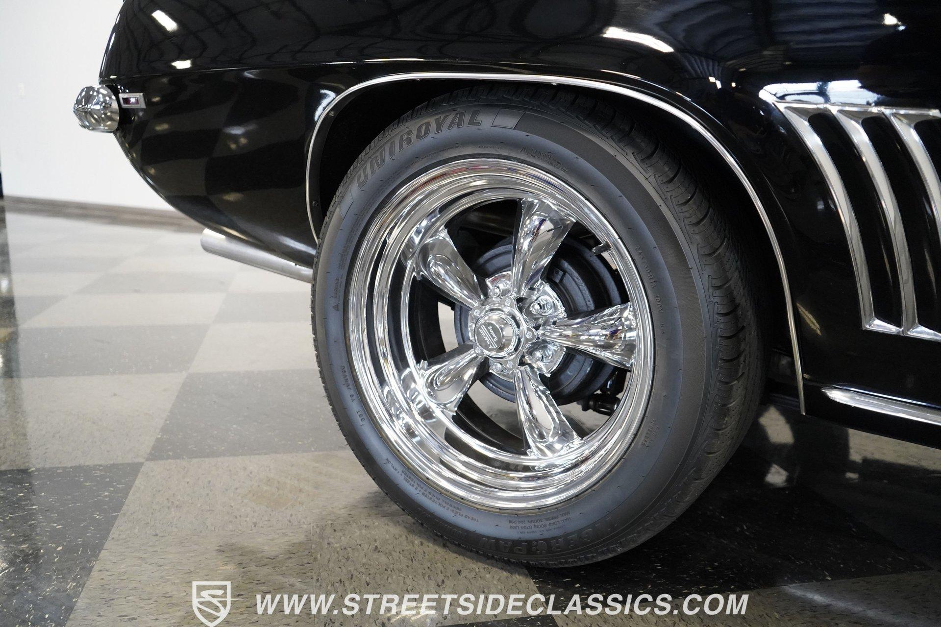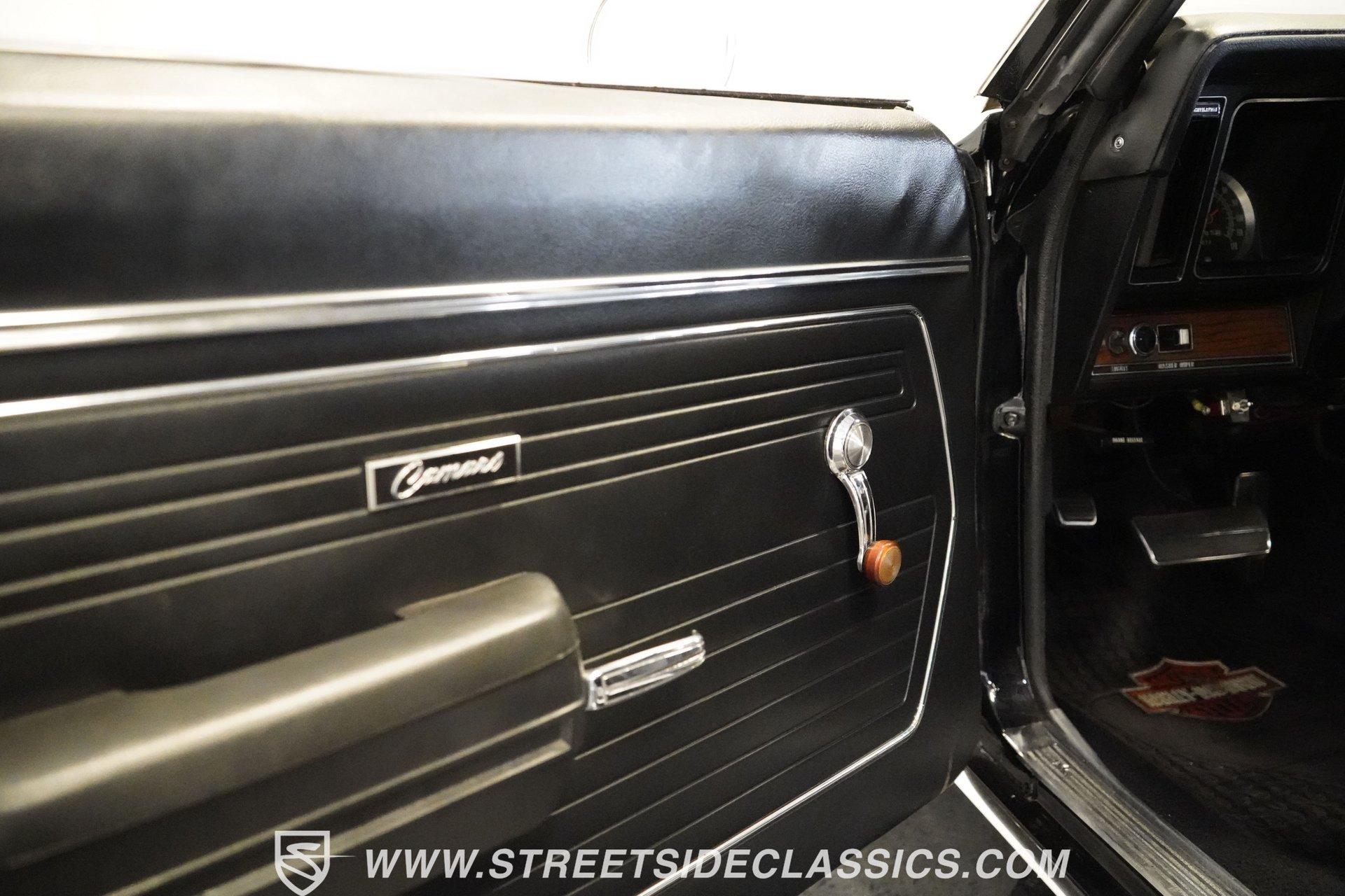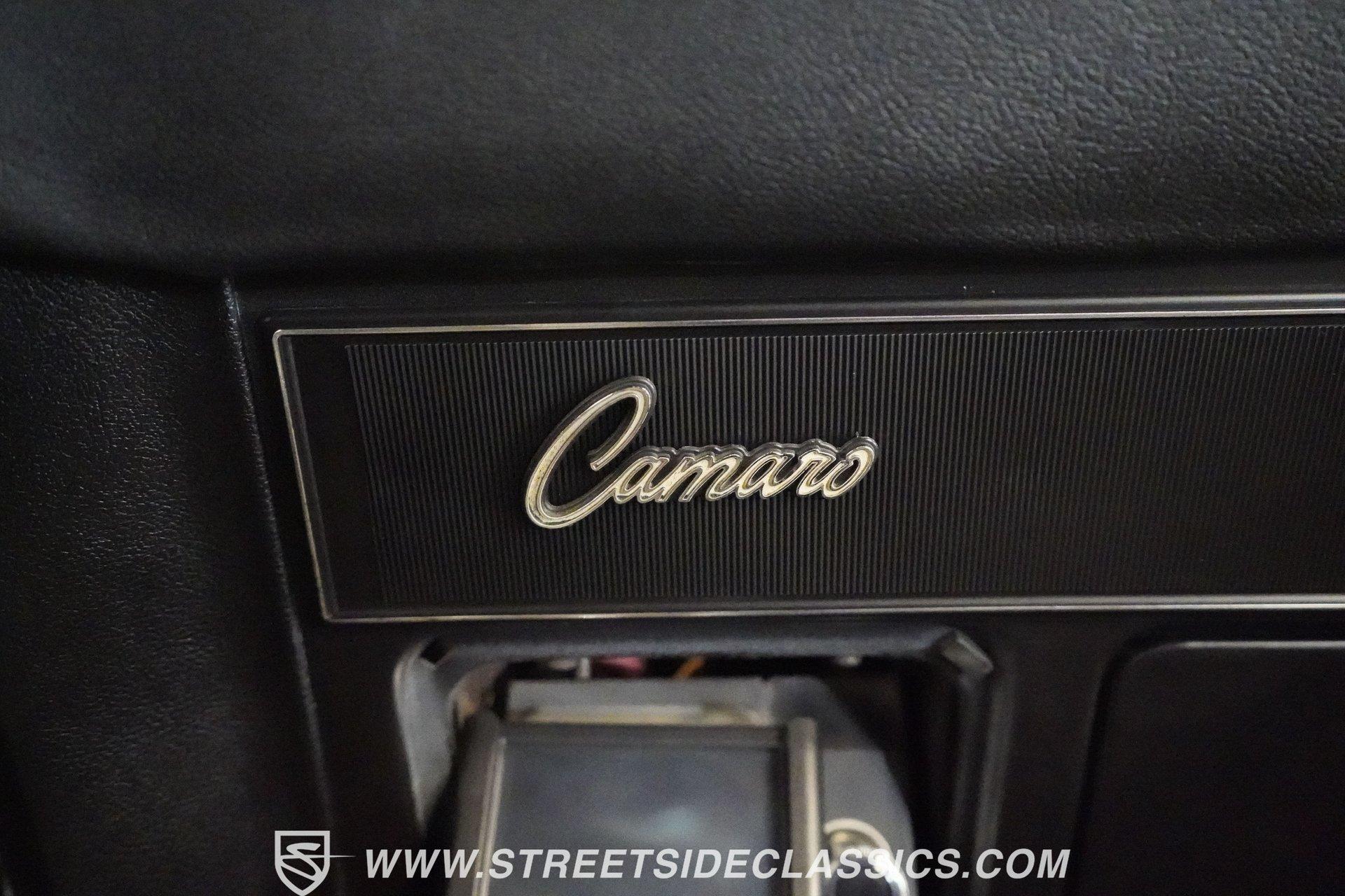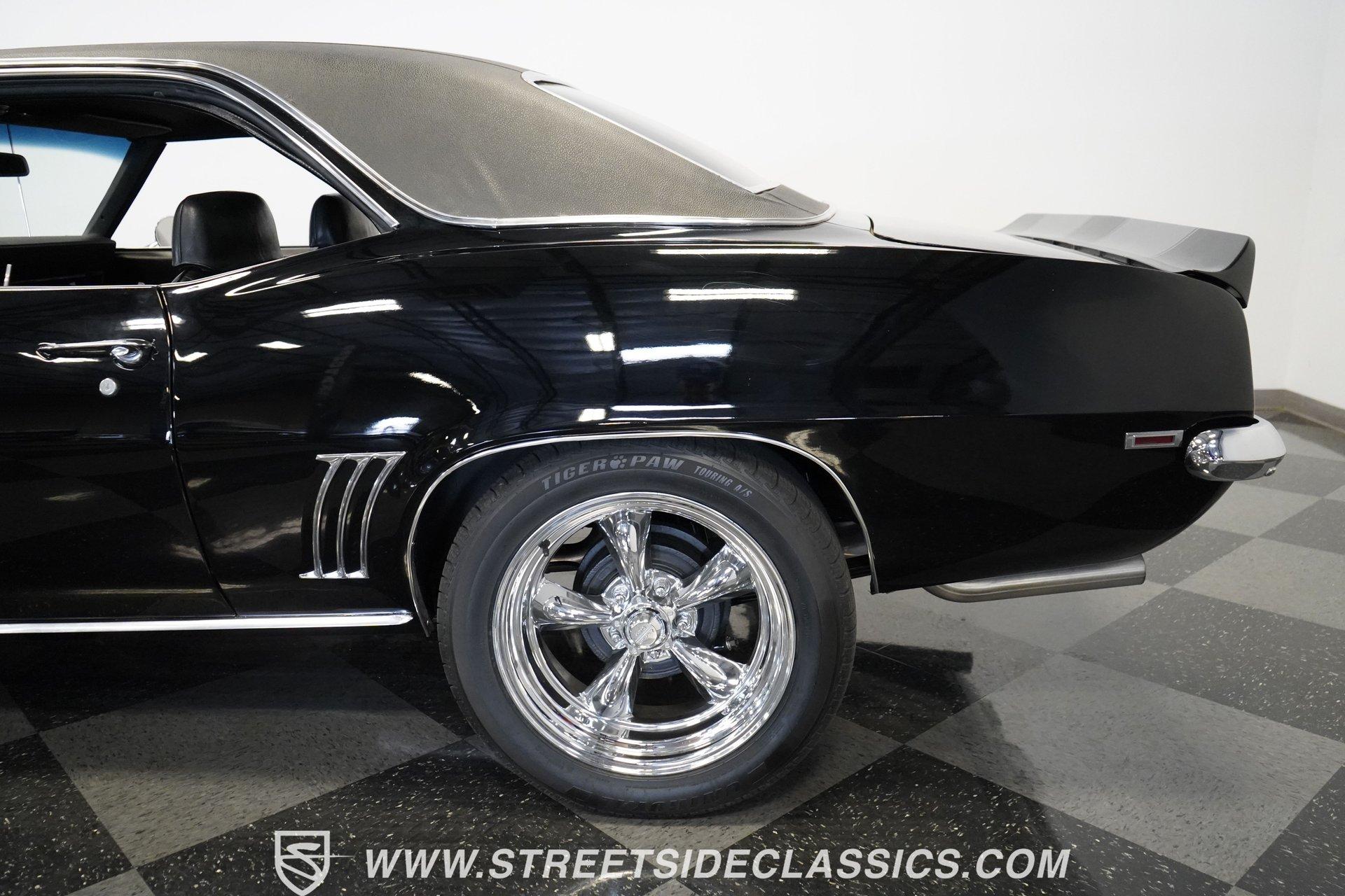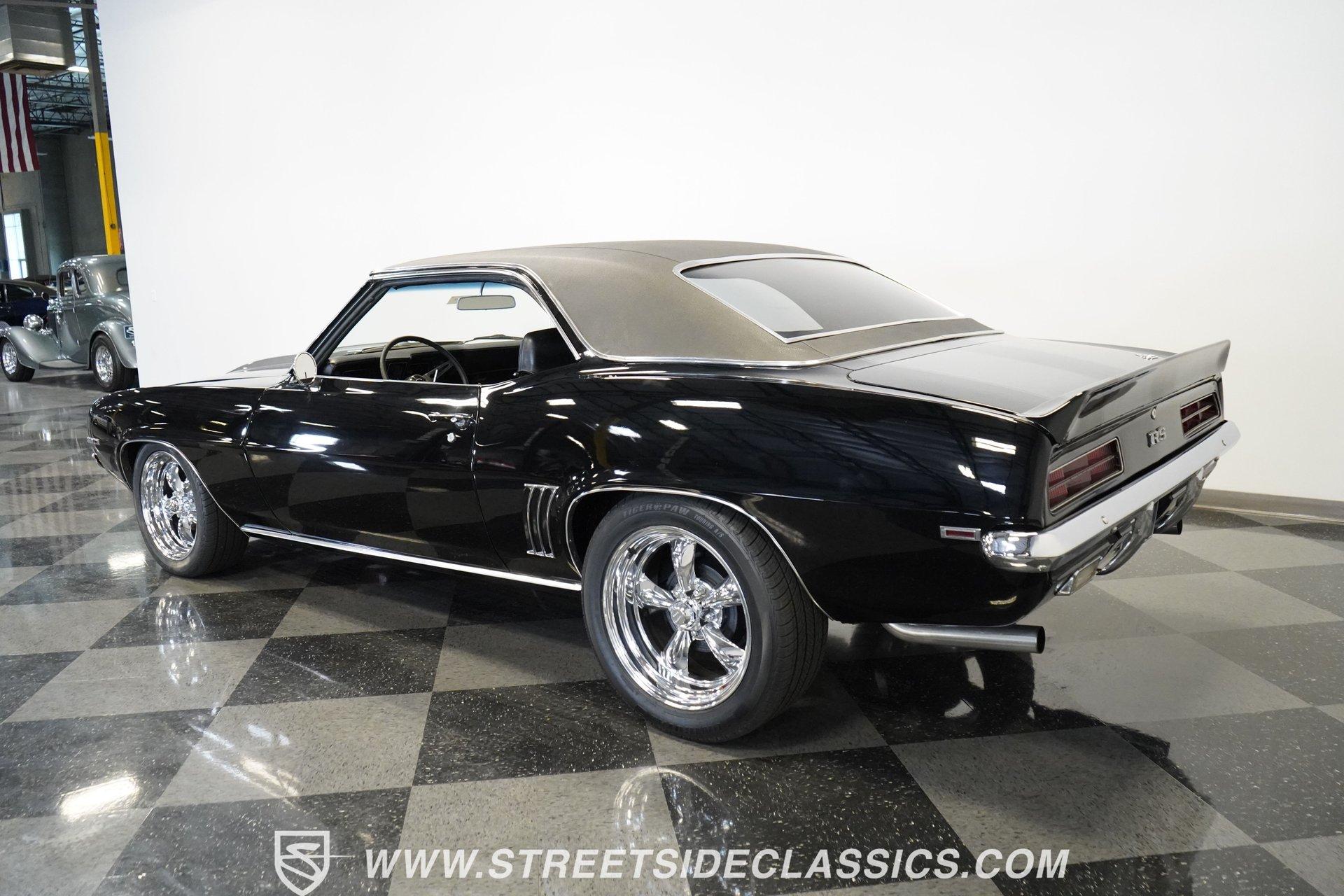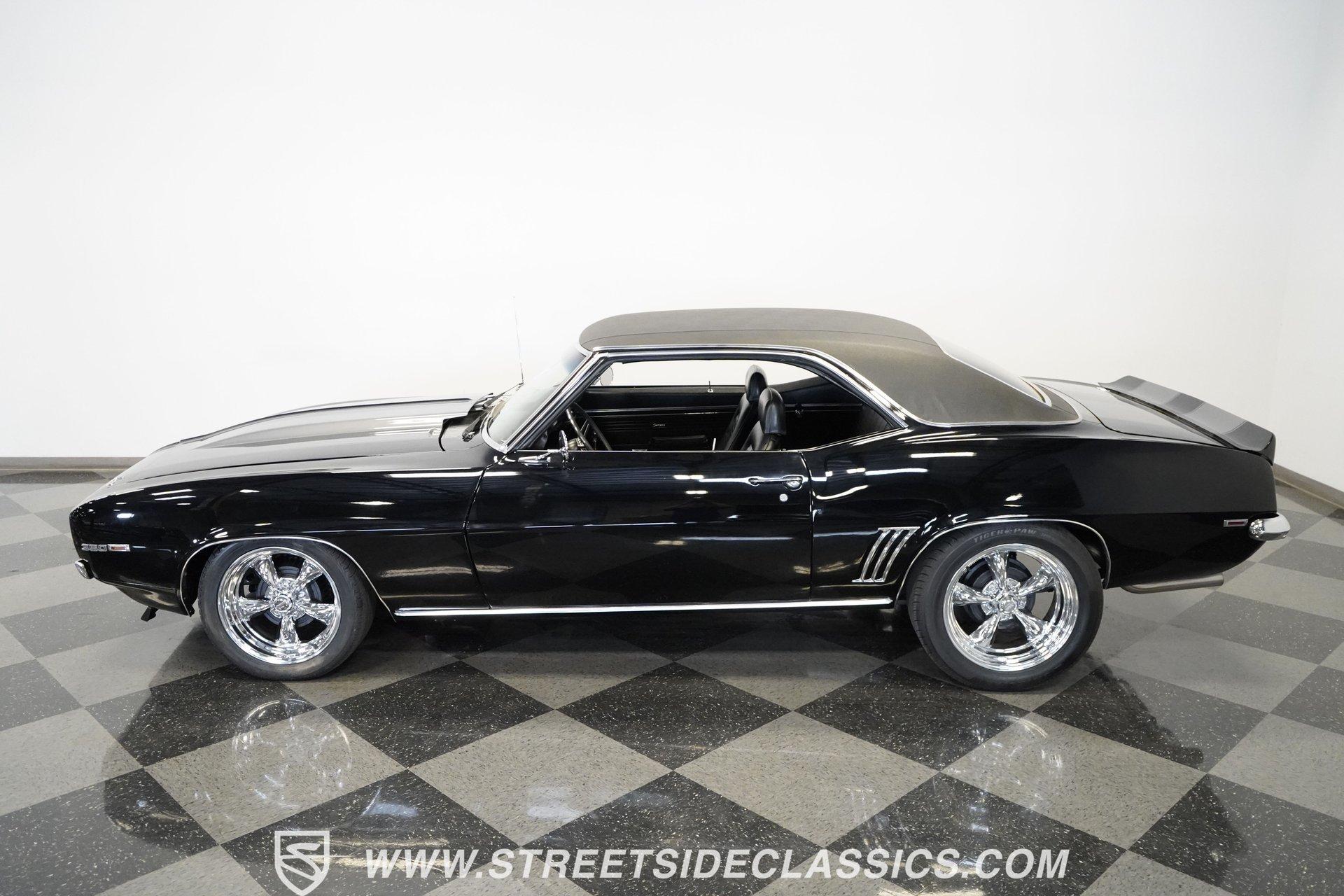 Powerful and menacing, the 1969 Chevrolet Camaro RS wears a sleek black exterior accented by dual gray stripes that run from front to back. Showing an incredibly low 71,392 actual miles, this triple-black machine features unique RS styling with distinctive headlight louvers in the grille, an RS decklid badge, strategically placed fog lights, and an athletic chin spoiler. A mild cowl hood adds visual punch while the small rear spoiler completes the look. Chrome American Racing wheels in staggered 17/18-inch sizes fill the wheel wells perfectly against the black paint. Opening the door reveals an exceptionally preserved black interior with high-back vinyl bucket seats that display classic ladder stitching, complemented by matching black door panels throughout the cabin. Additional instrumentation includes strategically mounted oil pressure and water temperature gauges positioned below the radio for quick viewing. The original floor shifter rises from the center console, while the modern Holley Sniper EFI control unit integrates cleanly into the ashtray location for easy adjustments without disrupting the factory appearance. When fired up, the 350 cubic inch V8 shows why these low-mileage classics remain so desirable. The orange-painted small block has been enhanced with an Edelbrock performer intake manifold and Holley Sniper electronic fuel injection for excellent drivability. Cooling comes via an aluminum radiator equipped with both mechanical and electric fans for reliability in all conditions. The exhaust flows through shorty headers into a dual MagnaFlow system, while the TH350 three-speed automatic transmission, power steering, and power brakes create an effortless driving experience. HIGHLIGHTS: 350 V8 engine TH350 3-speed automatic transmission Holley Sniper electronic fuel injection Edelbrock performer intake manifold Shorty headers Dual MagnaFlow exhaust Aluminum radiator with mechanical and electric fans Power brakes Black exterior with gray dual stripes RS grille with headlight louvers RS decklid badge Fog lights Chin spoiler Mild cowl hood Small rear spoiler 17" Front/18" Rear Chrome American Racing wheels 235/45R17 Front, 245/50R18 Rear Uniroyal Tigerpaw Touring A/S tires Black vinyl roof Black interior with High-back bucket seats Center console Floor shifter Power steering Oil pressure/water temperature gauges 71,392 ACTUAL MILES Low-mileage muscle cars with documented actual miles are increasingly rare today. With only 71,392 original miles, this 1969 Chevrolet Camaro RS combines classic good looks, excellent drivability from upgraded fuel injection, and an unmistakable presence on the road. The black-on-black-on-black color scheme will never go out of style. Call today!