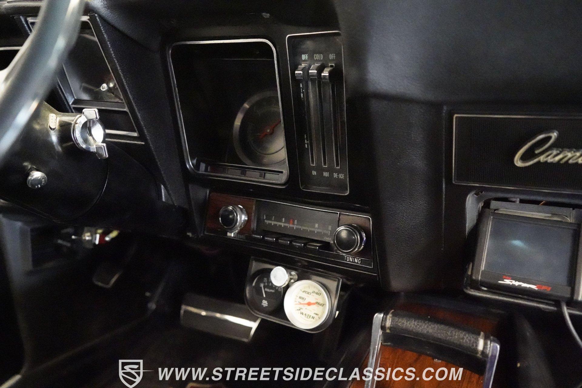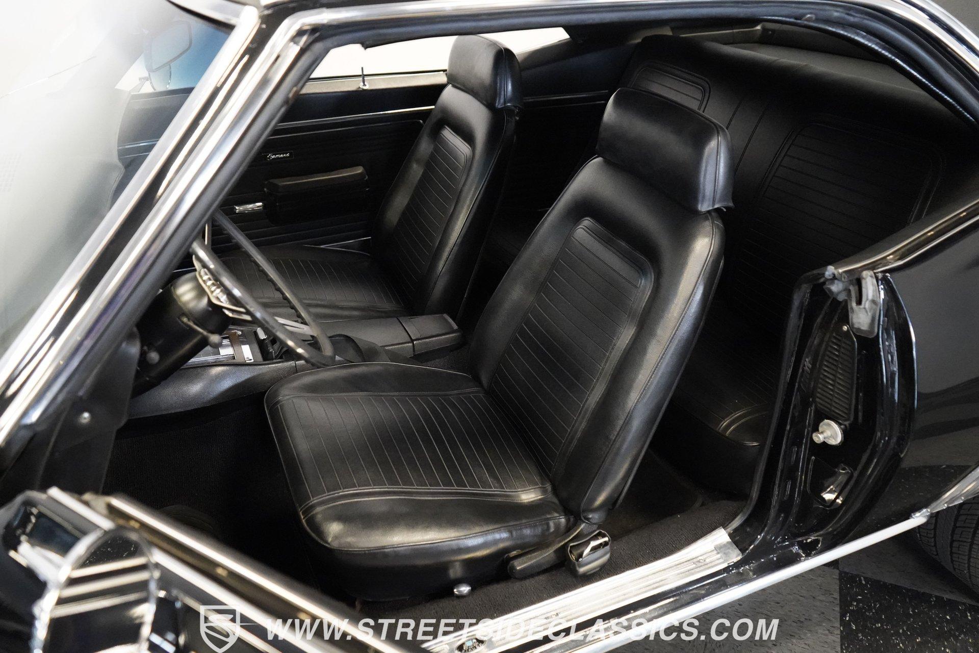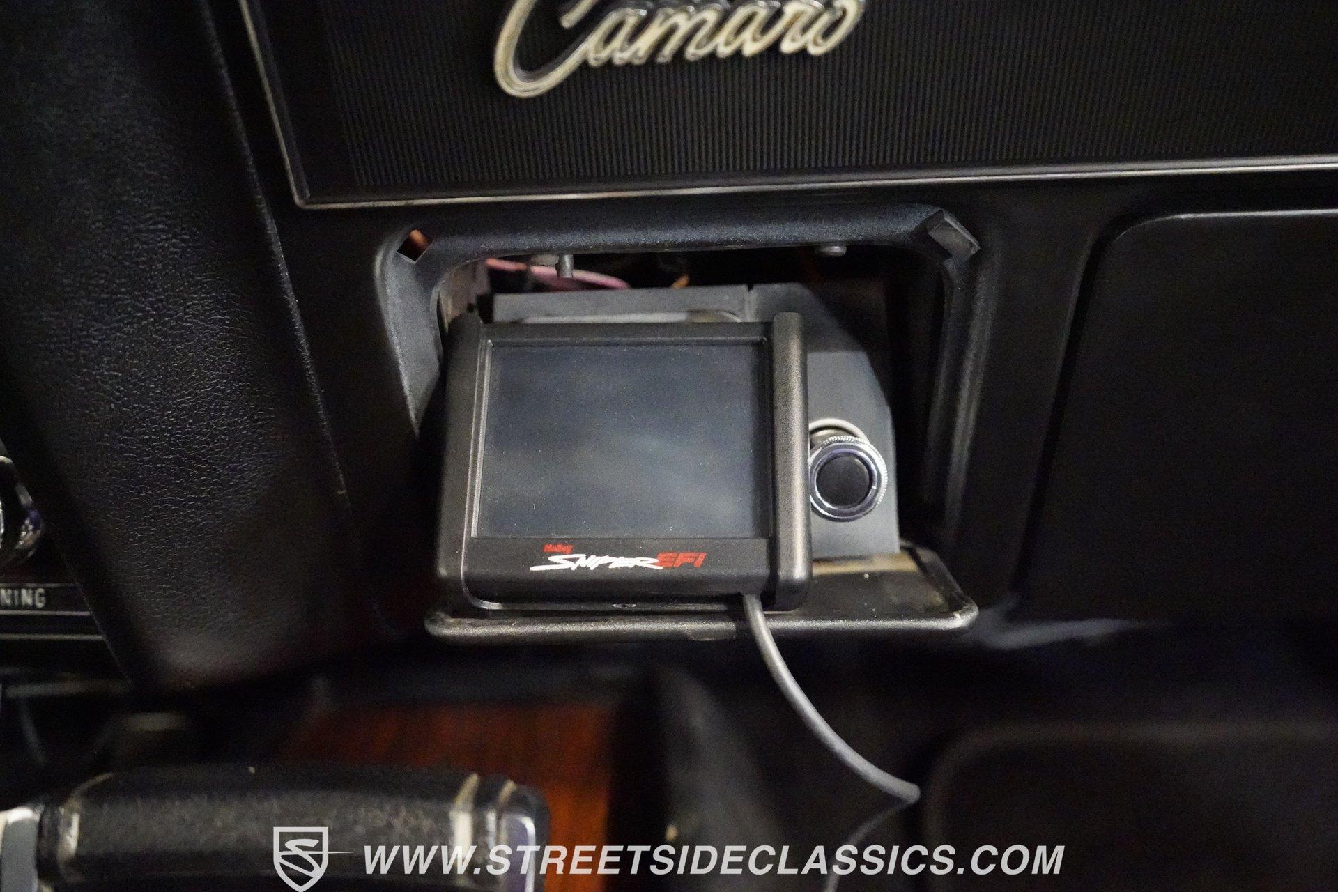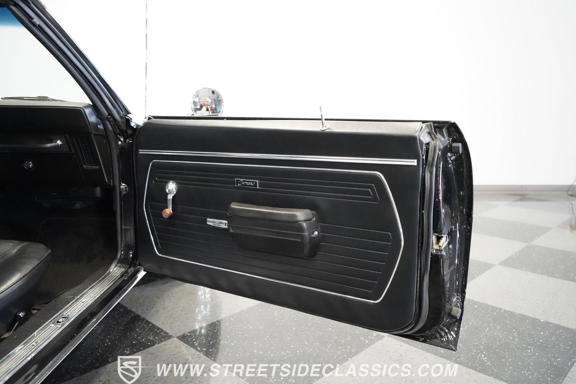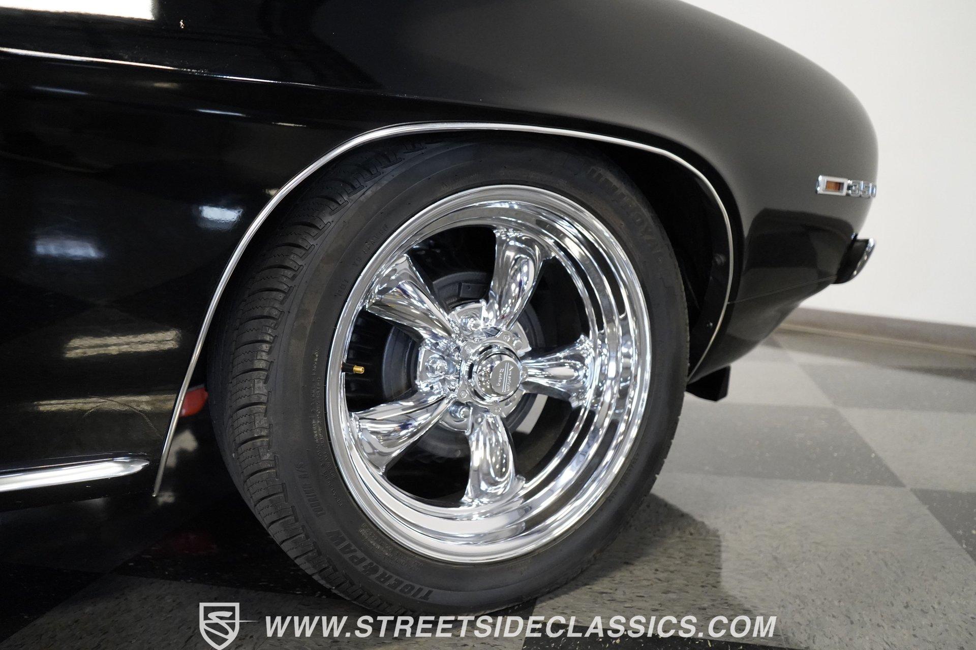 Powerful and menacing, the 1969 Chevrolet Camaro RS wears a sleek black exterior accented by dual gray stripes that run from front to back. Showing an incredibly low 71,392 actual miles, this triple-black machine features unique RS styling with distinctive headlight louvers in the grille, an RS decklid badge, strategically placed fog lights, and an athletic chin spoiler. A mild cowl hood adds visual punch while the small rear spoiler completes the look. Chrome American Racing wheels in staggered 17/18-inch sizes fill the wheel wells perfectly against the black paint. Opening the door reveals an exceptionally preserved black interior with high-back vinyl bucket seats that display classic ladder stitching, complemented by matching black door panels throughout the cabin. Additional instrumentation includes strategically mounted oil pressure and water temperature gauges positioned below the radio for quick viewing. The original floor shifter rises from the center console, while the modern Holley Sniper EFI control unit integrates cleanly into the ashtray location for easy adjustments without disrupting the factory appearance. When fired up, the 350 cubic inch V8 shows why these low-mileage classics remain so desirable. The orange-painted small block has been enhanced with an Edelbrock performer intake manifold and Holley Sniper electronic fuel injection for excellent drivability. Cooling comes via an aluminum radiator equipped with both mechanical and electric fans for reliability in all conditions. The exhaust flows through shorty headers into a dual MagnaFlow system, while the TH350 three-speed automatic transmission, power steering, and power brakes create an effortless driving experience. HIGHLIGHTS: 350 V8 engine TH350 3-speed automatic transmission Holley Sniper electronic fuel injection Edelbrock performer intake manifold Shorty headers Dual MagnaFlow exhaust Aluminum radiator with mechanical and electric fans Power brakes Black exterior with gray dual stripes RS grille with headlight louvers RS decklid badge Fog lights Chin spoiler Mild cowl hood Small rear spoiler 17" Front/18" Rear Chrome American Racing wheels 235/45R17 Front, 245/50R18 Rear Uniroyal Tigerpaw Touring A/S tires Black vinyl roof Black interior with High-back bucket seats Center console Floor shifter Power steering Oil pressure/water temperature gauges 71,392 ACTUAL MILES Low-mileage muscle cars with documented actual miles are increasingly rare today. With only 71,392 original miles, this 1969 Chevrolet Camaro RS combines classic good looks, excellent drivability from upgraded fuel injection, and an unmistakable presence on the road. The black-on-black-on-black color scheme will never go out of style. Call today!