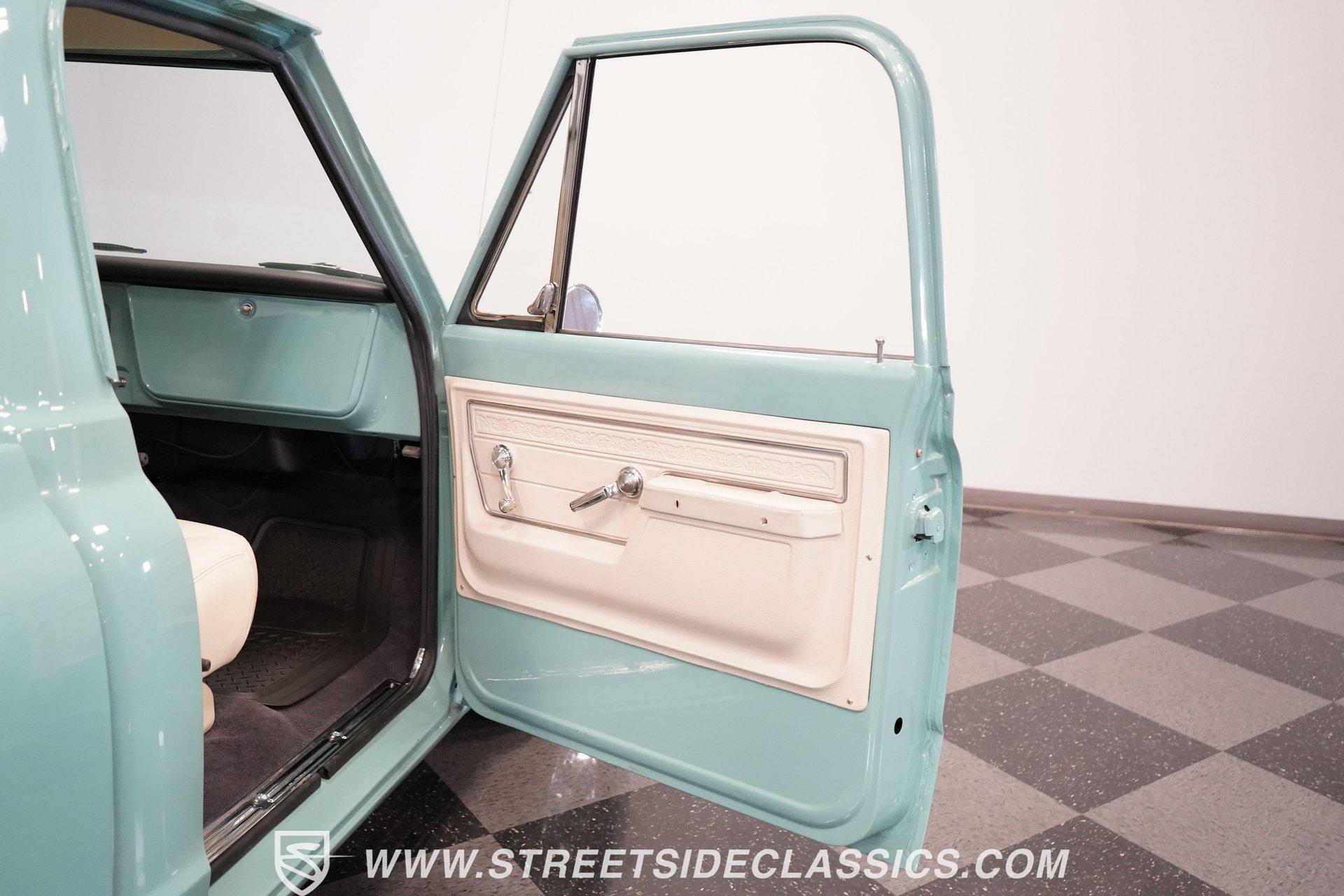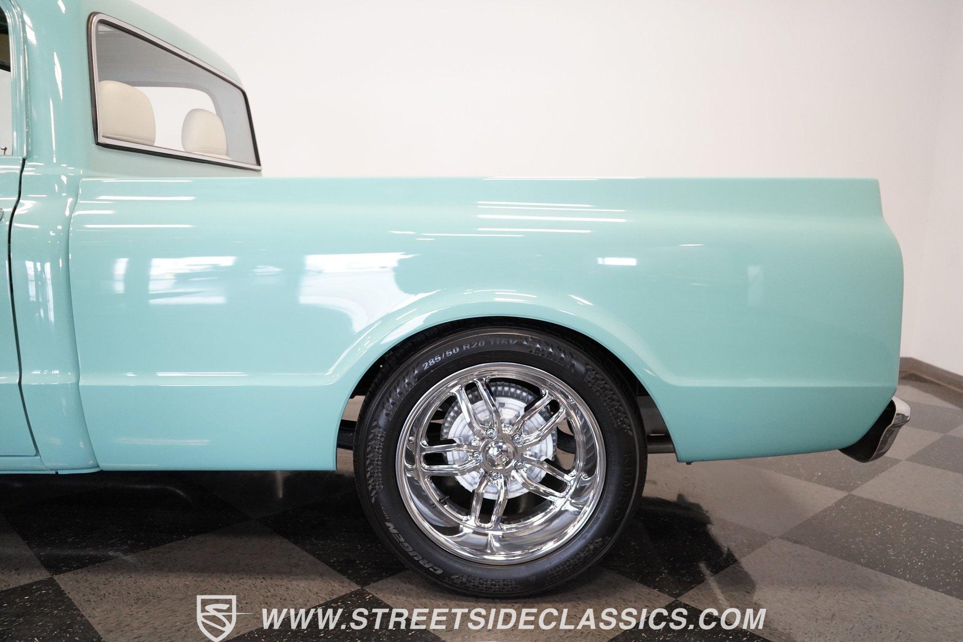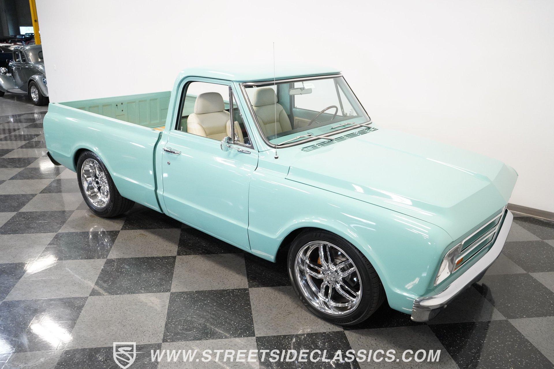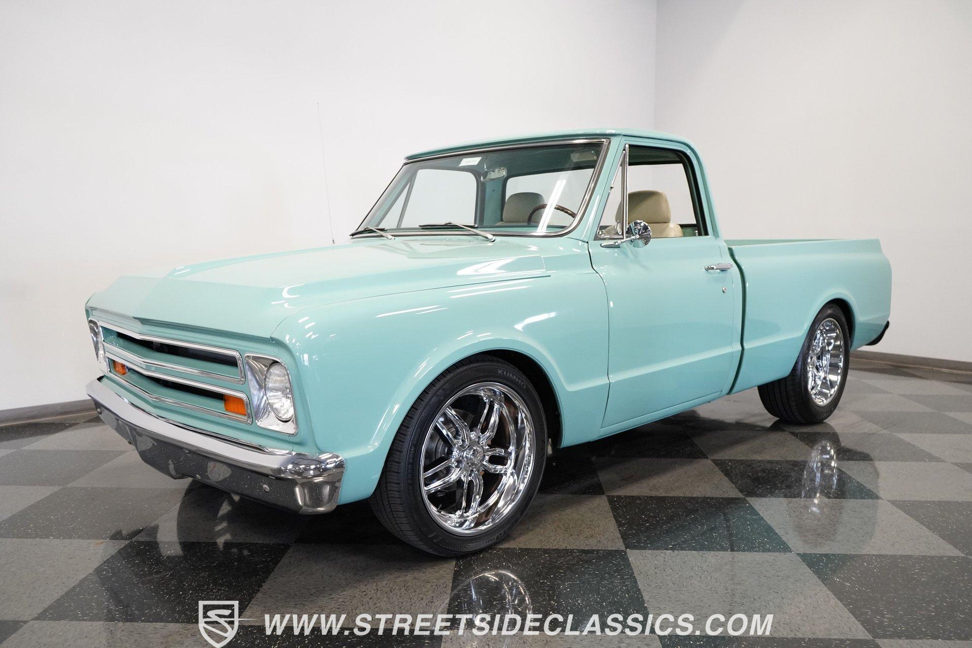 There's something about Mint Green on a classic pickup that makes it hard to ignore. This 1967 Chevrolet C10 comes finished in Mint Green, laid over a full repaint that gives the body a smooth, even finish front to back. Chrome 20-inch US Mags bring in extra width and fill out the stance. Tire sizing is staggered, with 245/45R20 up front and 285/50R20 in the rear. The front and rear suspension setup gives it a planted look, and all the trim and glass hold consistent with the truck's clean street style. Inside, this C10 features later-model bucket seats finished in white vinyl, paired with a black carpet for contrast. There's a floor-mounted shifter, and a tilt steering column adds some legroom where it counts. A CD stereo system is in place, equipped with satellite and aux input, keeping music duty easy. The cabin layout is straightforward with everything where it should be. Power steering adds ease to the effort without changing the original layout or vibe. Power comes from a 350 V8 paired with a 4-speed automatic transmission. A 4-barrel carburetor and performance intake top the motor, and long tube headers feed into a dual exhaust system with chambered mufflers. Power front disc brakes help slow things down, and the rear runs a 12-bolt axle. The front suspension is independent with coil springs, shocks, and a sway bar. Out back, it's a solid axle with control arms, coil springs, and air shocks. The overall setup feels cohesive. HIGHLIGHTS 350 V8 engine 4-speed automatic transmission 4-barrel carburetor Performance intake Power front disc brakes Long tube headers Dual exhaust with chambered mufflers Independent front suspension with coil springs, shocks, sway bar Solid rear axle with control arms, coil springs, air shocks 12-bolt rear axle Mint Green paint 20" Chrome US Mags wheels with 245/45R20 front, 285/50R20 rear tires White vinyl bucket seats CD stereo with SAT and AUX input Floor-mounted Lokar shifter Tilt steering column Power steering This 1967 Chevrolet C10 brings together a sharp look, solid powertrain, and all the right upgrades to make it a standout street truck. With its bold color, staggered wheels, and dialed stance, it's the kind of build that hits all the marks without trying too hard. Call today!