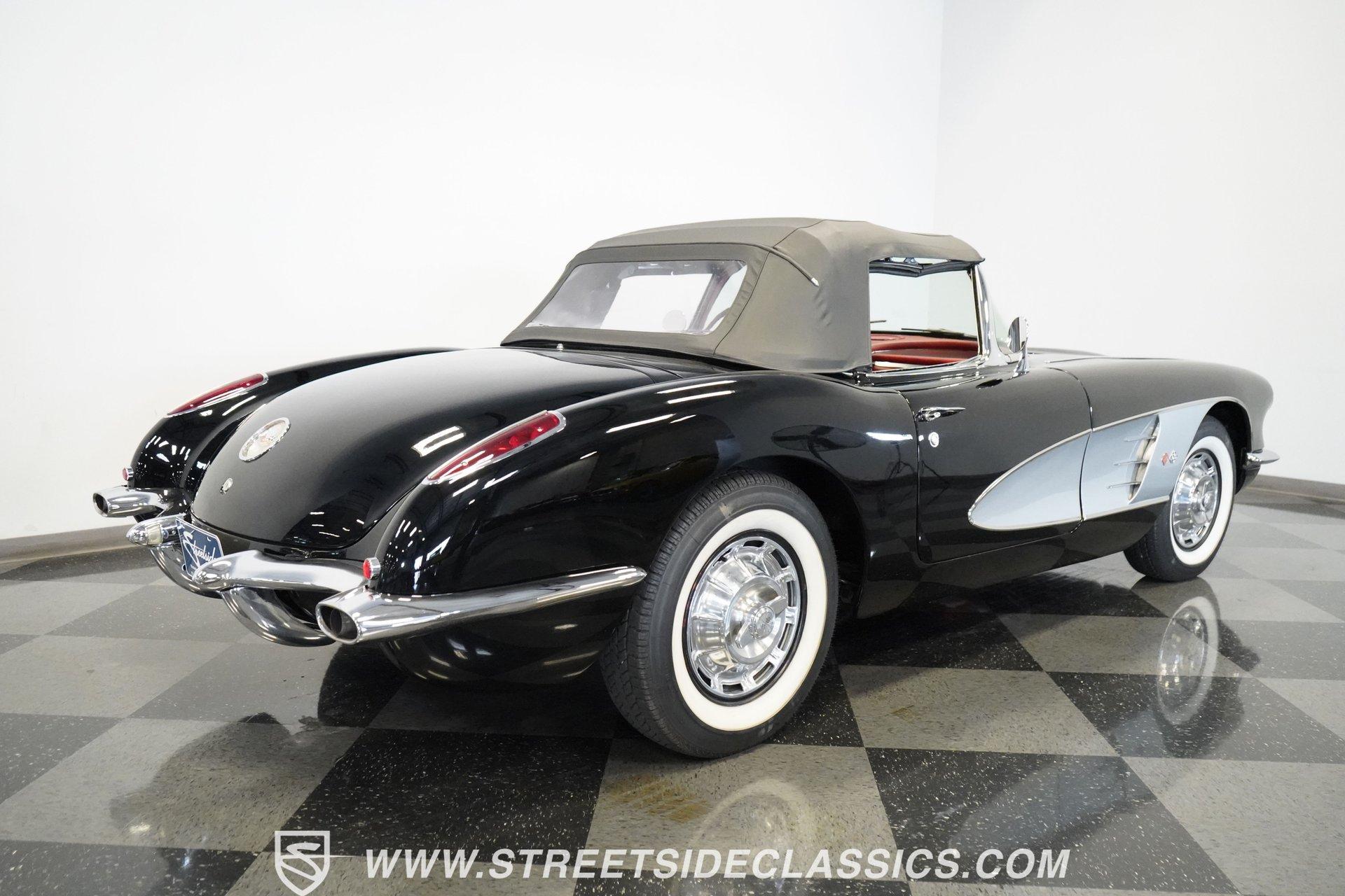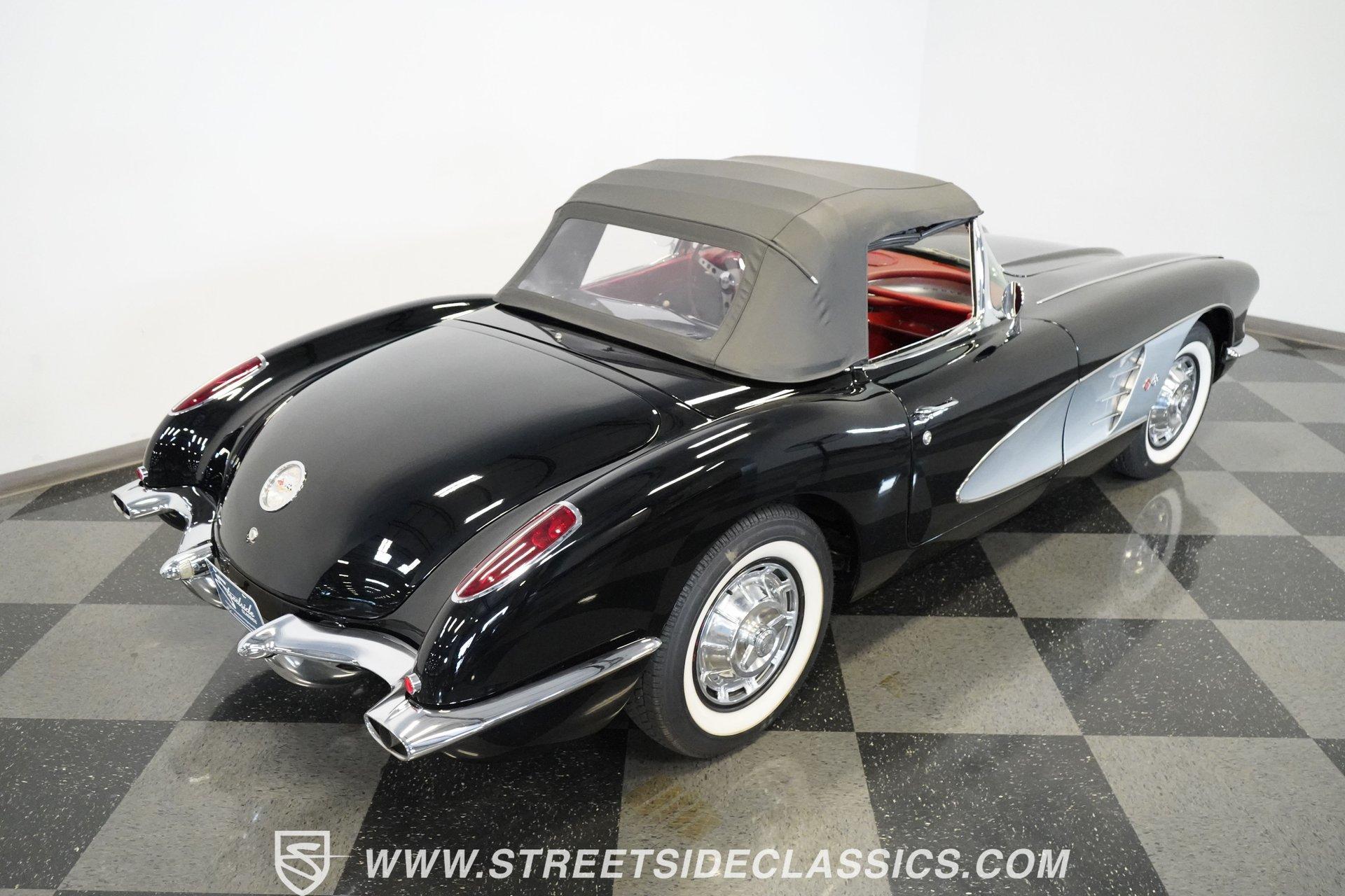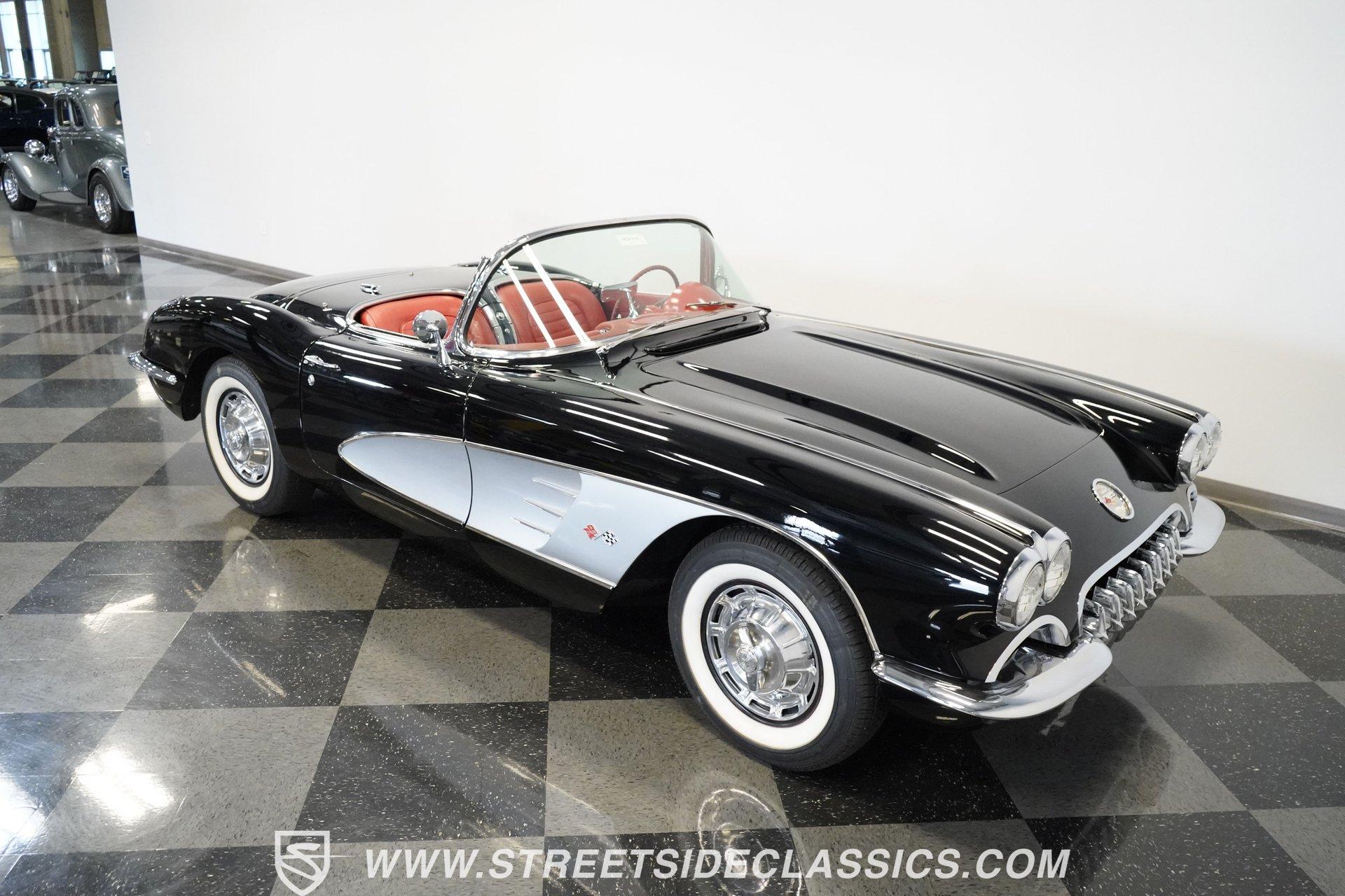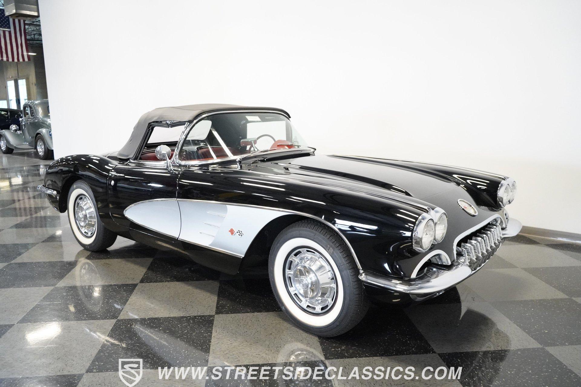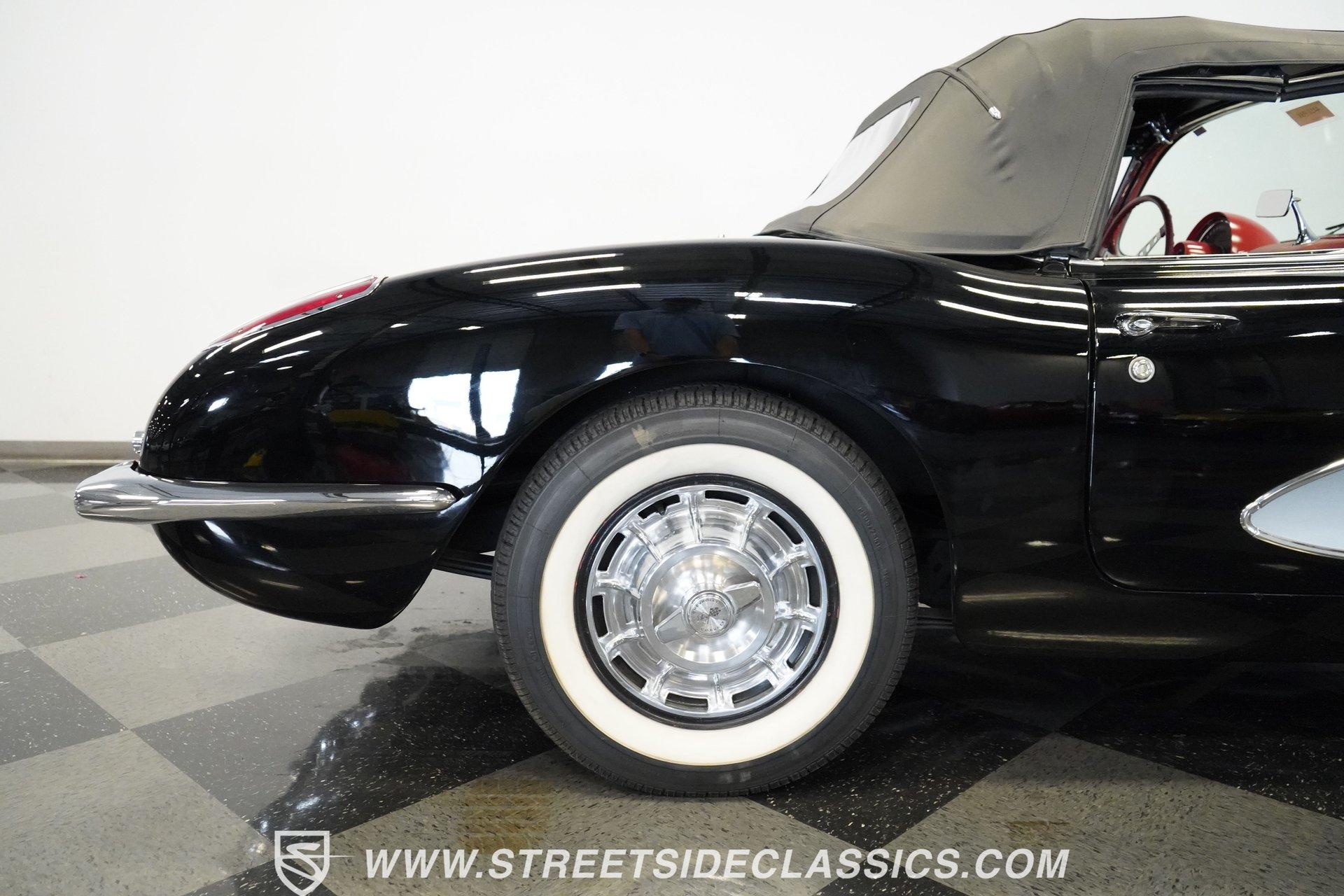 In 1959, Chevrolet cleaned up some of the Corvette's 1958 affectations, getting rid of the waffled hood and the overdone chrome strips on the trunk. Sales remained steady at 9,670, at the base price was $3,875, up about $300 from the year before. Engines for the 1959 Chevrolet Corvette ranged from the base 283-cubic inch V8, with 230 horsepower, to the Rochester fuel-injected 290-horsepower setup. Door panels were redesigned to increase elbow room, instruments were changed to make them more legible, with tachometers now reading to 7,000rpm. A storage bin was added underneath the passenger's grab bar, which was more padded. Four-speed cars now had a "T" shift handle with positive lockout from reverse gear. This handsome restored Corvette is finished strikingly in Tuxedo Black with Inca Silver cove and a black convertible top. The classic styling is complemented by a set of wide whitewall Coker Classic radial tires that appear period correct, but with enhanced drivability. The red interior pops against the Black exterior color and is restored to stock specifications, including the optional factory Wonderbar signal-seeking radio. HIGHLIGHTS: 283 V-8 engine 4-Speed manual transmission Factory 2 4-barrel carburetors Coker Classic wide whitewall radial tires Optional factory Wonderbar radio Fully restored and in excellent condition Desirable Tuxedo Black with Inca Silver cove Red interior Correct spinner wheel covers Hurst shifter Black convertible top Red interior Under the hood is an authentic appearing 283 cubic-inch V8 with optional dual Carter 4-barrel carburetors paired with a 4-speed manual transmission with a Hurst shifter that makes this classic Corvette a pleasure to drive. A pioneering automobile and an icon of American culture, the first-generation Chevrolet Corvette is one of those rare machines that transcends the world of collector cars, drawing in and winning over all who lay eyes on it. A model as usable as it is historically significant, this 1959 Chevrolet Corvette would be just as at home cruising to "cars and coffee" events as it would serving as the cornerstone of a serious collection of American muscle. Call today!