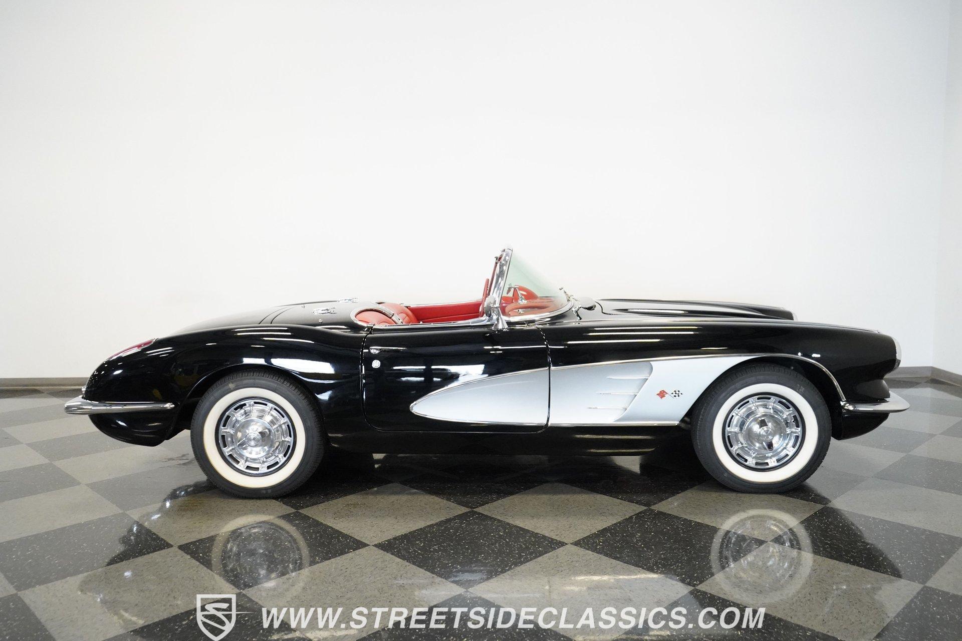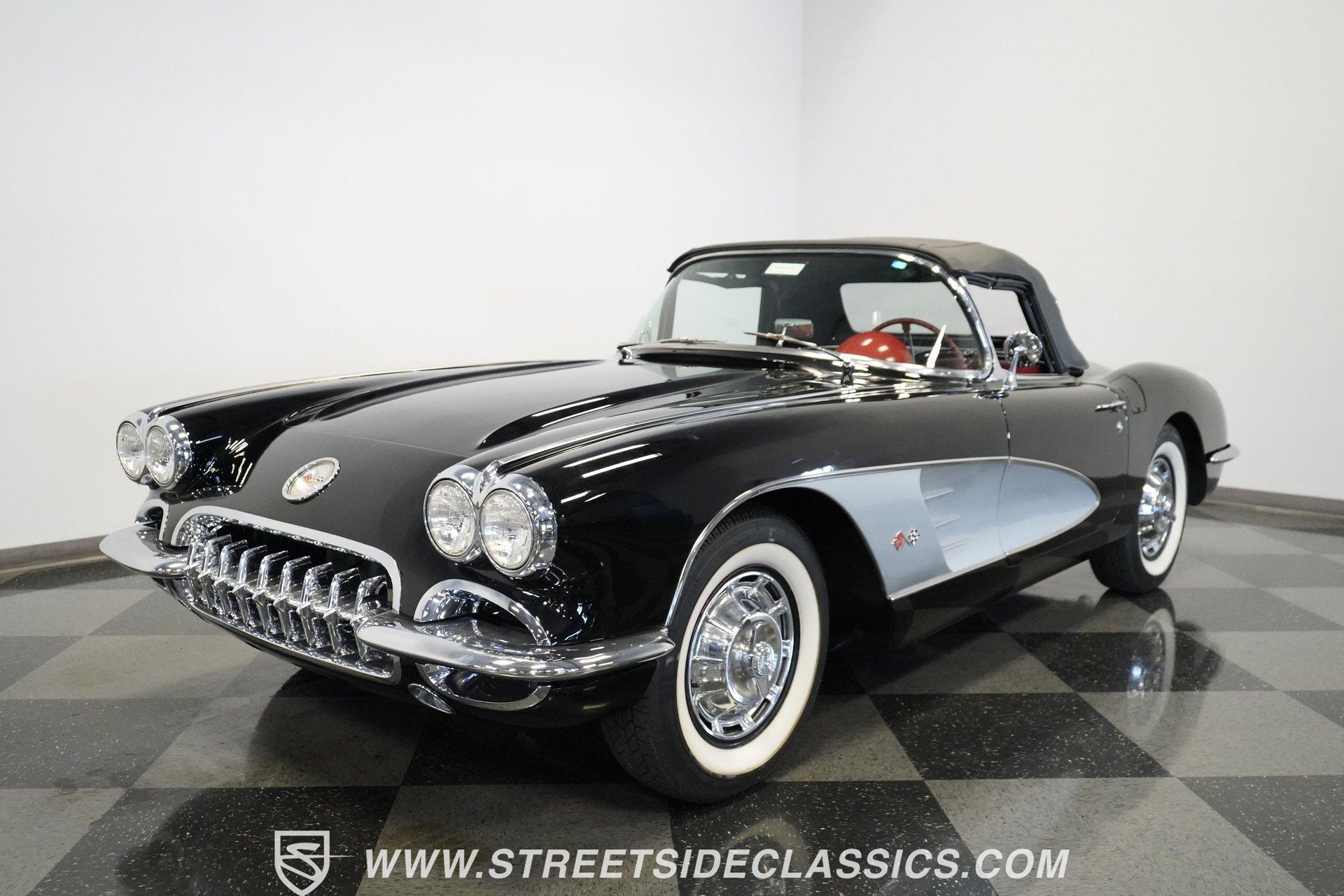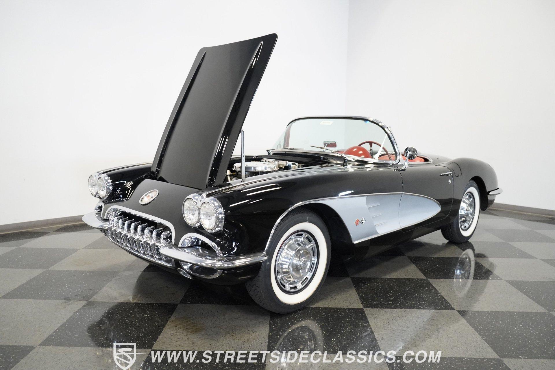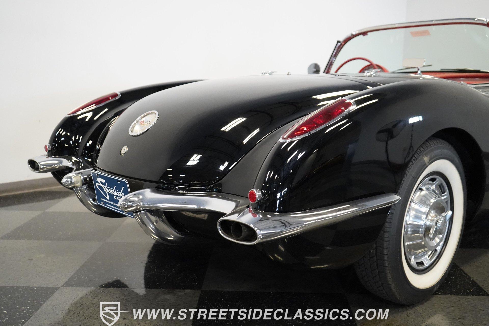 In 1959, Chevrolet cleaned up some of the Corvette's 1958 affectations, getting rid of the waffled hood and the overdone chrome strips on the trunk. Sales remained steady at 9,670, at the base price was $3,875, up about $300 from the year before. Engines for the 1959 Chevrolet Corvette ranged from the base 283-cubic inch V8, with 230 horsepower, to the Rochester fuel-injected 290-horsepower setup. Door panels were redesigned to increase elbow room, instruments were changed to make them more legible, with tachometers now reading to 7,000rpm. A storage bin was added underneath the passenger's grab bar, which was more padded. Four-speed cars now had a "T" shift handle with positive lockout from reverse gear. This handsome restored Corvette is finished strikingly in Tuxedo Black with Inca Silver cove and a black convertible top. The classic styling is complemented by a set of wide whitewall Coker Classic radial tires that appear period correct, but with enhanced drivability. The red interior pops against the Black exterior color and is restored to stock specifications, including the optional factory Wonderbar signal-seeking radio. HIGHLIGHTS: 283 V-8 engine 4-Speed manual transmission Factory 2 4-barrel carburetors Coker Classic wide whitewall radial tires Optional factory Wonderbar radio Fully restored and in excellent condition Desirable Tuxedo Black with Inca Silver cove Red interior Correct spinner wheel covers Hurst shifter Black convertible top Red interior Under the hood is an authentic appearing 283 cubic-inch V8 with optional dual Carter 4-barrel carburetors paired with a 4-speed manual transmission with a Hurst shifter that makes this classic Corvette a pleasure to drive. A pioneering automobile and an icon of American culture, the first-generation Chevrolet Corvette is one of those rare machines that transcends the world of collector cars, drawing in and winning over all who lay eyes on it. A model as usable as it is historically significant, this 1959 Chevrolet Corvette would be just as at home cruising to "cars and coffee" events as it would serving as the cornerstone of a serious collection of American muscle. Call today!