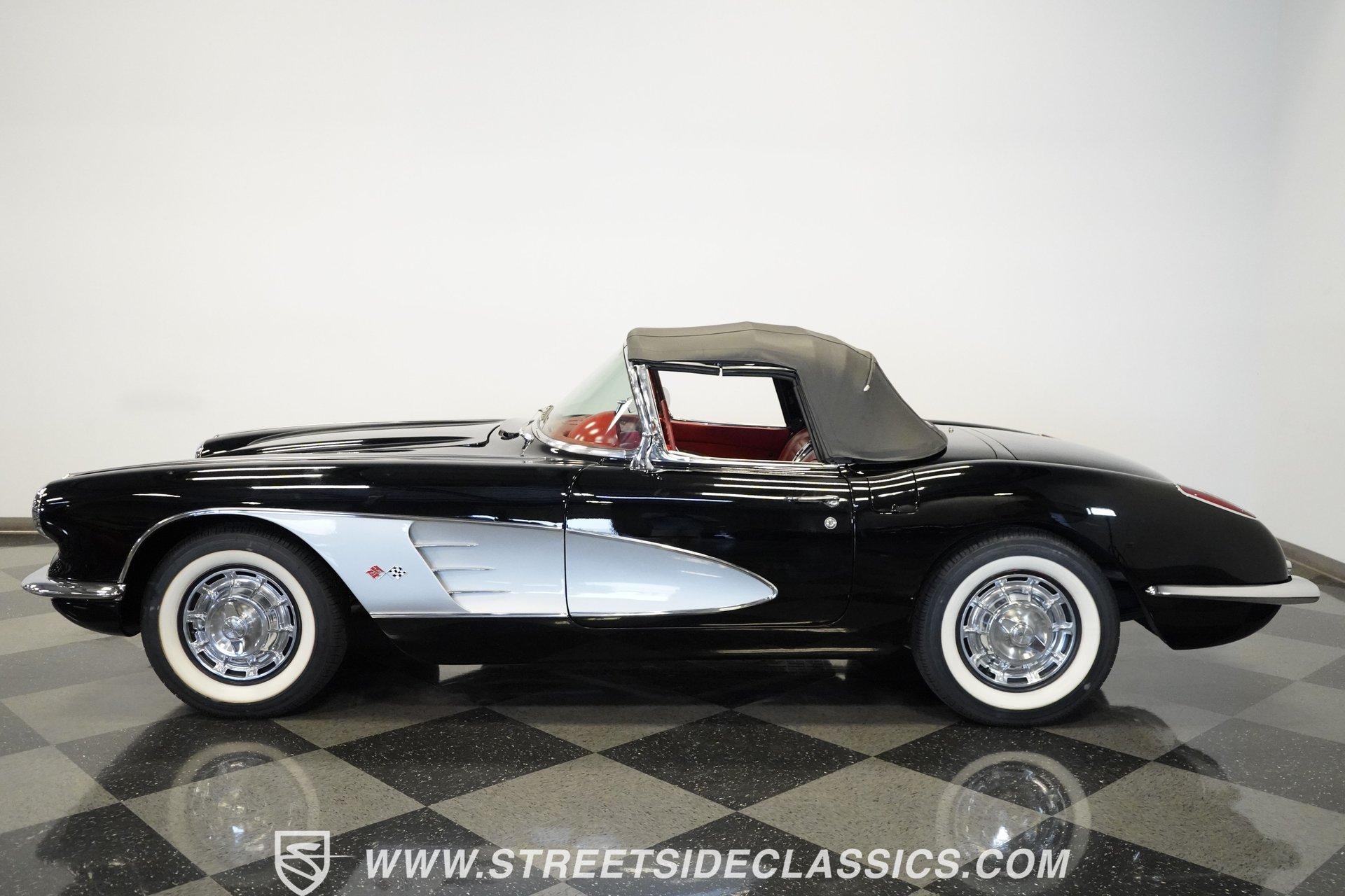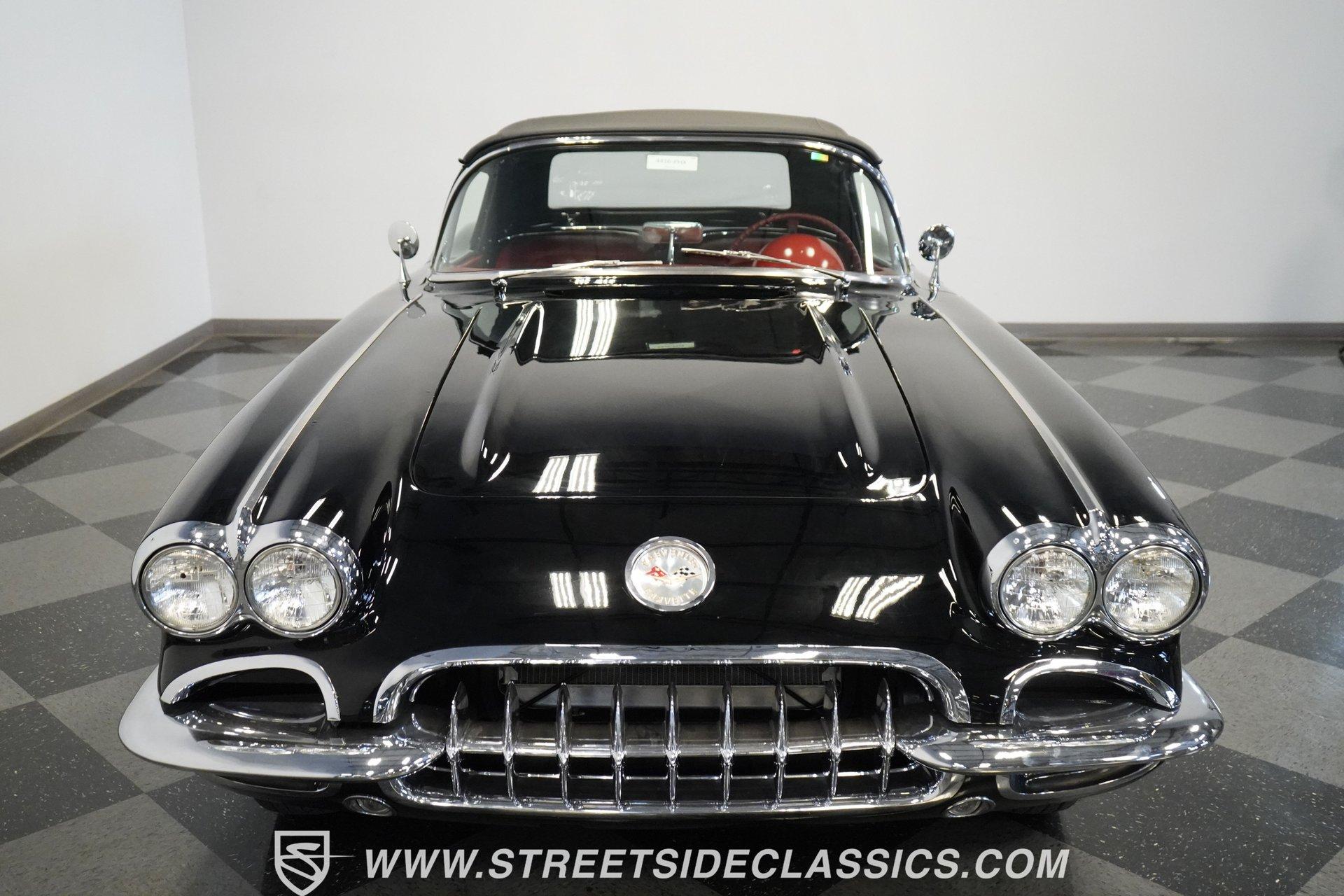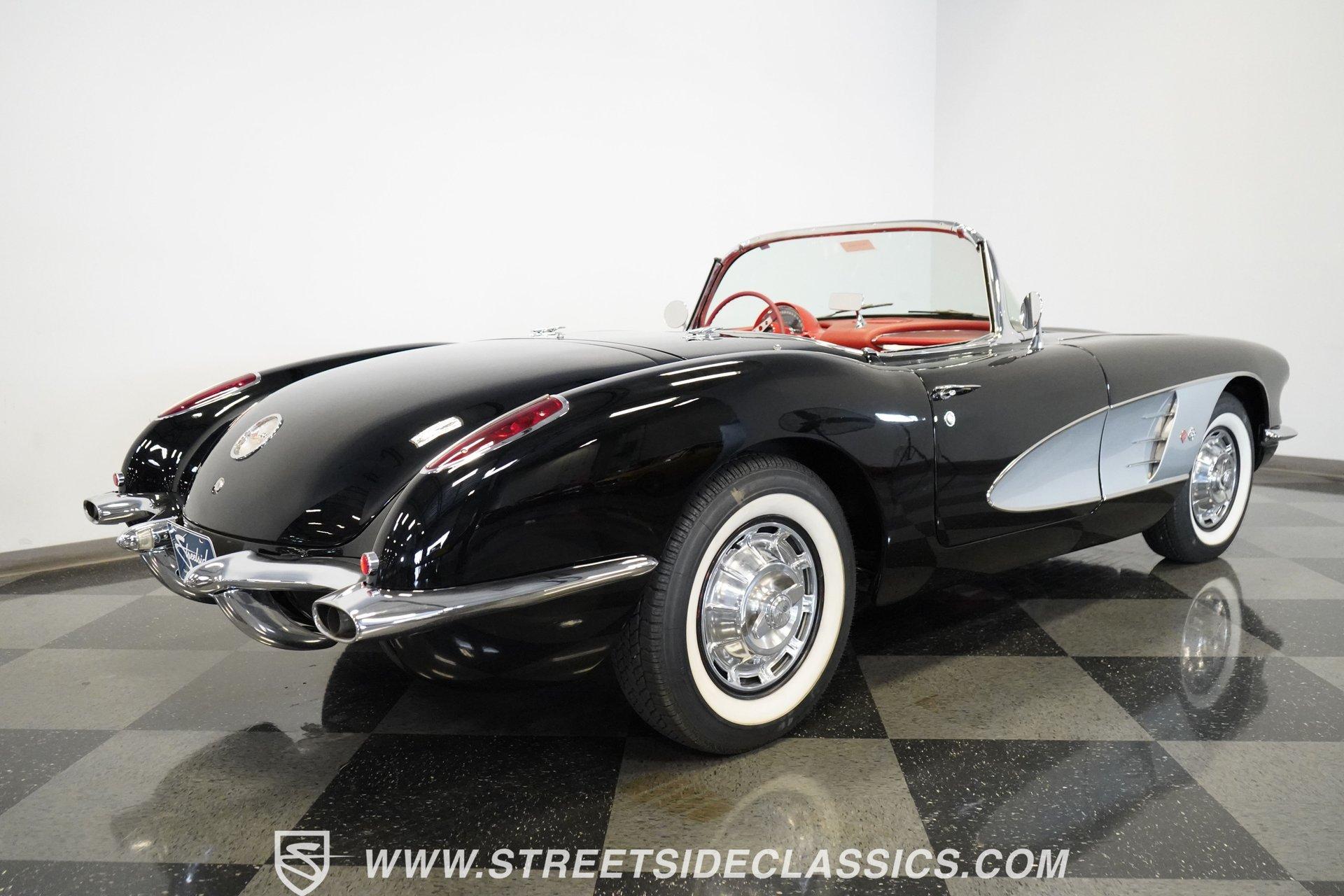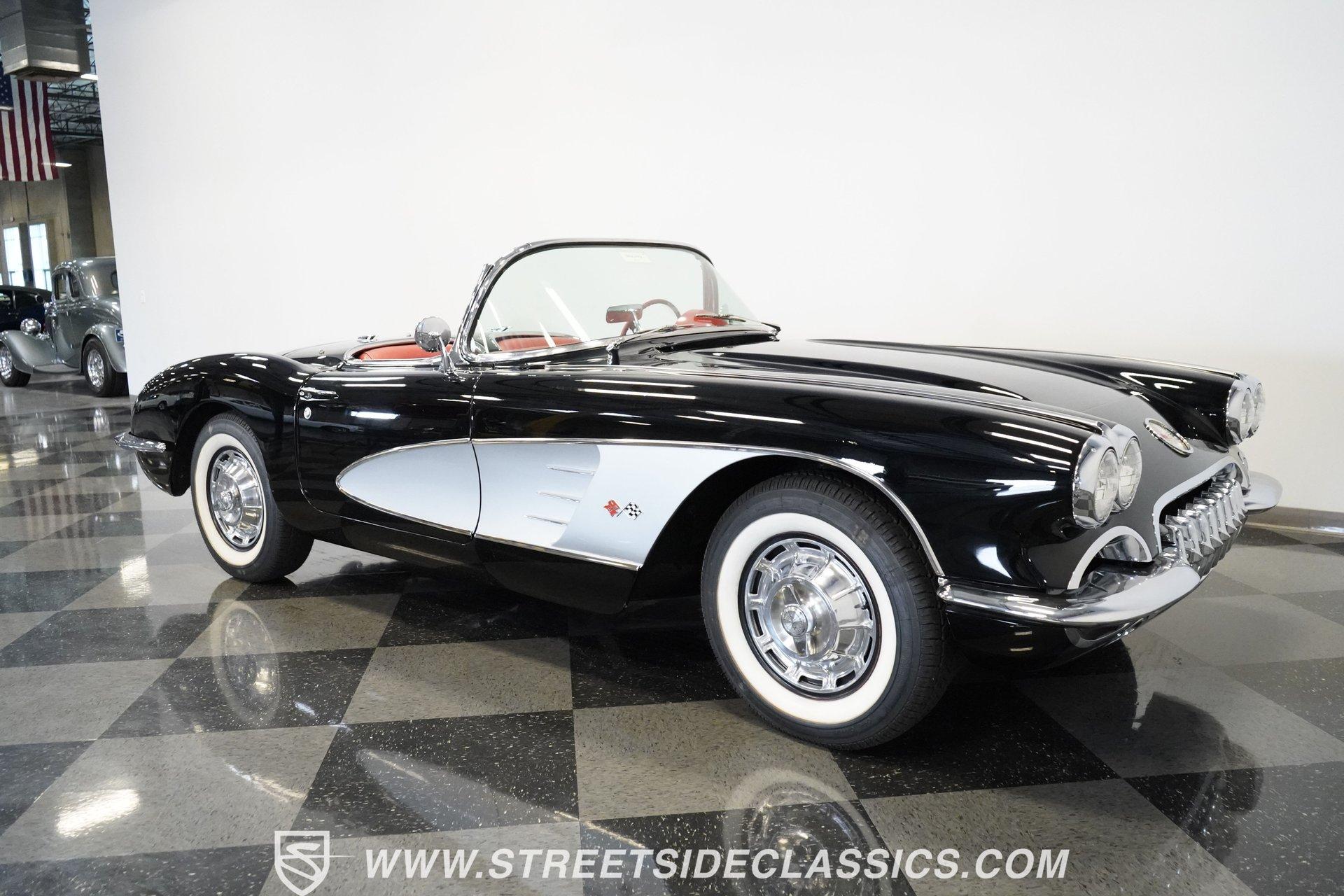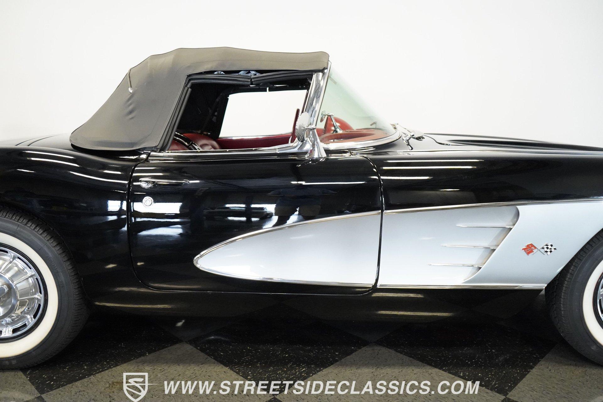 In 1959, Chevrolet cleaned up some of the Corvette's 1958 affectations, getting rid of the waffled hood and the overdone chrome strips on the trunk. Sales remained steady at 9,670, at the base price was $3,875, up about $300 from the year before. Engines for the 1959 Chevrolet Corvette ranged from the base 283-cubic inch V8, with 230 horsepower, to the Rochester fuel-injected 290-horsepower setup. Door panels were redesigned to increase elbow room, instruments were changed to make them more legible, with tachometers now reading to 7,000rpm. A storage bin was added underneath the passenger's grab bar, which was more padded. Four-speed cars now had a "T" shift handle with positive lockout from reverse gear. This handsome restored Corvette is finished strikingly in Tuxedo Black with Inca Silver cove and a black convertible top. The classic styling is complemented by a set of wide whitewall Coker Classic radial tires that appear period correct, but with enhanced drivability. The red interior pops against the Black exterior color and is restored to stock specifications, including the optional factory Wonderbar signal-seeking radio. HIGHLIGHTS: 283 V-8 engine 4-Speed manual transmission Factory 2 4-barrel carburetors Coker Classic wide whitewall radial tires Optional factory Wonderbar radio Fully restored and in excellent condition Desirable Tuxedo Black with Inca Silver cove Red interior Correct spinner wheel covers Hurst shifter Black convertible top Red interior Under the hood is an authentic appearing 283 cubic-inch V8 with optional dual Carter 4-barrel carburetors paired with a 4-speed manual transmission with a Hurst shifter that makes this classic Corvette a pleasure to drive. A pioneering automobile and an icon of American culture, the first-generation Chevrolet Corvette is one of those rare machines that transcends the world of collector cars, drawing in and winning over all who lay eyes on it. A model as usable as it is historically significant, this 1959 Chevrolet Corvette would be just as at home cruising to "cars and coffee" events as it would serving as the cornerstone of a serious collection of American muscle. Call today!