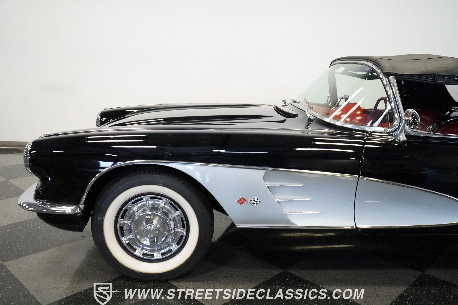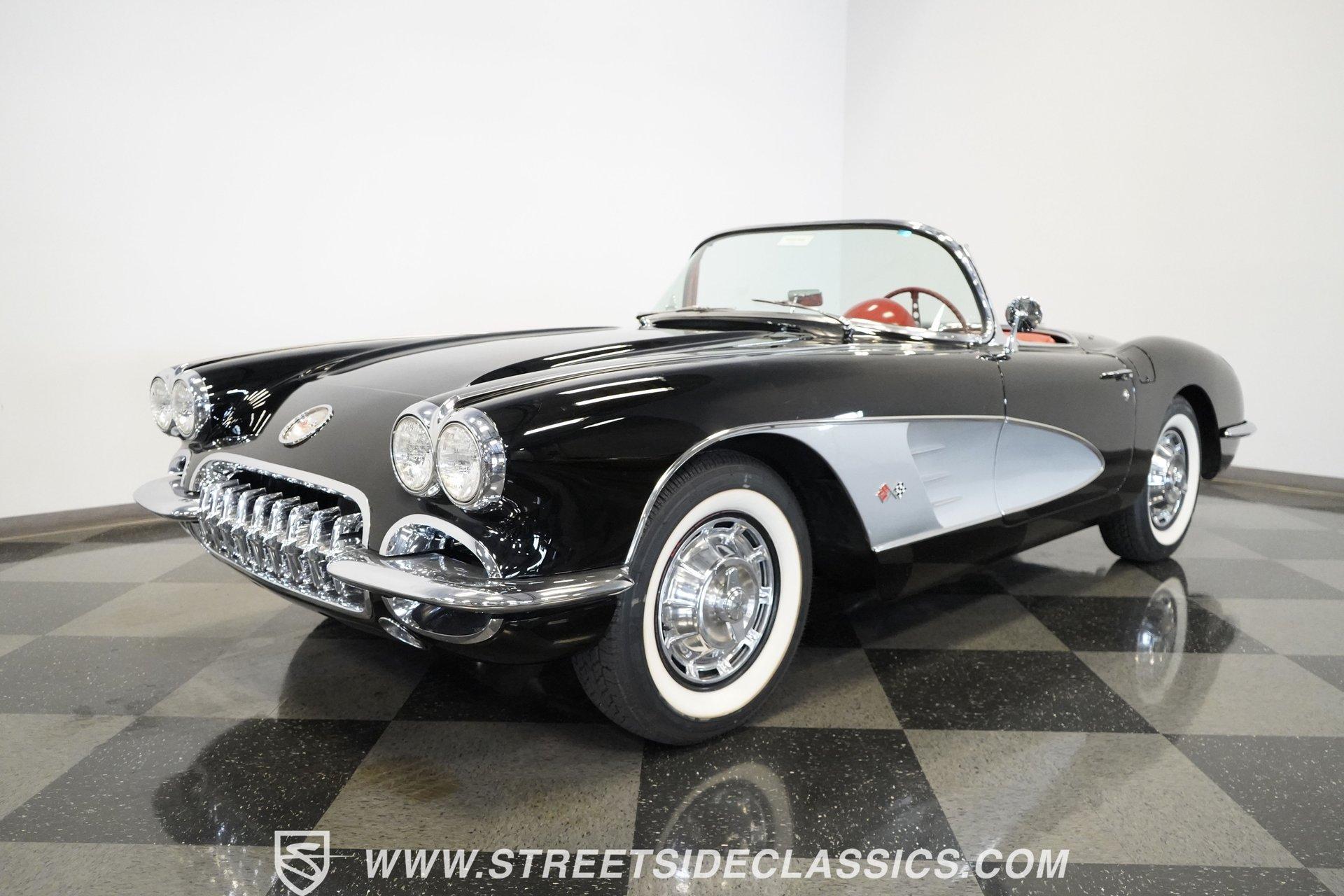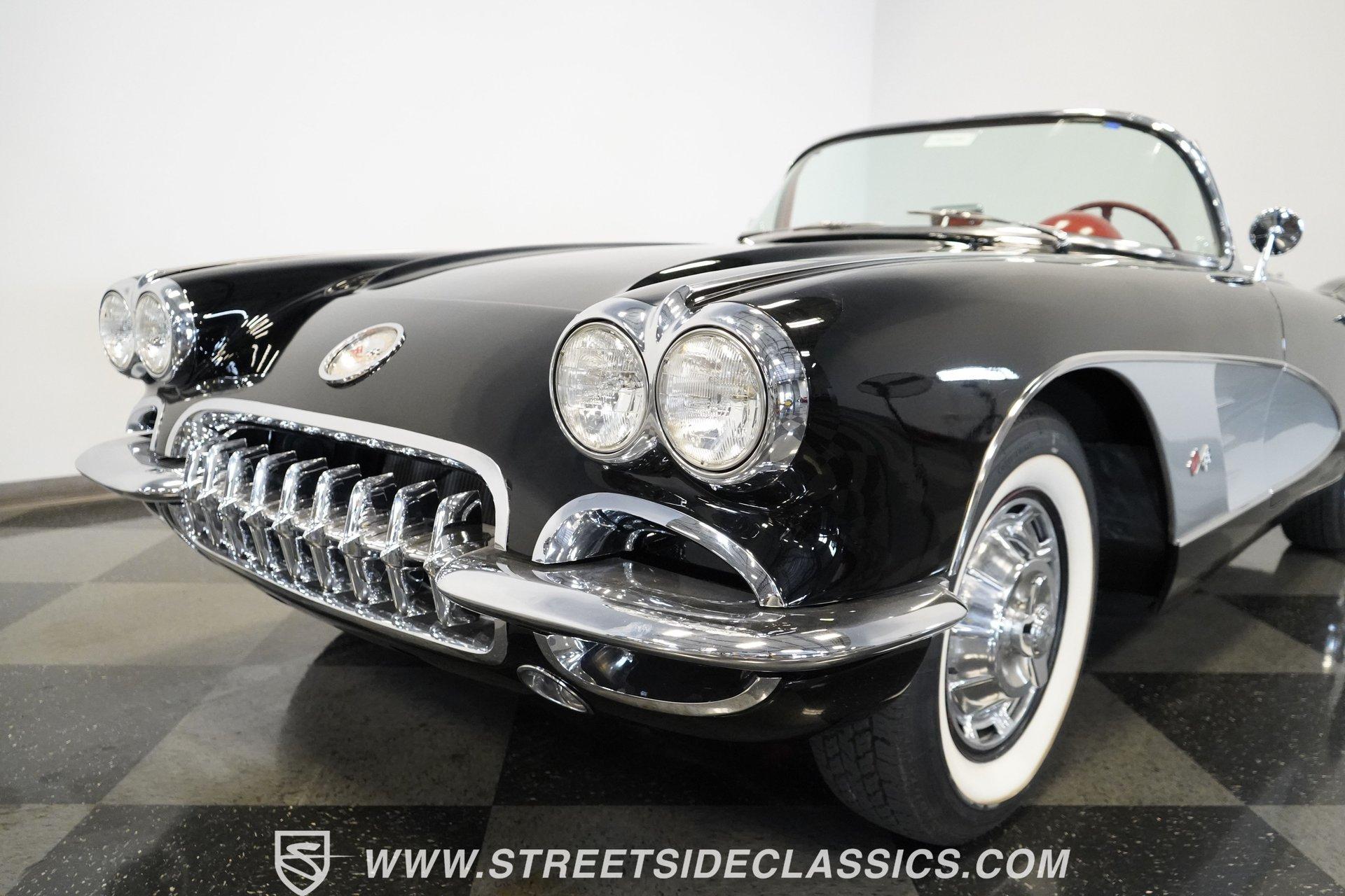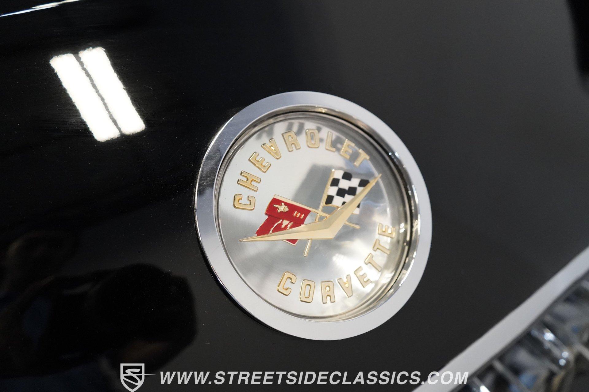 In 1959, Chevrolet cleaned up some of the Corvette's 1958 affectations, getting rid of the waffled hood and the overdone chrome strips on the trunk. Sales remained steady at 9,670, at the base price was $3,875, up about $300 from the year before. Engines for the 1959 Chevrolet Corvette ranged from the base 283-cubic inch V8, with 230 horsepower, to the Rochester fuel-injected 290-horsepower setup. Door panels were redesigned to increase elbow room, instruments were changed to make them more legible, with tachometers now reading to 7,000rpm. A storage bin was added underneath the passenger's grab bar, which was more padded. Four-speed cars now had a "T" shift handle with positive lockout from reverse gear. This handsome restored Corvette is finished strikingly in Tuxedo Black with Inca Silver cove and a black convertible top. The classic styling is complemented by a set of wide whitewall Coker Classic radial tires that appear period correct, but with enhanced drivability. The red interior pops against the Black exterior color and is restored to stock specifications, including the optional factory Wonderbar signal-seeking radio. HIGHLIGHTS: 283 V-8 engine 4-Speed manual transmission Factory 2 4-barrel carburetors Coker Classic wide whitewall radial tires Optional factory Wonderbar radio Fully restored and in excellent condition Desirable Tuxedo Black with Inca Silver cove Red interior Correct spinner wheel covers Hurst shifter Black convertible top Red interior Under the hood is an authentic appearing 283 cubic-inch V8 with optional dual Carter 4-barrel carburetors paired with a 4-speed manual transmission with a Hurst shifter that makes this classic Corvette a pleasure to drive. A pioneering automobile and an icon of American culture, the first-generation Chevrolet Corvette is one of those rare machines that transcends the world of collector cars, drawing in and winning over all who lay eyes on it. A model as usable as it is historically significant, this 1959 Chevrolet Corvette would be just as at home cruising to "cars and coffee" events as it would serving as the cornerstone of a serious collection of American muscle. Call today!