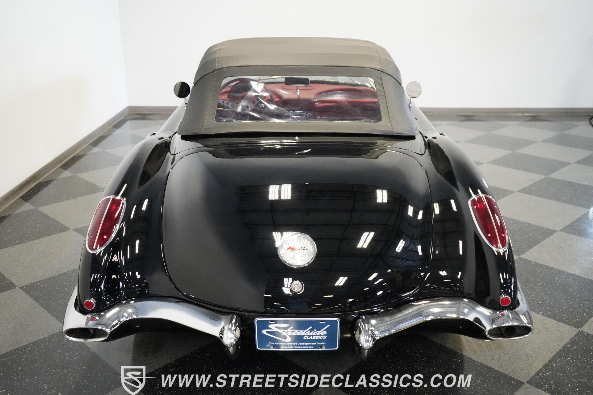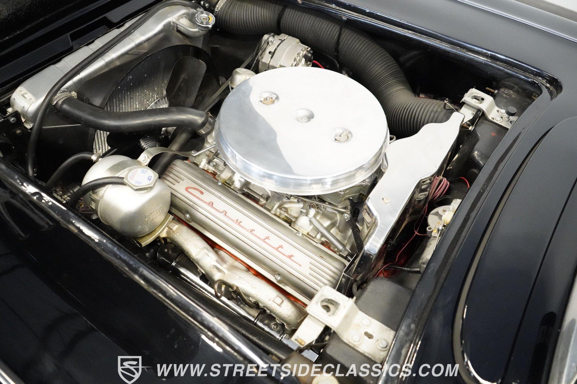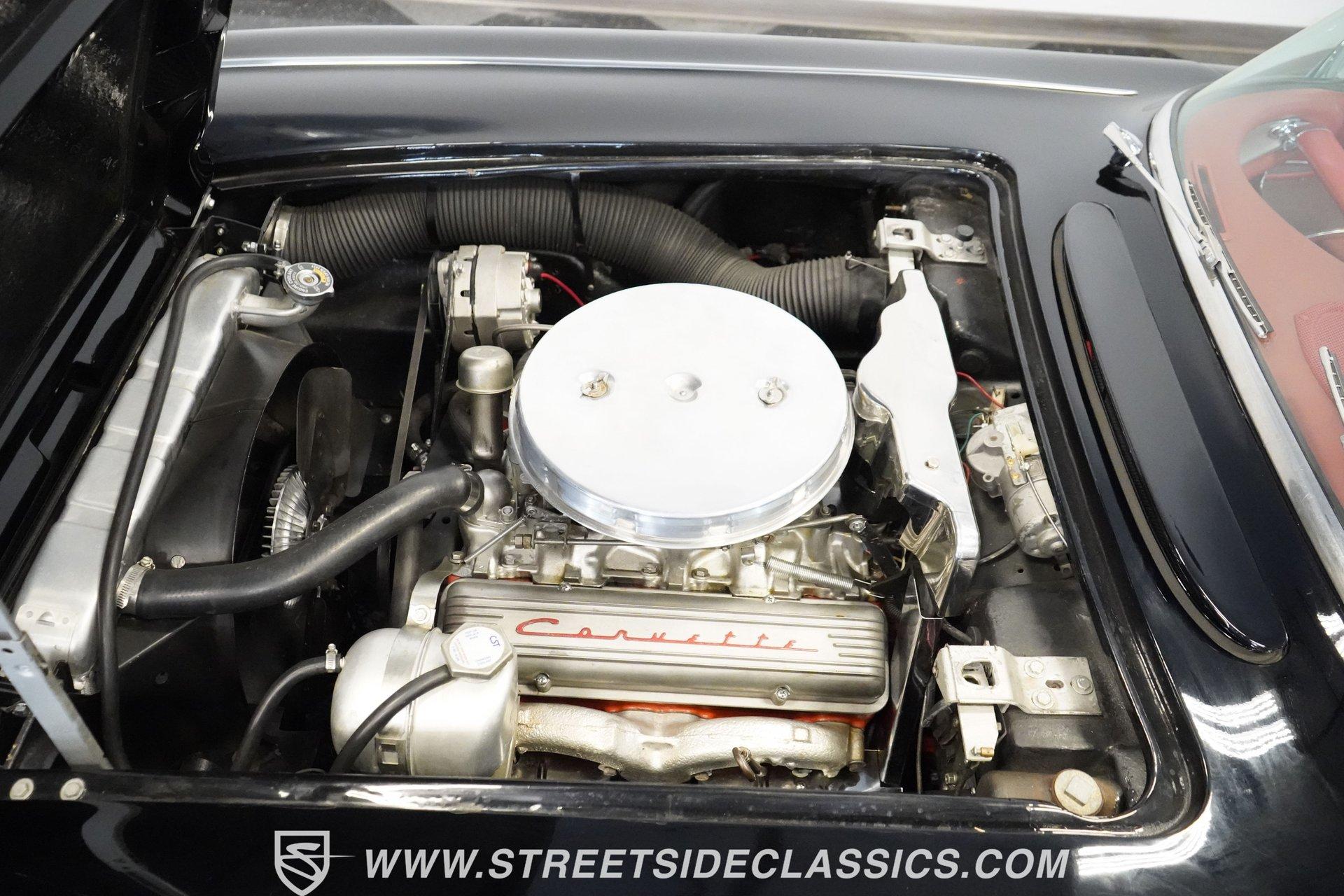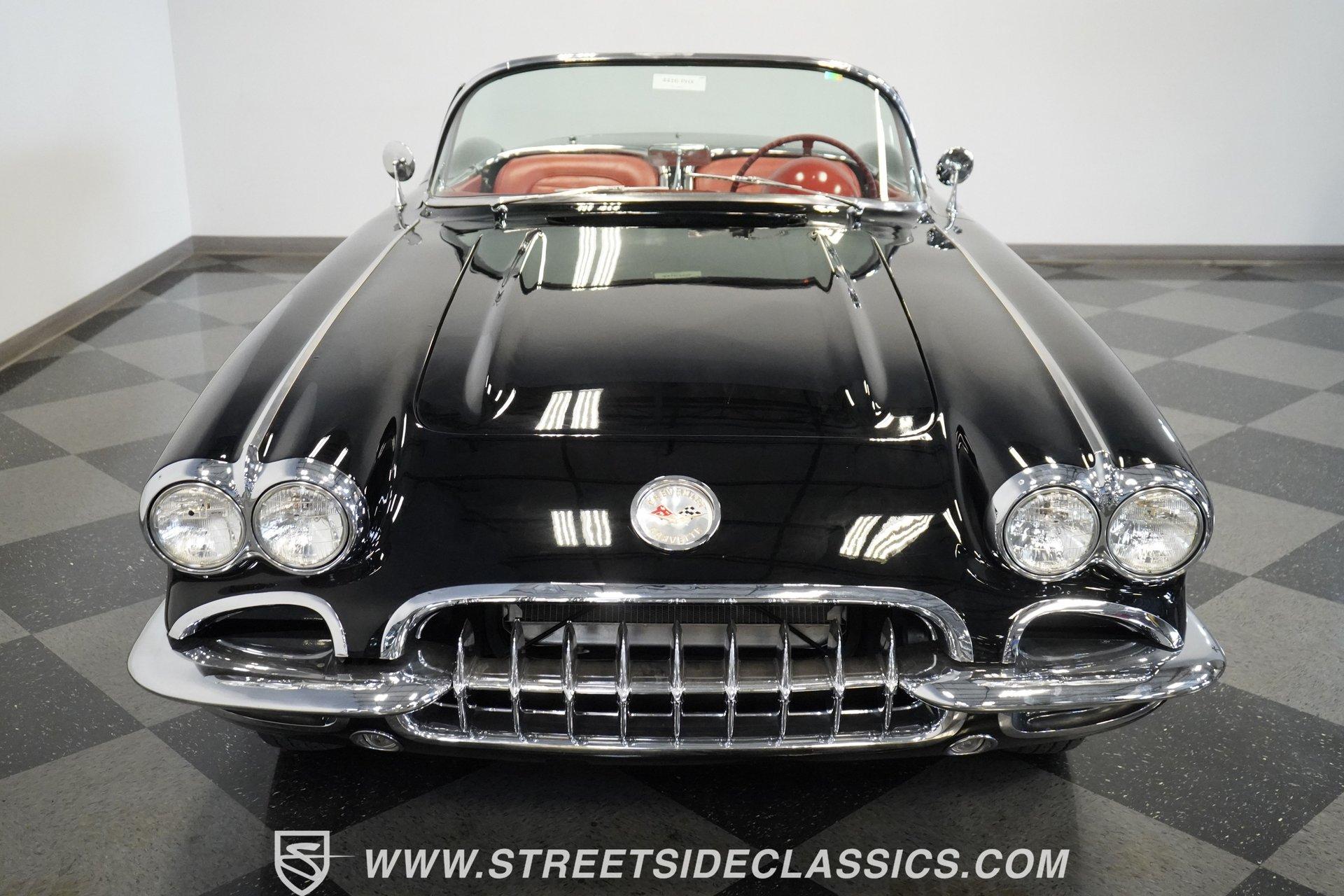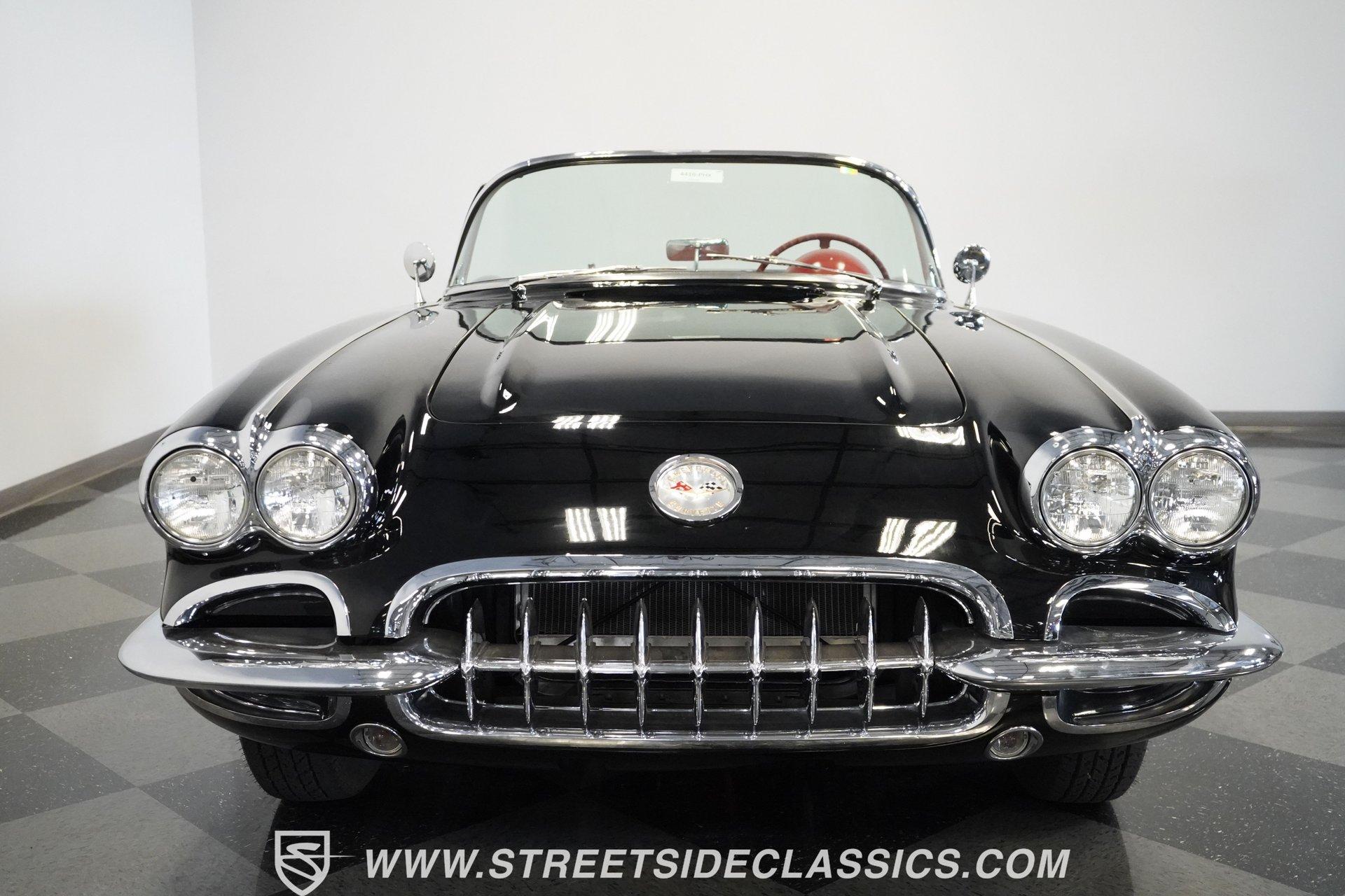 In 1959, Chevrolet cleaned up some of the Corvette's 1958 affectations, getting rid of the waffled hood and the overdone chrome strips on the trunk. Sales remained steady at 9,670, at the base price was $3,875, up about $300 from the year before. Engines for the 1959 Chevrolet Corvette ranged from the base 283-cubic inch V8, with 230 horsepower, to the Rochester fuel-injected 290-horsepower setup. Door panels were redesigned to increase elbow room, instruments were changed to make them more legible, with tachometers now reading to 7,000rpm. A storage bin was added underneath the passenger's grab bar, which was more padded. Four-speed cars now had a "T" shift handle with positive lockout from reverse gear. This handsome restored Corvette is finished strikingly in Tuxedo Black with Inca Silver cove and a black convertible top. The classic styling is complemented by a set of wide whitewall Coker Classic radial tires that appear period correct, but with enhanced drivability. The red interior pops against the Black exterior color and is restored to stock specifications, including the optional factory Wonderbar signal-seeking radio. HIGHLIGHTS: 283 V-8 engine 4-Speed manual transmission Factory 2 4-barrel carburetors Coker Classic wide whitewall radial tires Optional factory Wonderbar radio Fully restored and in excellent condition Desirable Tuxedo Black with Inca Silver cove Red interior Correct spinner wheel covers Hurst shifter Black convertible top Red interior Under the hood is an authentic appearing 283 cubic-inch V8 with optional dual Carter 4-barrel carburetors paired with a 4-speed manual transmission with a Hurst shifter that makes this classic Corvette a pleasure to drive. A pioneering automobile and an icon of American culture, the first-generation Chevrolet Corvette is one of those rare machines that transcends the world of collector cars, drawing in and winning over all who lay eyes on it. A model as usable as it is historically significant, this 1959 Chevrolet Corvette would be just as at home cruising to "cars and coffee" events as it would serving as the cornerstone of a serious collection of American muscle. Call today!