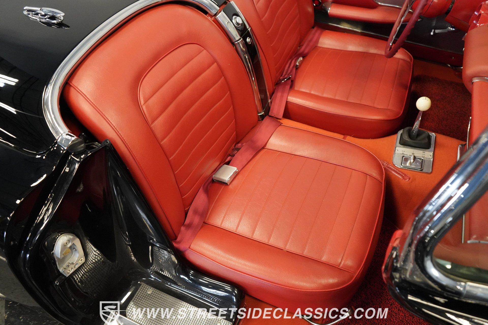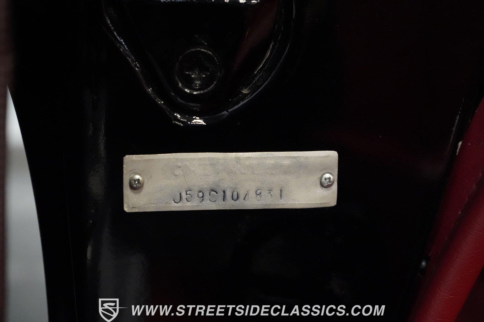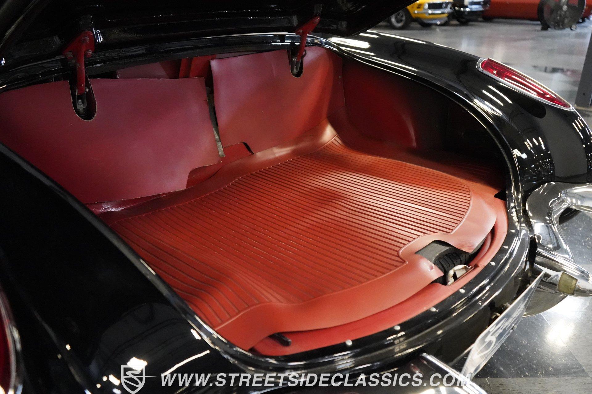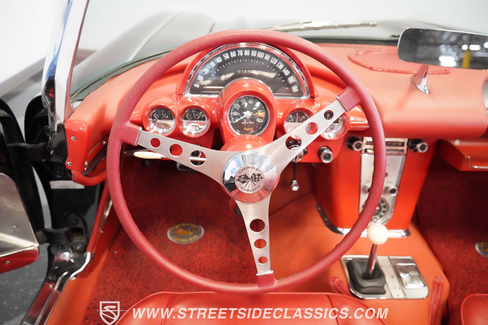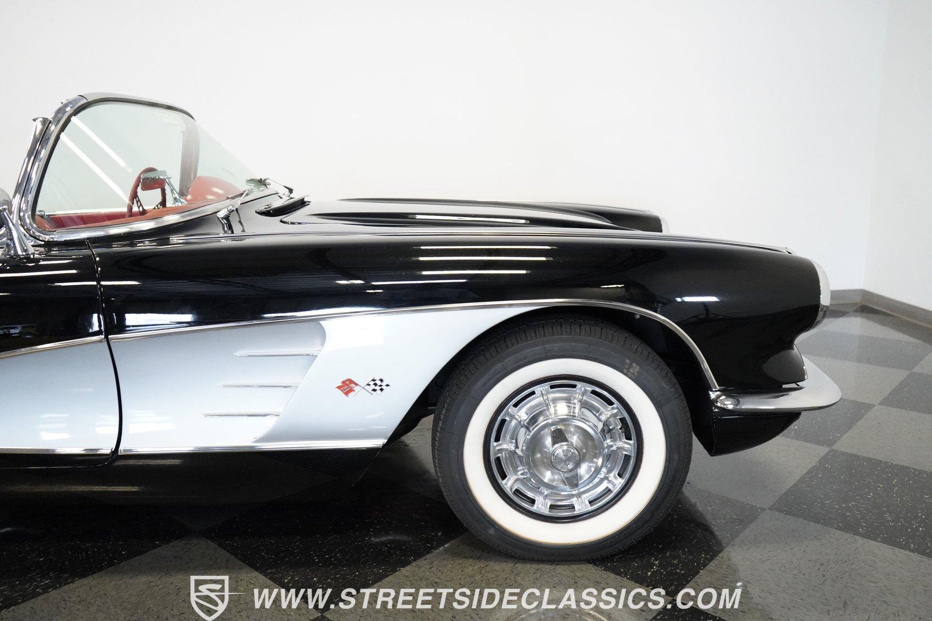 In 1959, Chevrolet cleaned up some of the Corvette's 1958 affectations, getting rid of the waffled hood and the overdone chrome strips on the trunk. Sales remained steady at 9,670, at the base price was $3,875, up about $300 from the year before. Engines for the 1959 Chevrolet Corvette ranged from the base 283-cubic inch V8, with 230 horsepower, to the Rochester fuel-injected 290-horsepower setup. Door panels were redesigned to increase elbow room, instruments were changed to make them more legible, with tachometers now reading to 7,000rpm. A storage bin was added underneath the passenger's grab bar, which was more padded. Four-speed cars now had a "T" shift handle with positive lockout from reverse gear. This handsome restored Corvette is finished strikingly in Tuxedo Black with Inca Silver cove and a black convertible top. The classic styling is complemented by a set of wide whitewall Coker Classic radial tires that appear period correct, but with enhanced drivability. The red interior pops against the Black exterior color and is restored to stock specifications, including the optional factory Wonderbar signal-seeking radio. HIGHLIGHTS: 283 V-8 engine 4-Speed manual transmission Factory 2 4-barrel carburetors Coker Classic wide whitewall radial tires Optional factory Wonderbar radio Fully restored and in excellent condition Desirable Tuxedo Black with Inca Silver cove Red interior Correct spinner wheel covers Hurst shifter Black convertible top Red interior Under the hood is an authentic appearing 283 cubic-inch V8 with optional dual Carter 4-barrel carburetors paired with a 4-speed manual transmission with a Hurst shifter that makes this classic Corvette a pleasure to drive. A pioneering automobile and an icon of American culture, the first-generation Chevrolet Corvette is one of those rare machines that transcends the world of collector cars, drawing in and winning over all who lay eyes on it. A model as usable as it is historically significant, this 1959 Chevrolet Corvette would be just as at home cruising to "cars and coffee" events as it would serving as the cornerstone of a serious collection of American muscle. Call today!