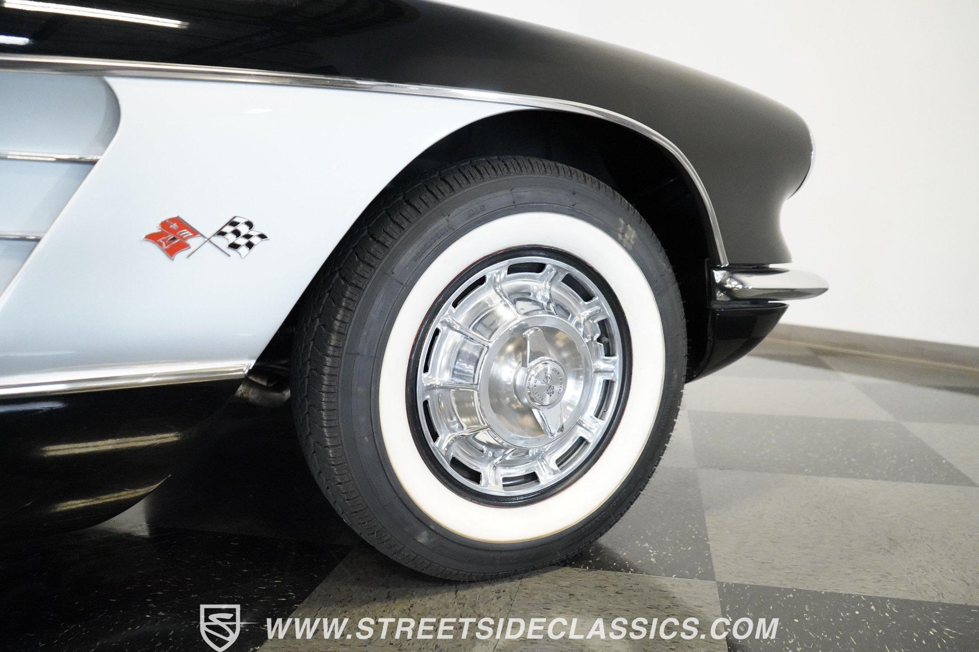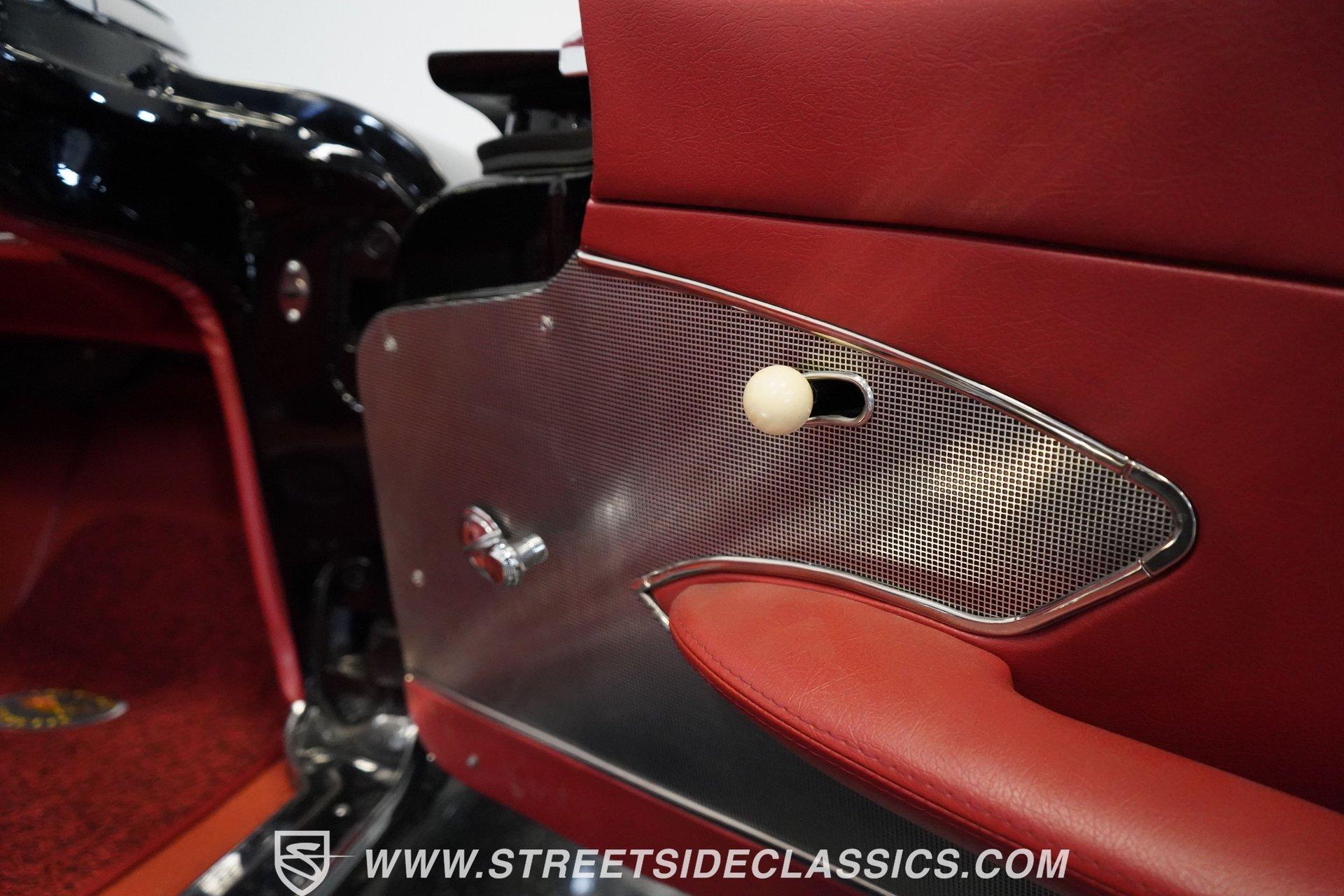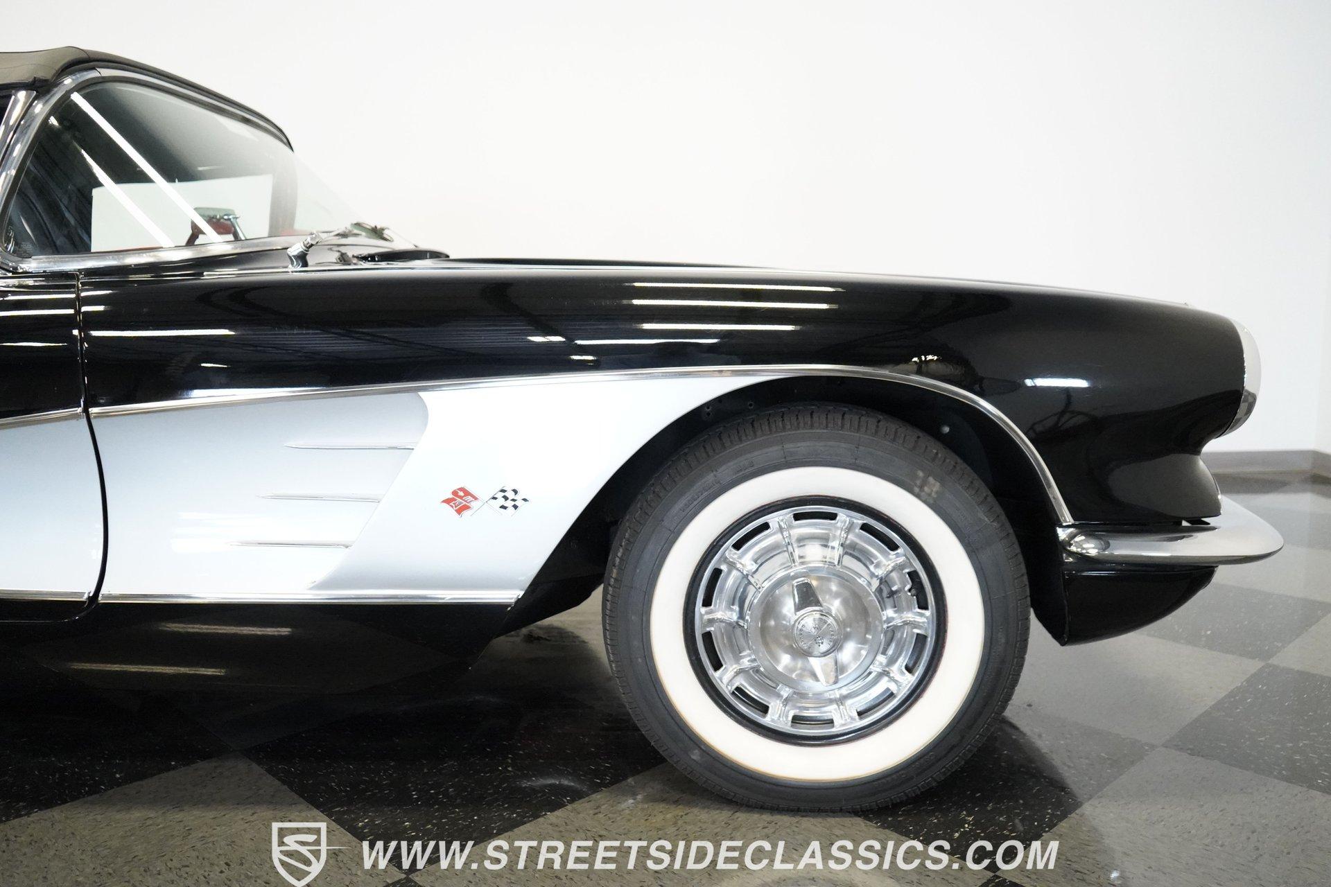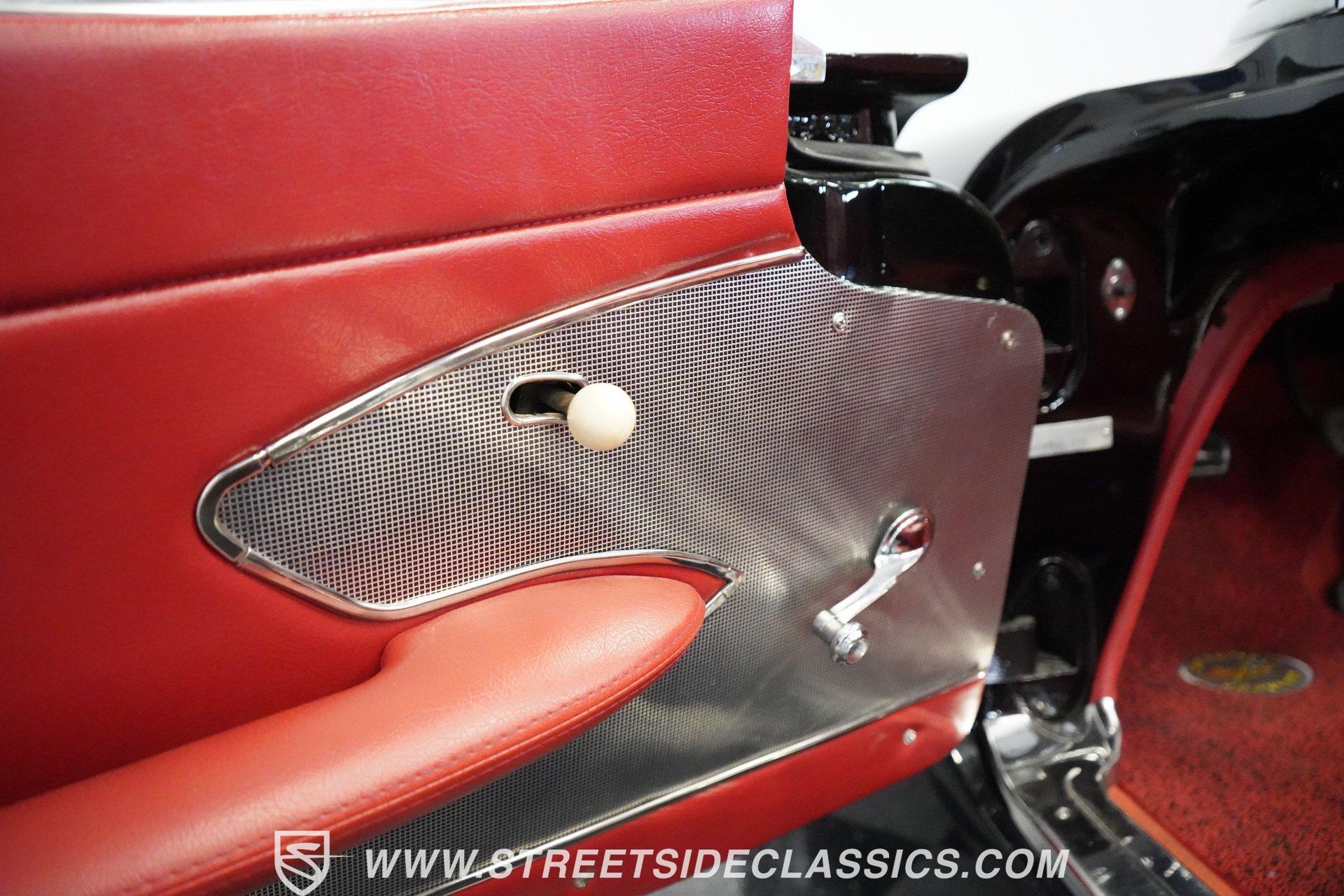 In 1959, Chevrolet cleaned up some of the Corvette's 1958 affectations, getting rid of the waffled hood and the overdone chrome strips on the trunk. Sales remained steady at 9,670, at the base price was $3,875, up about $300 from the year before. Engines for the 1959 Chevrolet Corvette ranged from the base 283-cubic inch V8, with 230 horsepower, to the Rochester fuel-injected 290-horsepower setup. Door panels were redesigned to increase elbow room, instruments were changed to make them more legible, with tachometers now reading to 7,000rpm. A storage bin was added underneath the passenger's grab bar, which was more padded. Four-speed cars now had a "T" shift handle with positive lockout from reverse gear. This handsome restored Corvette is finished strikingly in Tuxedo Black with Inca Silver cove and a black convertible top. The classic styling is complemented by a set of wide whitewall Coker Classic radial tires that appear period correct, but with enhanced drivability. The red interior pops against the Black exterior color and is restored to stock specifications, including the optional factory Wonderbar signal-seeking radio. HIGHLIGHTS: 283 V-8 engine 4-Speed manual transmission Factory 2 4-barrel carburetors Coker Classic wide whitewall radial tires Optional factory Wonderbar radio Fully restored and in excellent condition Desirable Tuxedo Black with Inca Silver cove Red interior Correct spinner wheel covers Hurst shifter Black convertible top Red interior Under the hood is an authentic appearing 283 cubic-inch V8 with optional dual Carter 4-barrel carburetors paired with a 4-speed manual transmission with a Hurst shifter that makes this classic Corvette a pleasure to drive. A pioneering automobile and an icon of American culture, the first-generation Chevrolet Corvette is one of those rare machines that transcends the world of collector cars, drawing in and winning over all who lay eyes on it. A model as usable as it is historically significant, this 1959 Chevrolet Corvette would be just as at home cruising to "cars and coffee" events as it would serving as the cornerstone of a serious collection of American muscle. Call today!