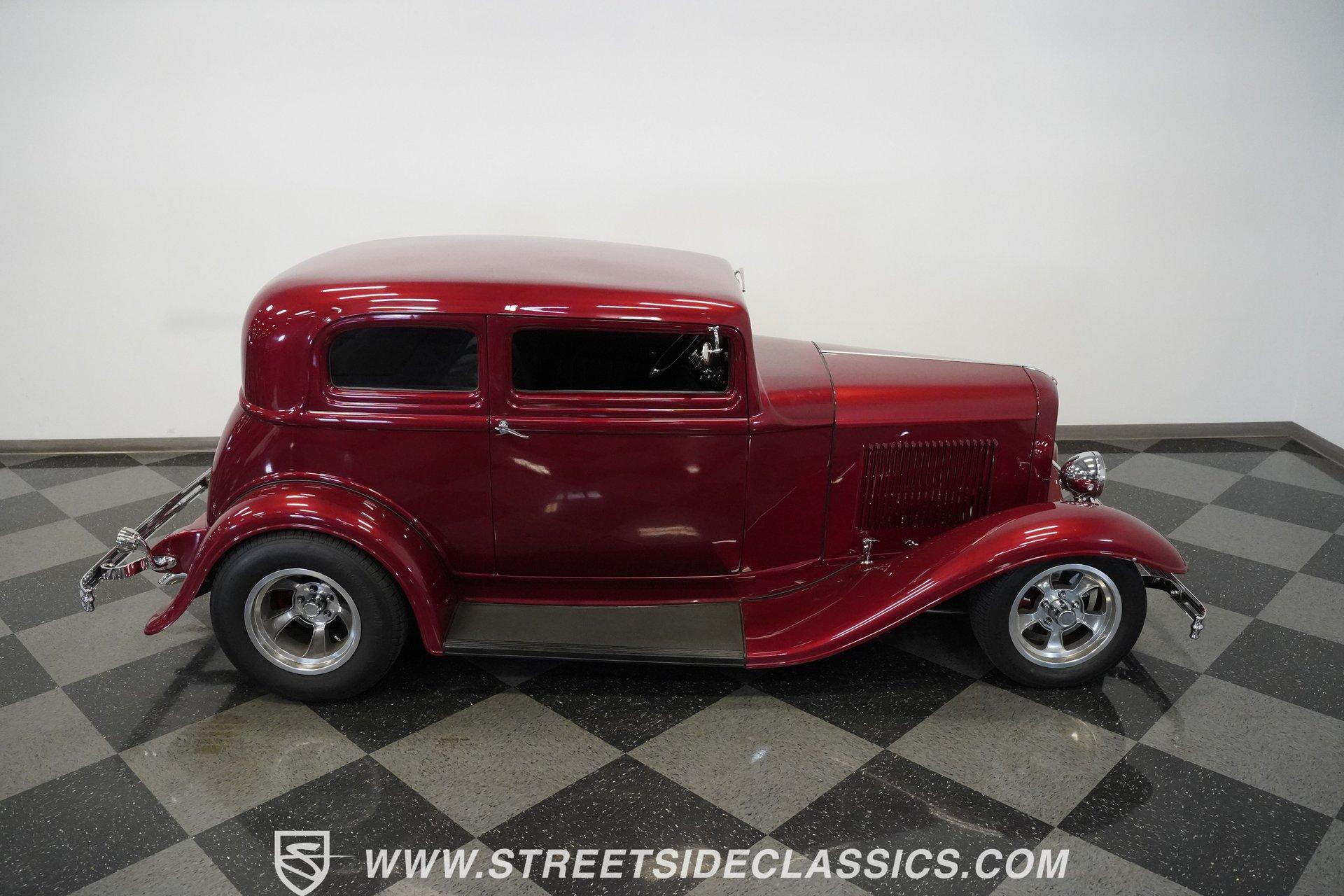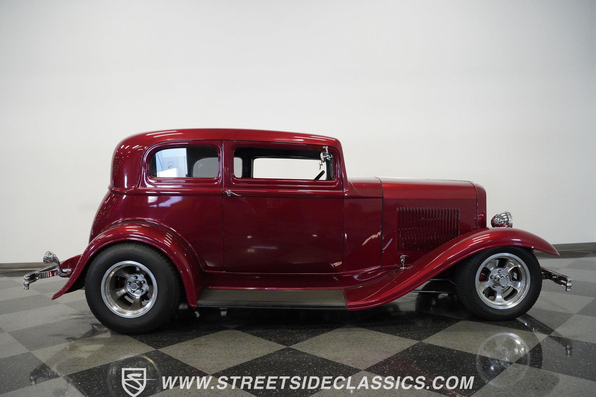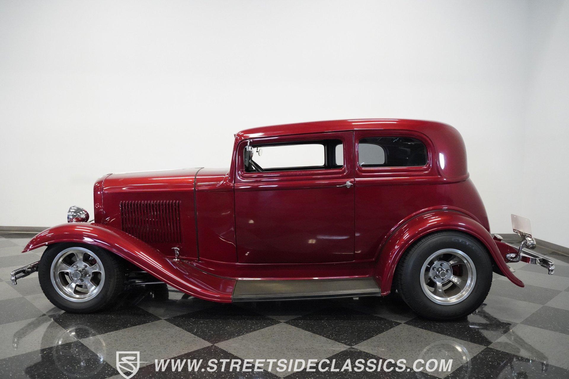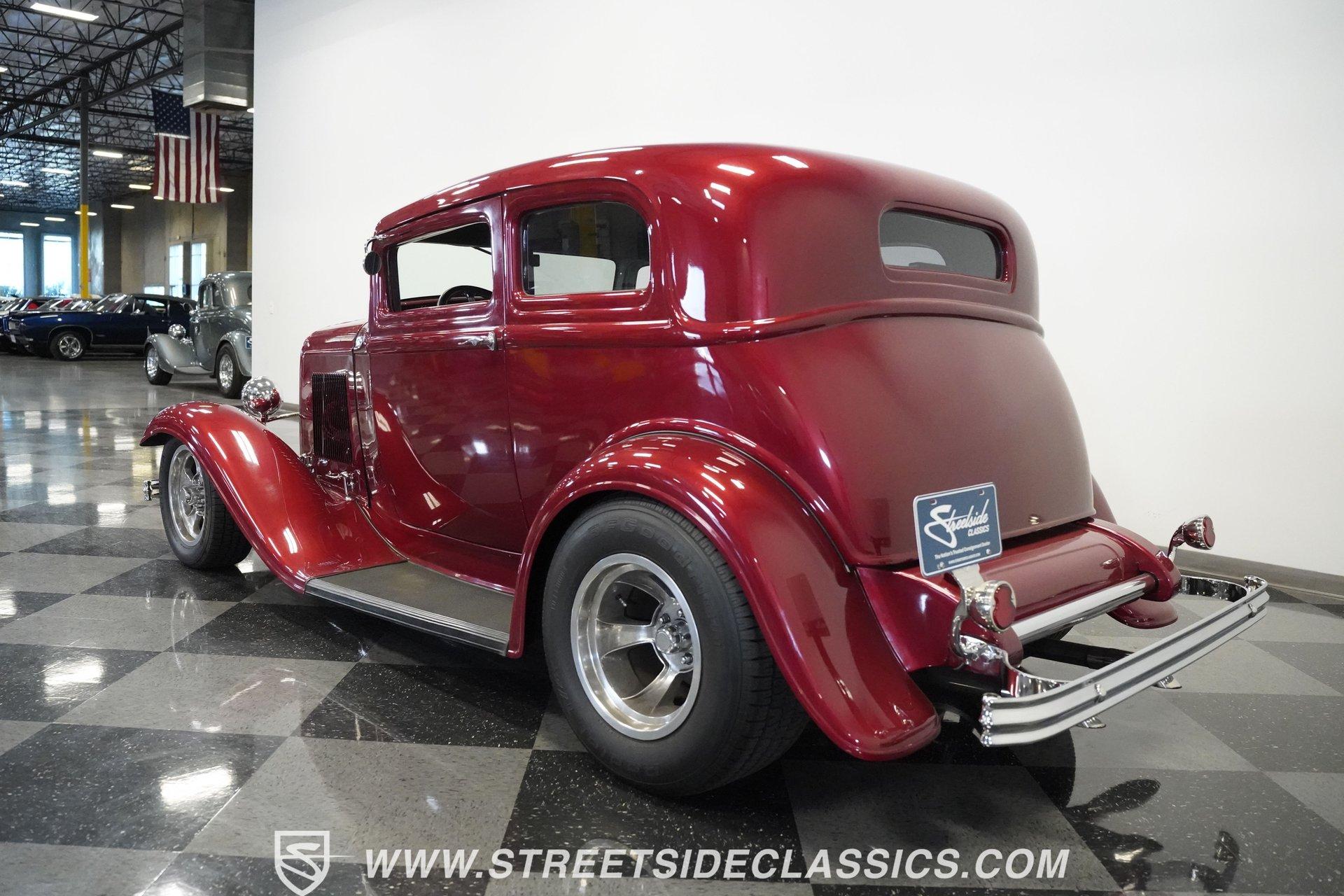 Glass construction gives exceptional strength while maintaining the classic lines of this 1932 Ford Victoria, dressed in burgundy paint that shows off every curve of its body. The stance is low and aggressive, with the perfect hot rod rake achieved through custom suspension. Aluminum wheels measuring 15 inches on all corners provide the perfect foundation, with BFG Radial TA tires sized 205/60R15 up front and wider 275/60R15 in back for that classic hot rod look. The front grille and headlights remain faithful to the original design, while chrome bumpers front and rear add a finished touch to this glass-bodied cruiser. The dark gray vinyl interior offers a clean look without excessive flash. Front bucket seats and a rear bench provide comfortable seating for passengers. The dash is painted to match the exterior, creating a unified appearance throughout. A Grant chrome steering wheel offers a touch of class, complemented by the column shifter for easy gear selection. The center console adds storage and style, while power windows provide modern functionality. Clean carpet and mats cover the floor, and the headliner remains in excellent condition. For added safety, a fire extinguisher is mounted under the dash. Powering this Victoria is a Ford 302 cubic inch V8 engine equipped with dual Edelbrock 4-barrel carburetors on an Edelbrock intake manifold. The engine pairs with a 4-speed AOD automatic transmission, making for easy cruising at any speed. The suspension consists of an I-beam front with coil springs and shocks, while the rear uses a solid axle with a 4-link setup and coil-overs for improved handling. A Ford 9-inch rear end puts the power to the pavement. Four-wheel power disc brakes provide excellent stopping ability, and the dual exhaust with Flowmaster mufflers and shorty headers produces a proper V8 sound. HIGHLIGHTS: 302 V8 Engine Dual Edelbrock 4-Barrel Carburetors Edelbrock Intake Manifold 4-Speed AOD Automatic Transmission Ford 9-inch Rear End 4-Wheel Power Disc Brakes I-Beam Front Suspension with Coil Springs 4-Link Rear Suspension with Coil-Overs Dual Exhaust Flowmaster Mufflers Shorty Headers Burgundy Paint 15" Aluminum Wheels 205/60R15 Front, 275/60R15 Rear BFG Radial TA Tires Glass Body Construction Chrome Front and Rear Bumpers Dark Gray Interior with Bucket Front Seats Bench Rear Seat Power Windows Grant Chrome Steering Wheel Column Shifter Center Console Color-Matched Dashboard Fire Extinguisher Ford styling and modern V8 power come together in this 1932 Victoria. The glass body, custom suspension, and 302 cubic inch engine make for a hot rod that's as fun to drive as it is to look at. Burgundy paint and gray interior create a tough, no-nonsense appearance. Call today!