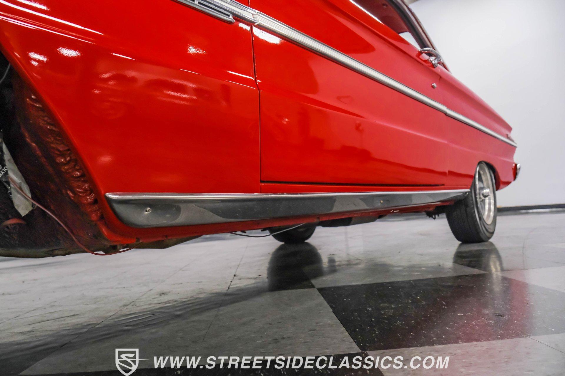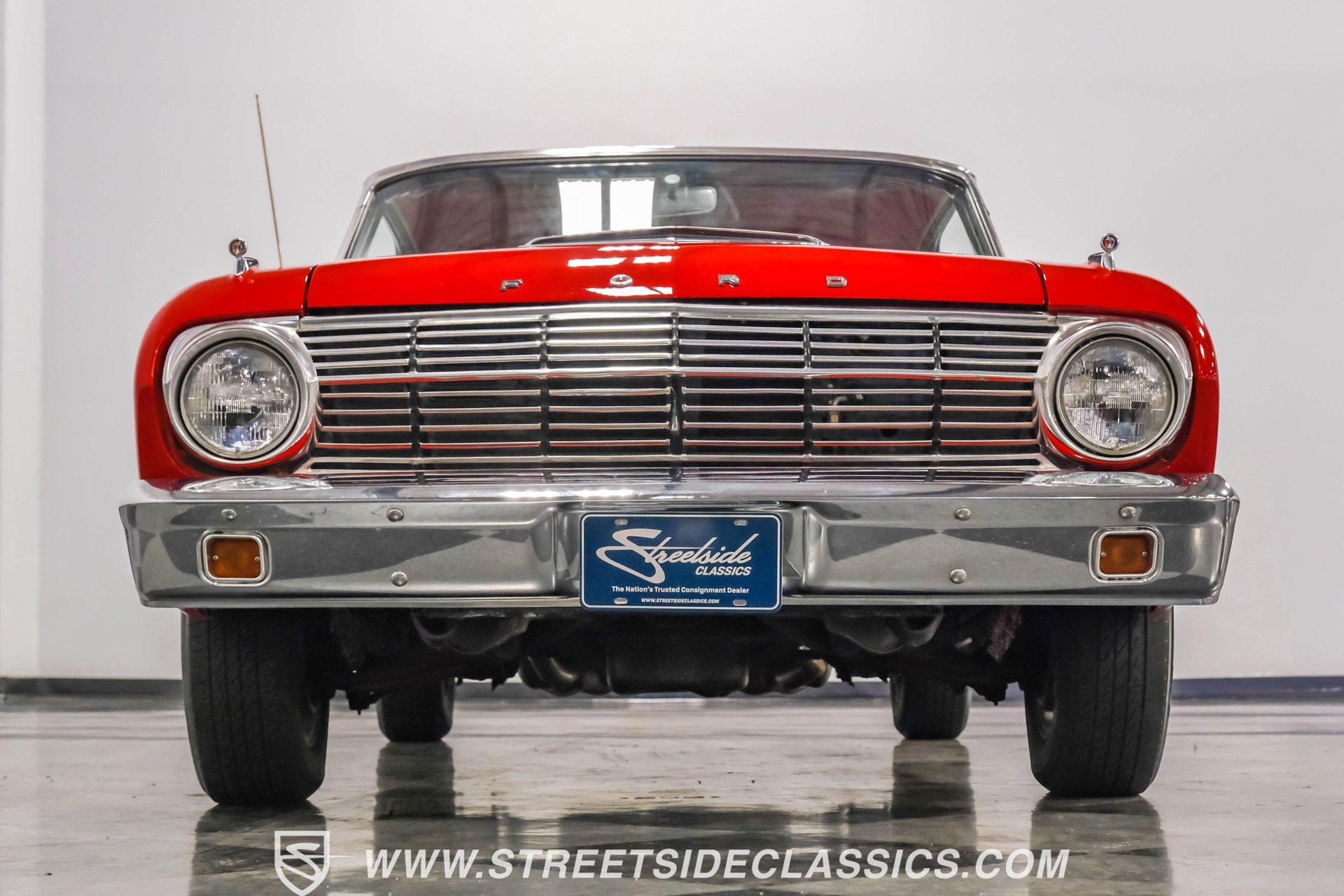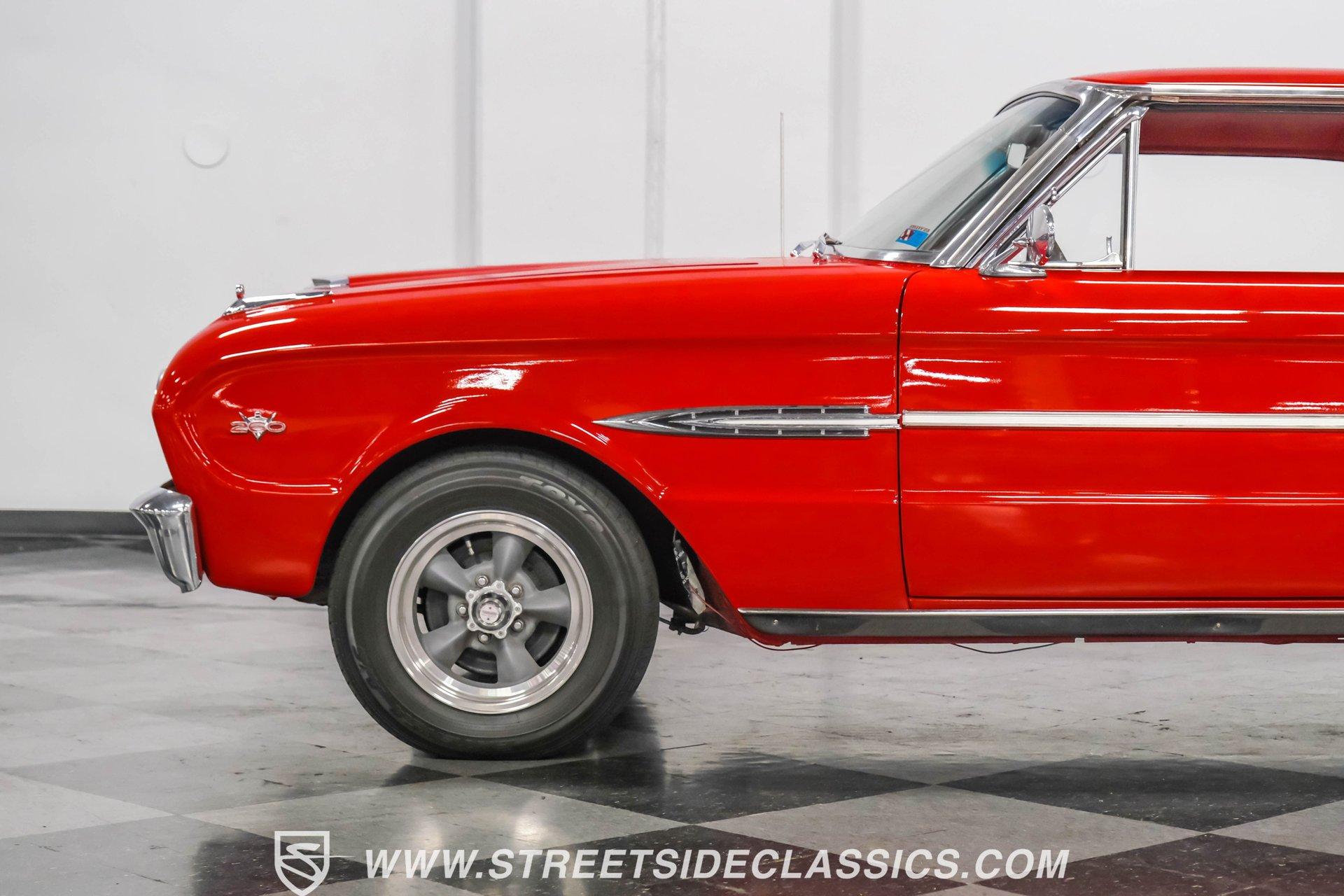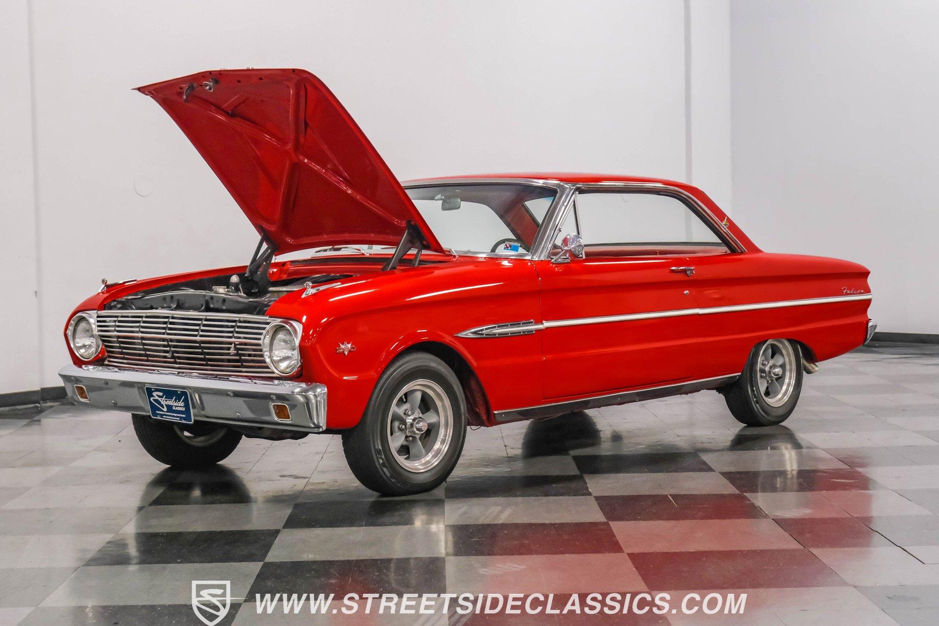 Red paint gives this 1963 Ford Falcon Futura a bold look. The compact body features crisp lines and well-proportioned dimensions, accented by bright chrome trim that runs along the sides. Both front and rear chrome bumpers remain in excellent condition, framing the car nicely. The original front grille shows quality preservation, maintaining factory authenticity. Sitting on 14" American Racing wheels wrapped in 185/75R14 Toyo tires, this Falcon has an improved stance while maintaining its classic appeal. Red vinyl upholstery creates a perfect color-matched interior that complements the exterior perfectly. Comfortable bucket seats offer good support, while the middle console adds both style and function with integrated cup holders. The dash retains its factory gauge cluster and stock knobs, giving a period-correct appearance. A woodgrain steering wheel adds a touch of class to the driving experience. The original AM radio remains in place for authenticity, while an underdash DUAL brand AM/FM/AUX/BT radio with USB ports provides modern audio options. A 289 cubic inch V8 engine gives this Falcon impressive acceleration. The motor is fed by a Holley 4-barrel carburetor and breathes through long tube headers connected to a dual FlowMaster exhaust system. An aluminum Northern radiator with an electric fan keeps everything running cool. Power flows through a C4 3-speed automatic transmission for effortless cruising. The suspension system features front coil springs with shocks and sway bar, complemented by a solid rear axle with leaf springs and 8" rear end. HIGHLIGHTS: 289 V8 Engine C4 3-Speed Automatic Transmission Holley 4-Barrel Carburetor Long Tube Headers Dual FlowMaster Exhaust 8" Rear Axle Aluminum Northern Radiator with Electric Fan Front Coil Springs with Sway Bar and Shocks Red Paint Front and Rear Chrome Bumpers 14" American Racing Wheels in 185/75R14 Toyo Tires Red Interior with Bucket Seats Center Console with Cup Holders Wood Rim Steering Wheel Factory Gauges DUAL Brand AM/FM/AUX/BT Radio Compact yet powerful, the 1963 Ford Falcon Futura combines V8 muscle with manageable size. Its red-on-red color scheme, bucket seat interior, and performance upgrades make for an enjoyable classic driving experience without excessive bulk or weight. Call today!