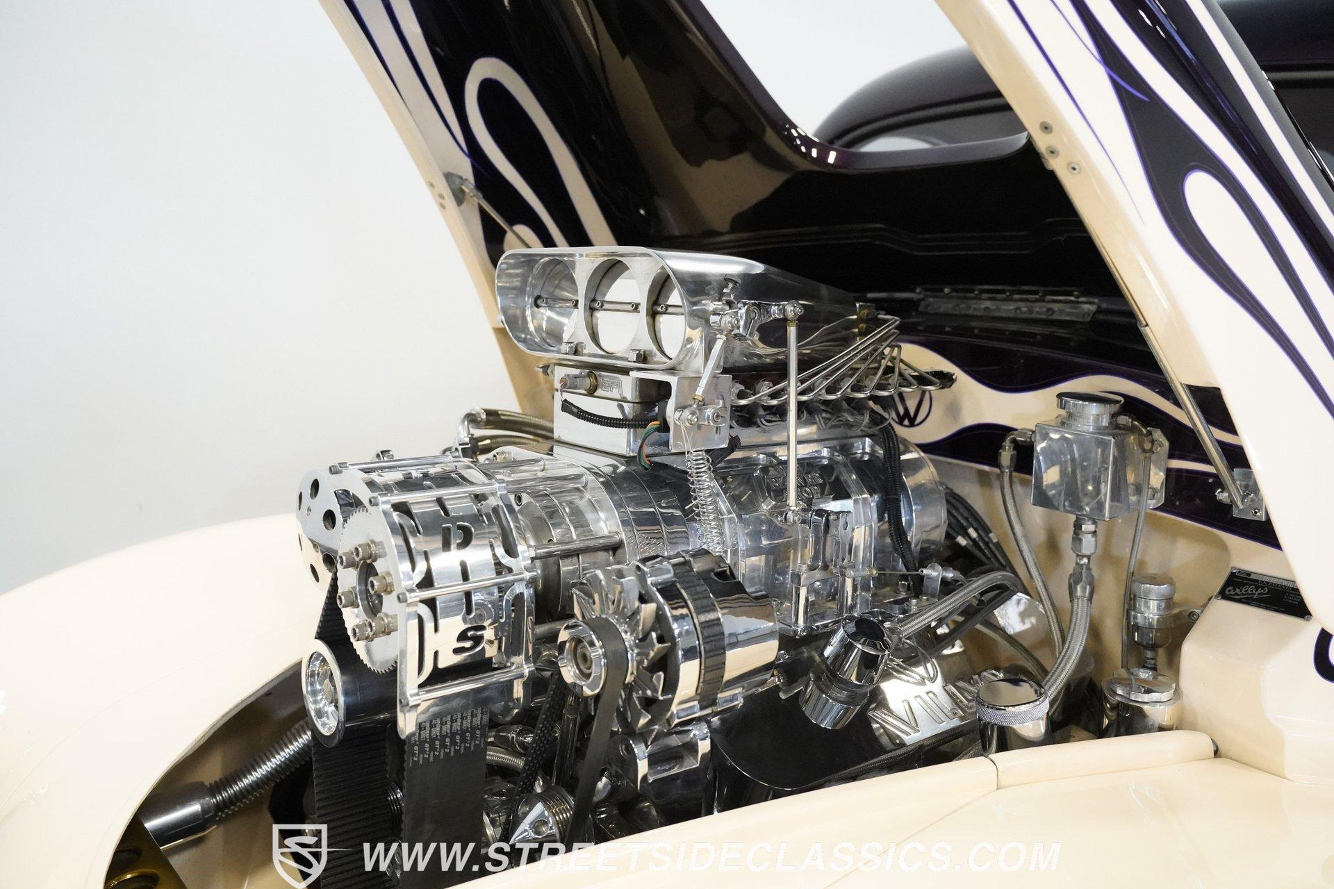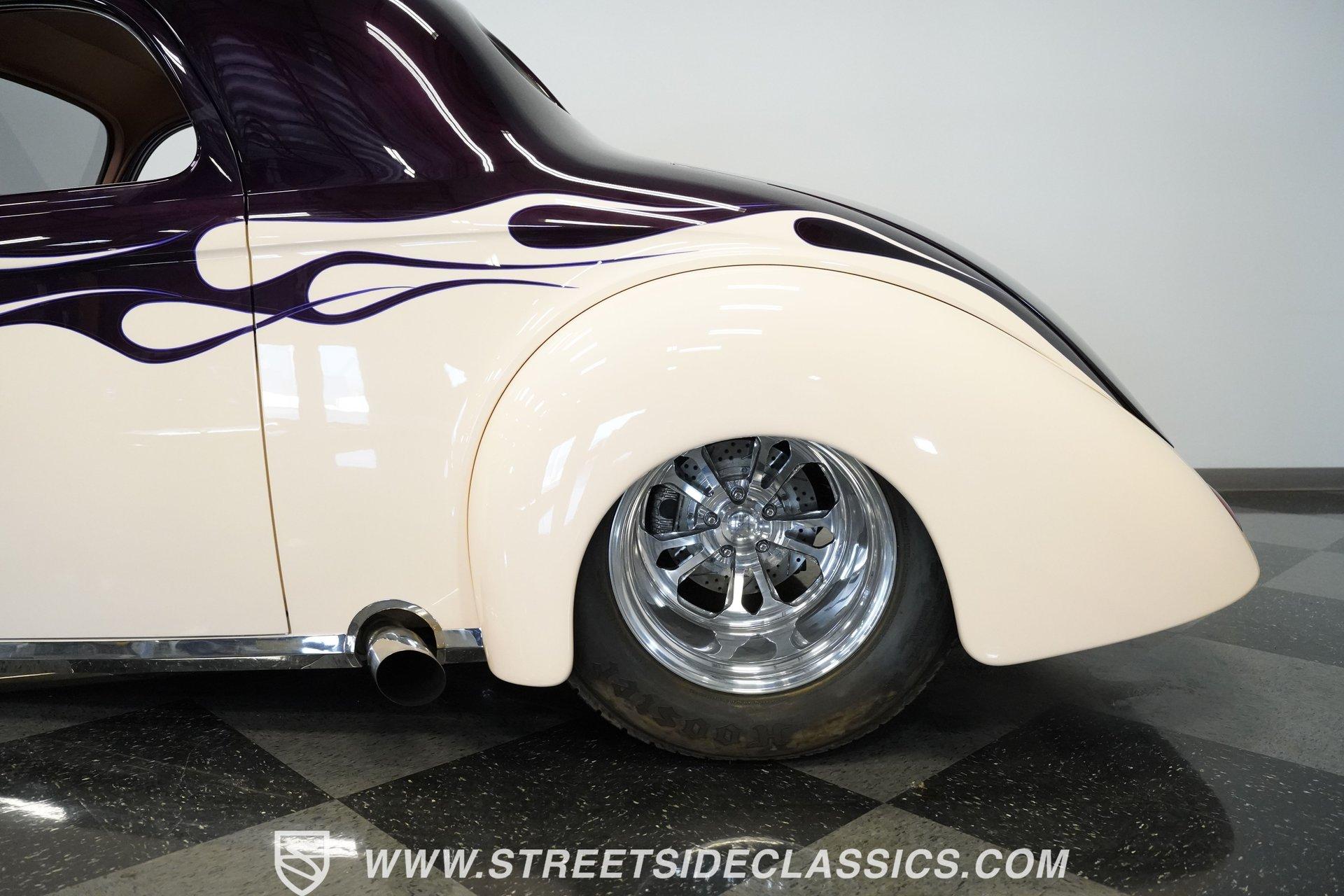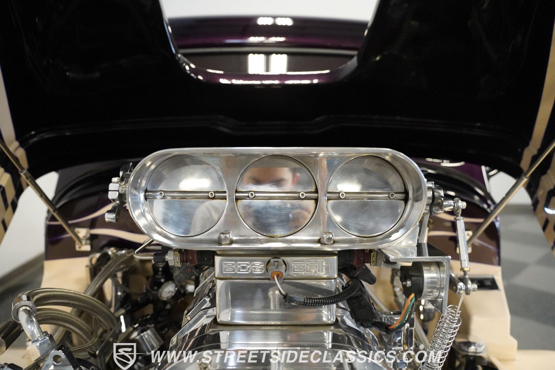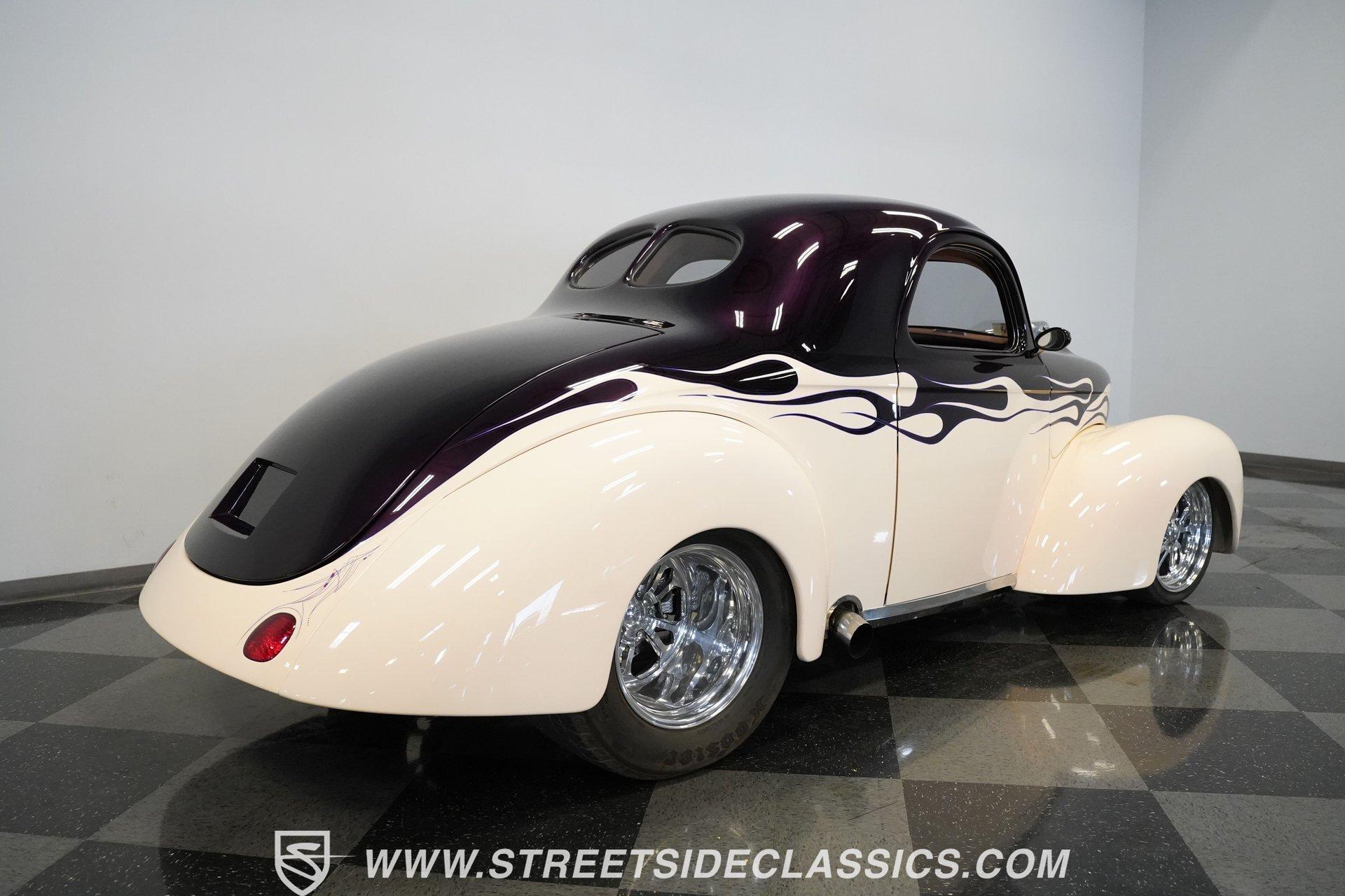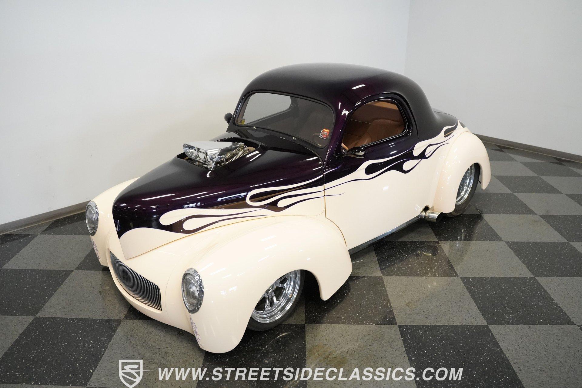 Finished in 2014 after a 5-year build, the 1941 Willys Coupe features an Outlaw fiberglass body adorned in a striking two-tone paint scheme. Deep plum candy and Sweet Georgia peach pearl colors flow across the curves, complemented by expert hand pinstriping and a white gold leaf hood logo. Six layers of base and six coats of clear create remarkable depth after wet sanding between each application. The dual side-exit exhaust adds aggressive visual appeal, while the 17" Aluminum Budnick wheels wrapped in 215/40R17 front and massive 31x16.50R17 rear tires give the Willys its perfect stance. The coral European leather interior continues the custom theme with meticulous attention to detail. Comfortable bucket seats provide excellent support, complemented by a full-length floor console upholstered to match. The custom-painted dash features flames that echo the exterior design, while white-face Dolphin analog gauges display vital information. The billet shifter rises from the center console, accompanied by matching billet pedals. A chrome tilt column topped with a Budnick chrome wheel completes the control setup, and even the trunk receives matching upholstery treatment. The massive 502 cubic inch V8 engine dominates the engine bay, topped with a BDS 871 supercharger and Fast fuel injection system utilizing 16 injectors. Edelbrock aluminum heads enhance performance, while Sanderson long-tube headers feed into glasspack-style mufflers on the side pipes. All this power channels through a TH400 3-speed automatic transmission to a 9-inch rear end with 3.70 gears. The full Outlaw chassis features independent front suspension with tubular control arms, rack and pinion steering, and a four-link rear with Z-bar. Air ride suspension allows adjustable height, while four-wheel disc brakes with drilled and slotted rotors provide stopping power.