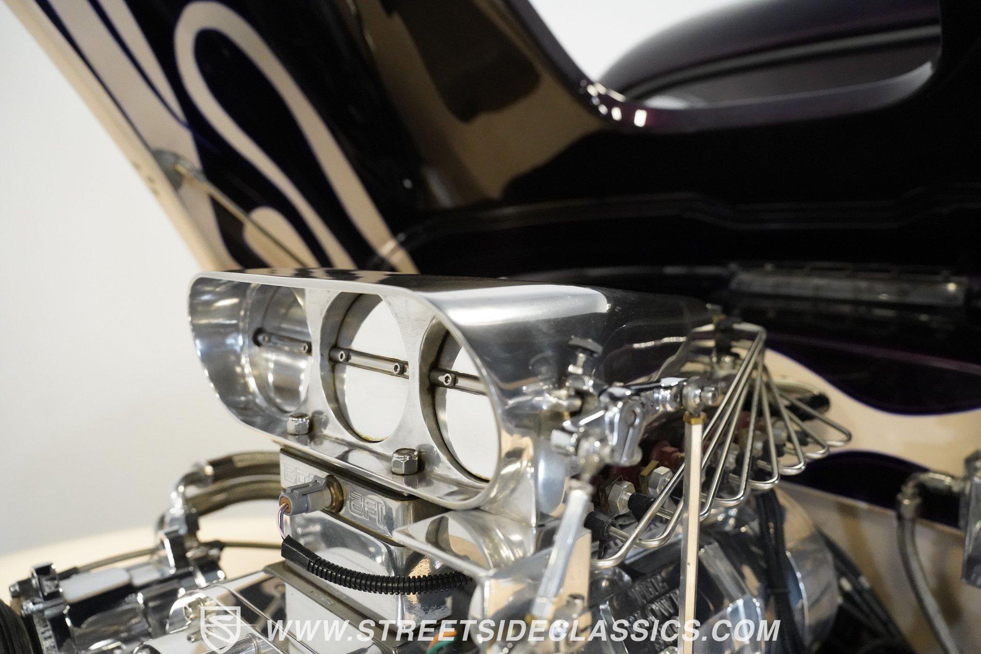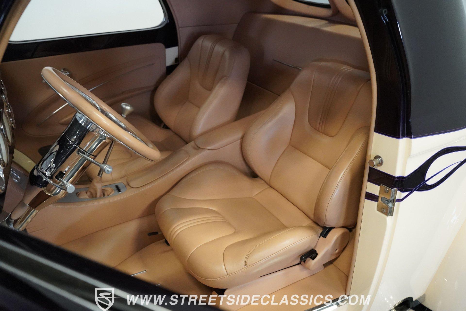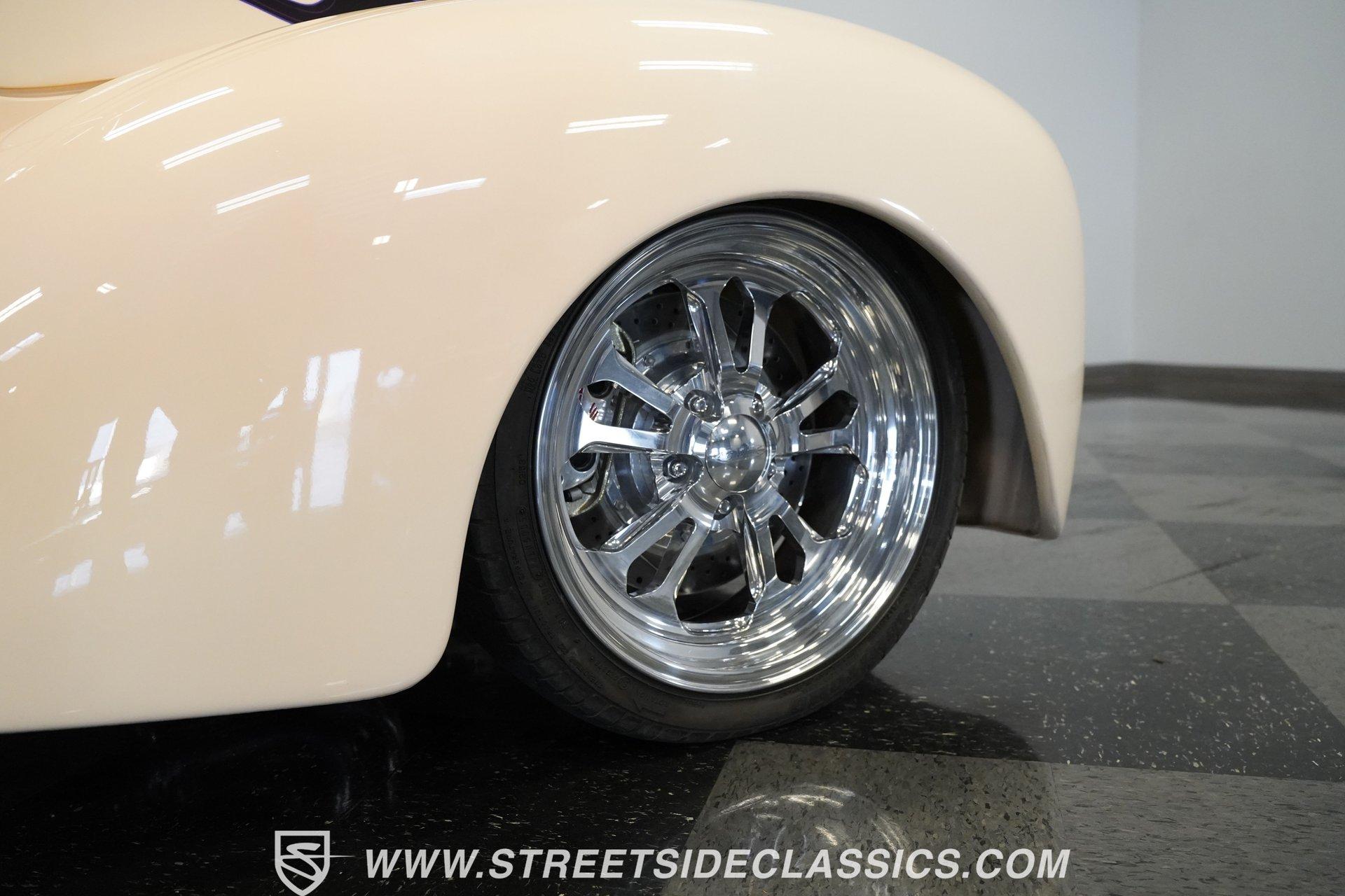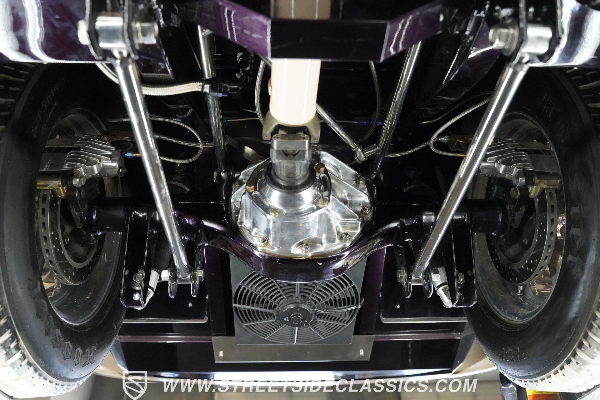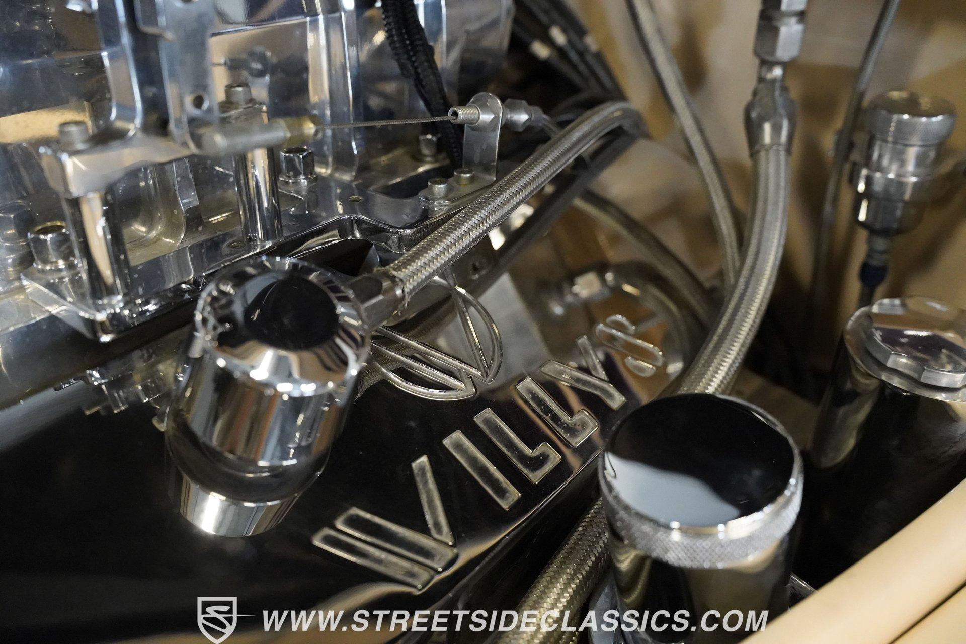 Finished in 2014 after a 5-year build, the 1941 Willys Coupe features an Outlaw fiberglass body adorned in a striking two-tone paint scheme. Deep plum candy and Sweet Georgia peach pearl colors flow across the curves, complemented by expert hand pinstriping and a white gold leaf hood logo. Six layers of base and six coats of clear create remarkable depth after wet sanding between each application. The dual side-exit exhaust adds aggressive visual appeal, while the 17" Aluminum Budnick wheels wrapped in 215/40R17 front and massive 31x16.50R17 rear tires give the Willys its perfect stance. The coral European leather interior continues the custom theme with meticulous attention to detail. Comfortable bucket seats provide excellent support, complemented by a full-length floor console upholstered to match. The custom-painted dash features flames that echo the exterior design, while white-face Dolphin analog gauges display vital information. The billet shifter rises from the center console, accompanied by matching billet pedals. A chrome tilt column topped with a Budnick chrome wheel completes the control setup, and even the trunk receives matching upholstery treatment. The massive 502 cubic inch V8 engine dominates the engine bay, topped with a BDS 871 supercharger and Fast fuel injection system utilizing 16 injectors. Edelbrock aluminum heads enhance performance, while Sanderson long-tube headers feed into glasspack-style mufflers on the side pipes. All this power channels through a TH400 3-speed automatic transmission to a 9-inch rear end with 3.70 gears. The full Outlaw chassis features independent front suspension with tubular control arms, rack and pinion steering, and a four-link rear with Z-bar. Air ride suspension allows adjustable height, while four-wheel disc brakes with drilled and slotted rotors provide stopping power.
