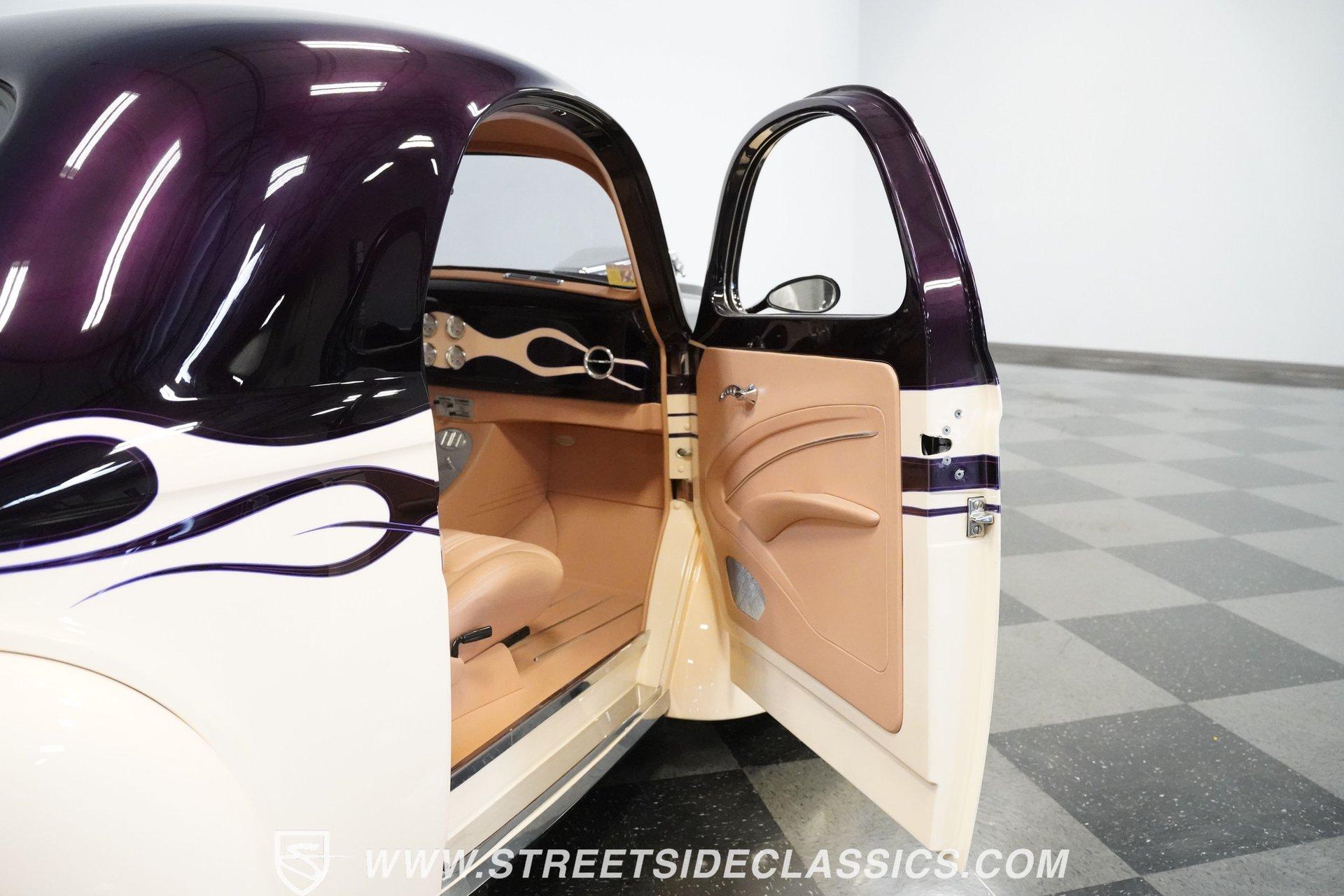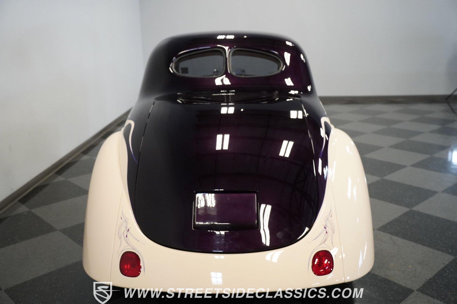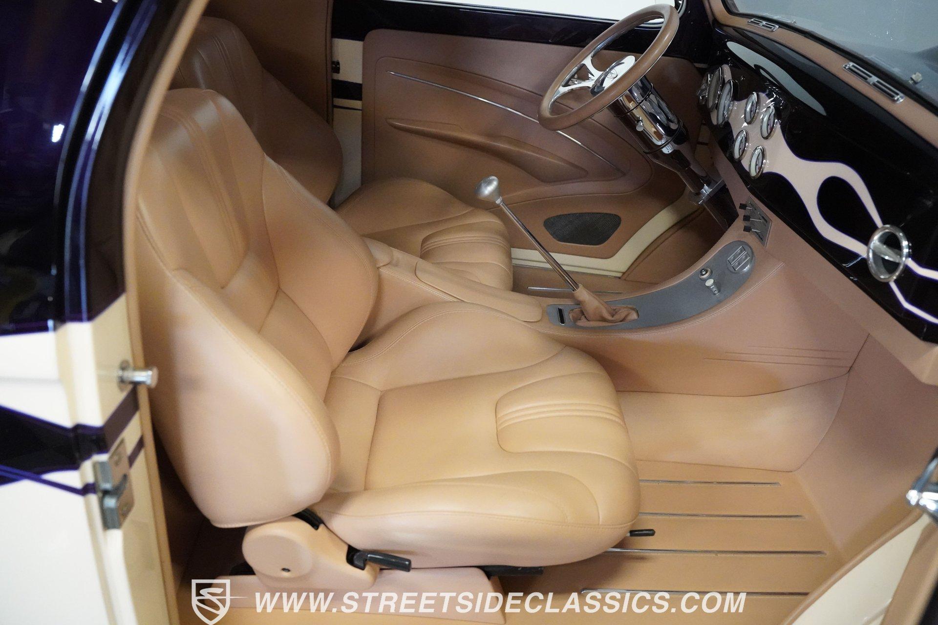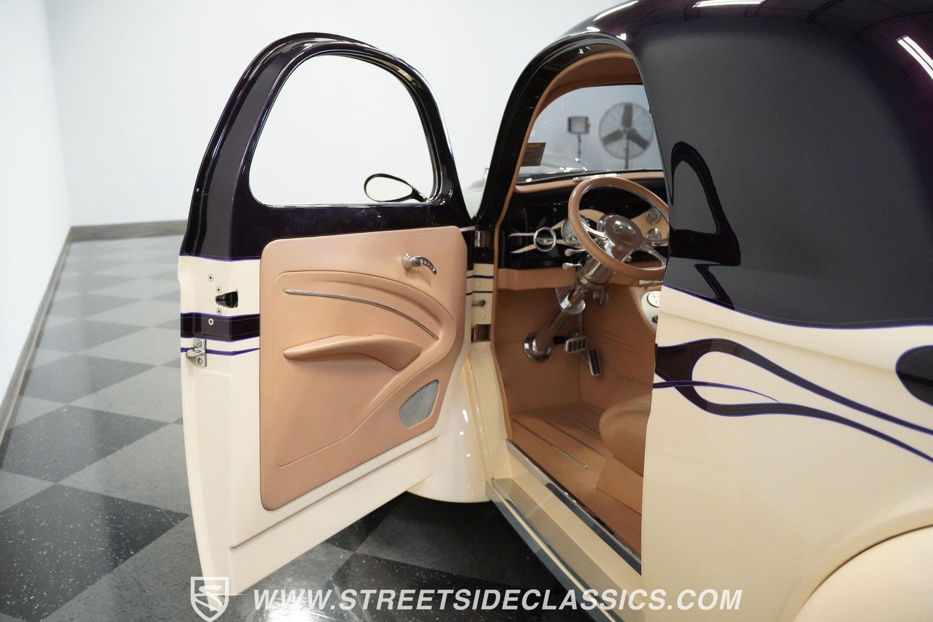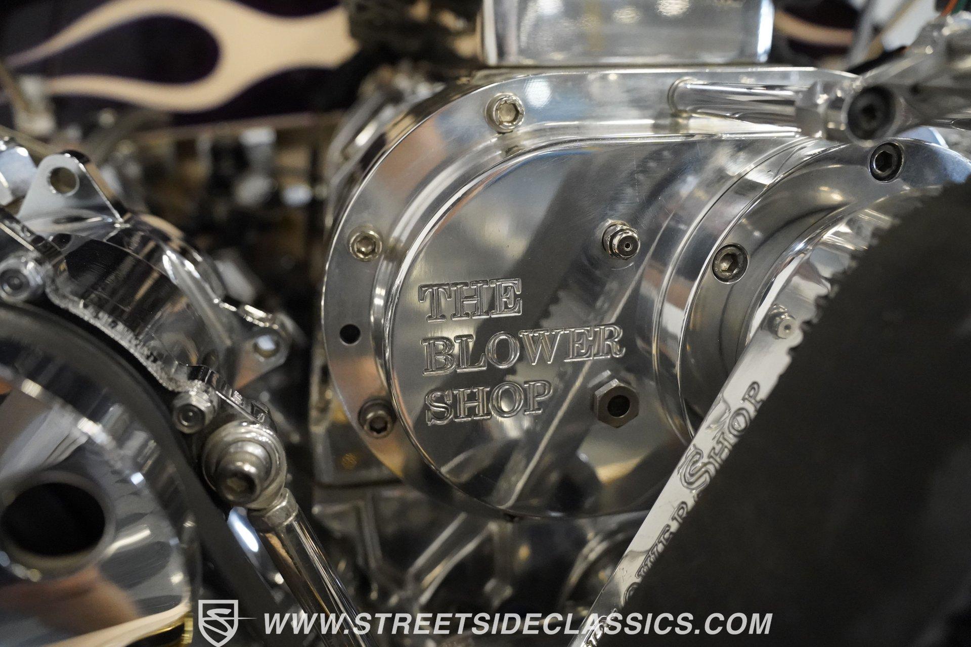 Finished in 2014 after a 5-year build, the 1941 Willys Coupe features an Outlaw fiberglass body adorned in a striking two-tone paint scheme. Deep plum candy and Sweet Georgia peach pearl colors flow across the curves, complemented by expert hand pinstriping and a white gold leaf hood logo. Six layers of base and six coats of clear create remarkable depth after wet sanding between each application. The dual side-exit exhaust adds aggressive visual appeal, while the 17" Aluminum Budnick wheels wrapped in 215/40R17 front and massive 31x16.50R17 rear tires give the Willys its perfect stance. The coral European leather interior continues the custom theme with meticulous attention to detail. Comfortable bucket seats provide excellent support, complemented by a full-length floor console upholstered to match. The custom-painted dash features flames that echo the exterior design, while white-face Dolphin analog gauges display vital information. The billet shifter rises from the center console, accompanied by matching billet pedals. A chrome tilt column topped with a Budnick chrome wheel completes the control setup, and even the trunk receives matching upholstery treatment. The massive 502 cubic inch V8 engine dominates the engine bay, topped with a BDS 871 supercharger and Fast fuel injection system utilizing 16 injectors. Edelbrock aluminum heads enhance performance, while Sanderson long-tube headers feed into glasspack-style mufflers on the side pipes. All this power channels through a TH400 3-speed automatic transmission to a 9-inch rear end with 3.70 gears. The full Outlaw chassis features independent front suspension with tubular control arms, rack and pinion steering, and a four-link rear with Z-bar. Air ride suspension allows adjustable height, while four-wheel disc brakes with drilled and slotted rotors provide stopping power.