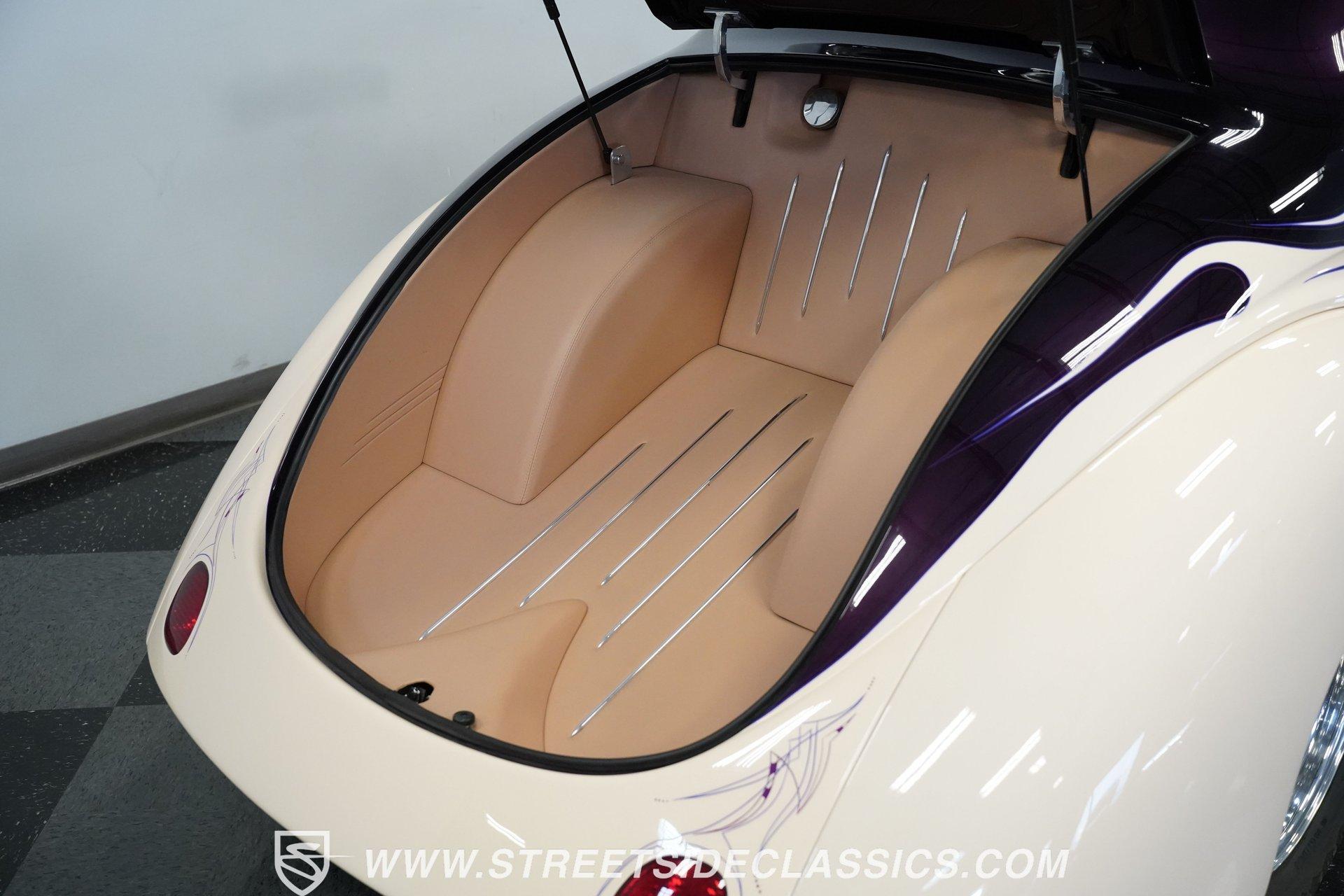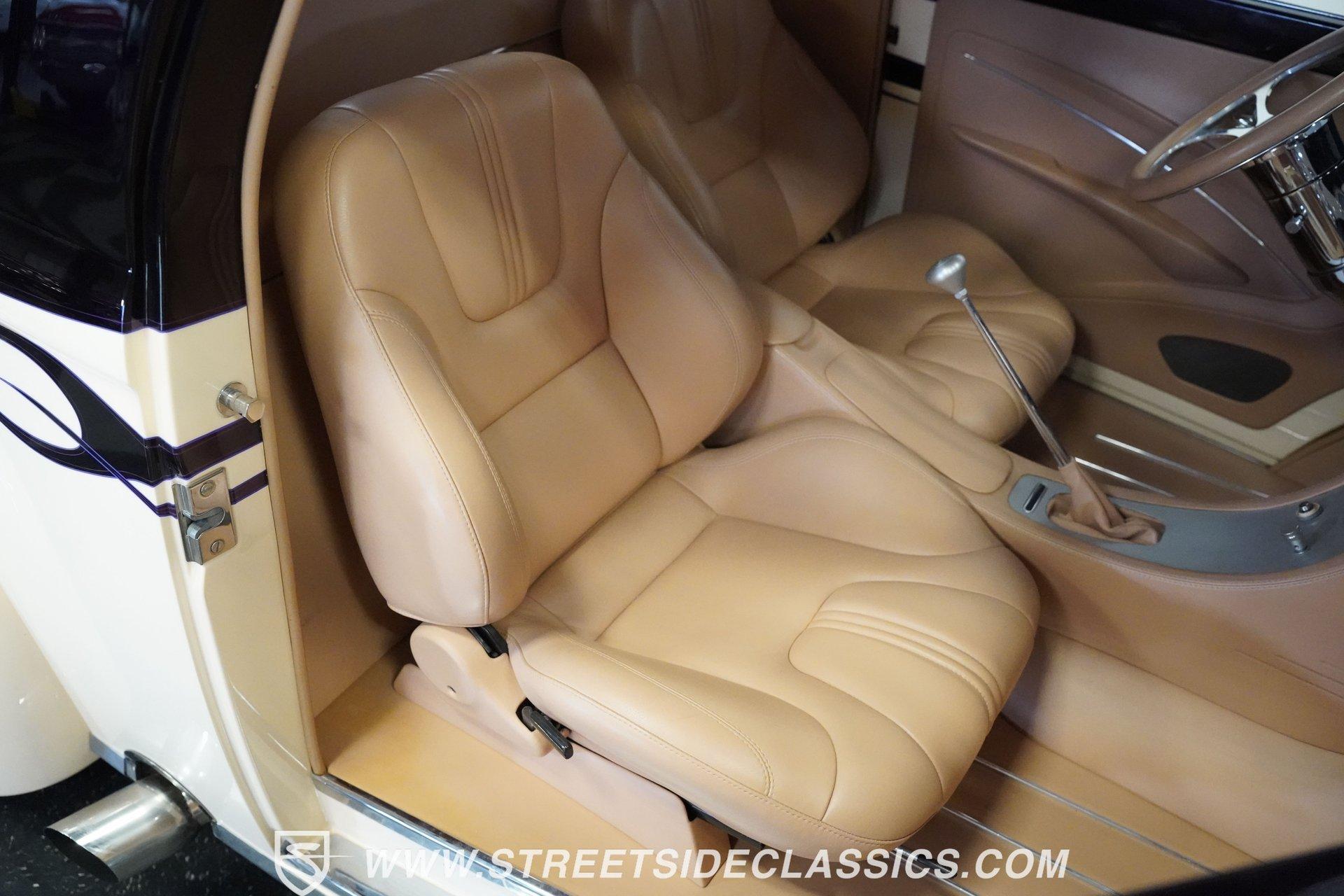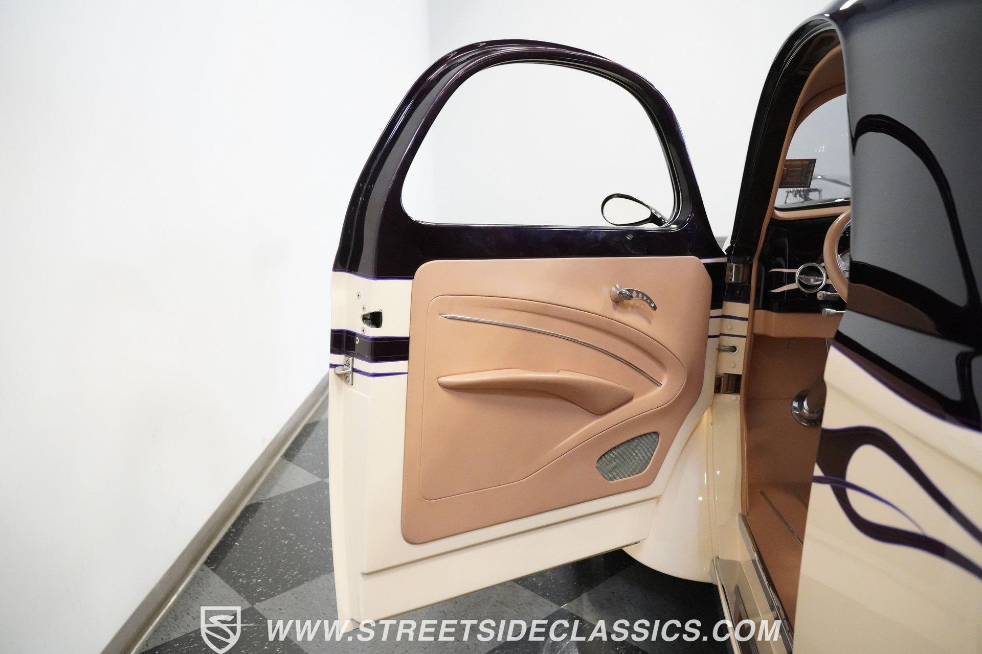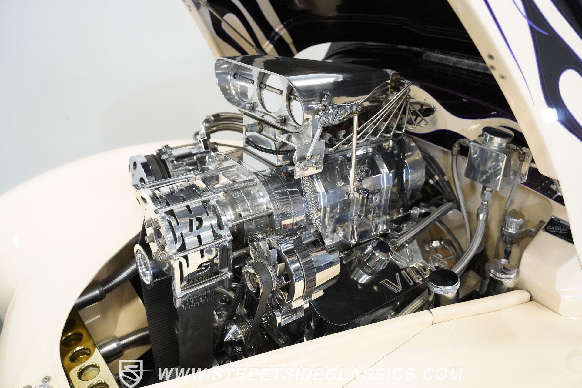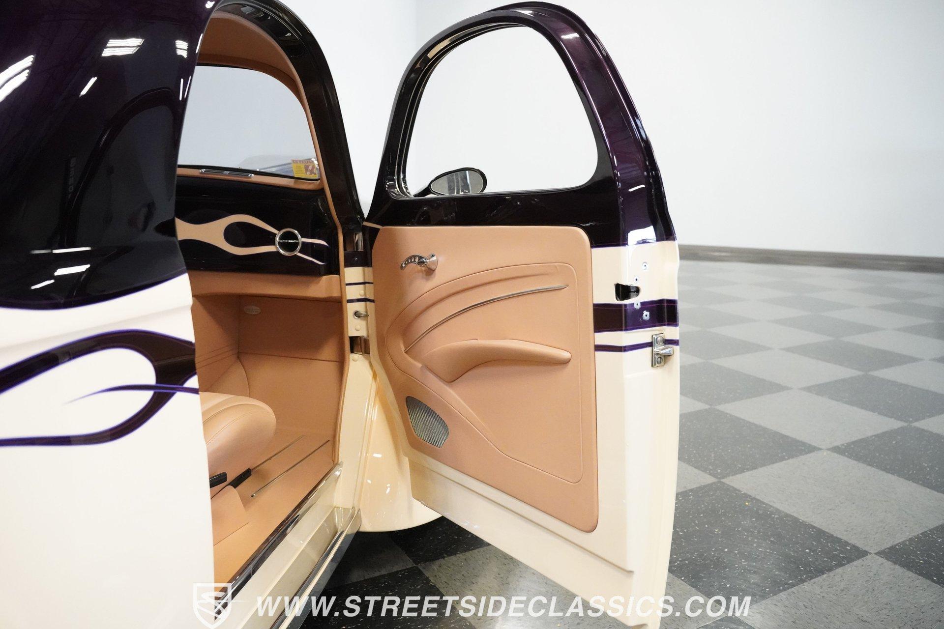 Finished in 2014 after a 5-year build, the 1941 Willys Coupe features an Outlaw fiberglass body adorned in a striking two-tone paint scheme. Deep plum candy and Sweet Georgia peach pearl colors flow across the curves, complemented by expert hand pinstriping and a white gold leaf hood logo. Six layers of base and six coats of clear create remarkable depth after wet sanding between each application. The dual side-exit exhaust adds aggressive visual appeal, while the 17" Aluminum Budnick wheels wrapped in 215/40R17 front and massive 31x16.50R17 rear tires give the Willys its perfect stance. The coral European leather interior continues the custom theme with meticulous attention to detail. Comfortable bucket seats provide excellent support, complemented by a full-length floor console upholstered to match. The custom-painted dash features flames that echo the exterior design, while white-face Dolphin analog gauges display vital information. The billet shifter rises from the center console, accompanied by matching billet pedals. A chrome tilt column topped with a Budnick chrome wheel completes the control setup, and even the trunk receives matching upholstery treatment. The massive 502 cubic inch V8 engine dominates the engine bay, topped with a BDS 871 supercharger and Fast fuel injection system utilizing 16 injectors. Edelbrock aluminum heads enhance performance, while Sanderson long-tube headers feed into glasspack-style mufflers on the side pipes. All this power channels through a TH400 3-speed automatic transmission to a 9-inch rear end with 3.70 gears. The full Outlaw chassis features independent front suspension with tubular control arms, rack and pinion steering, and a four-link rear with Z-bar. Air ride suspension allows adjustable height, while four-wheel disc brakes with drilled and slotted rotors provide stopping power.