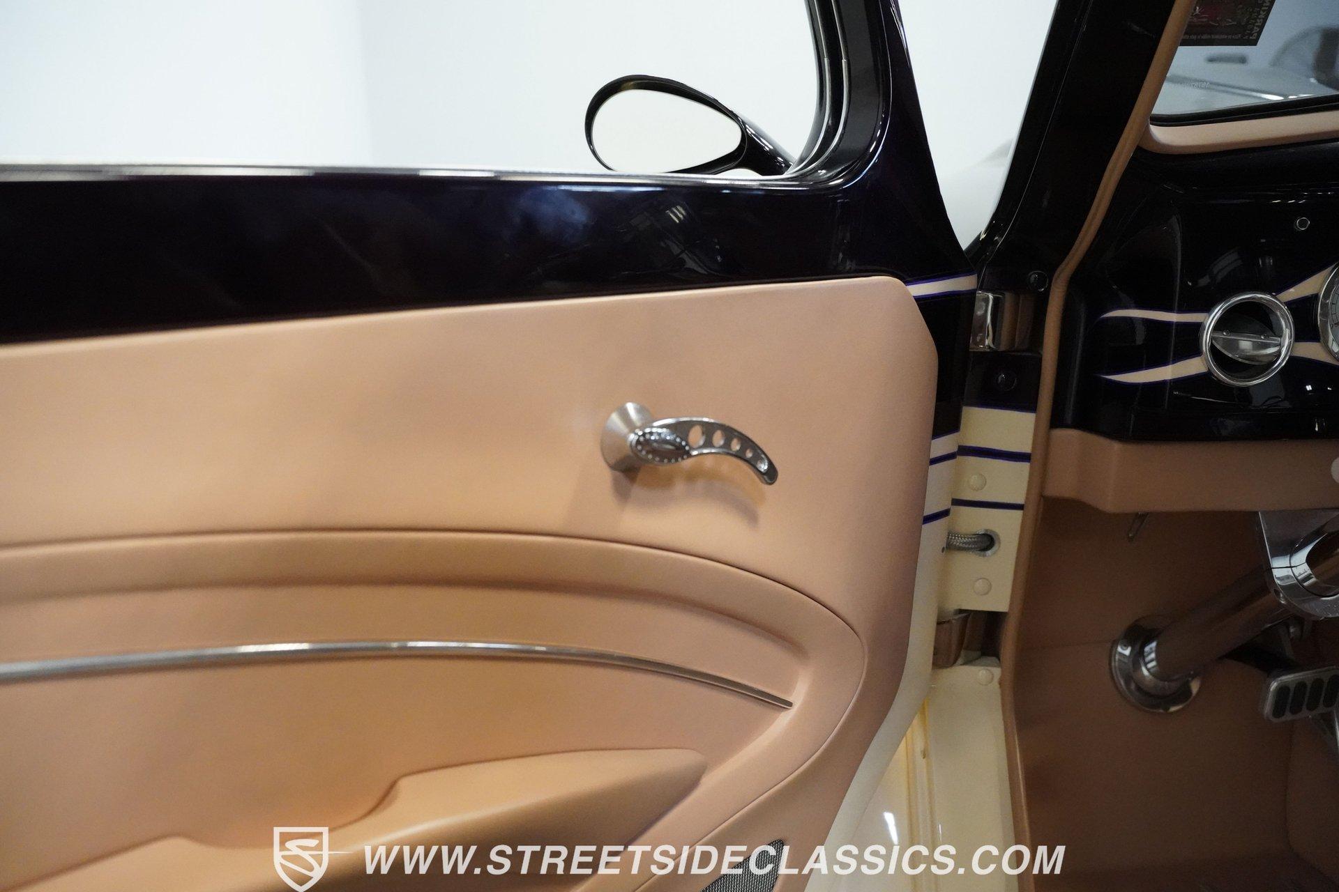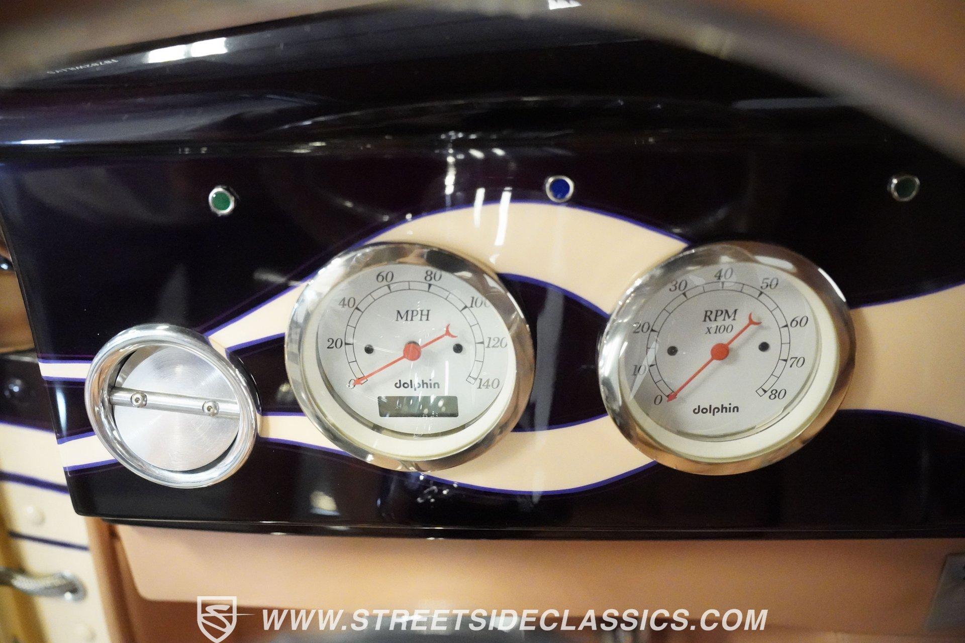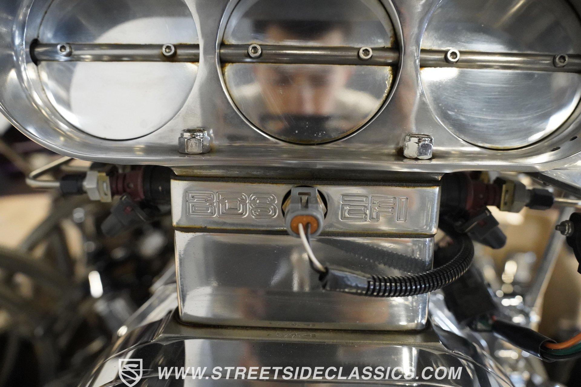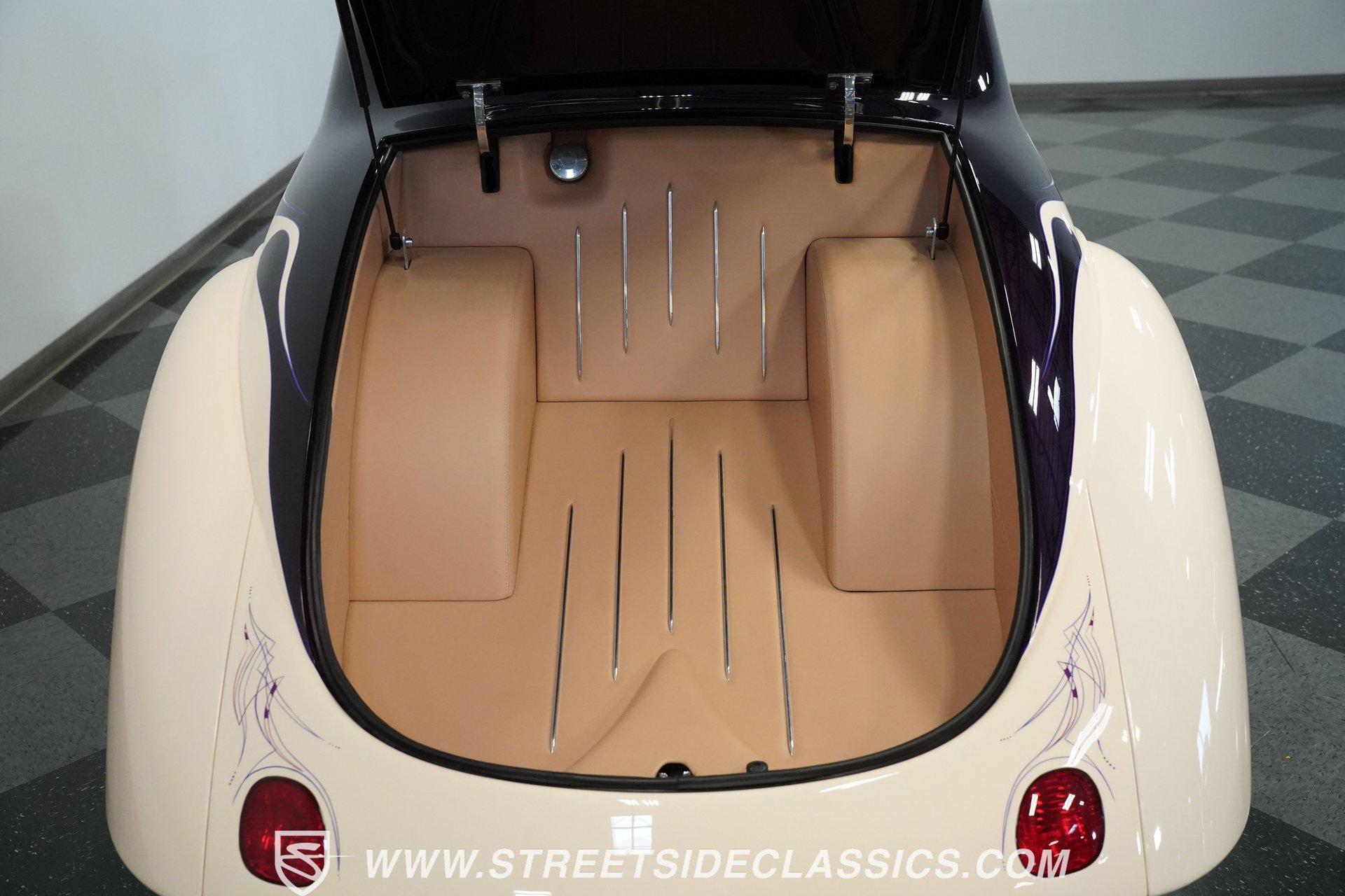 Finished in 2014 after a 5-year build, the 1941 Willys Coupe features an Outlaw fiberglass body adorned in a striking two-tone paint scheme. Deep plum candy and Sweet Georgia peach pearl colors flow across the curves, complemented by expert hand pinstriping and a white gold leaf hood logo. Six layers of base and six coats of clear create remarkable depth after wet sanding between each application. The dual side-exit exhaust adds aggressive visual appeal, while the 17" Aluminum Budnick wheels wrapped in 215/40R17 front and massive 31x16.50R17 rear tires give the Willys its perfect stance. The coral European leather interior continues the custom theme with meticulous attention to detail. Comfortable bucket seats provide excellent support, complemented by a full-length floor console upholstered to match. The custom-painted dash features flames that echo the exterior design, while white-face Dolphin analog gauges display vital information. The billet shifter rises from the center console, accompanied by matching billet pedals. A chrome tilt column topped with a Budnick chrome wheel completes the control setup, and even the trunk receives matching upholstery treatment. The massive 502 cubic inch V8 engine dominates the engine bay, topped with a BDS 871 supercharger and Fast fuel injection system utilizing 16 injectors. Edelbrock aluminum heads enhance performance, while Sanderson long-tube headers feed into glasspack-style mufflers on the side pipes. All this power channels through a TH400 3-speed automatic transmission to a 9-inch rear end with 3.70 gears. The full Outlaw chassis features independent front suspension with tubular control arms, rack and pinion steering, and a four-link rear with Z-bar. Air ride suspension allows adjustable height, while four-wheel disc brakes with drilled and slotted rotors provide stopping power.