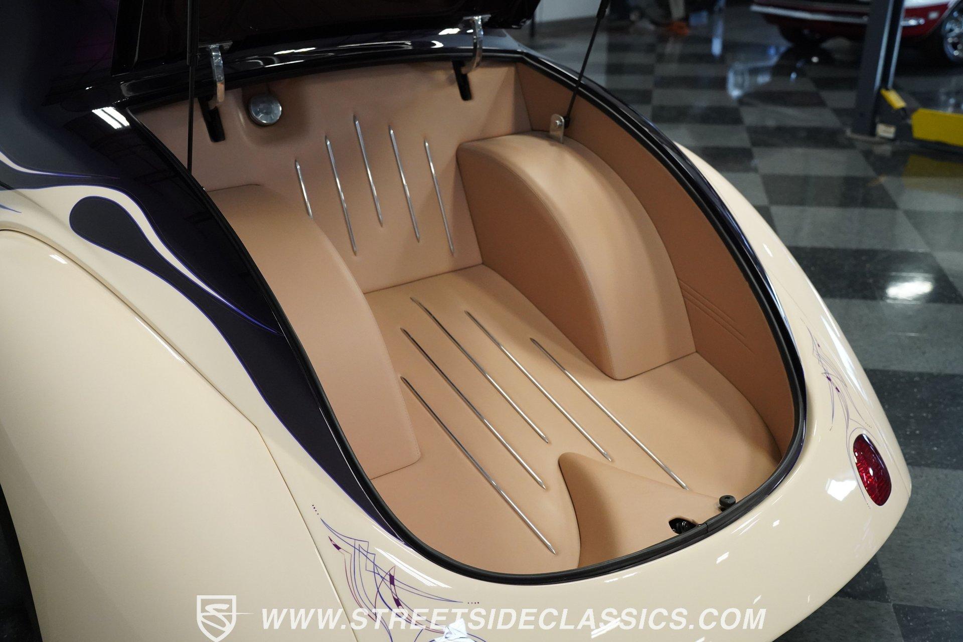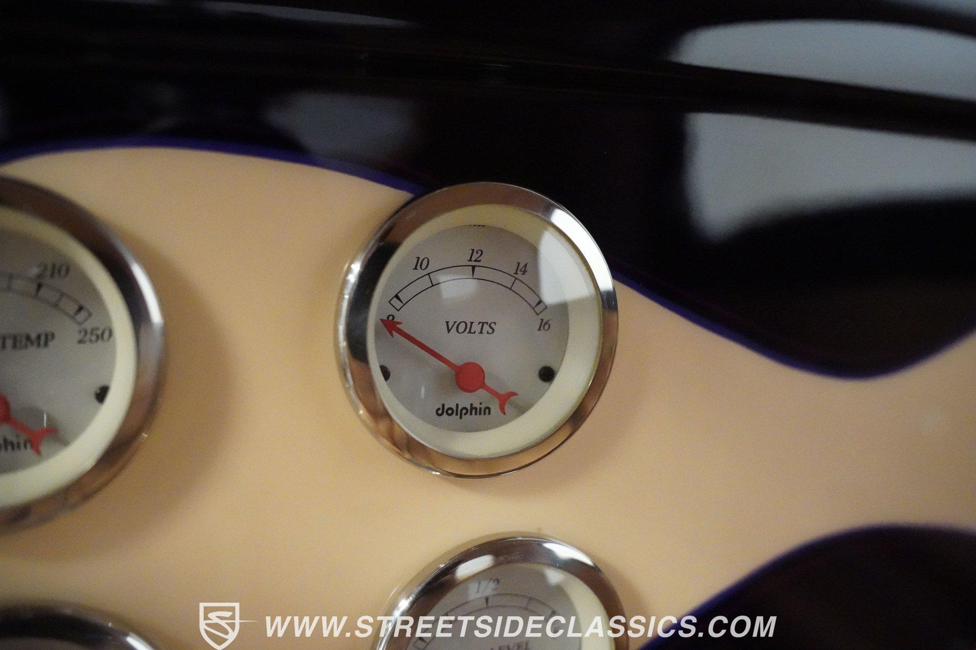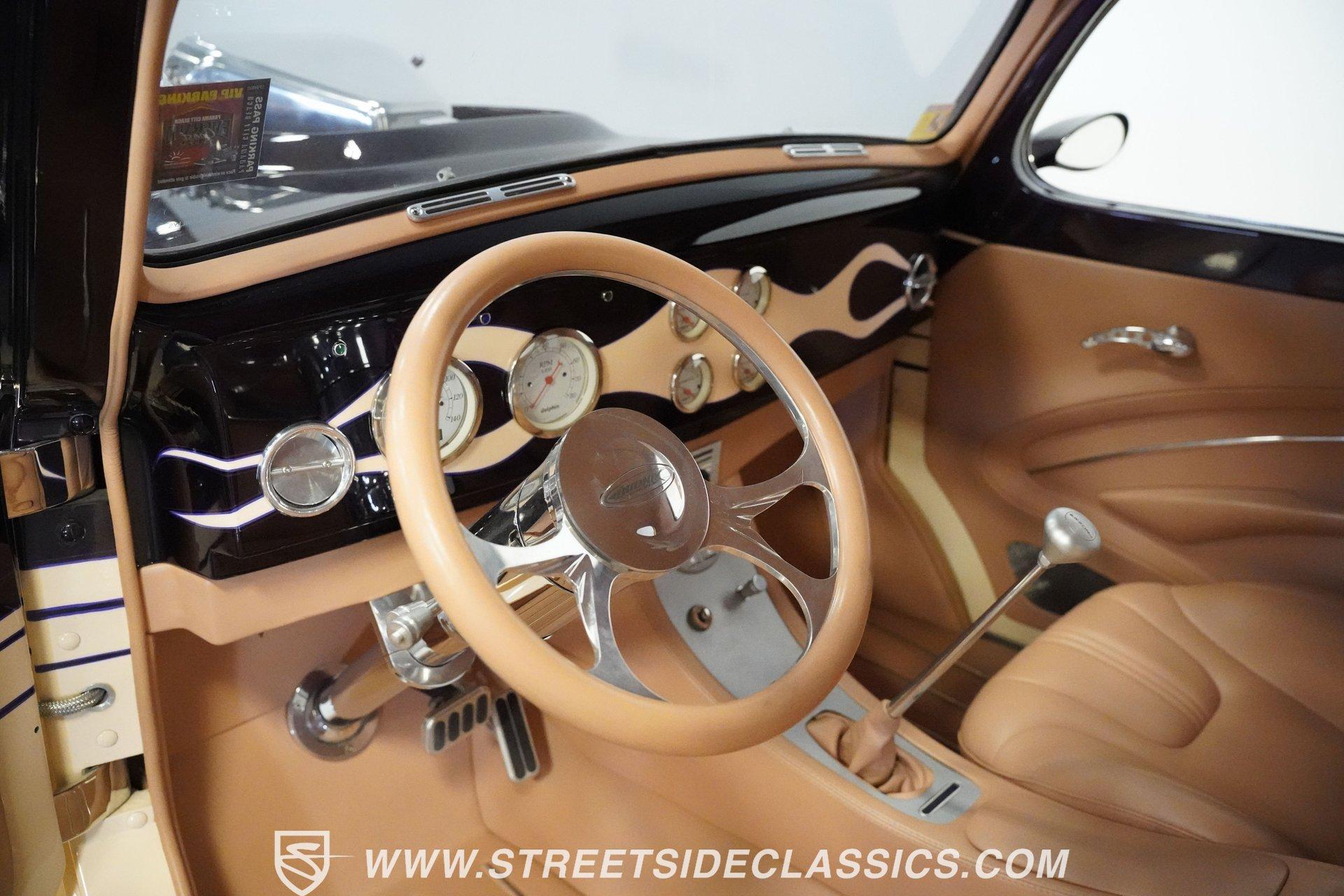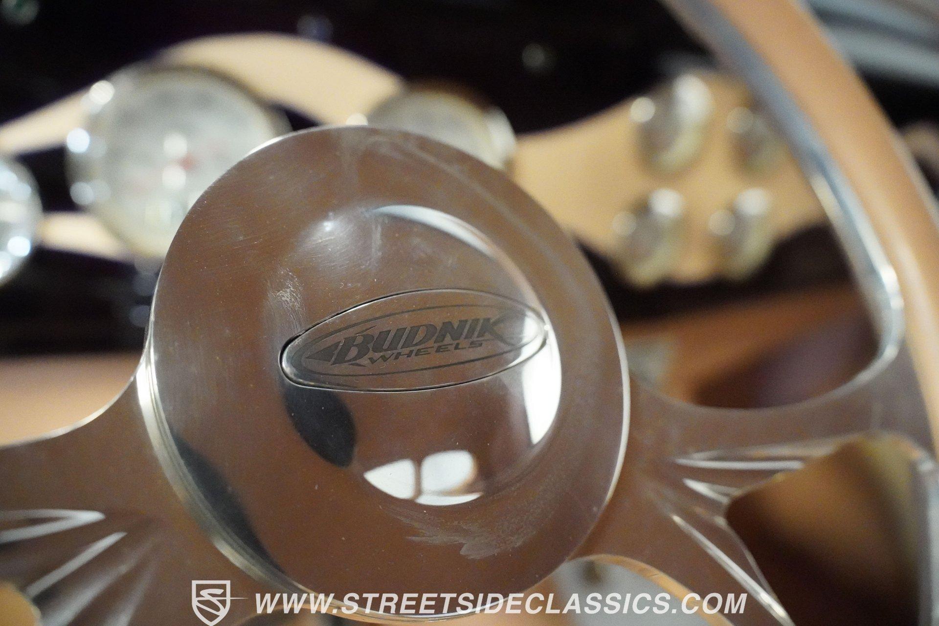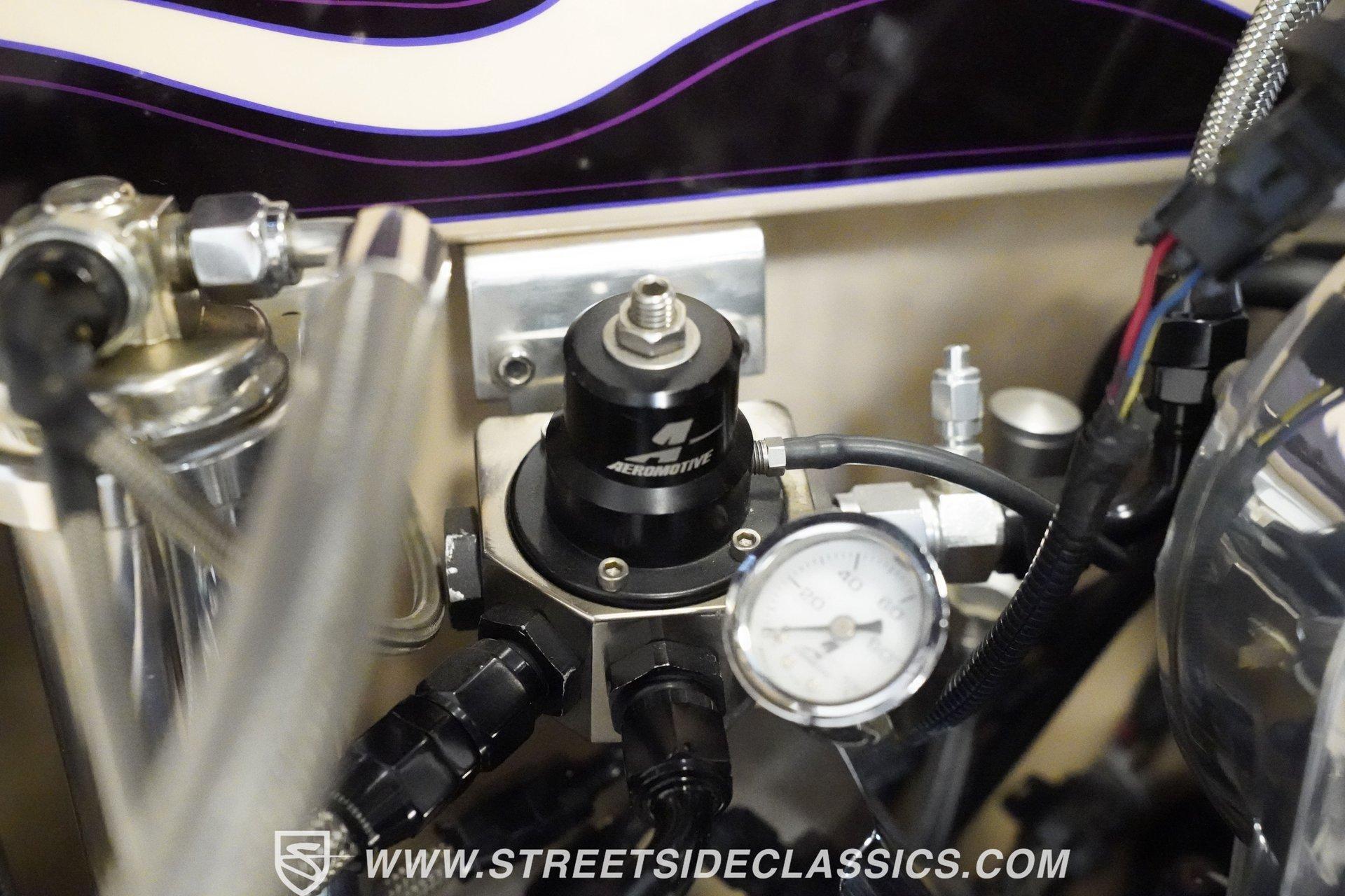 Finished in 2014 after a 5-year build, the 1941 Willys Coupe features an Outlaw fiberglass body adorned in a striking two-tone paint scheme. Deep plum candy and Sweet Georgia peach pearl colors flow across the curves, complemented by expert hand pinstriping and a white gold leaf hood logo. Six layers of base and six coats of clear create remarkable depth after wet sanding between each application. The dual side-exit exhaust adds aggressive visual appeal, while the 17" Aluminum Budnick wheels wrapped in 215/40R17 front and massive 31x16.50R17 rear tires give the Willys its perfect stance. The coral European leather interior continues the custom theme with meticulous attention to detail. Comfortable bucket seats provide excellent support, complemented by a full-length floor console upholstered to match. The custom-painted dash features flames that echo the exterior design, while white-face Dolphin analog gauges display vital information. The billet shifter rises from the center console, accompanied by matching billet pedals. A chrome tilt column topped with a Budnick chrome wheel completes the control setup, and even the trunk receives matching upholstery treatment. The massive 502 cubic inch V8 engine dominates the engine bay, topped with a BDS 871 supercharger and Fast fuel injection system utilizing 16 injectors. Edelbrock aluminum heads enhance performance, while Sanderson long-tube headers feed into glasspack-style mufflers on the side pipes. All this power channels through a TH400 3-speed automatic transmission to a 9-inch rear end with 3.70 gears. The full Outlaw chassis features independent front suspension with tubular control arms, rack and pinion steering, and a four-link rear with Z-bar. Air ride suspension allows adjustable height, while four-wheel disc brakes with drilled and slotted rotors provide stopping power.