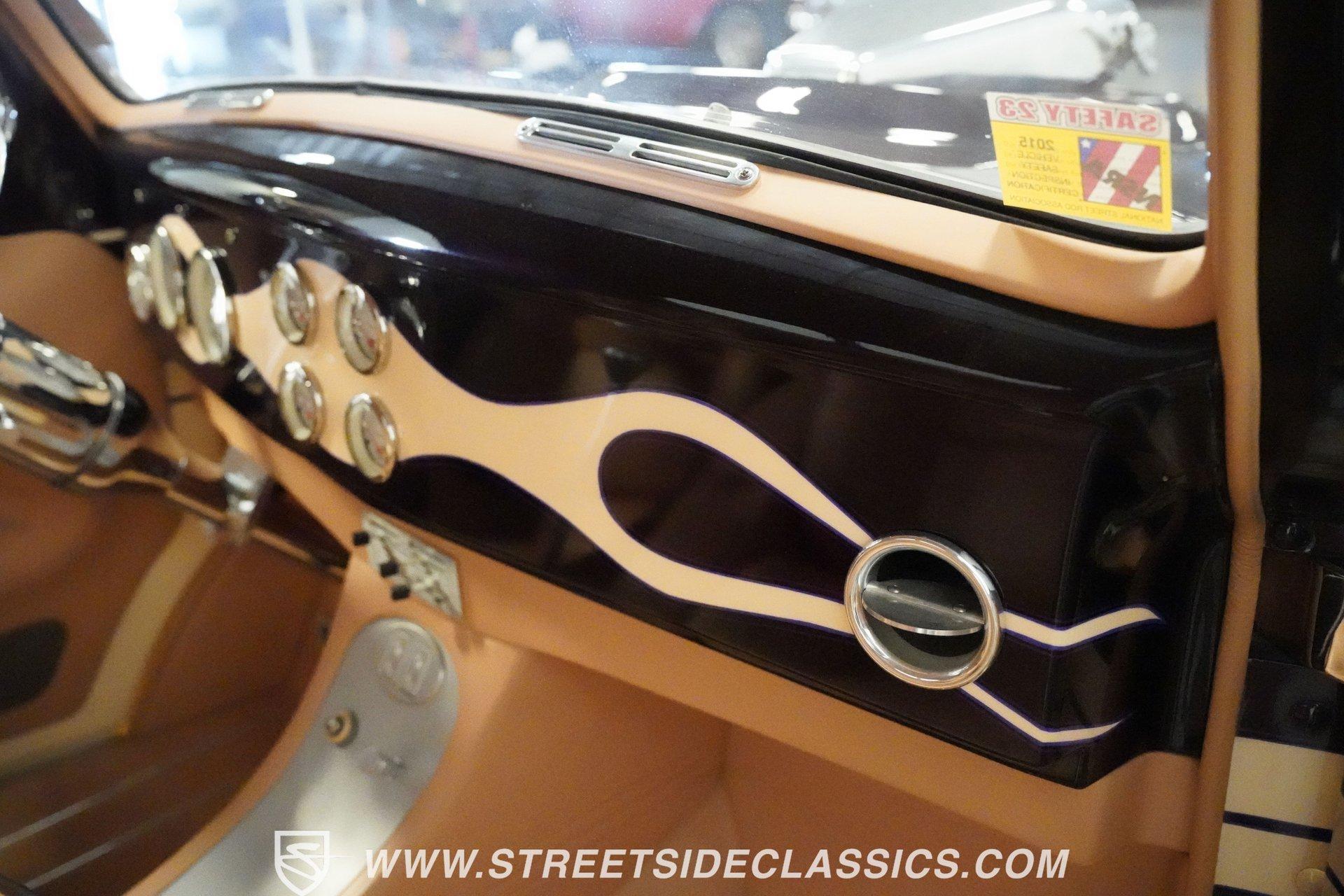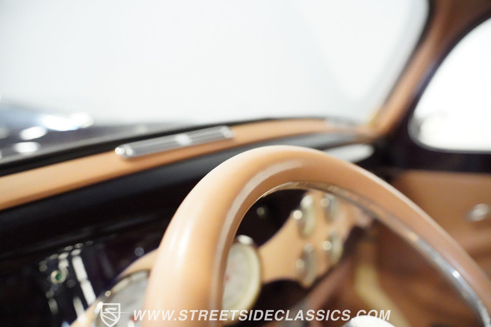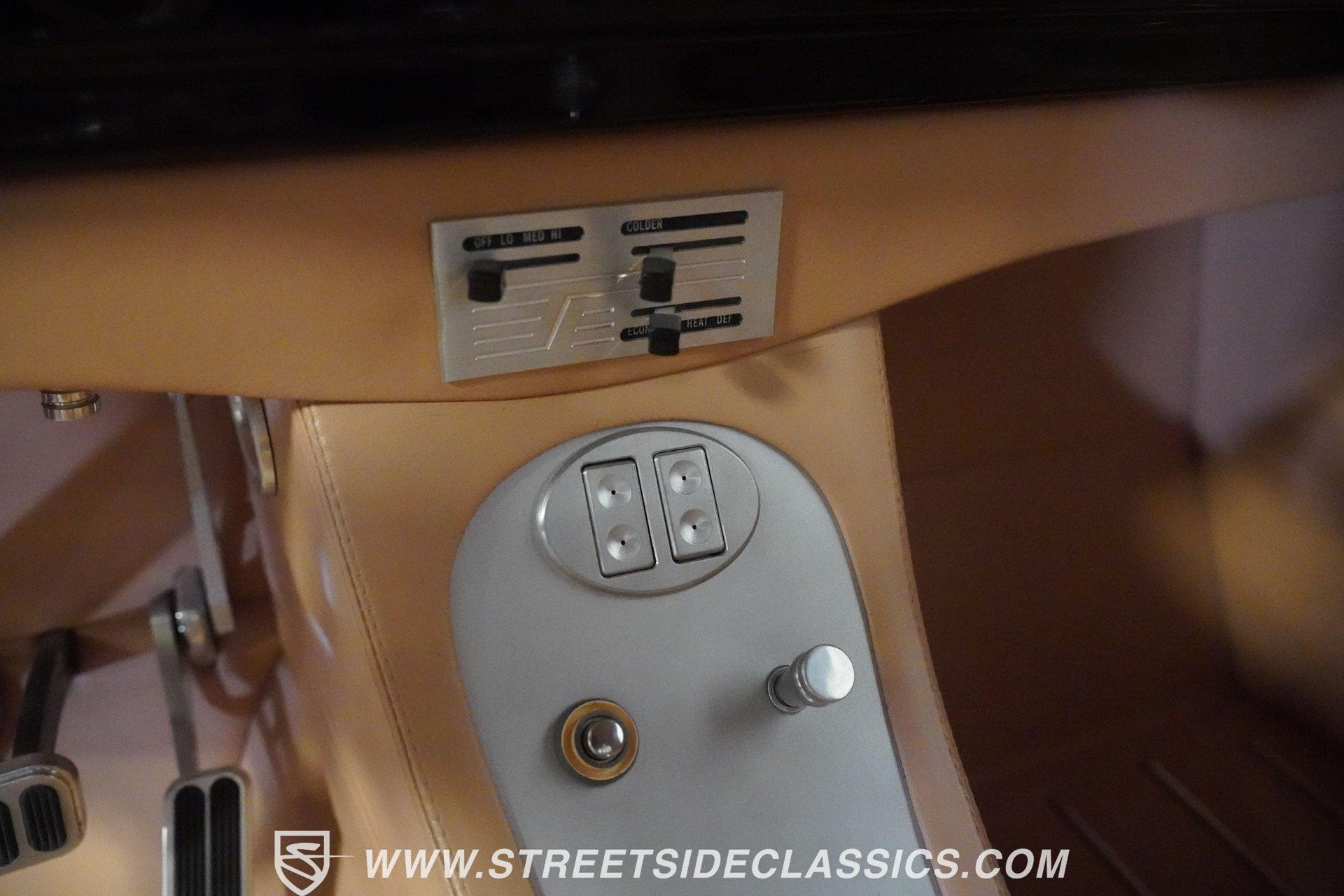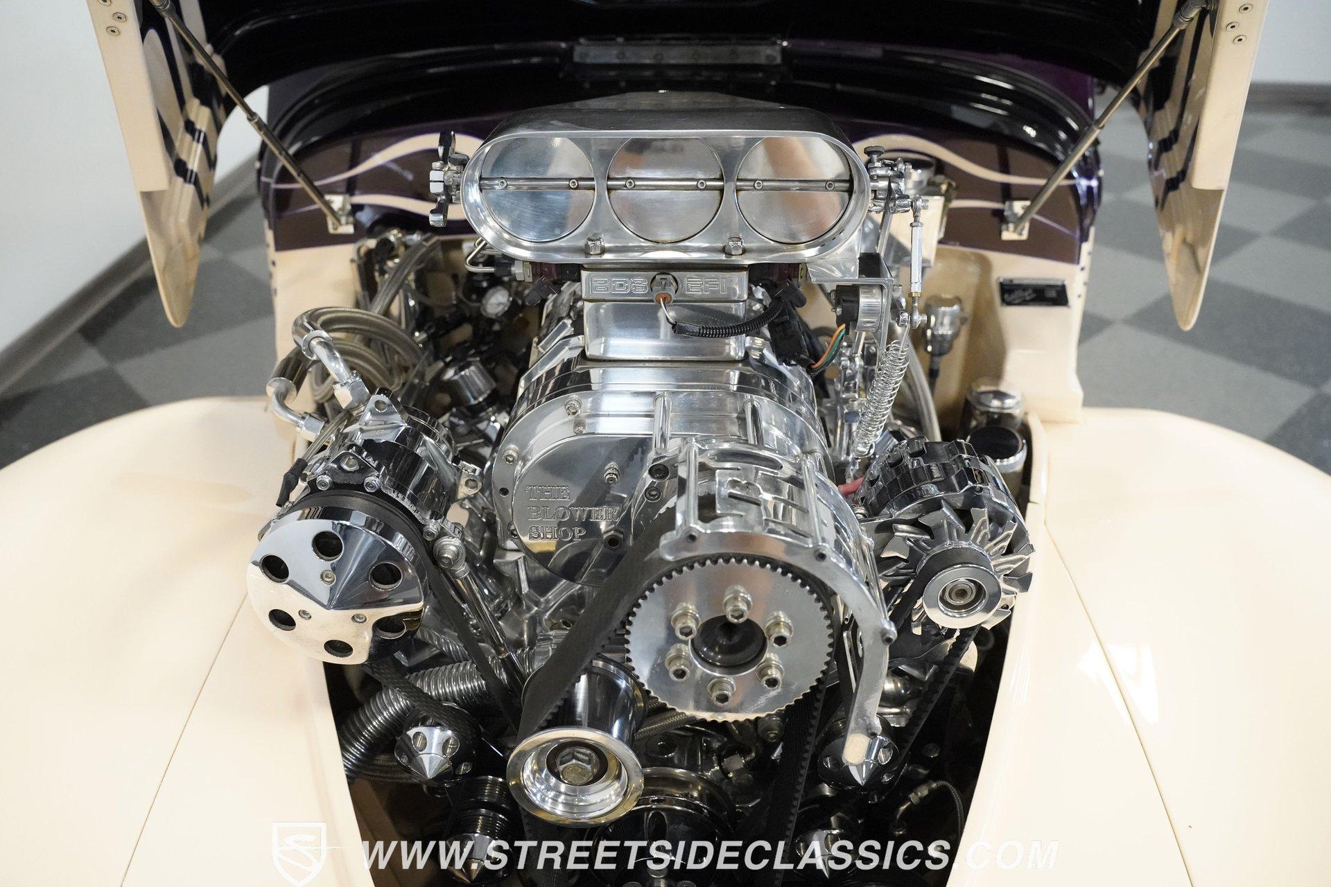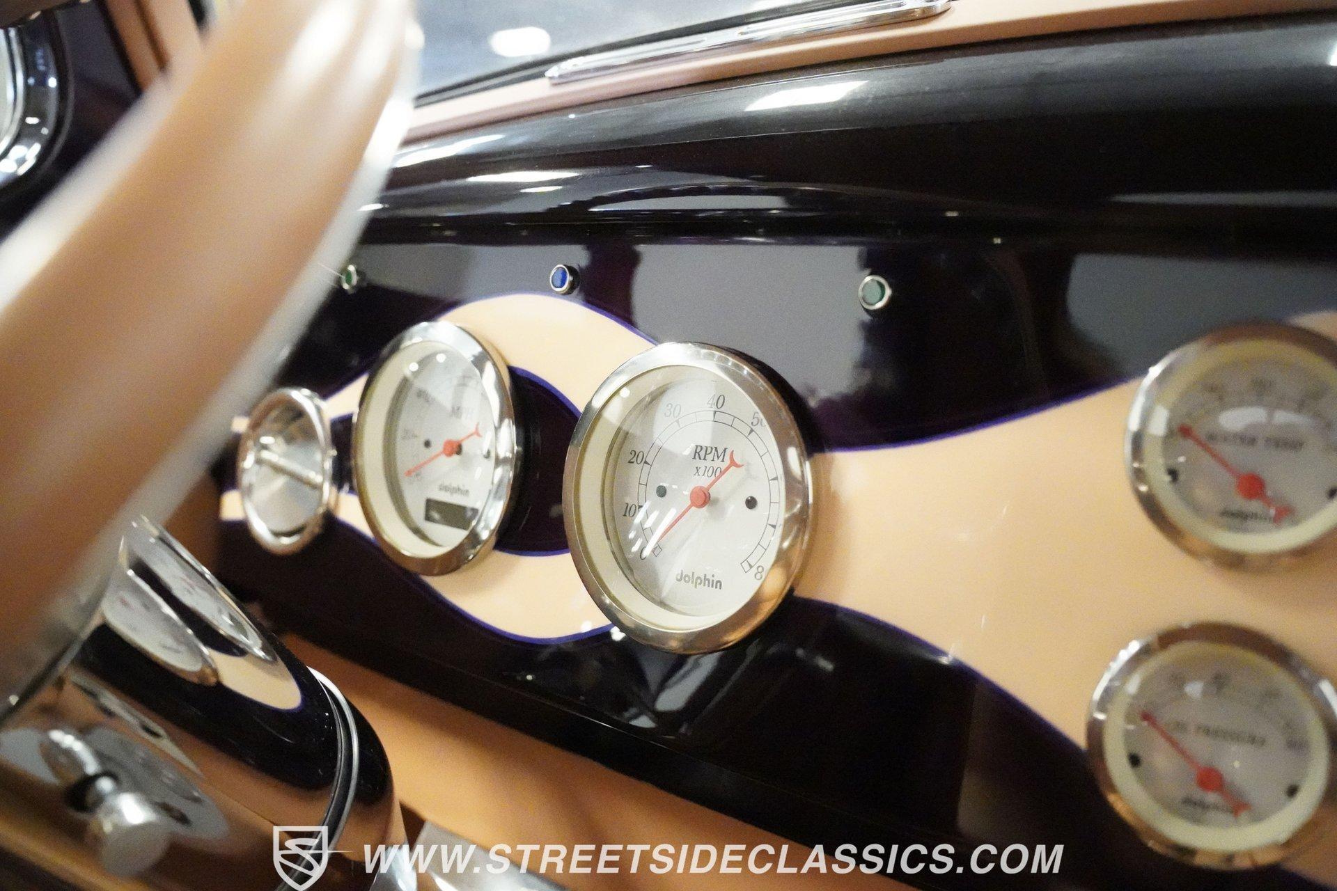 Finished in 2014 after a 5-year build, the 1941 Willys Coupe features an Outlaw fiberglass body adorned in a striking two-tone paint scheme. Deep plum candy and Sweet Georgia peach pearl colors flow across the curves, complemented by expert hand pinstriping and a white gold leaf hood logo. Six layers of base and six coats of clear create remarkable depth after wet sanding between each application. The dual side-exit exhaust adds aggressive visual appeal, while the 17" Aluminum Budnick wheels wrapped in 215/40R17 front and massive 31x16.50R17 rear tires give the Willys its perfect stance. The coral European leather interior continues the custom theme with meticulous attention to detail. Comfortable bucket seats provide excellent support, complemented by a full-length floor console upholstered to match. The custom-painted dash features flames that echo the exterior design, while white-face Dolphin analog gauges display vital information. The billet shifter rises from the center console, accompanied by matching billet pedals. A chrome tilt column topped with a Budnick chrome wheel completes the control setup, and even the trunk receives matching upholstery treatment. The massive 502 cubic inch V8 engine dominates the engine bay, topped with a BDS 871 supercharger and Fast fuel injection system utilizing 16 injectors. Edelbrock aluminum heads enhance performance, while Sanderson long-tube headers feed into glasspack-style mufflers on the side pipes. All this power channels through a TH400 3-speed automatic transmission to a 9-inch rear end with 3.70 gears. The full Outlaw chassis features independent front suspension with tubular control arms, rack and pinion steering, and a four-link rear with Z-bar. Air ride suspension allows adjustable height, while four-wheel disc brakes with drilled and slotted rotors provide stopping power.