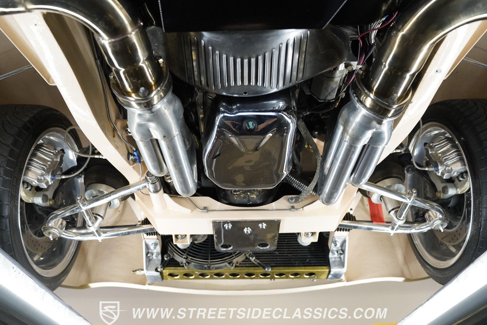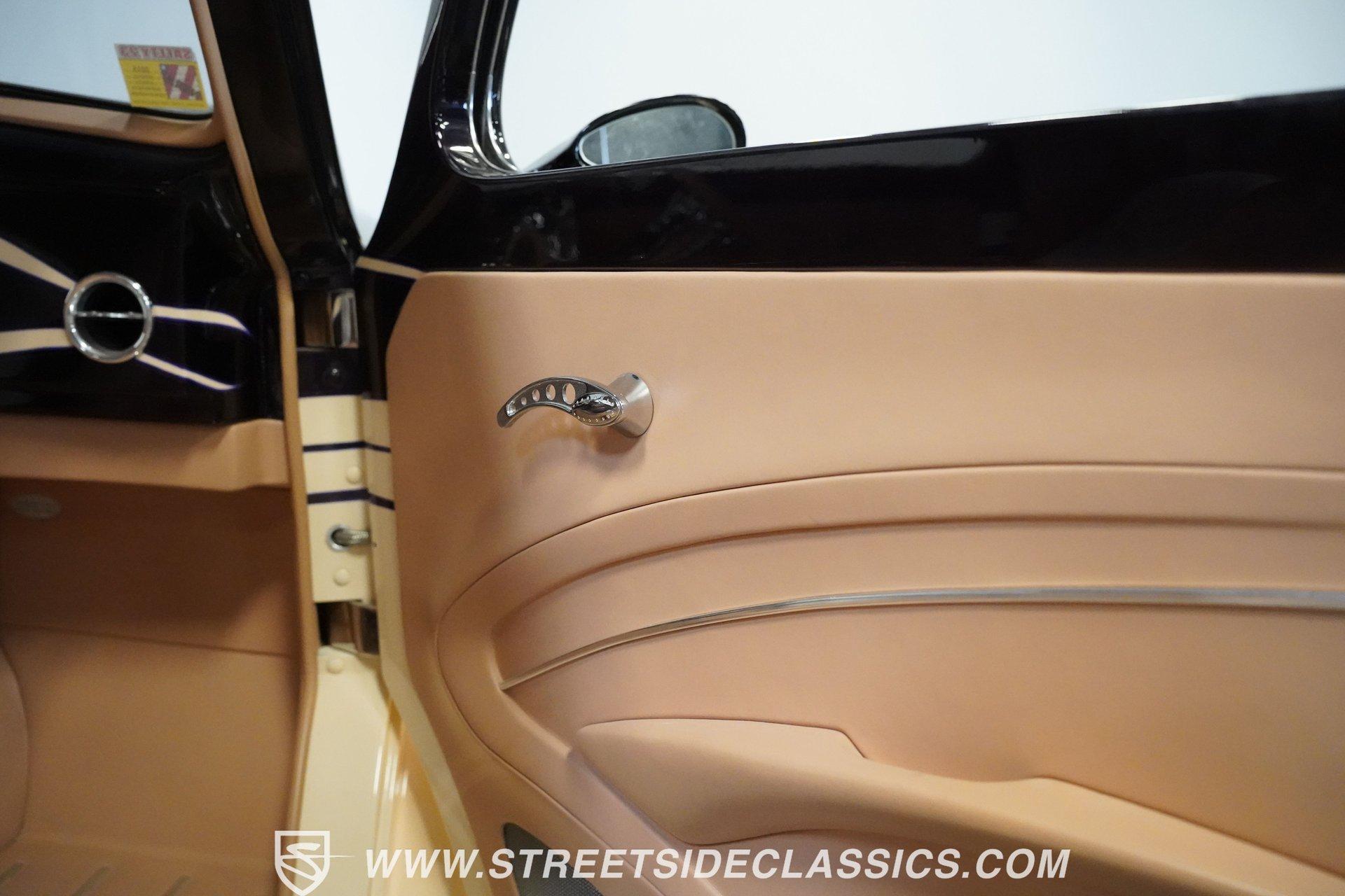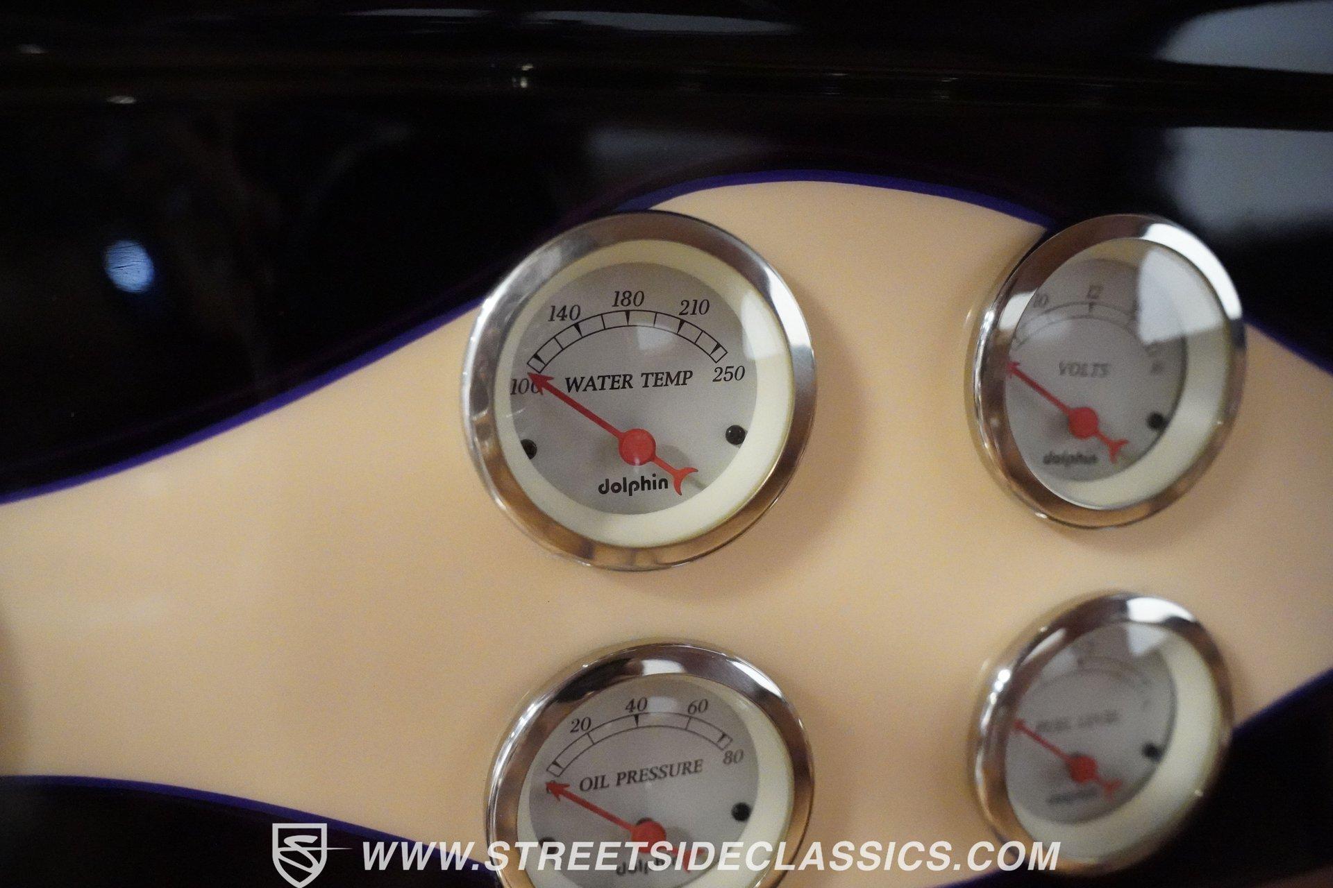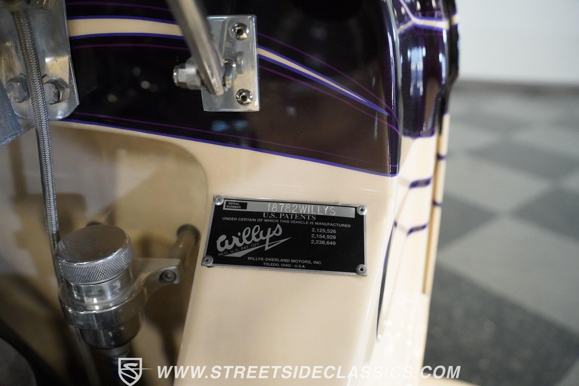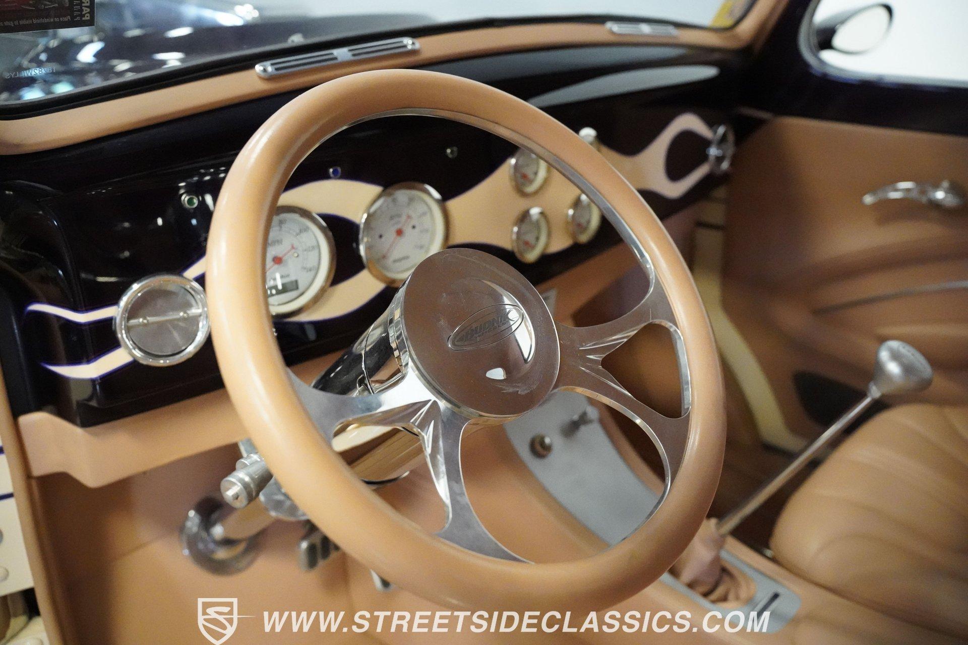 Finished in 2014 after a 5-year build, the 1941 Willys Coupe features an Outlaw fiberglass body adorned in a striking two-tone paint scheme. Deep plum candy and Sweet Georgia peach pearl colors flow across the curves, complemented by expert hand pinstriping and a white gold leaf hood logo. Six layers of base and six coats of clear create remarkable depth after wet sanding between each application. The dual side-exit exhaust adds aggressive visual appeal, while the 17" Aluminum Budnick wheels wrapped in 215/40R17 front and massive 31x16.50R17 rear tires give the Willys its perfect stance. The coral European leather interior continues the custom theme with meticulous attention to detail. Comfortable bucket seats provide excellent support, complemented by a full-length floor console upholstered to match. The custom-painted dash features flames that echo the exterior design, while white-face Dolphin analog gauges display vital information. The billet shifter rises from the center console, accompanied by matching billet pedals. A chrome tilt column topped with a Budnick chrome wheel completes the control setup, and even the trunk receives matching upholstery treatment. The massive 502 cubic inch V8 engine dominates the engine bay, topped with a BDS 871 supercharger and Fast fuel injection system utilizing 16 injectors. Edelbrock aluminum heads enhance performance, while Sanderson long-tube headers feed into glasspack-style mufflers on the side pipes. All this power channels through a TH400 3-speed automatic transmission to a 9-inch rear end with 3.70 gears. The full Outlaw chassis features independent front suspension with tubular control arms, rack and pinion steering, and a four-link rear with Z-bar. Air ride suspension allows adjustable height, while four-wheel disc brakes with drilled and slotted rotors provide stopping power.