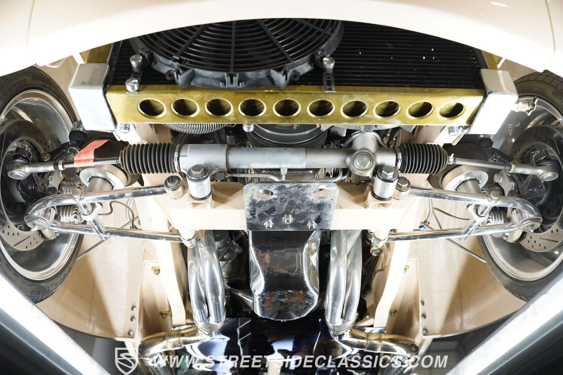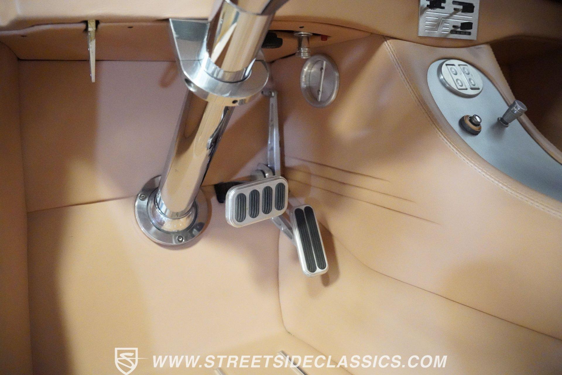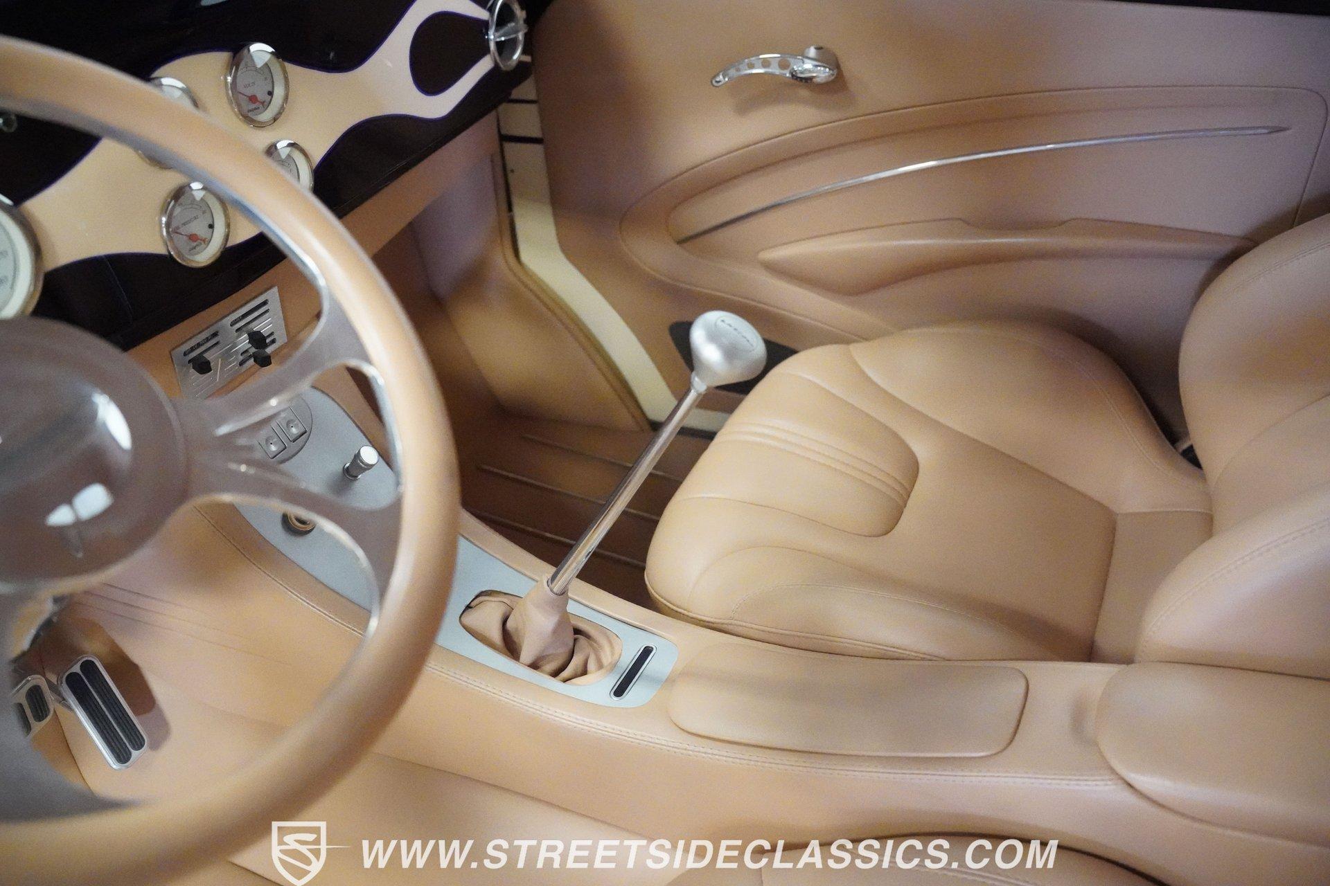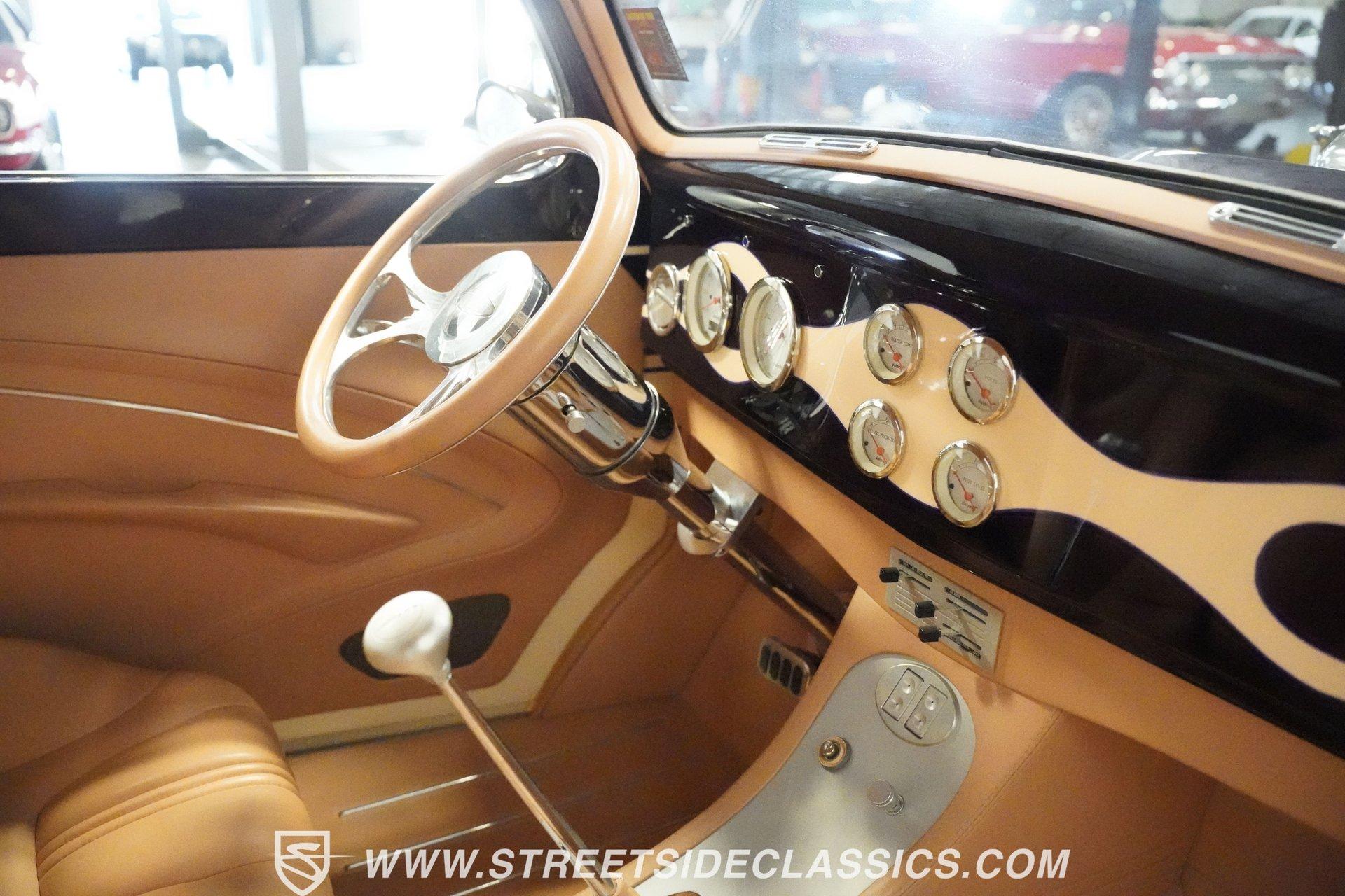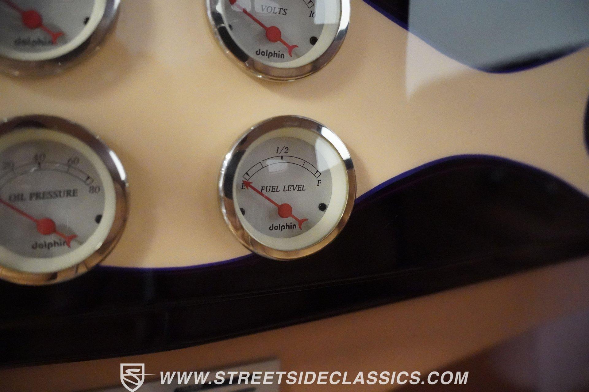 Finished in 2014 after a 5-year build, the 1941 Willys Coupe features an Outlaw fiberglass body adorned in a striking two-tone paint scheme. Deep plum candy and Sweet Georgia peach pearl colors flow across the curves, complemented by expert hand pinstriping and a white gold leaf hood logo. Six layers of base and six coats of clear create remarkable depth after wet sanding between each application. The dual side-exit exhaust adds aggressive visual appeal, while the 17" Aluminum Budnick wheels wrapped in 215/40R17 front and massive 31x16.50R17 rear tires give the Willys its perfect stance. The coral European leather interior continues the custom theme with meticulous attention to detail. Comfortable bucket seats provide excellent support, complemented by a full-length floor console upholstered to match. The custom-painted dash features flames that echo the exterior design, while white-face Dolphin analog gauges display vital information. The billet shifter rises from the center console, accompanied by matching billet pedals. A chrome tilt column topped with a Budnick chrome wheel completes the control setup, and even the trunk receives matching upholstery treatment. The massive 502 cubic inch V8 engine dominates the engine bay, topped with a BDS 871 supercharger and Fast fuel injection system utilizing 16 injectors. Edelbrock aluminum heads enhance performance, while Sanderson long-tube headers feed into glasspack-style mufflers on the side pipes. All this power channels through a TH400 3-speed automatic transmission to a 9-inch rear end with 3.70 gears. The full Outlaw chassis features independent front suspension with tubular control arms, rack and pinion steering, and a four-link rear with Z-bar. Air ride suspension allows adjustable height, while four-wheel disc brakes with drilled and slotted rotors provide stopping power.