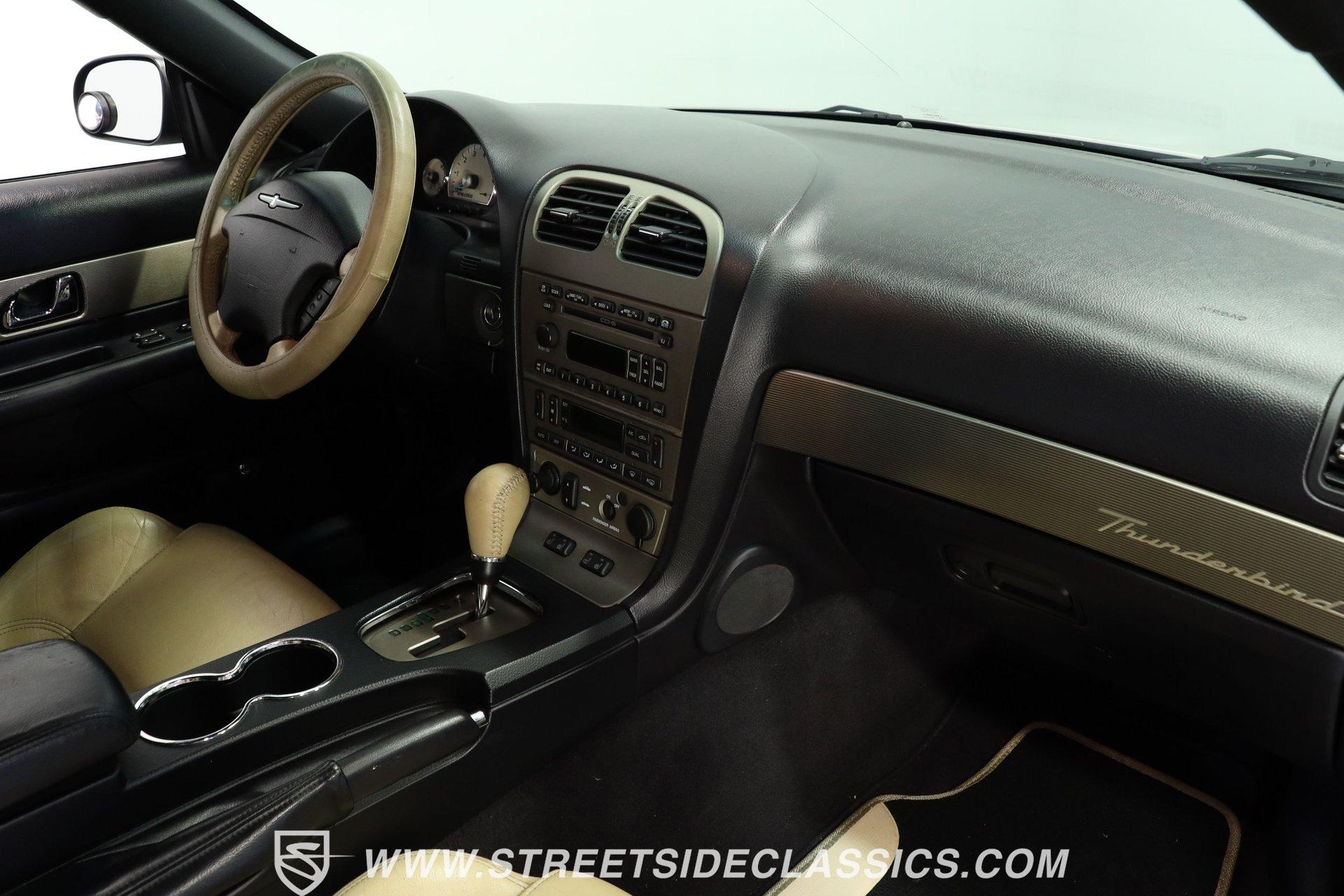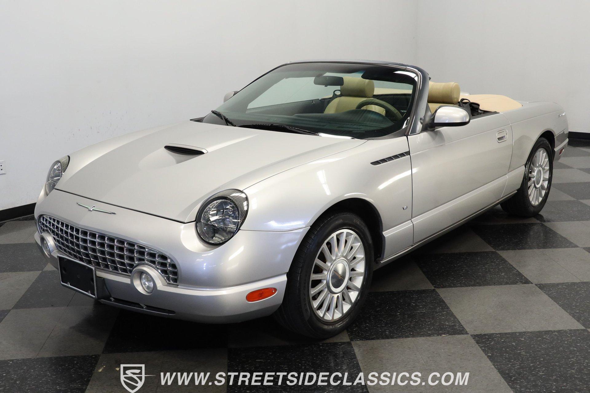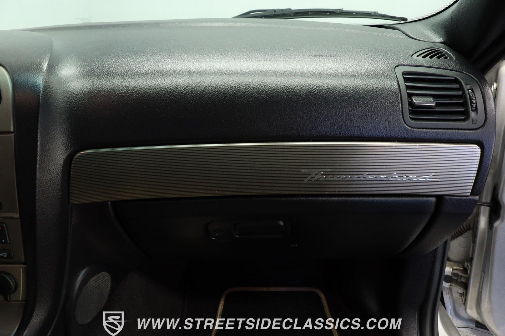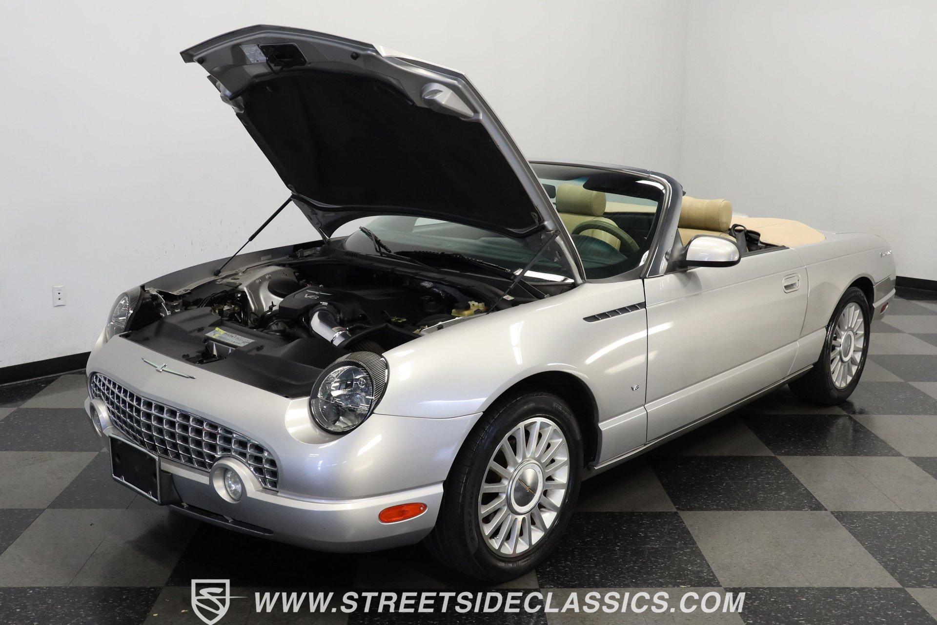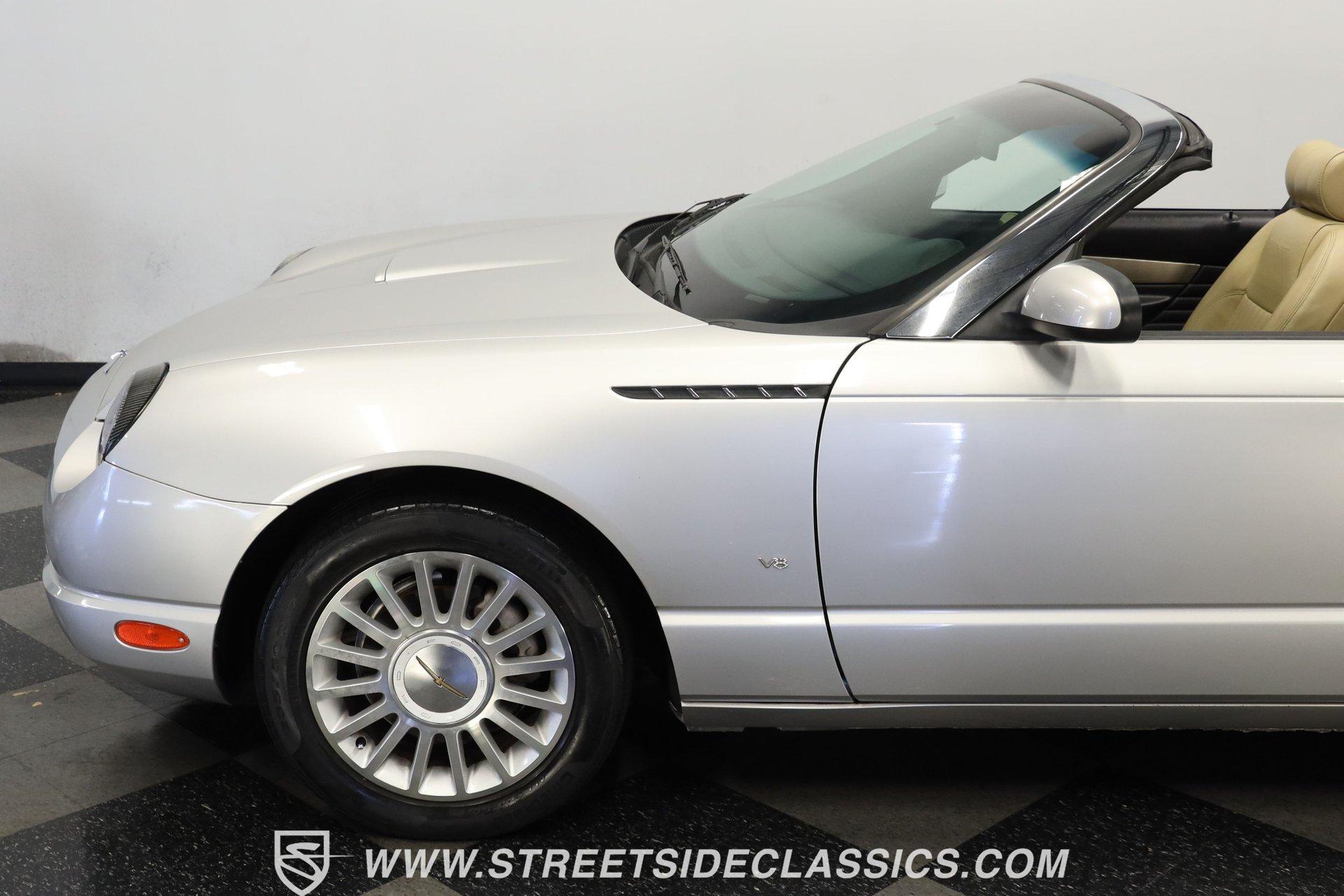Production numbers for this model year stayed limited, making each one noteworthy among collectors today. This 2004 Ford Thunderbird Convertible features Silver Birch Metallic paint that covers its curved panels. The convertible features both a tan canvas soft top with glass rear window and a matching silver removable hardtop with port hole windows. Rolling on 17" T-Bird alloy wheels wrapped in 235/50R17 tires, this T-Bird's proportions showcase the retro-modern design language that defined this generation. Chrome accents add subtle elegance while dual exhaust outlets complete the rear view. Light Sand leather bucket seats anchor the interior with their premium appearance and comfortable design. The center console houses the shifter while the dashboard maintains clean lines throughout. A 6-disc in-dash CD changer provides entertainment alongside AM/FM radio capability. Power windows, power locks, power mirrors, and power seats add convenience, while air conditioning keeps the cabin comfortable during top-down cruising. Heated seats, cruise control, and a telescopic steering wheel round out the comfort features. A canvas boot cover matches the interior and keeps things tidy when the top is down. The 3.9L V8 engine delivers power through a 5-speed automatic transmission to the rear wheels. Electronic fuel injection feeds the V8 while a K&N Typhoon cold air intake helps with airflow. Four-wheel power disc brakes provide stopping capability, complemented by power steering for easy maneuvering. Dual exhaust routing gives this Thunderbird its distinctive sound signature. The serpentine belt system, hoses, and wiring present well in the engine bay. The 12V battery mounts in the trunk for better weight distribution. HIGHLIGHTS: 3.9L V8 Engine 5 Speed Automatic Transmission Electronic Fuel Injection K&N Typhoon Cold Air Intake Four Wheel Power Disc Brakes Power Steering Dual Exhaust Silver Birch Metallic Paint Tan Canvas Convertible Top with Glass Rear Window Silver Removable Hardtop with Port Hole Windows 17" T-Bird Alloy Wheels with 235/50R17 Tires Chrome Accents Power Convertible Top Light Sand Interior with Power Heated Leather Bucket Seats Console Shifter 6-Disc In-Dash CD Changer AM/FM Radio Power Windows, Locks, Mirrors Air Conditioning Cruise Control Telescopic Steering Wheel Canvas Boot Cover Owner's Manual Maintenance Records Top Tool This 2004 Ford Thunderbird Convertible combines the luxury of leather seating with the versatility of dual tops and the performance of a V8 engine. With its distinctive styling and comprehensive feature set, this final-generation Thunderbird offers both comfort and capability. Call today! We can assist you with getting an Extended Vehicle Service Plan from Freedom Warranty, which provides comprehensive coverage that can save thousands of dollars on unexpected repairs. Inquire for more details and pricing!