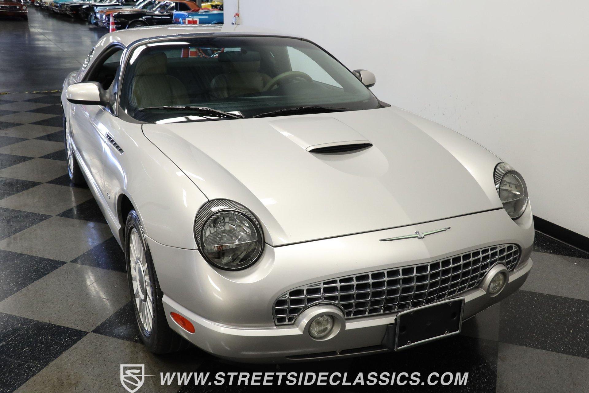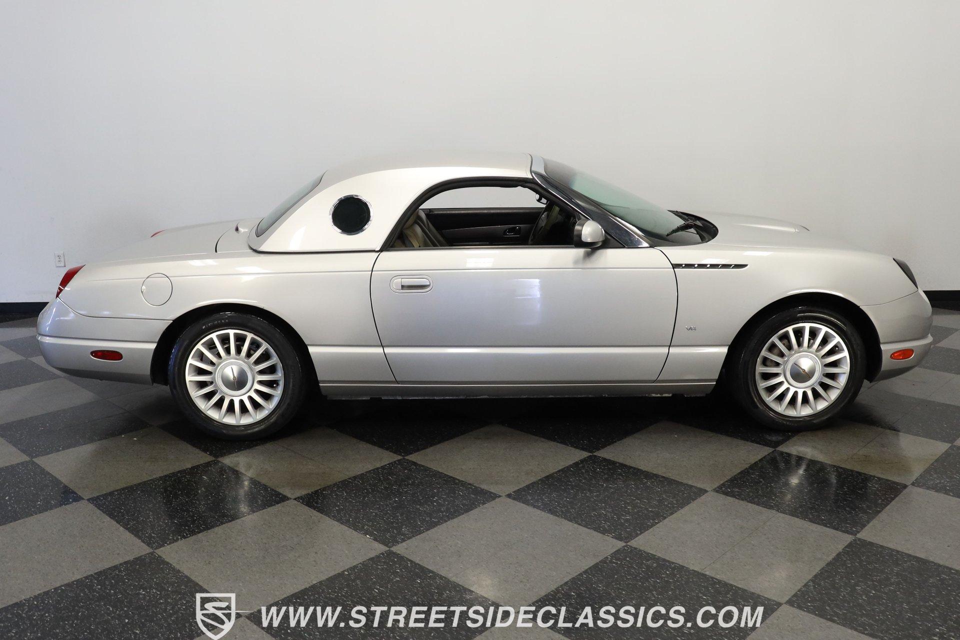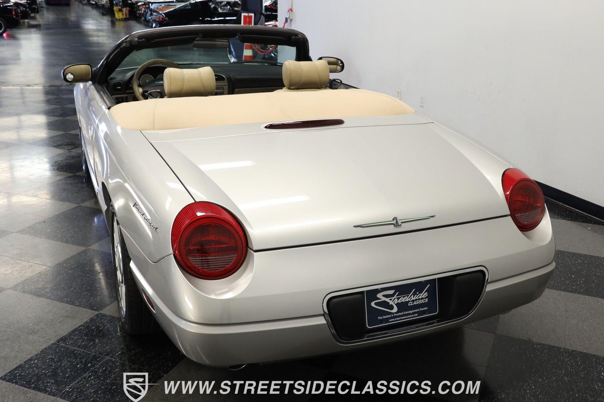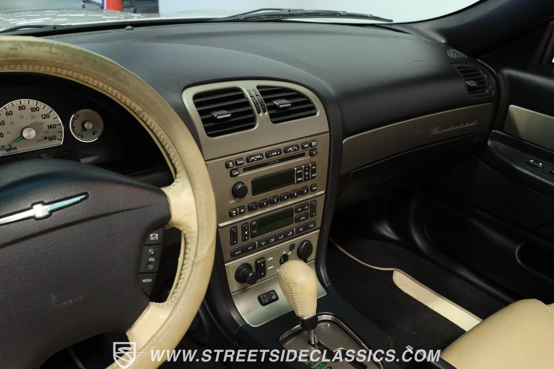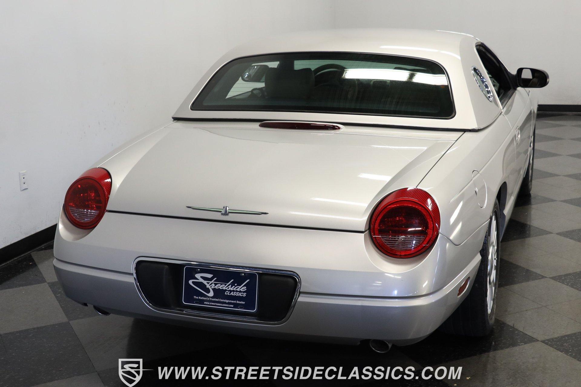 Production numbers for this model year stayed limited, making each one noteworthy among collectors today. This 2004 Ford Thunderbird Convertible features Silver Birch Metallic paint that covers its curved panels. The convertible features both a tan canvas soft top with glass rear window and a matching silver removable hardtop with port hole windows. Rolling on 17" T-Bird alloy wheels wrapped in 235/50R17 tires, this T-Bird's proportions showcase the retro-modern design language that defined this generation. Chrome accents add subtle elegance while dual exhaust outlets complete the rear view. Light Sand leather bucket seats anchor the interior with their premium appearance and comfortable design. The center console houses the shifter while the dashboard maintains clean lines throughout. A 6-disc in-dash CD changer provides entertainment alongside AM/FM radio capability. Power windows, power locks, power mirrors, and power seats add convenience, while air conditioning keeps the cabin comfortable during top-down cruising. Heated seats, cruise control, and a telescopic steering wheel round out the comfort features. A canvas boot cover matches the interior and keeps things tidy when the top is down. The 3.9L V8 engine delivers power through a 5-speed automatic transmission to the rear wheels. Electronic fuel injection feeds the V8 while a K&N Typhoon cold air intake helps with airflow. Four-wheel power disc brakes provide stopping capability, complemented by power steering for easy maneuvering. Dual exhaust routing gives this Thunderbird its distinctive sound signature. The serpentine belt system, hoses, and wiring present well in the engine bay. The 12V battery mounts in the trunk for better weight distribution. HIGHLIGHTS: 3.9L V8 Engine 5 Speed Automatic Transmission Electronic Fuel Injection K&N Typhoon Cold Air Intake Four Wheel Power Disc Brakes Power Steering Dual Exhaust Silver Birch Metallic Paint Tan Canvas Convertible Top with Glass Rear Window Silver Removable Hardtop with Port Hole Windows 17" T-Bird Alloy Wheels with 235/50R17 Tires Chrome Accents Power Convertible Top Light Sand Interior with Power Heated Leather Bucket Seats Console Shifter 6-Disc In-Dash CD Changer AM/FM Radio Power Windows, Locks, Mirrors Air Conditioning Cruise Control Telescopic Steering Wheel Canvas Boot Cover Owner's Manual Maintenance Records Top Tool This 2004 Ford Thunderbird Convertible combines the luxury of leather seating with the versatility of dual tops and the performance of a V8 engine. With its distinctive styling and comprehensive feature set, this final-generation Thunderbird offers both comfort and capability. Call today! We can assist you with getting an Extended Vehicle Service Plan from Freedom Warranty, which provides comprehensive coverage that can save thousands of dollars on unexpected repairs. Inquire for more details and pricing!