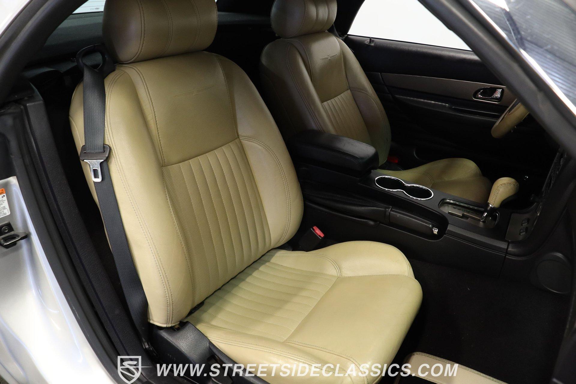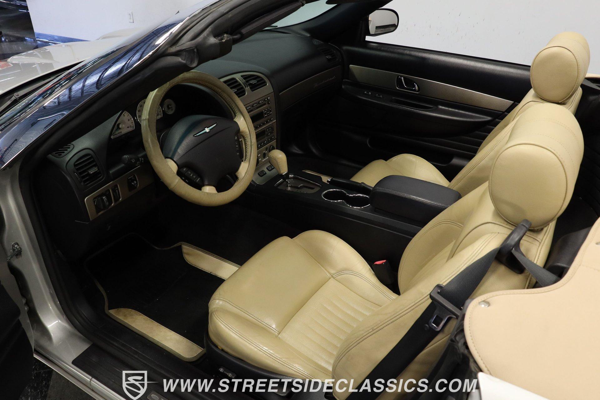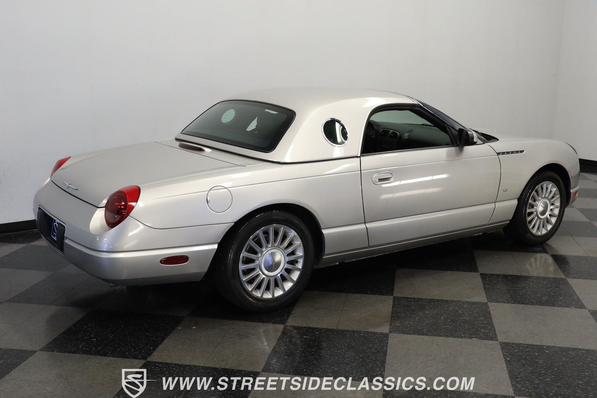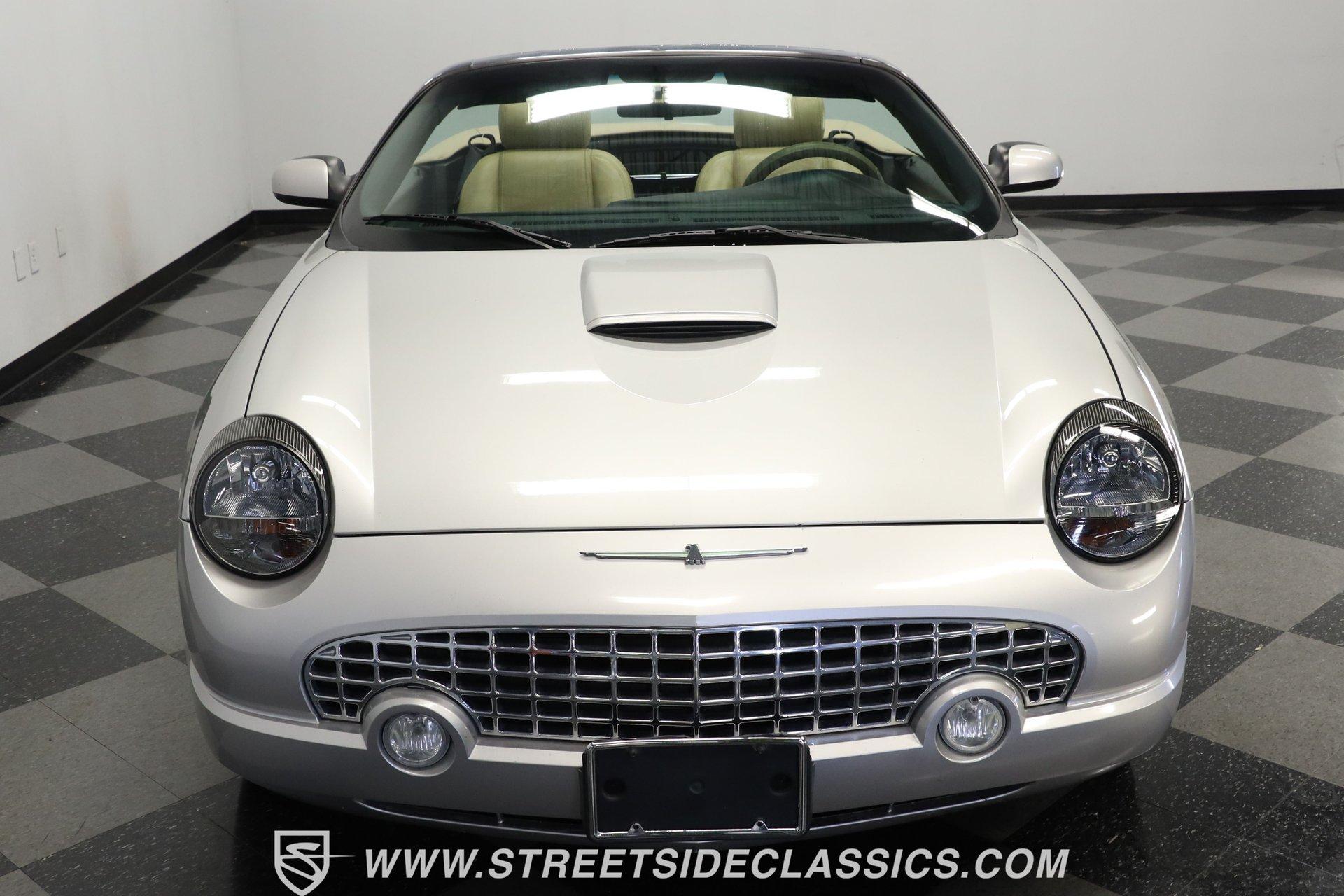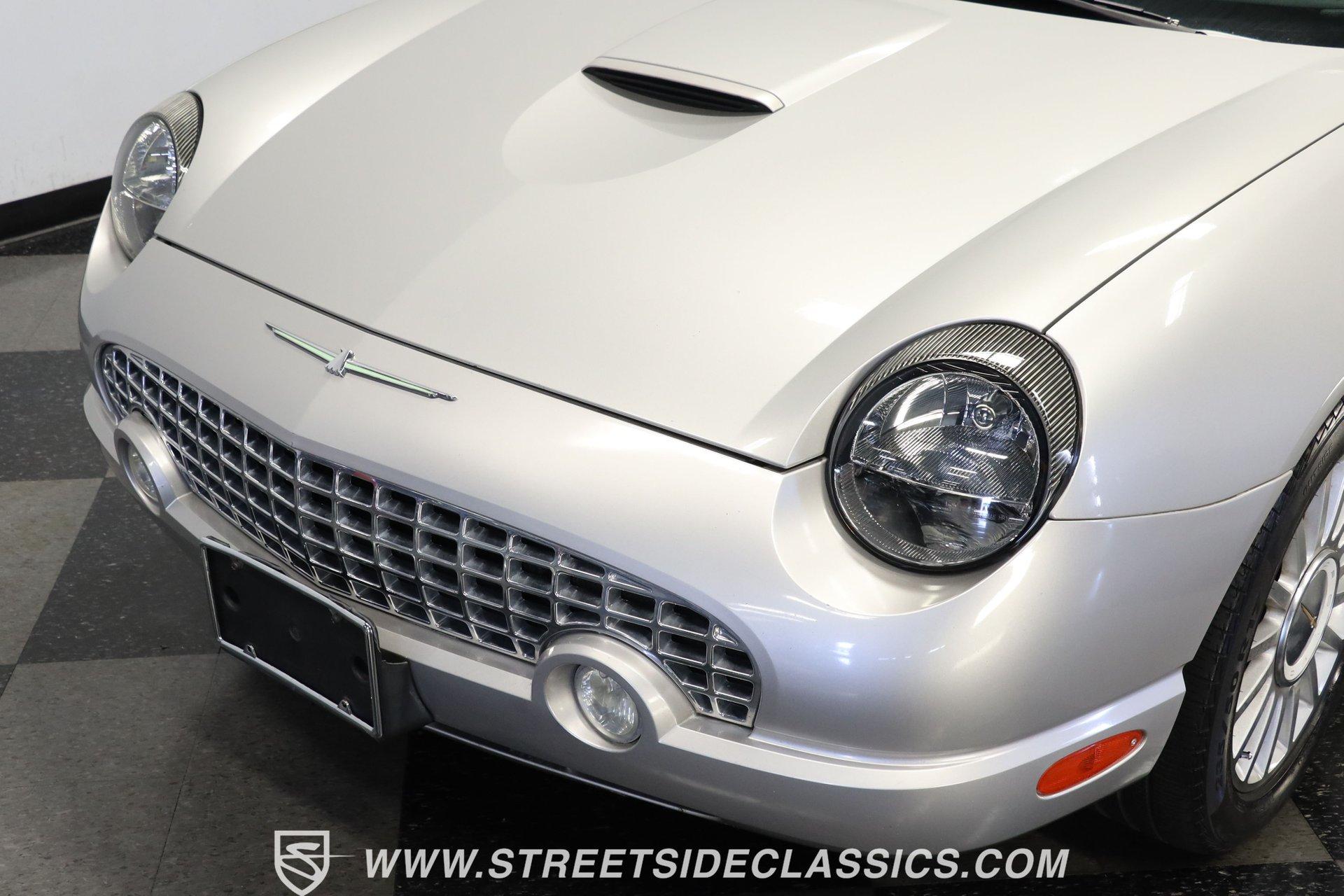 Production numbers for this model year stayed limited, making each one noteworthy among collectors today. This 2004 Ford Thunderbird Convertible features Silver Birch Metallic paint that covers its curved panels. The convertible features both a tan canvas soft top with glass rear window and a matching silver removable hardtop with port hole windows. Rolling on 17" T-Bird alloy wheels wrapped in 235/50R17 tires, this T-Bird's proportions showcase the retro-modern design language that defined this generation. Chrome accents add subtle elegance while dual exhaust outlets complete the rear view. Light Sand leather bucket seats anchor the interior with their premium appearance and comfortable design. The center console houses the shifter while the dashboard maintains clean lines throughout. A 6-disc in-dash CD changer provides entertainment alongside AM/FM radio capability. Power windows, power locks, power mirrors, and power seats add convenience, while air conditioning keeps the cabin comfortable during top-down cruising. Heated seats, cruise control, and a telescopic steering wheel round out the comfort features. A canvas boot cover matches the interior and keeps things tidy when the top is down. The 3.9L V8 engine delivers power through a 5-speed automatic transmission to the rear wheels. Electronic fuel injection feeds the V8 while a K&N Typhoon cold air intake helps with airflow. Four-wheel power disc brakes provide stopping capability, complemented by power steering for easy maneuvering. Dual exhaust routing gives this Thunderbird its distinctive sound signature. The serpentine belt system, hoses, and wiring present well in the engine bay. The 12V battery mounts in the trunk for better weight distribution. HIGHLIGHTS: 3.9L V8 Engine 5 Speed Automatic Transmission Electronic Fuel Injection K&N Typhoon Cold Air Intake Four Wheel Power Disc Brakes Power Steering Dual Exhaust Silver Birch Metallic Paint Tan Canvas Convertible Top with Glass Rear Window Silver Removable Hardtop with Port Hole Windows 17" T-Bird Alloy Wheels with 235/50R17 Tires Chrome Accents Power Convertible Top Light Sand Interior with Power Heated Leather Bucket Seats Console Shifter 6-Disc In-Dash CD Changer AM/FM Radio Power Windows, Locks, Mirrors Air Conditioning Cruise Control Telescopic Steering Wheel Canvas Boot Cover Owner's Manual Maintenance Records Top Tool This 2004 Ford Thunderbird Convertible combines the luxury of leather seating with the versatility of dual tops and the performance of a V8 engine. With its distinctive styling and comprehensive feature set, this final-generation Thunderbird offers both comfort and capability. Call today! We can assist you with getting an Extended Vehicle Service Plan from Freedom Warranty, which provides comprehensive coverage that can save thousands of dollars on unexpected repairs. Inquire for more details and pricing!