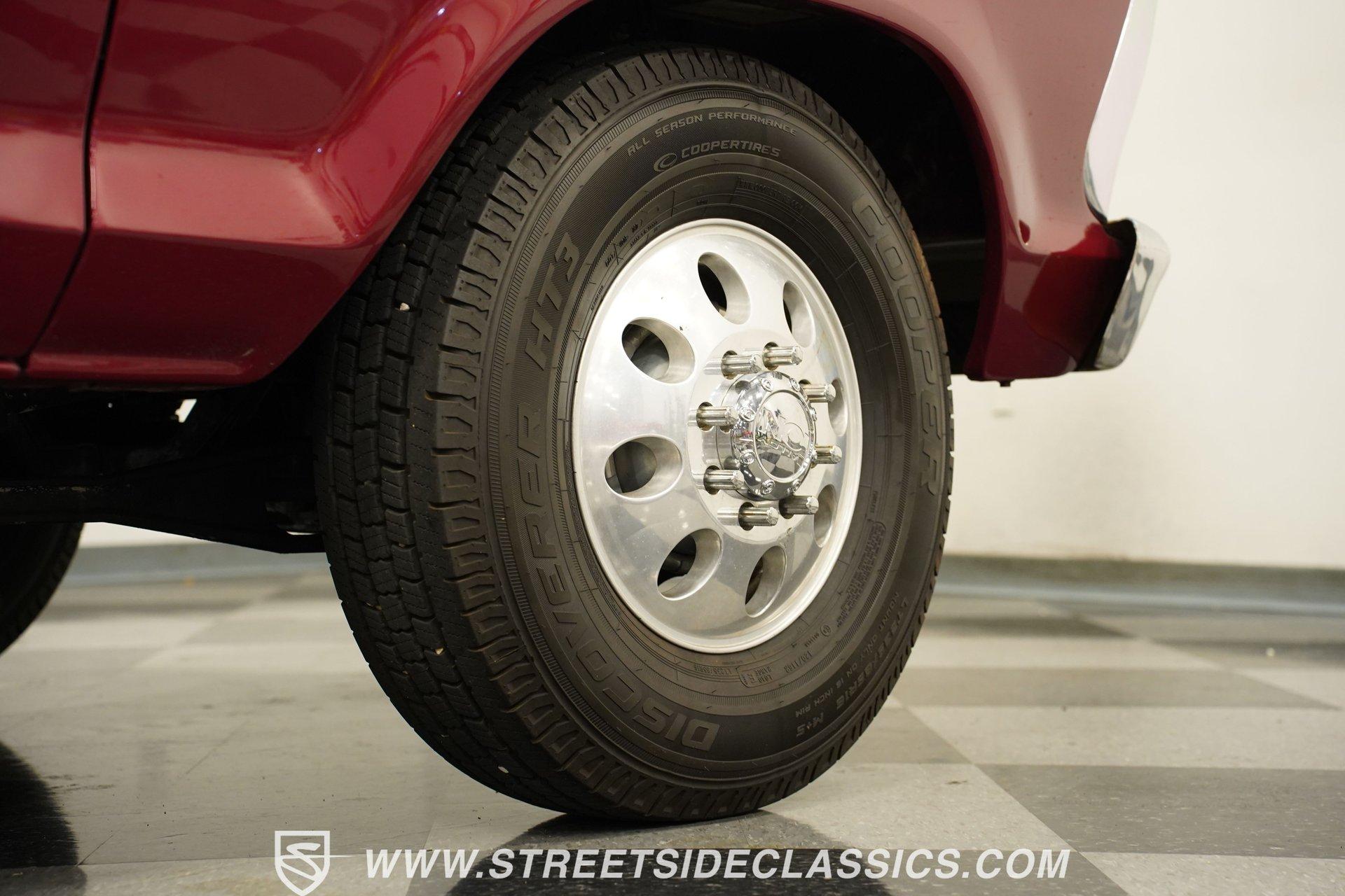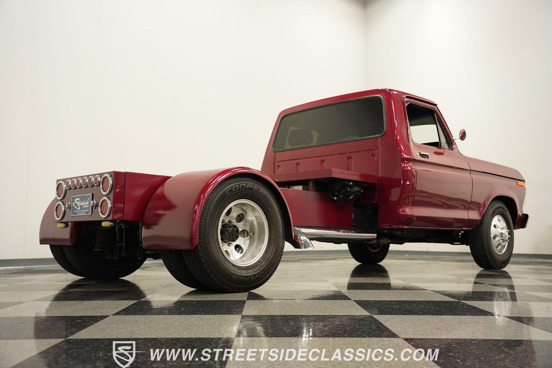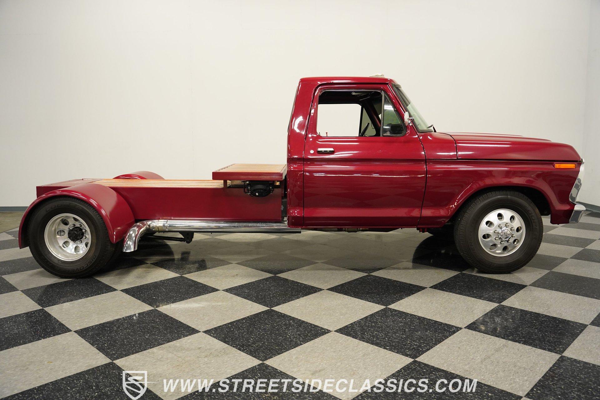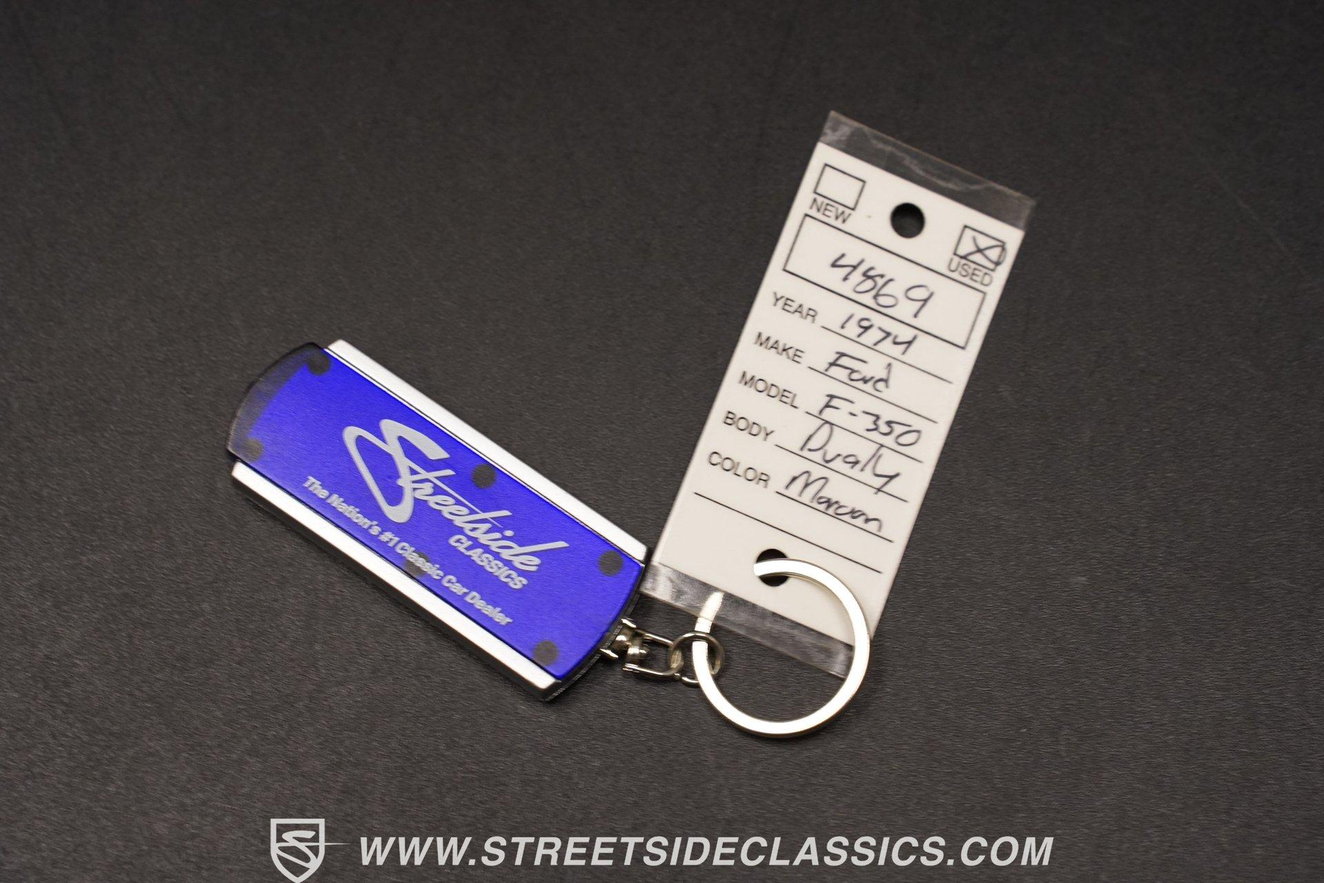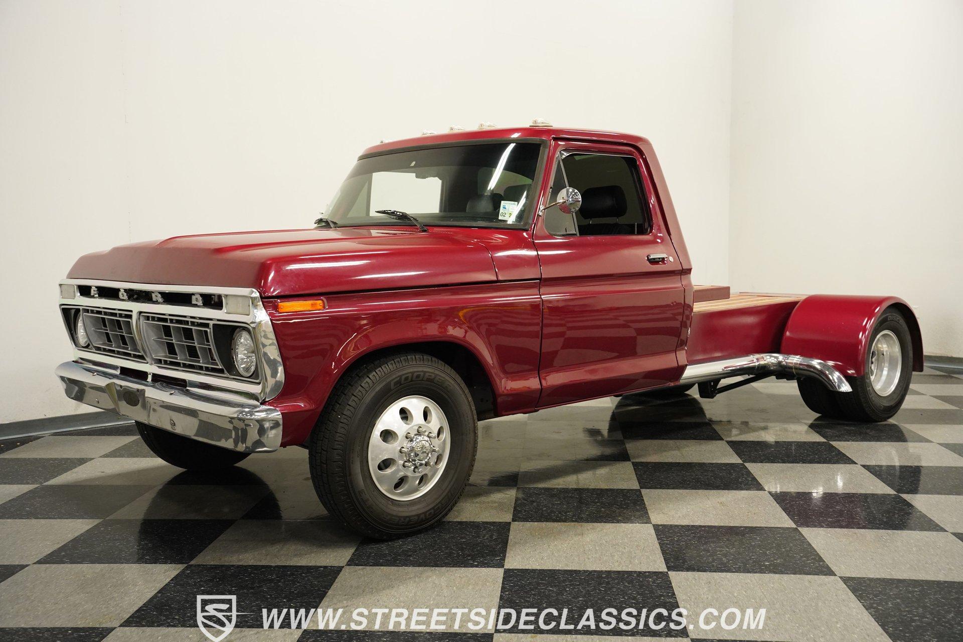Finished in bold Maroon, this 1974 Ford F-350 Custom Dually carries a squared-up deck built right over the chassis. Cab roof lights add just the right touch of big rig attitude, and clear headlights sharpen the front end. It sits tall on 16" polished aluminum wheels, all wrapped in 235/85R16 tires with the right stance and spacing to make that dual rear axle count. Black vinyl bucket seats fill the cab and kick out the factory bench for something more fitting. A B&M ratchet shifter anchors the floor, while a Billet Specialties steering wheel sits on a tilt column. Digital gauges replace the original cluster, giving the dash a purpose-built upgrade. Above, the custom headliner houses a Bluetooth radio, and a row of toggles wired in above the driver visor runs the ignition and accessories. Power comes from a 400ci V8 with aluminum Ford valve covers, an Edelbrock aluminum intake, Holley 4-barrel carburetor, and MSD ignition. Long tube headers feed a set of dual 5-inch pipes that dump just before the rear wheels. Backing that up is a C6 3-speed automatic paired with a Gear Vendors overdrive. Cooling is handled by an aluminum radiator. The suspension setup features a Twin I-Beam up front and trailing arms with airbags out back. Steering assist and front disc brakes finish the mechanical package. HIGHLIGHTS 400 V8 Engine C6 3-Speed Automatic Transmission Gear Vendors Overdrive Holley 4-Barrel Carburetor Edelbrock Aluminum Intake Aluminum Ford Valve Covers Long Tube Headers Dual Side Exit Exhaust Aluminum Radiator Power Front Disc Brakes Dana 70 Rear End Rear Suspension with Trailing Arms, Shocks, and Airbags Maroon Paint Custom Flat Deck over Boxed Frame Cab Roof Lights 16" Polished Aluminum Wheels IN 235/85R16 Tires Black Interior with Bucket Seats Digital Gauges Power Steering B&M Floor Shifter Billet Specialties Steering Wheel Tilt Steering Column Toggle Switch Ignition System Ceiling-Mounted Bluetooth Radio Large Binder with Receipts Straight-cut and built with muscle in mind, the 1974 Ford F-350 Custom Dually brings a heavy-duty look with a hot rod soul. It's got presence, style, and all the hardware to match. Call today!