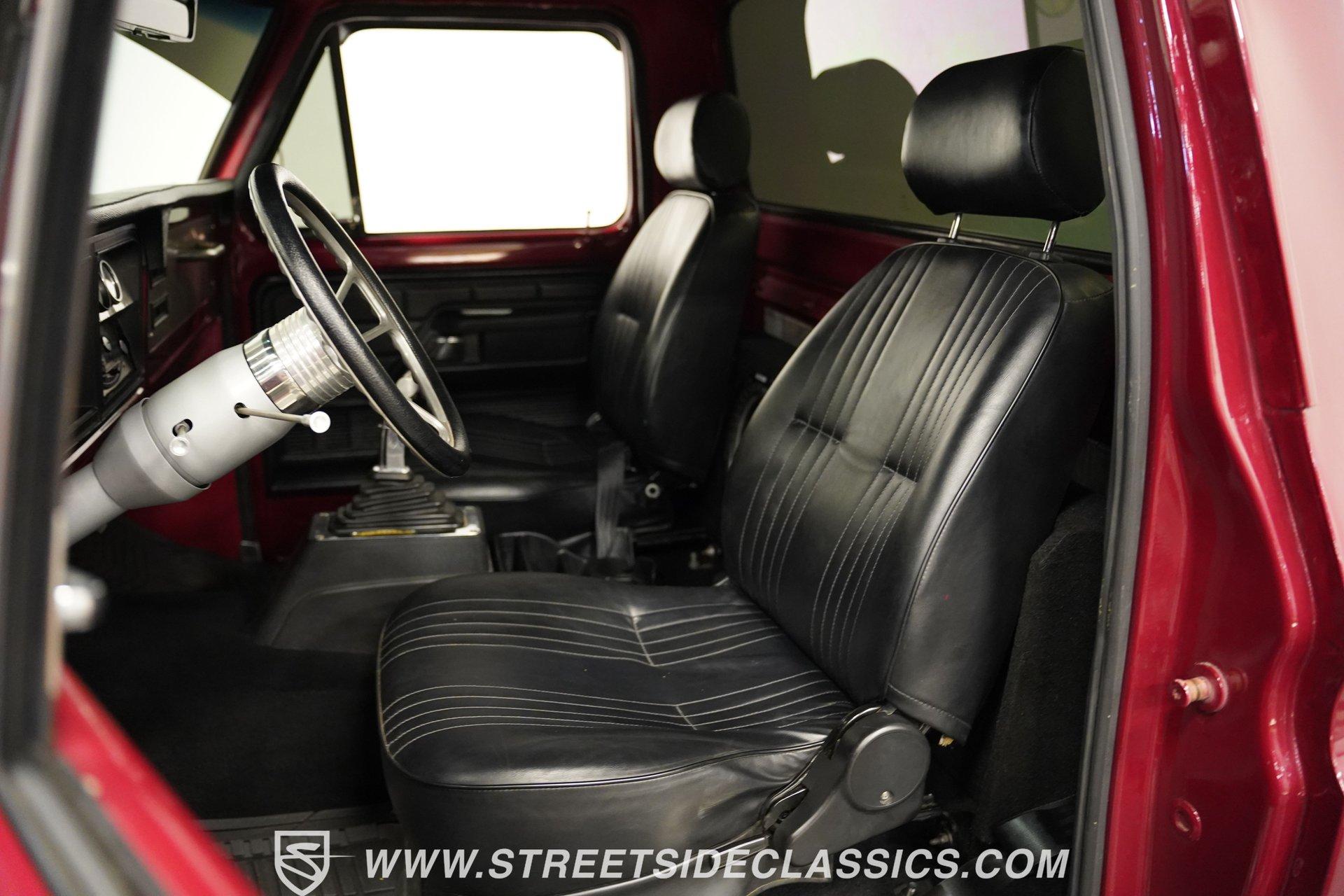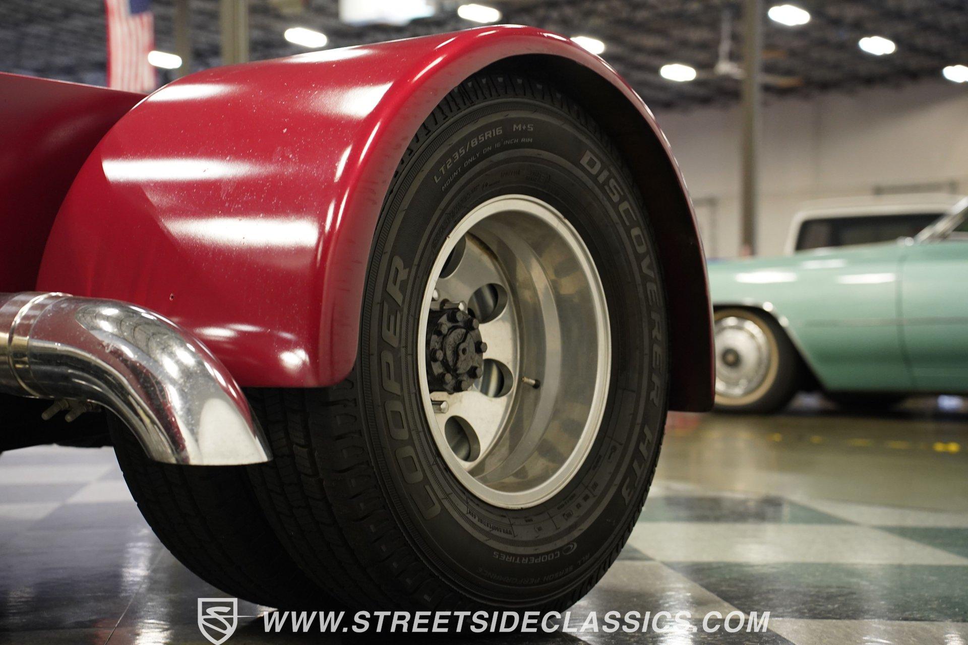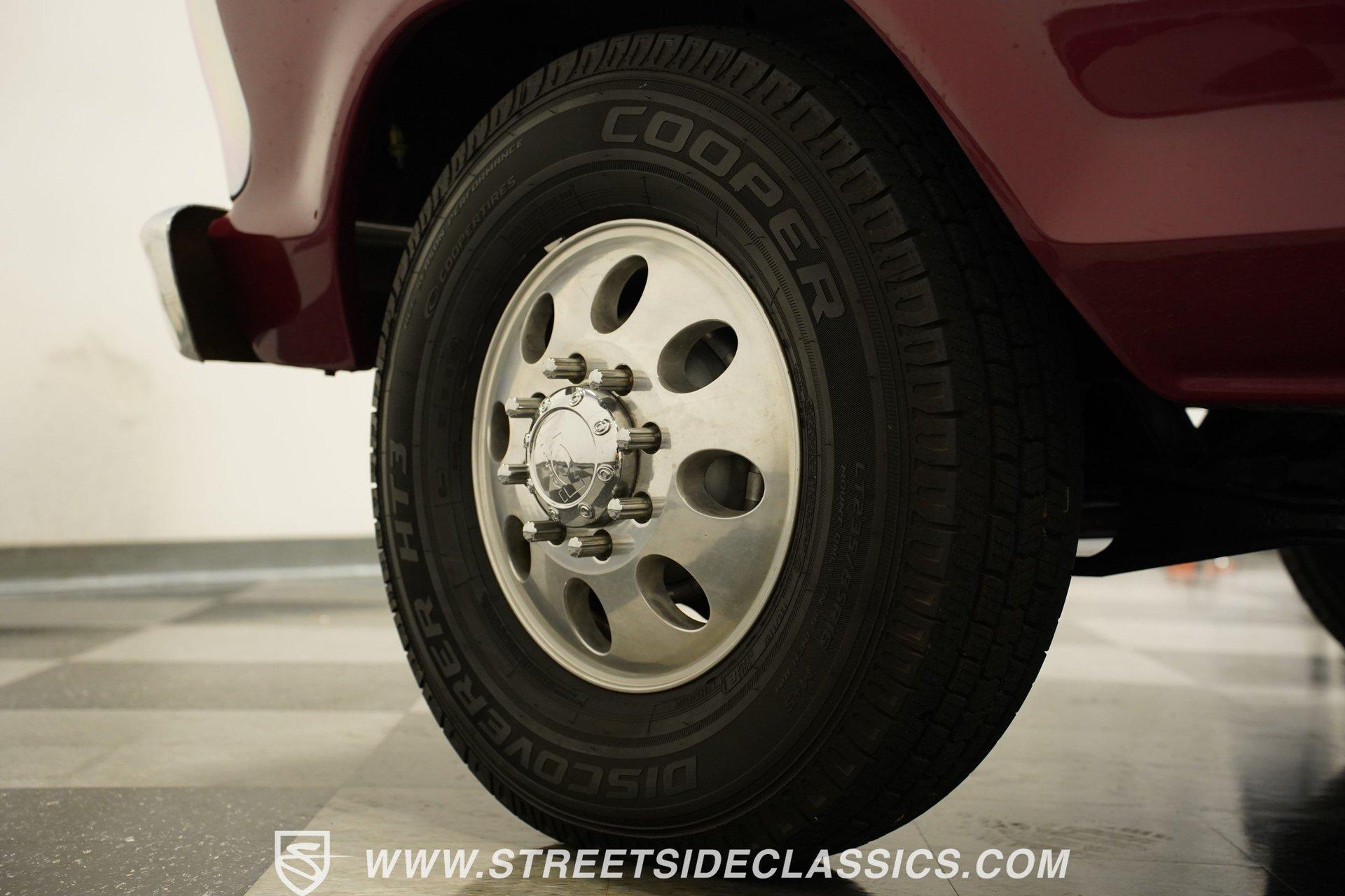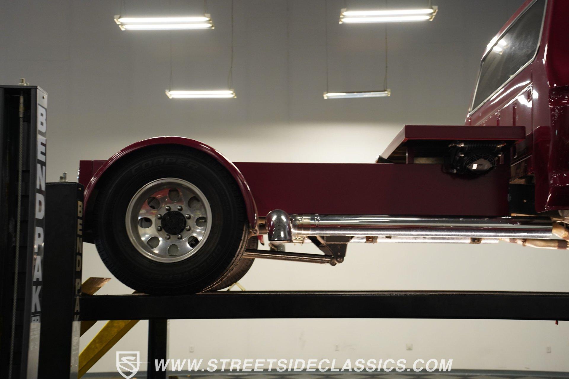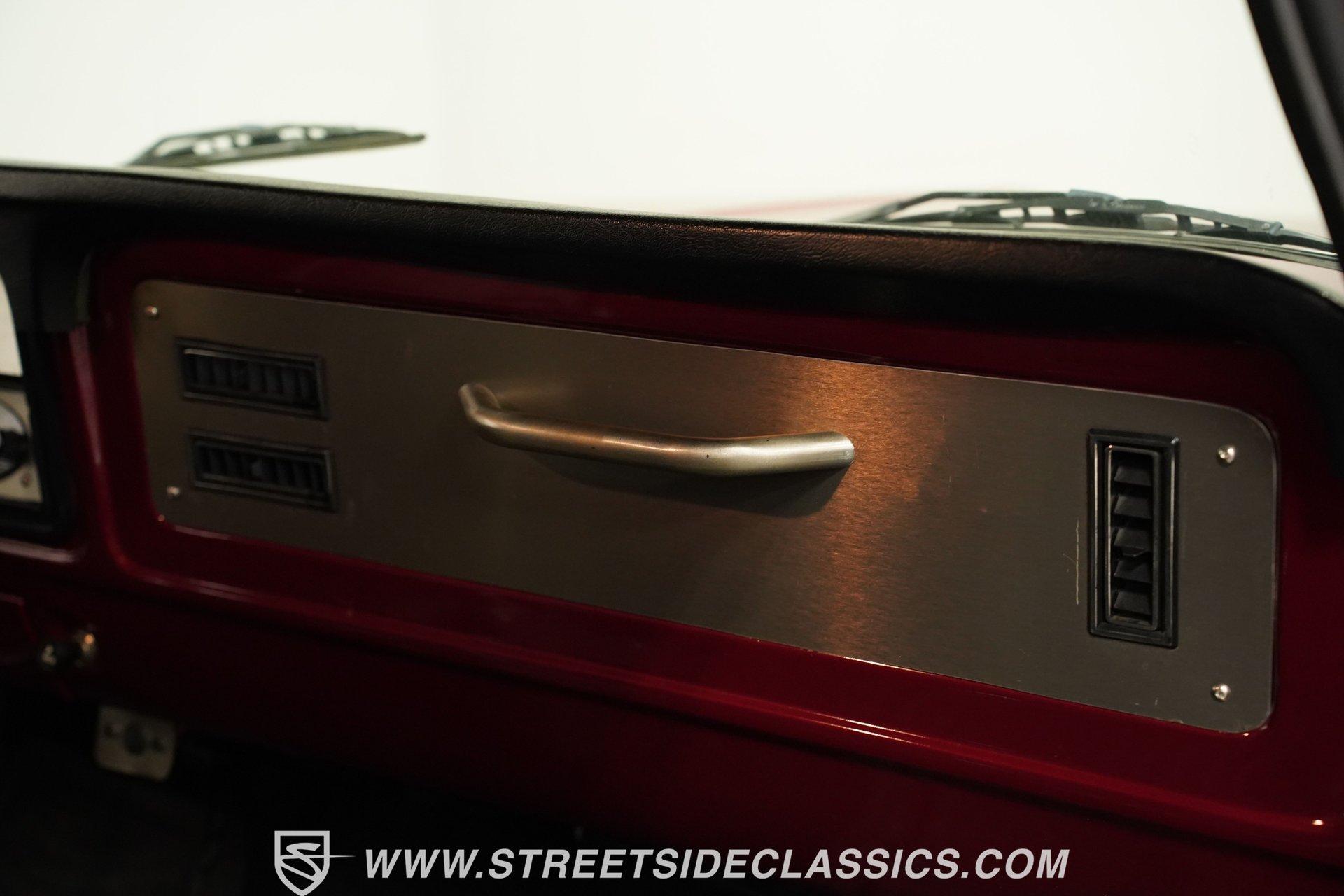 Finished in bold Maroon, this 1974 Ford F-350 Custom Dually carries a squared-up deck built right over the chassis. Cab roof lights add just the right touch of big rig attitude, and clear headlights sharpen the front end. It sits tall on 16" polished aluminum wheels, all wrapped in 235/85R16 tires with the right stance and spacing to make that dual rear axle count. Black vinyl bucket seats fill the cab and kick out the factory bench for something more fitting. A B&M ratchet shifter anchors the floor, while a Billet Specialties steering wheel sits on a tilt column. Digital gauges replace the original cluster, giving the dash a purpose-built upgrade. Above, the custom headliner houses a Bluetooth radio, and a row of toggles wired in above the driver visor runs the ignition and accessories. Power comes from a 400ci V8 with aluminum Ford valve covers, an Edelbrock aluminum intake, Holley 4-barrel carburetor, and MSD ignition. Long tube headers feed a set of dual 5-inch pipes that dump just before the rear wheels. Backing that up is a C6 3-speed automatic paired with a Gear Vendors overdrive. Cooling is handled by an aluminum radiator. The suspension setup features a Twin I-Beam up front and trailing arms with airbags out back. Steering assist and front disc brakes finish the mechanical package. HIGHLIGHTS 400 V8 Engine C6 3-Speed Automatic Transmission Gear Vendors Overdrive Holley 4-Barrel Carburetor Edelbrock Aluminum Intake Aluminum Ford Valve Covers Long Tube Headers Dual Side Exit Exhaust Aluminum Radiator Power Front Disc Brakes Dana 70 Rear End Rear Suspension with Trailing Arms, Shocks, and Airbags Maroon Paint Custom Flat Deck over Boxed Frame Cab Roof Lights 16" Polished Aluminum Wheels IN 235/85R16 Tires Black Interior with Bucket Seats Digital Gauges Power Steering B&M Floor Shifter Billet Specialties Steering Wheel Tilt Steering Column Toggle Switch Ignition System Ceiling-Mounted Bluetooth Radio Large Binder with Receipts Straight-cut and built with muscle in mind, the 1974 Ford F-350 Custom Dually brings a heavy-duty look with a hot rod soul. It's got presence, style, and all the hardware to match. Call today!