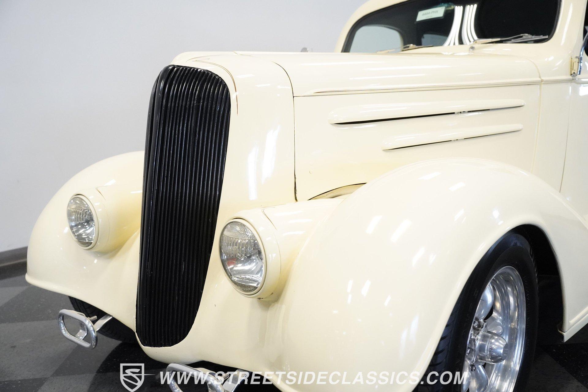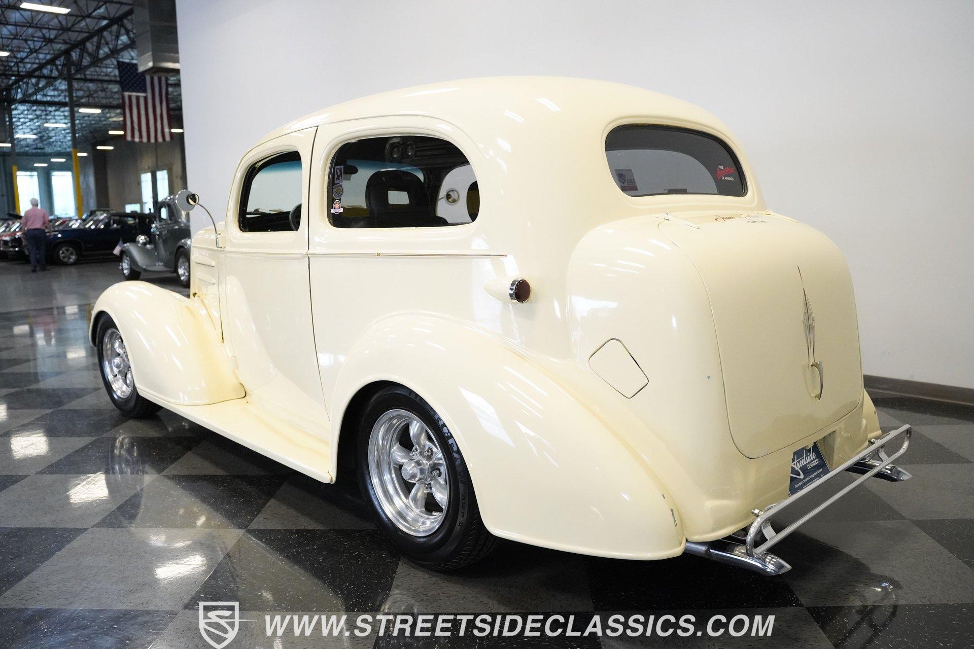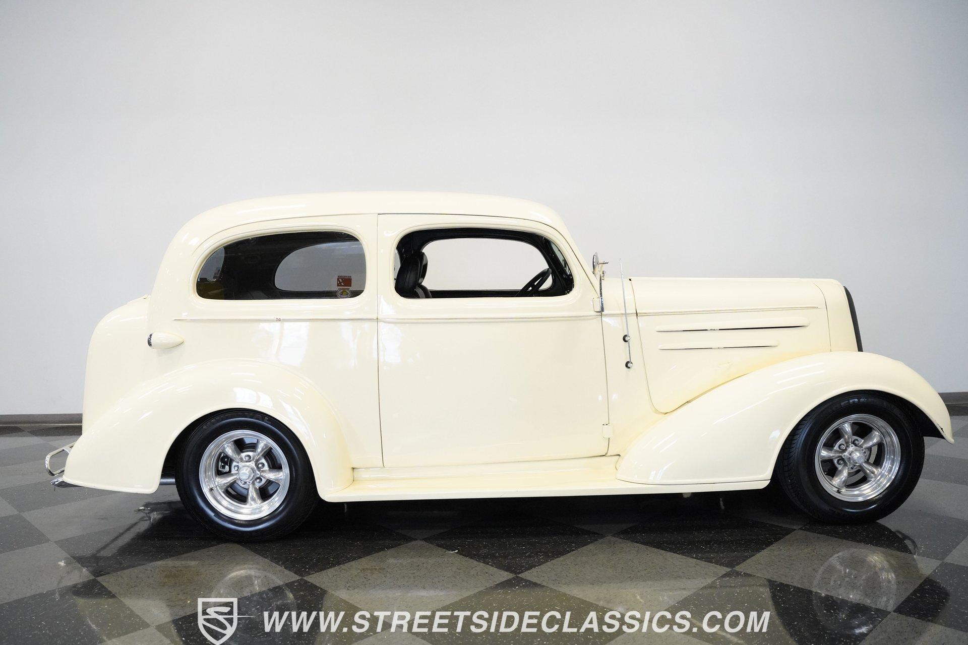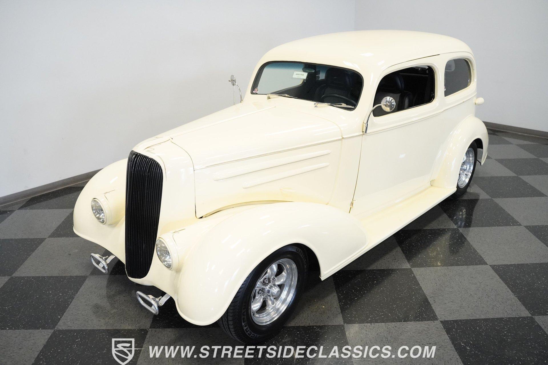 Custom modifications abound on this rare 1936 Chevrolet Master, painted in cream and enhanced with detailed pinstriping across its body. The front fenders house integrated headlights for a cleaner look, while the blacked-out grille adds contrast to the exterior. The door handles have been shaved for a smoother appearance. Several upgrades include a one-piece windshield, integrated gas cap, and unique tail lights that set it apart. The 15" American Racing aluminum wheels are fitted with 205/75R15 Uniroyal Tigerpaw tires that grip the road effectively. Black vinyl and gray suede cover the interior, creating a unified theme from front to back. Bucket seats provide support up front, with a matching vinyl rear bench for passengers. The black custom-painted dash contains clear gauges that monitor essential functions. A tilt steering column adds driving comfort, and an AM/FM CD player supplies music during travel. Black carpeting with matching floor mats lines the floor, while door panels finished in black vinyl complete the well-executed cabin design. The 350 cubic inch V8 engine comes equipped with an Edelbrock 4-barrel carburetor mounted on an Edelbrock intake manifold. A 700R4 4-speed automatic transmission handles gear changes efficiently. The upgraded front suspension uses an independent setup with tubular upper and lower control arms, coilovers, and rack and pinion steering for responsive handling. At the rear, a 9" Ford axle with leaf springs and air shocks manages the load. With four-wheel power disc brakes and dual exhaust with street flow mufflers. HIGHLIGHTS: 350 V8 Engine 700R4 4-Speed Automatic Transmission Edelbrock 4-Barrel Carburetor Edelbrock Intake Manifold Four-Wheel Power Disc Brakes Independent Front Suspension with Tubular Control Arms 9" Rear End with Leaf Springs and Air Shocks Dual Exhaust with Street Flow Mufflers Cream Exterior Paint Custom Pinstriping 15" American Racing Aluminum Wheels 205/75R15 Uniroyal Tigerpaw Tires Shaved Door Handles Integrated Headlights Custom Front Fenders One-Piece Windshield Integrated Gas Cap Custom Tail Lights Blacked-Out Front Grille Black with Gray Suede Interior with Bucket Seats Rear Bench Seat Custom Black Dash Custom Gauges Tilt Steering Column Power Steering AM/FM CD Player Featuring a mix of 1930s styling and modern performance, the 1936 Chevrolet Master gives you V8 power and upgraded driving dynamics. The tasteful exterior mods and comfortable interior make for an enjoyable classic Chevy you can drive anywhere. Call today!