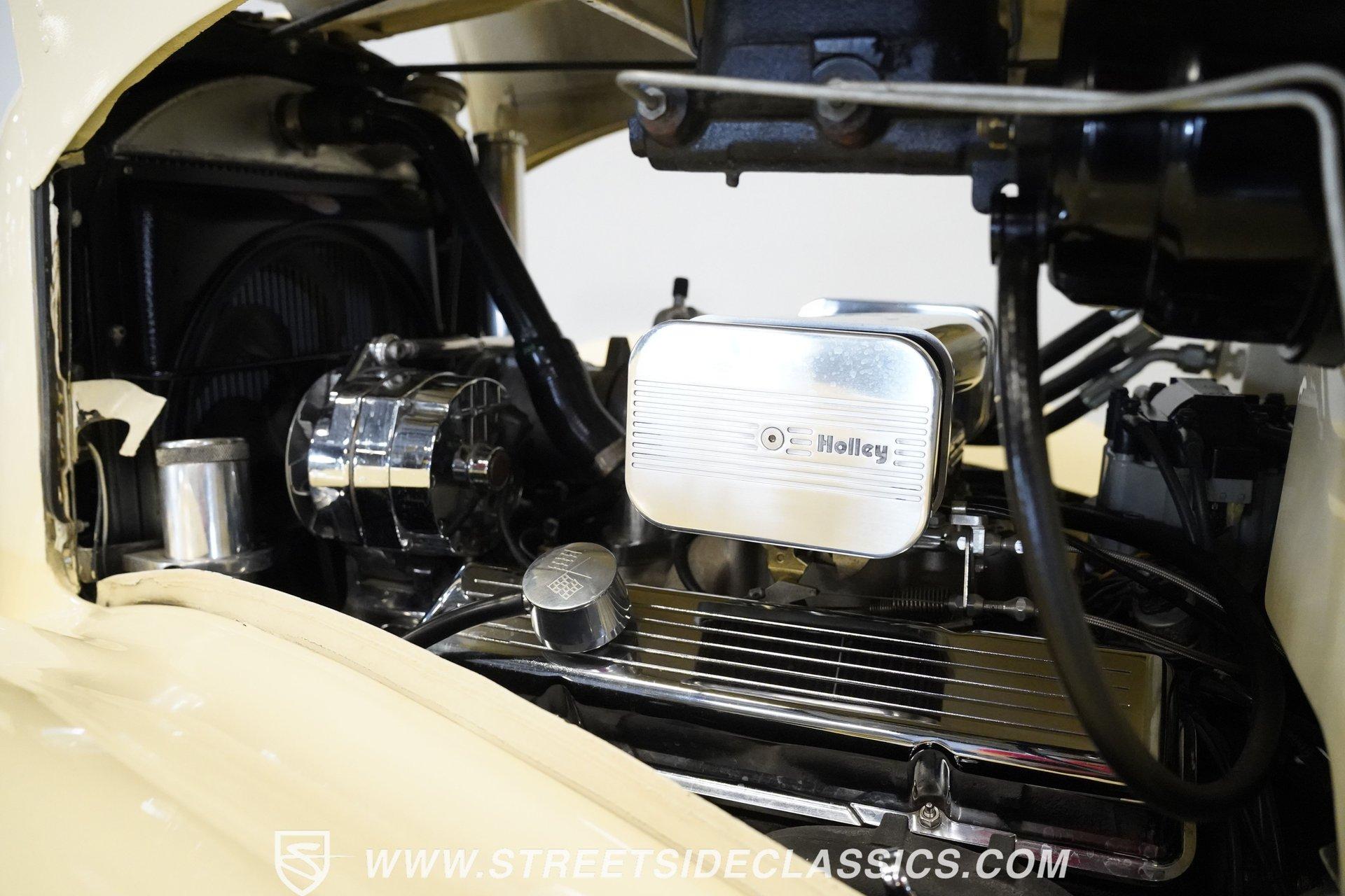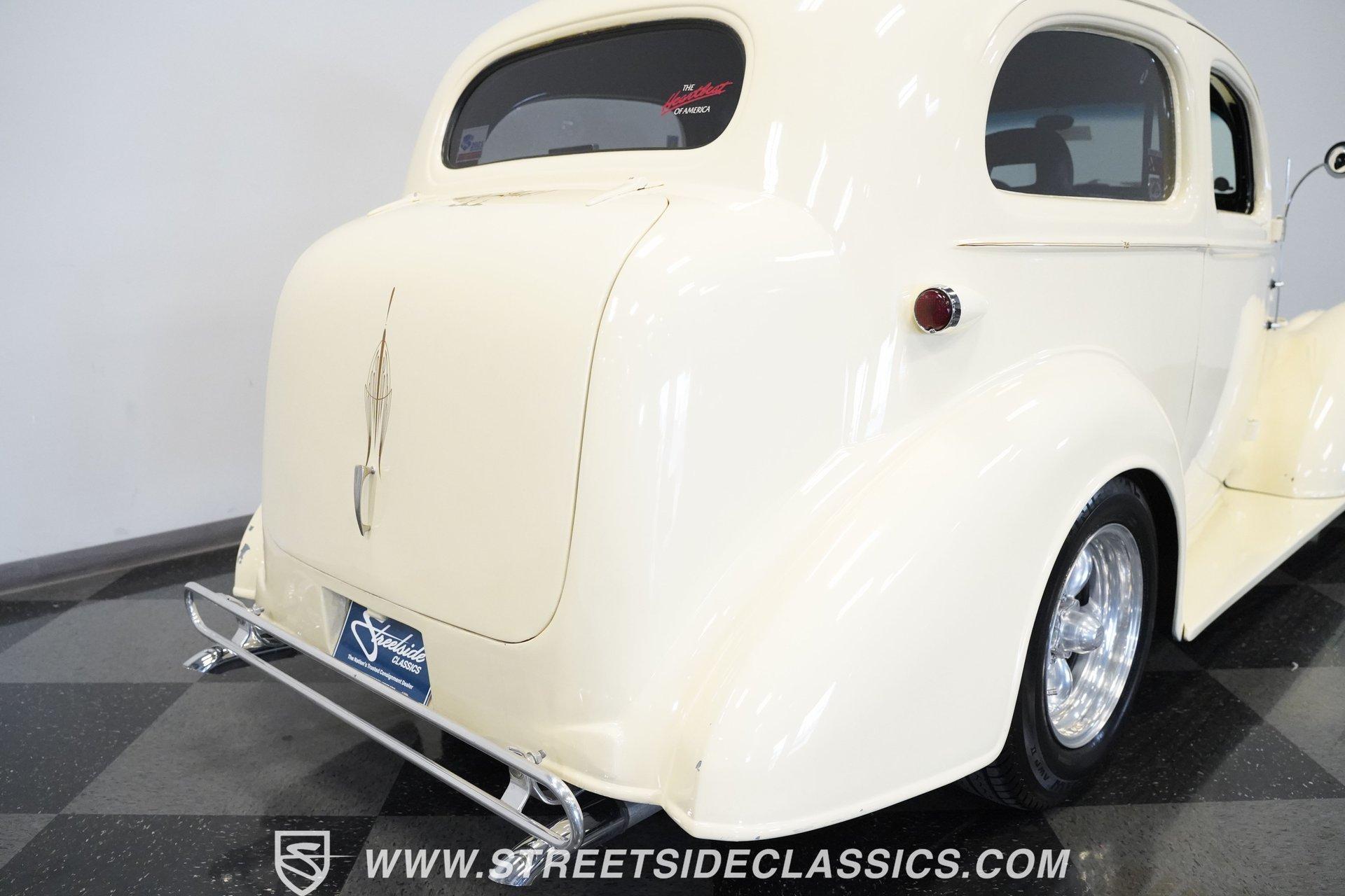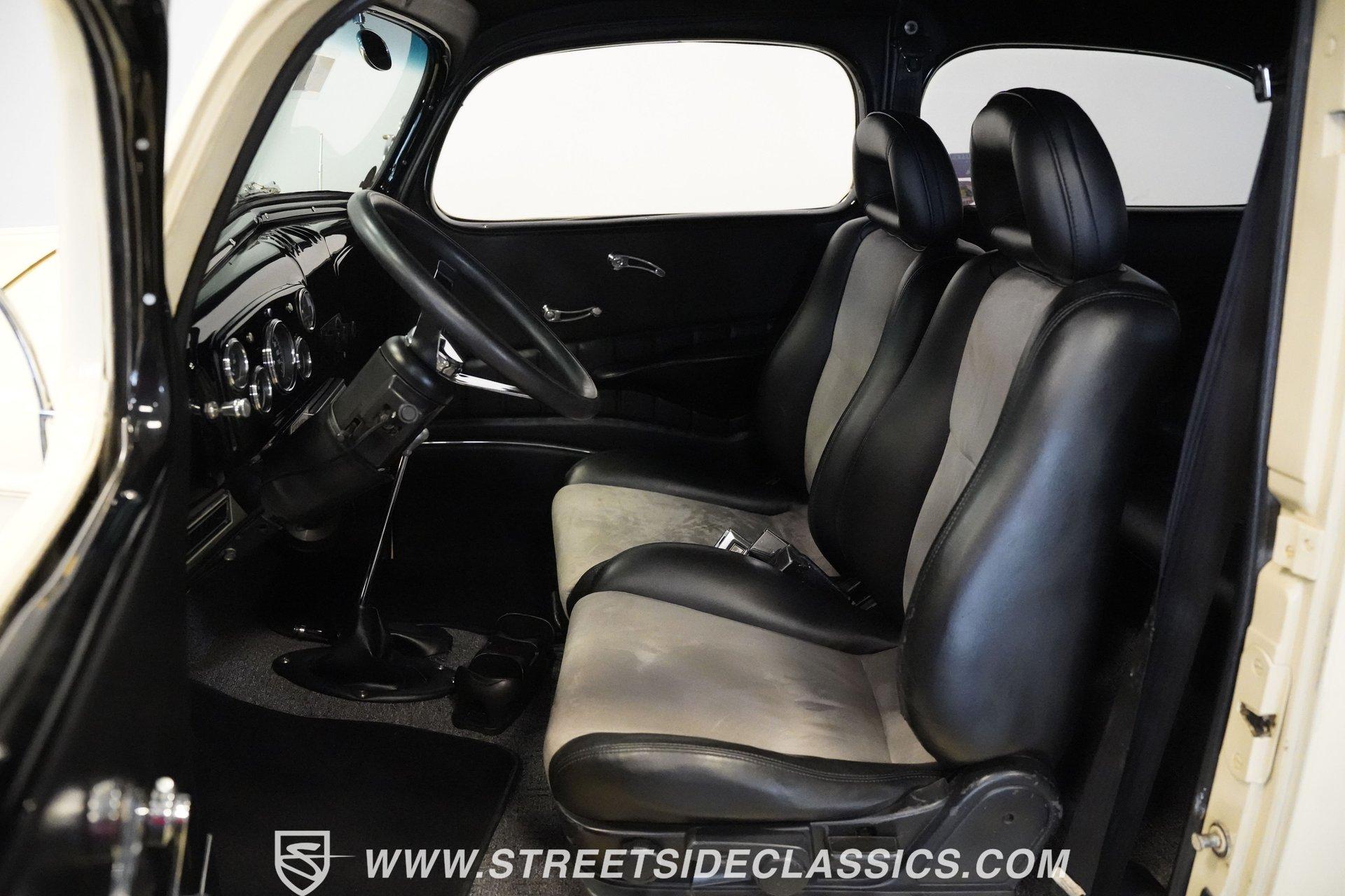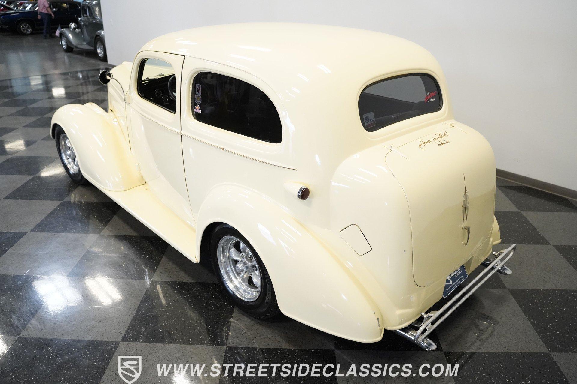 Custom modifications abound on this rare 1936 Chevrolet Master, painted in cream and enhanced with detailed pinstriping across its body. The front fenders house integrated headlights for a cleaner look, while the blacked-out grille adds contrast to the exterior. The door handles have been shaved for a smoother appearance. Several upgrades include a one-piece windshield, integrated gas cap, and unique tail lights that set it apart. The 15" American Racing aluminum wheels are fitted with 205/75R15 Uniroyal Tigerpaw tires that grip the road effectively. Black vinyl and gray suede cover the interior, creating a unified theme from front to back. Bucket seats provide support up front, with a matching vinyl rear bench for passengers. The black custom-painted dash contains clear gauges that monitor essential functions. A tilt steering column adds driving comfort, and an AM/FM CD player supplies music during travel. Black carpeting with matching floor mats lines the floor, while door panels finished in black vinyl complete the well-executed cabin design. The 350 cubic inch V8 engine comes equipped with an Edelbrock 4-barrel carburetor mounted on an Edelbrock intake manifold. A 700R4 4-speed automatic transmission handles gear changes efficiently. The upgraded front suspension uses an independent setup with tubular upper and lower control arms, coilovers, and rack and pinion steering for responsive handling. At the rear, a 9" Ford axle with leaf springs and air shocks manages the load. With four-wheel power disc brakes and dual exhaust with street flow mufflers. HIGHLIGHTS: 350 V8 Engine 700R4 4-Speed Automatic Transmission Edelbrock 4-Barrel Carburetor Edelbrock Intake Manifold Four-Wheel Power Disc Brakes Independent Front Suspension with Tubular Control Arms 9" Rear End with Leaf Springs and Air Shocks Dual Exhaust with Street Flow Mufflers Cream Exterior Paint Custom Pinstriping 15" American Racing Aluminum Wheels 205/75R15 Uniroyal Tigerpaw Tires Shaved Door Handles Integrated Headlights Custom Front Fenders One-Piece Windshield Integrated Gas Cap Custom Tail Lights Blacked-Out Front Grille Black with Gray Suede Interior with Bucket Seats Rear Bench Seat Custom Black Dash Custom Gauges Tilt Steering Column Power Steering AM/FM CD Player Featuring a mix of 1930s styling and modern performance, the 1936 Chevrolet Master gives you V8 power and upgraded driving dynamics. The tasteful exterior mods and comfortable interior make for an enjoyable classic Chevy you can drive anywhere. Call today!